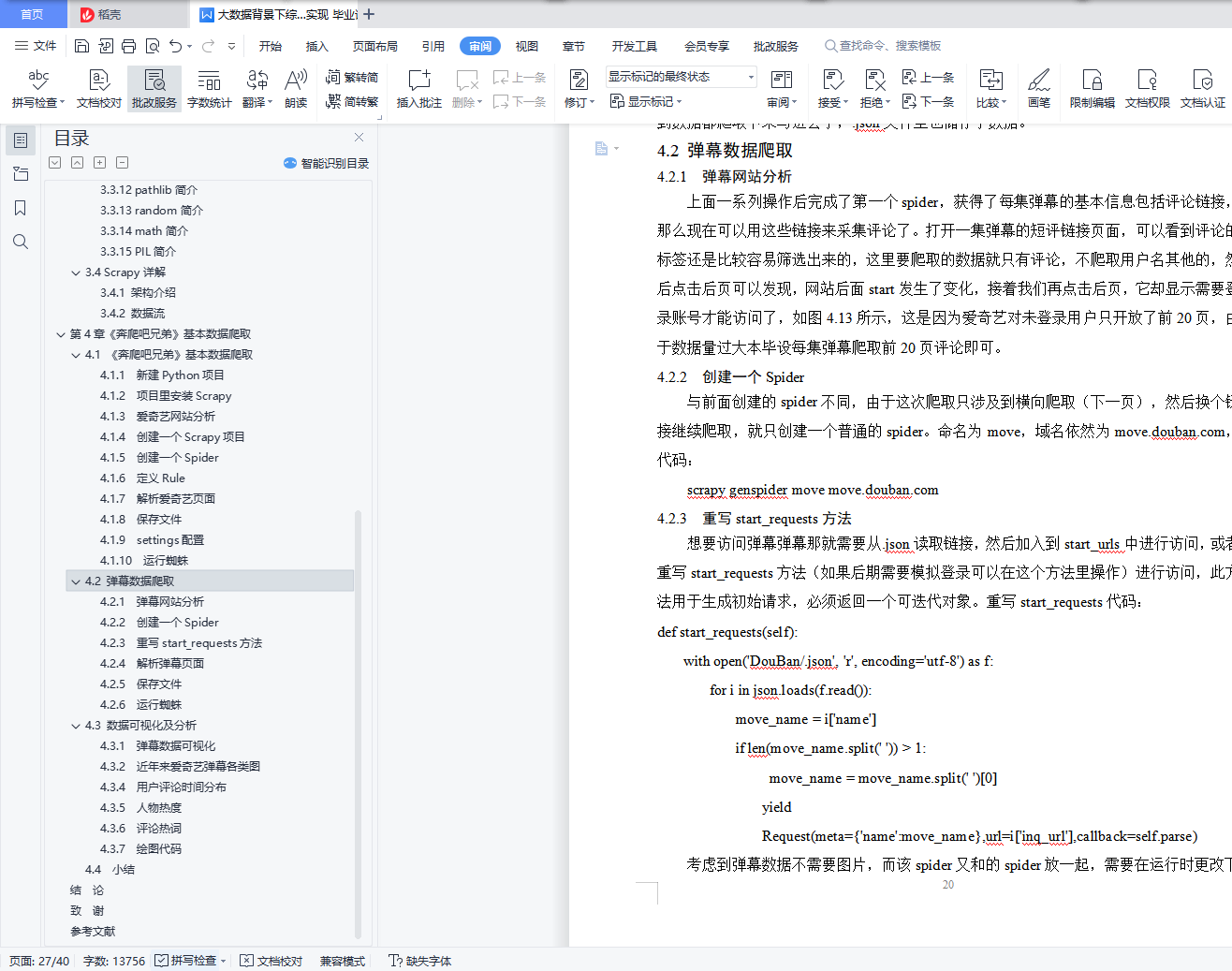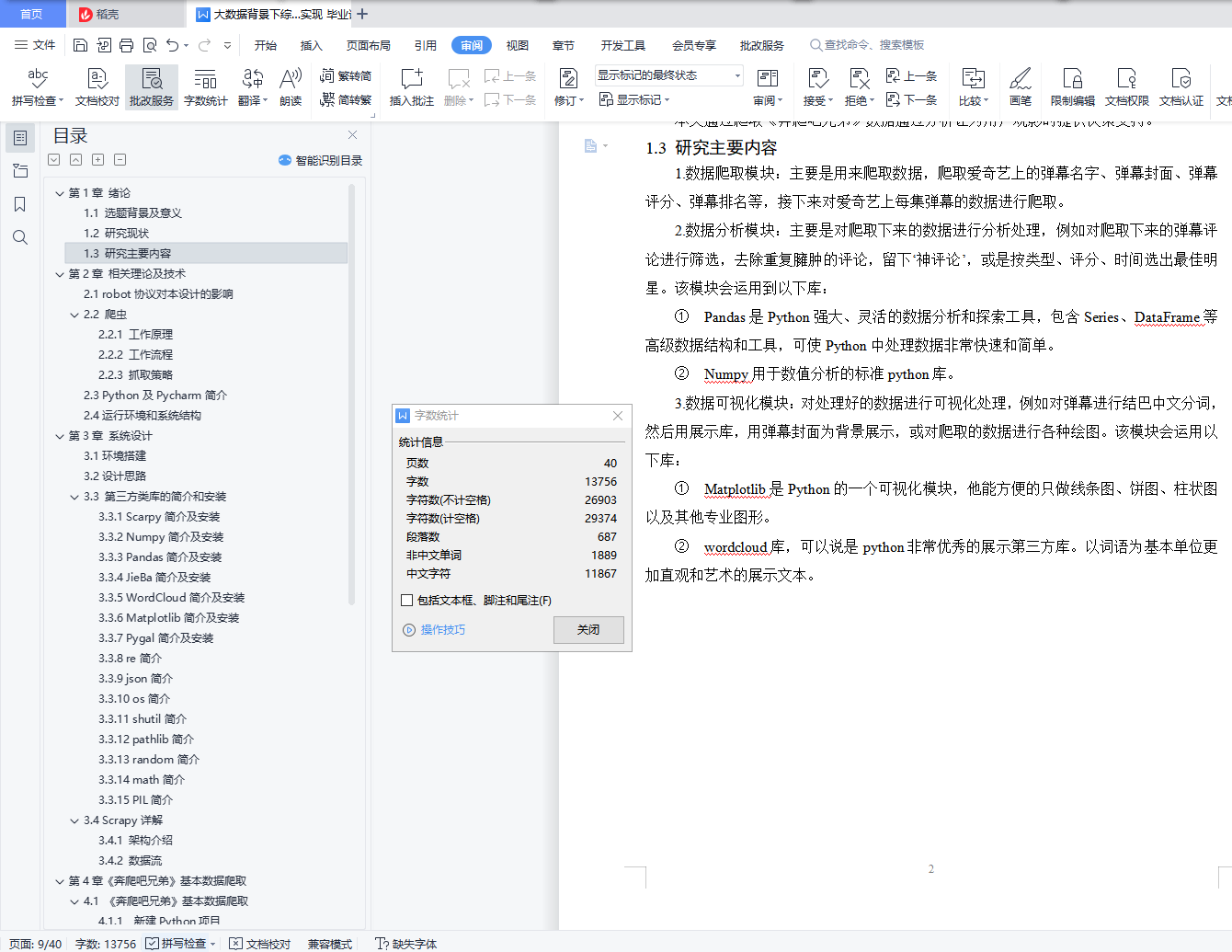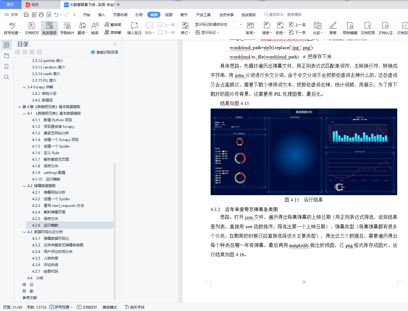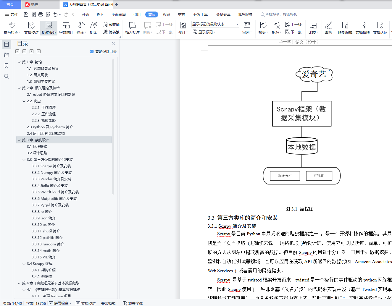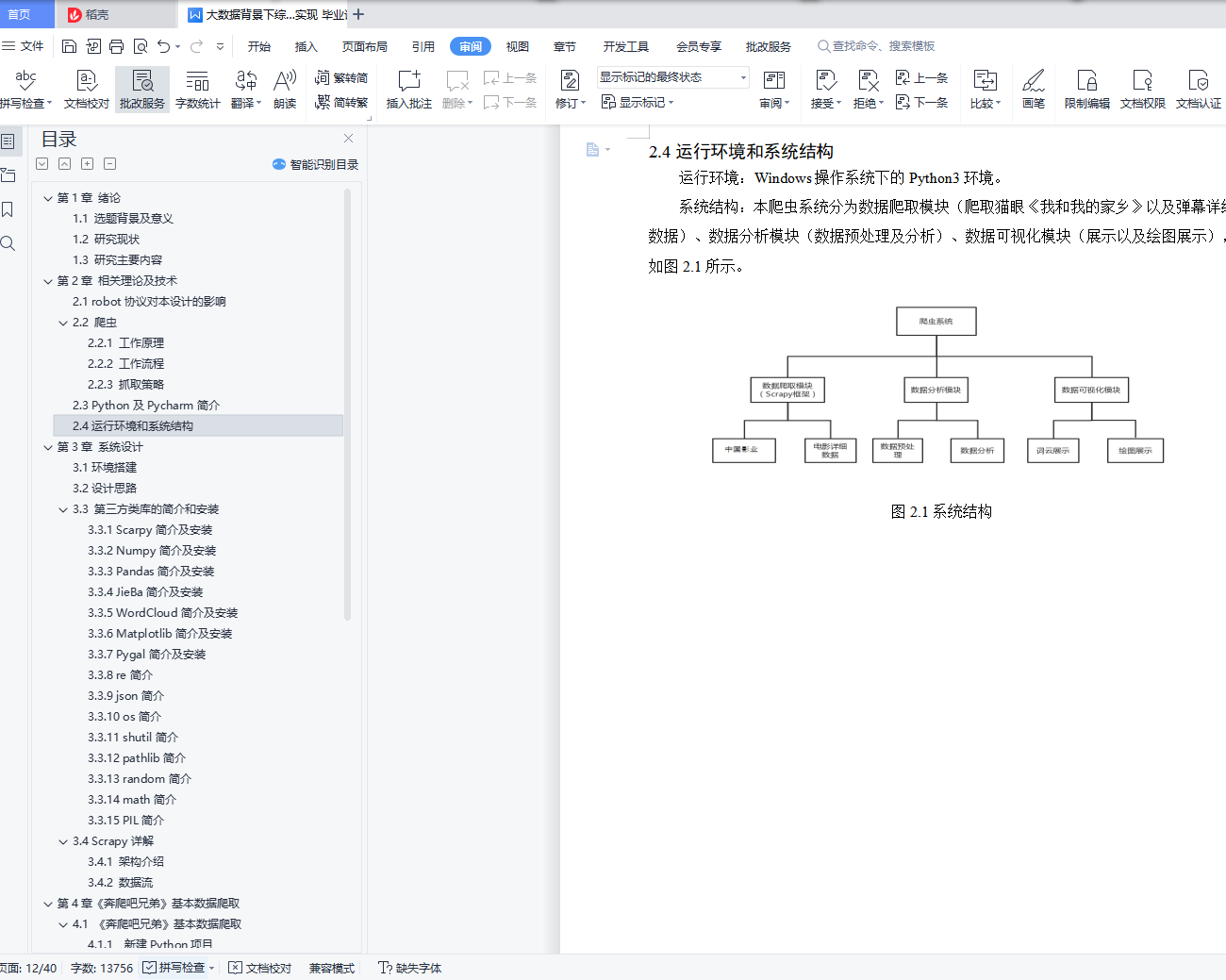 摘 要在互联网时代,伴随着各种社交媒体的盛行,公众人物的一言一行也被无限放大,对于广大群众的价值导向作用也被进一步的激发。由此从大数据的角度对综艺节目进行分析和研究,实现一个基于Python的综艺明星分析系统。本设计拟实现综艺明星分析系统,本系统要具备公众人物分析、节目分析、观众反馈、数据采集、数据预处理等功能。对公众人物的静态数据、动态数据、影响力等进行分析,本毕业设计用Python的Scrapy框架编写爬虫程序抓取了爱奇艺的《奔跑吧兄弟》的弹幕、评论以及用户的内集数据,对采集到的数据进行缺失值及异常值处理、文本处理,通过数据可视化技术生成图等图表,来将基本的内容呈现出来。并结合Python的多个库(Pandas、Numpy、Matplotlib),使用Numpy系统存储和处理大型数据,中文Jieba分词工具进行爬取数据的分词文本处理,wordcloud库处理数据关键词,最终通过图、网页动态图展示观众情感倾向和明星评分统计等信息。网络信息资源充盈的今天,网络信息的获取工作十分重要,该毕业设计的意义在于为用户观影提供决策支持。关键词:Python;弹幕;明星;评论;数据分析ABSTRACTIn the Internet era, with the prevalence of various social media, the words and deeds of public figures have been infinitely magnified, and the value-guiding role for the masses has been further stimulated.Therefore, variety shows are analyzed and studied from the perspective of big data, and a variety star analysis system based on Python is realized.This design plans to realize the variety show star analysis system, which should have the functions of public figure analysis, program analysis, audience feedback, data collection, data pre-processing and so on.Data analysis of public figures, dynamic data, influence, the graduation design with Python Scrapy framework writing crawler crawl B station of the running brothers bullet screen, comments and user's internal data, to collect data missing value and outlier processing, text processing, through data visualization technology generated word cloud chart, to present the basic content.In combination with multiple Python libraries (Pandas, Numpy, Matplotlib), Numpy system is used to store and process large data, Chinese Jieba word segmentation tool is used to crawl the data word text processing, wordcloud library processes data keywords, and finally displays the audience's emotional tendency and star score statistics through wordcloud map and web page dynamic map.Today, with abundant network information resources, the acquisition of network information is very important. The significance of the graduation design is to provide decision support for users to watch movies.Key words: Python; bullet screen; star; comment; data analysis目录第1章 绪论 11.1 选题背景及意义 11.2 研究现状 11.3 研究主要内容 2第2章 相关理论及技术 32.1 robot协议对本设计的影响 32.2 爬虫 32.2.1 工作原理 32.2.2 工作流程 32.2.3 抓取策略 42.3 Python及Pycharm简介 42.4运行环境和系统结构 5第3章 系统设计 63.1环境搭建 63.2设计思路 63.3 第三方类库的简介和安装 73.3.1 Scarpy简介及安装 73.3.2 Numpy简介及安装 83.3.3 Pandas简介及安装 83.3.4 JieBa简介及安装 83.3.5 WordCloud简介及安装 83.3.6 Matplotlib简介及安装 93.3.7 Pygal简介及安装 93.3.8 re简介 93.3.9 json简介 93.3.10 os简介 93.3.11 shutil简介 93.3.12 pathlib简介 93.3.13 random简介 93.3.14 math简介 103.3.15 PIL简介 103.4 Scrapy详解 103.4.1 架构介绍 103.4.2 数据流 11第4章《奔爬吧兄弟》基本数据爬取 124.1 《奔爬吧兄弟》基本数据爬取 124.1.1 新建Python项目 124.1.2 项目里安装Scrapy 124.1.3 爱奇艺网站分析 124.1.4 创建一个Scrapy项目 124.1.5 创建一个Spider 134.1.6 定义Rule 134.1.7 解析爱奇艺页面 144.1.8 保存文件 164.1.9 settings配置 174.1.10 运行蜘蛛 194.2 弹幕数据爬取 204.2.1 弹幕网站分析 204.2.2 创建一个Spider 204.2.3 重写start_requests方法 204.2.4 解析弹幕页面 214.2.5 保存文件 224.2.6 运行蜘蛛 224.3 数据可视化及分析 224.3.1 弹幕数据可视化 224.3.2 近年来爱奇艺弹幕各类图 244.3.4 用户评论时间分布 254.3.5 人物热度 264.3.6 评论热词 264.3.7 绘图代码 264.4 小结 30结 论 31致 谢 32参考文献 33