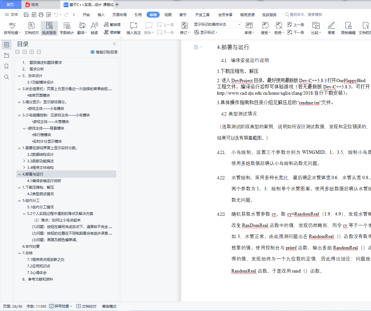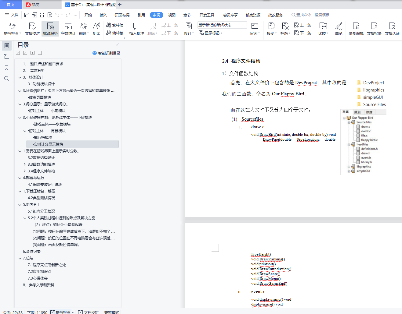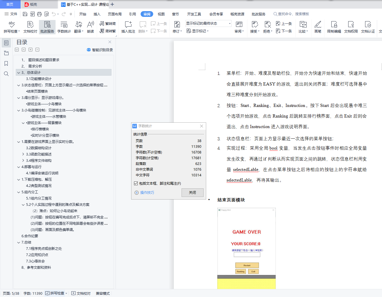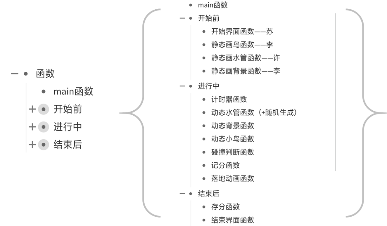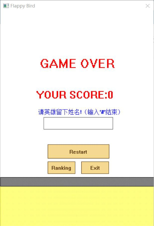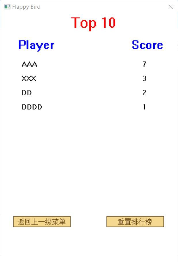 目录1、 题目描述和题目要求 22、 需求分析 23、总体设计 53.1 功能模块设计 53. 状态信息栏:页面上方显示最近一次选择的菜单按钮; 7• 结束页面模块 73. 得分显示:显示游戏得分。 8• 游戏主体――小鸟模块 83. 小鸟碰撞控制:见游戏主体――小鸟模块 8• 游戏主体――水管模块 10• 游戏主体――背景模块 11• 排行榜模块 11• 实时计分显示模块 121. 需要在游戏界面上显示实时分数。 123.2 数据结构设计 123.3 函数功能描述 13void DrawGameEnd() 14void Main() 15void DrawBackground() 16void DrawBird(int state, double bx, double by) 16void DrawPipe(double PipeLocation, double PipeHeight) 17void DrawRanking() 17void PrintRanking() 17void DrawIntroduction() 18void DrawScore() 19void displaymenu() 19void displaygame() 19void displaygameend() 20void CharEventProcess(char ch) 20void KeyboardEventProcess(int key, int event) 21void MouseEventProcess(int x, int y, int button, int event) 21void TimerEventProcess(int timerID) 21void readfile() 22void sortlinkedlist() 22void putfile() 23void initfile() 243.4 程序文件结构 24(1) Sourcefiles 24(2) Headfiles 25(3) Libgraphics 与 simpleGUI 274.部署与运行 284.1 编译安装运行说明 281.下载压缩包,解压 284.2 典型测试情况 285.组内分工 295.1 组内分工情况 295.2 个人实践过程中遇到的难点及解决方案 30(2) 难点:如何让小鸟动起来 30(1) 问题:按钮在编写完成后点下,清屏却不完全。 32(2) 问题:按钮的位置在不同电脑看会有些许误差。 32(3) 问题:画面及颜色偏单调。 336.合作纪要 337.总结 367.1 程序亮点或创新之处 367.2 应用知识点 367.3 心得体会 378、参考文献和资料 401、 题目描述和题目要求Flappy Bird 游戏是一款鸟要尽量穿过越多的水管的游戏,游戏开始后不得暂停,鸟的移动由鼠标右键,键盘空格键以及键盘向上方向键决定,每按一次上升固定高度,否则则加速掉落。游戏目标让鸟通过越多的水管,每通过一个分数加一,一但碰到水管或地面游戏结束。游戏过程中会有状态栏显示当前得分。不同于最原始版的游戏,我们增加了难易度选项,三者的水管生成速度依次加快。其他功能有在设置中的引导指示,即最终的排行榜。在游戏中排名前十的玩家将会被列在排行榜中,输入姓名方式为姓名数入,最后添加一个’#’登入资料。排行榜的内容亦可以清空。2、 需求分析在开始制作游戏之前,我们无数次的挑战了正版的 Flappy Bird 游戏,经过数次讨论,列出了以下的需求,以进行分工。在思路的部份列出以下四个大方向,包含图片素材(声音素材)、启动界面、游戏界面,及分数界面。在这些模块内,我们又继续细分列点,以大致掌握整体工作量。图片素材中包含我们所有的角色(鸟、水管)及背景,然而最终金币级怪物功能未能实现。原先的设定是使金币随机分布,碰触到一个金币等同于经过一个水管的得分;而怪物原先的用途则是为了增加游戏难度,以上两功能都并非原版游戏拥有,而是当时我们自己添加的。在启动界面的部份,除了参考原始界面,我们加入新的难易度功能,包含选择难易度等等。我们希望可以透过难易度的不同,达到能够提高用户广度的功能。在讨论中的我们,还抱有极大的梦想,希望可以在添加商店的功能,让玩家可以自由选择鸟的皮肤,换上自己喜欢的颜色。分数界面的部份则就希望能做出用链表实现的排行榜界面,包含玩家姓名分数及名次,比较没有太多的花样。最后游戏界面的部份是一开始我们就知道将会最困难的部份,不只是界面的样式,还有许多功能函数的需求。我们罗列了以下,在对象方面包含绘制的函数、鸟的移动、背景图片(水管)的移动及随机生成,还有原先设有的金币及怪物的移动等等;在游戏进行方面则有碰撞的判断函数、控制小鸟飞行的回调函数、控制速度的计时器等等;功能方面更设置随时统计分数的状态栏以及最终显示玩家排名的排行榜等功能。