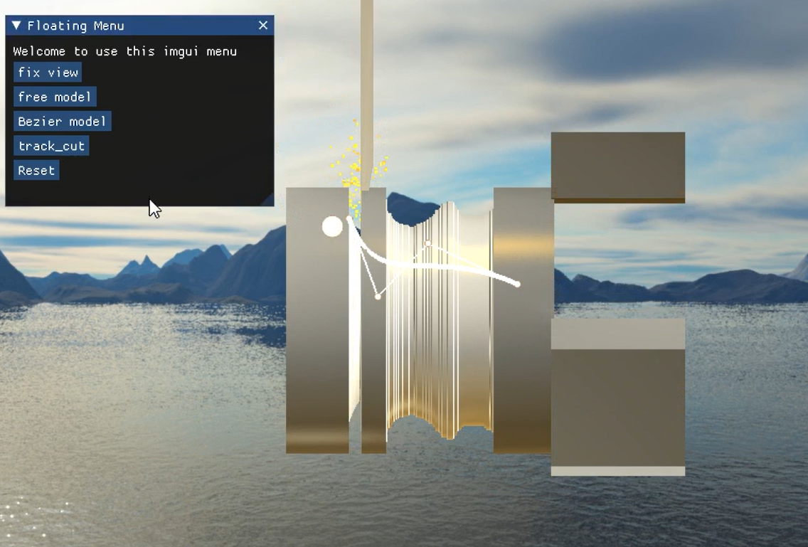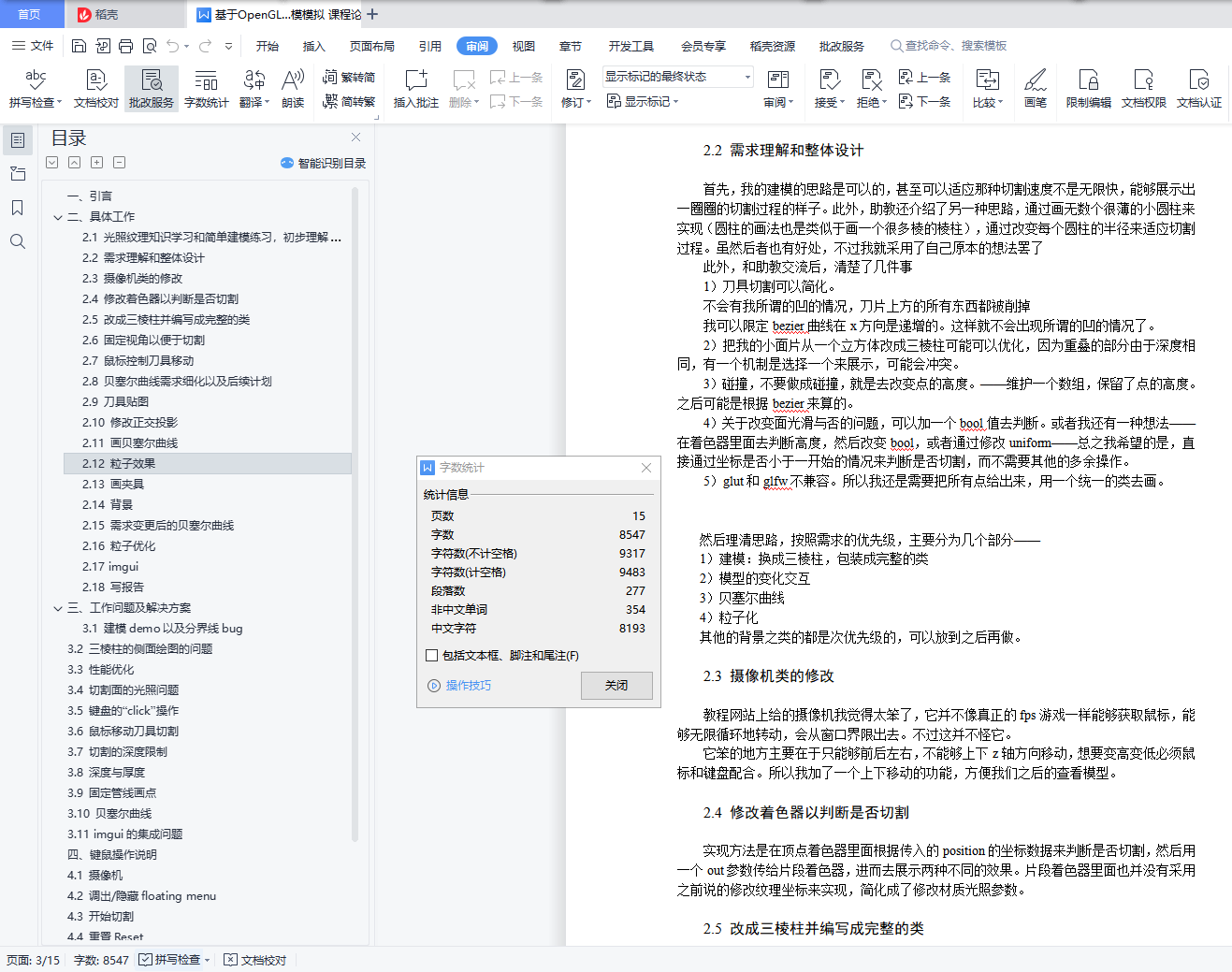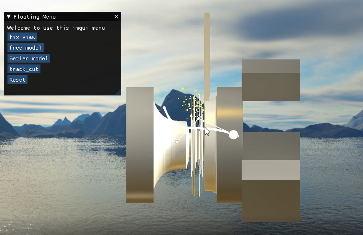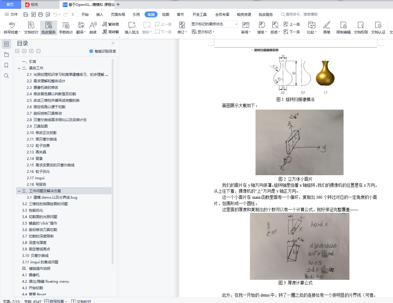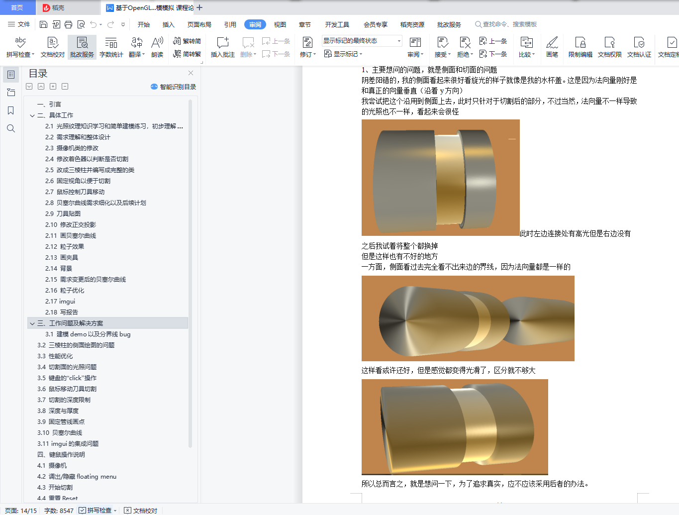 目录一、引言 4二、 具体工作 42.1 光照纹理知识学习和简单建模练习,初步理解项目需求 42.2 需求理解和整体设计 42.3 摄像机类的修改 52.4 修改着色器以判断是否切割 52.5 改成三棱柱并编写成完整的类 52.6 固定视角以便于切割 62.7 鼠标控制刀具移动 62.8 贝塞尔曲线需求细化以及后续计划 62.9 刀具贴图 62.10 修改正交投影 72.11 画贝塞尔曲线 72.12 粒子效果 72.13 画夹具 72.14 背景 72.15 需求变更后的贝塞尔曲线 82.16 粒子优化 82.17 imgui 82.18 写报告 8三、 工作问题及解决方案 83.1 建模demo以及分界线bug 83.2 三棱柱的侧面绘图的问题 93.3 性能优化 113.4 切割面的光照问题 113.5 键盘的“click”操作 113.6 鼠标移动刀具切割 123.7 切割的深度限制 123.8 深度与厚度 123.9 固定管线画点 123.10 贝塞尔曲线 123.11 imgui的集成问题 12四、 键鼠操作说明 124.1 摄像机 124.2 调出/隐藏floating menu 124.3 开始切割 134.4 重置Reset 13五、 参考资料 13六、 后记 13七、 附件 13附件1 13附件2 16一、引言这是我们计算机图形学的考试大作业。其所谓“大”,不但在于它的体量大,包含了我们这学期学到的所有知识――基本绘图,着色器,三维建模,曲线绘制,光照,纹理,坐标变换等等;还在于它的开发流程长――从开始做大作业,到开始写这篇报告已经经历了近一个月的时间,期间还夹杂了其他学科大作业以及考试等等杂项,我也和助教进行了多次大大小小的交流。在这漫长的开发过程中,随着大作业的逐渐完善,我学到的知识也逐渐丰富了起来。本次报告站在项目的终点往回看,以望尽力全面地展示大作业开发过程中的思路和灵感。二、具体工作2.1 光照纹理知识学习和简单建模练习,初步理解项目需求前两次的平时作业都没有涉及到光照以及纹理,而且我开始做大作业的时候,图形学课还没有讲到光照计算,所以我又回到了OpenGL的教程官网[1]去学习光照和纹理相关内容。随着教程的引导,我自己上手建了一个简单的demo,了解了环境光,漫反射,镜面反射三种光的计算及组合,以及设计了平行光和几个点光源。然后还找到了自己满意的纹理图片,尝试了给模型贴图,同时,对于核心的光照变化问题,心里面有了一个解决办法的雏形――对不同的部分采用不同的纹理――用ps把两张图P到一张,然后通过修改纹理坐标去实现不同的效果。同时,看遍了整个教程,我并没有发现能够满足我们的需求的建模教程――那些模型看起来高大上,但是都是固定的,无法交互修改。于是我意识到了一个问题,我们的建模或许不能够是像第一次作业的茶壶一样,导入固定的模型,而是要自己去画,手动建模才能够交互和修改。于是我回去翻了翻三维建模的ppt,决定用旋转扫描的方法来建模――我们的车床本来自然就是一个旋转切削的工件,所以可以用一个很薄的小多边形面片,经过旋转得到初始的圆柱以及切削之后的模型。此外还看了看教程网站上的2D游戏的例子,注意到了碰撞这个问题,可能和我们的刀具和工件的切削交互有关。由于记忆中大一的车工的记忆已经有点浅了,为了理解刀具是如何切削移动的,我又去找了找车床相关的图片。想起来当初自己做过的倒三角等等切割操作,以及发现了刀具不止一种,可以有几种刀相互切换等等问题……之后我用旋转扫描的方法建了一个demo,但是对于之后的刀具到底应该如何移动(要不要和现实一样?),如何切削交互(碰撞?倒三角?),贝塞尔曲线以及一些corner case等等问题,我有点难以抉择。要知道,早期的需求风险是很大的,如果理解出现了差错,那么不但可能会做很多返工,甚至会把原本简单的问题复杂化。于是,我整理了自己的想法和对于作业的疑问(见附件1),决定去请教一下助教。2.2 需求理解和整体设计首先,我的建模的思路是可以的,甚至可以适应那种切割速度不是无限快,能够展示出一圈圈的切割过程的样子。此外,助教还介绍了另一种思路,通过画无数个很薄的小圆柱来实现(圆柱的画法也是类似于画一个很多棱的棱柱),通过改变每个圆柱的半径来适应切割过程。虽然后者也有好处,不过我就采用了自己原本的想法罢了此外,和助教交流后,清楚了几件事1)刀具切割可以简化。不会有我所谓的凹的情况,刀片上方的所有东西都被削掉我可以限定bezier曲线在x方向是递增的。这样就不会出现所谓的凹的情况了。2)把我的小面片从一个立方体改成三棱柱可能可以优化,因为重叠的部分由于深度相同,有一个机制是选择一个来展示,可能会冲突。3)碰撞,不要做成碰撞,就是去改变点的高度。――维护一个数组,保留了点的高度。之后可能是根据bezier来算的。4)关于改变面光滑与否的问题,可以加一个bool值去判断。或者我还有一种想法――在着色器里面去判断高度,然后改变bool,或者通过修改uniform――总之我希望的是,直接通过坐标是否小于一开始的情况来判断是否切割,而不需要其他的多余操作。5)glut和glfw不兼容。所以我还是需要把所有点给出来,用一个统一的类去画。然后理清思路,按照需求的优先级,主要分为几个部分――1)建模:换成三棱柱,包装成完整的类2)模型的变化交互3)贝塞尔曲线4)粒子化其他的背景之类的都是次优先级的,可以放到之后再做。