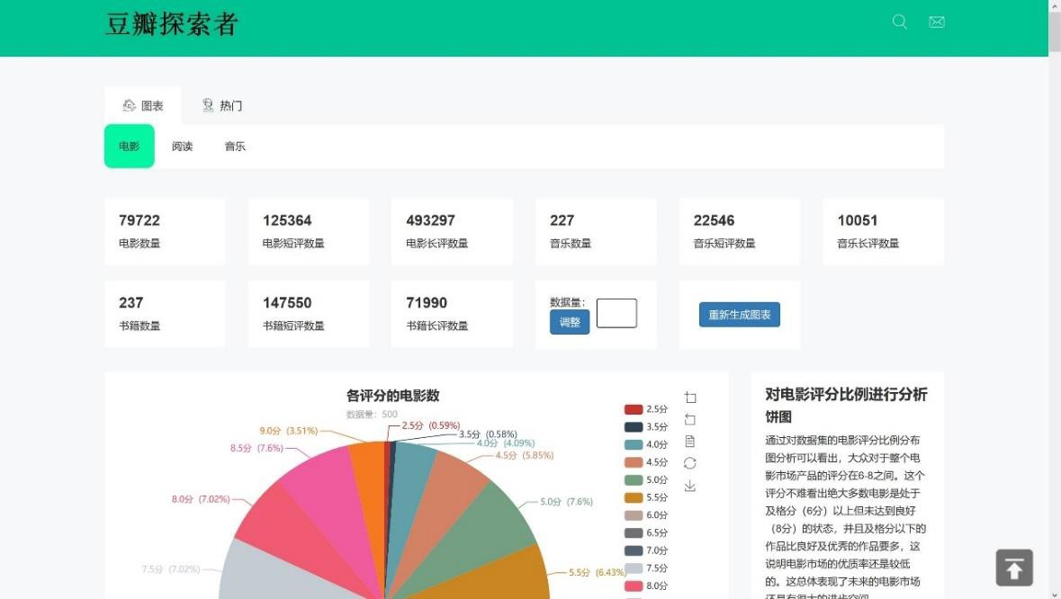 现如今阅读、观影、听歌已成为人们日常生活的一部分,每个人手机里或多或少的都有与这些相关的软件。在每一次的欣赏、聆听的背后,都隐藏着数据的奥秘。比如一部电影每个评分数量的多少,反映了大众对于它的直接评价。每年音乐的发行量,反映了彼时音乐创作人的创作量以及音乐市场的火爆程度。