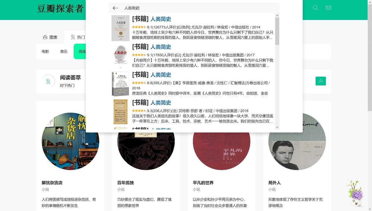 基于以上认识,我们的项目旨在分析与电影、图书、音乐有关的数据去了解一部电影、一首音乐的市场反响,亦或是对多数电影、音乐等综合分析其背后整个市场的情况。因为需要大量的数据集,由此我们便想到了豆瓣这个平台。