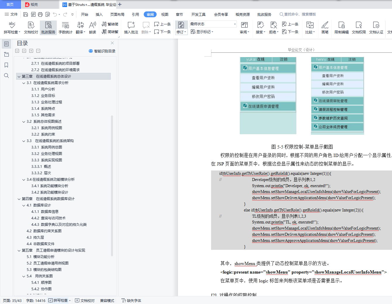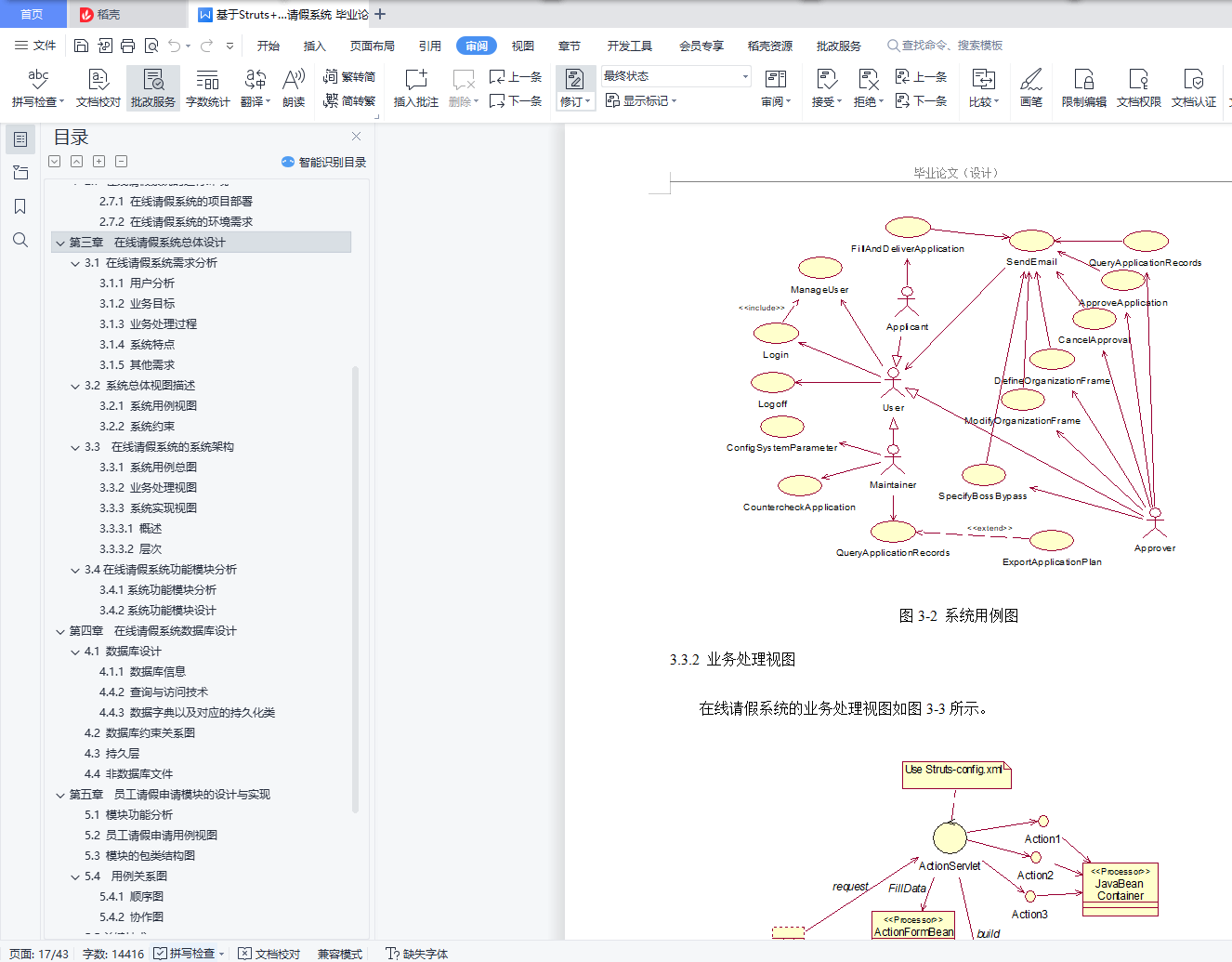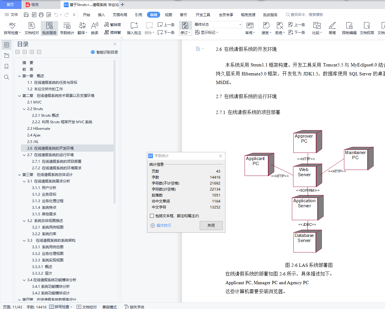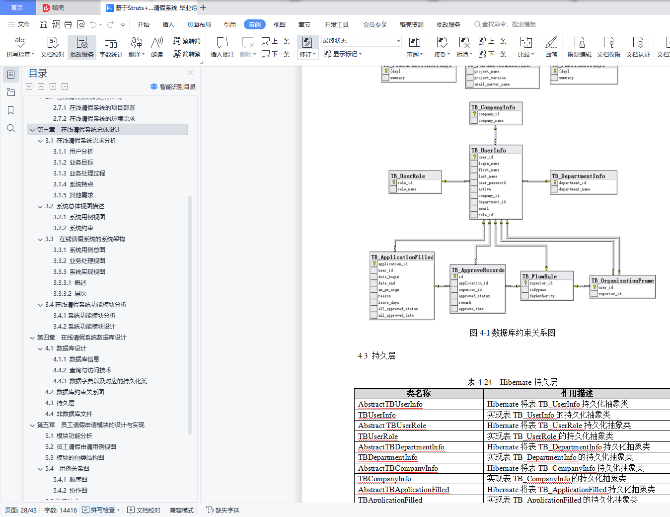 目 录摘 要 1前 言 2第一章 概述 31.1 在线请假系统的任务与目标 31.2 本论文所作的工作 3第二章 在线请假系统技术背景以及支撑环境 42.1 MVC 42.2 Struts 52.2.1 Struts概述 52.2.2 利用Struts框架开发MVC系统 62.3 Hibernate 62.4 Ajax 72.5 JXL 82.6 在线请假系统的开发环境 92.7 在线请假系统的运行环境 92.7.1 在线请假系统的项目部署 92.7.2 在线请假系统的环境需求 10第三章 在线请假系统总体设计 113.1 在线请假系统需求分析 113.1.1 用户分析 113.1.2 业务目标 113.1.3 业务处理过程 123.1.4 系统特点 123.1.5 其他需求 123.2 系统总体视图描述 133.2.1 系统用例视图 133.2.2 系统约束 143.3 在线请假系统的系统架构 143.3.1 系统用例总图 143.3.2 业务处理视图 153.3.3 系统实现视图 163.3.3.1 概述 163.3.3.2 层次 173.4在线请假系统功能模块分析 183.4.1系统功能模块分析 183.4.2系统功能模块设计 18第四章 在线请假系统数据库设计 214.1 数据库设计 214.1.1 数据库信息 214.4.2 查询与访问技术 214.4.3 数据字典以及对应的持久化类 214.2 数据库约束关系图 264.3 持久层 264.4 非数据库文件 27第五章 员工请假申请模块的设计与实现 285.1 模块功能分析 285.2 员工请假申请用例视图 285.3 模块的包类结构图 295.4 用例关系图 315.4.1 顺序图 315.4.2 协作图 315.5关键技术 325.5.1 权限控制 325.5.2 Ajax日期校验 345.5.3 定义组织框架中“环”的问题 365.5.4 利用同步令牌来防止刷新导致的重复提交 36第六章 总结与展望 386.1 课题总结 386.2 课题存在的问题以及解决方案 38参考文献 40致谢 41摘 要随着信息技术的高速发展,信息技术在企业以及机关部门的使用越来越广泛,各种基于B/S架构的管理软件的研究与开发也越来越受到人们的重视。本文基于Struts框架、Hibernate,MVC,详尽阐述了在线请假系统(Leave Application System,LAS)的设计与实现。本系统分为五大模块――用户登录、员工请假申请、请假批准模块、请假流程定义与休假计划维护。文中描述了这些模块的主要设计思想和实现方法,并着重研究和讨论了员工请假申请模块的设计以及系统中的一些关键技术。论文在最后还探讨了系统目前存在的问题与不足,并对如何进一步改善系统进行了讨论。关键词:在线请假系统,MVC,Struts,Hibernate,Ajax作 者: XXX指导老师: YYY前 言随着科学技术的进步,尤其是计算机网络的迅猛发展,人类步入信息时代,人们的生活方式、思维方式、工作方式,以及教育方式也随之改变。同时网络技术的高速发展,计算机的广泛运用,使得实际生活中的问题通过计算机加网络得到了有效的解决。如,管理部门通过计算机可以对大量复杂的工序通过计算机控制,使其极大的降低了错误出现的概率,大幅度提高了工作的效率,从而获得经济效益。又如,每个公司都会遇到员工请假情况,需要经过,填写申请请假的表格,递交给上级批复,有时找不到上级本人递交申请,出现不能及时批复的情况。这样既给员工带来了不便,管理人员需要对请假记录进行归档,方便日后查阅,日积月累,查阅档案也不方便。综上所述,对于员工请假问题很有必要利用计算机来管理工作流程、存储请假文档,从而获得有效的管理。本论文讲述了一个基于公司组织框架的在线请假系统(Leave Application System,LAS)的设计与实现过程,包括系统功能设计、数据库设计以及请假申请模块的详细设计与实现。全文共分为六章。第一章简单阐述了LAS的开发背景,任务目标,以及本文的所做的工作,第二章阐述了LAS相关的技术背景以及的支撑环境,第三章详细描述了LAS的总体设计,包括需求分析等,第四章阐述了LAS的数据库设计以及其持久层设计,第五章重点阐述了LAS中请假申请模块的设计与实现以及LAS中所运用到的关键技术,第六章对课题进行了总结,并且对LAS存在的不足进行说明以及提出有效的解决方案。