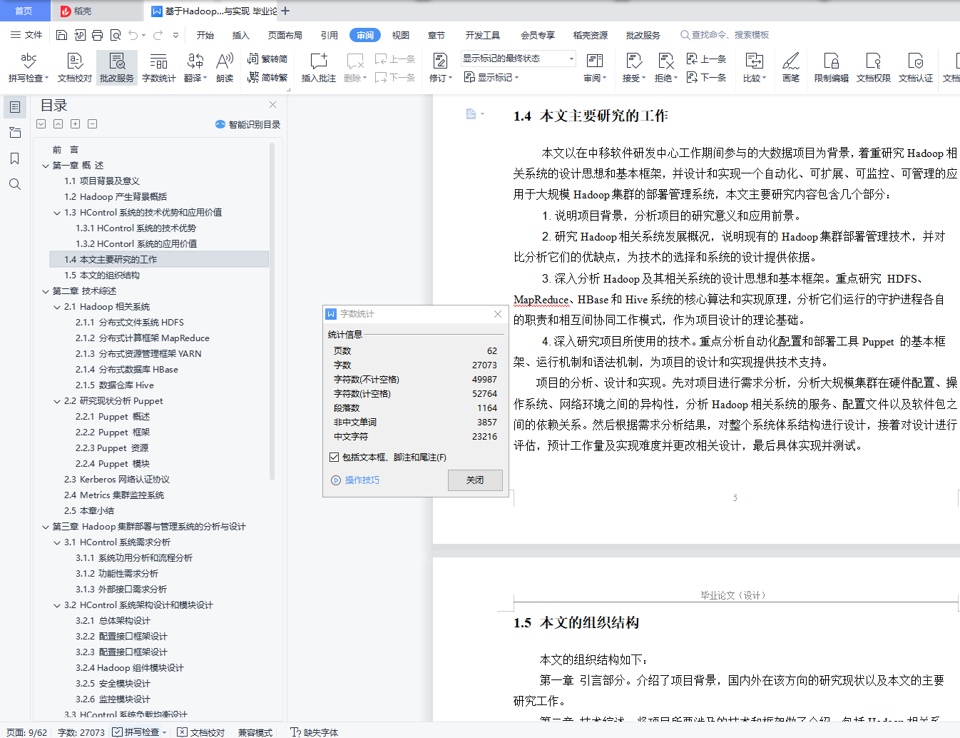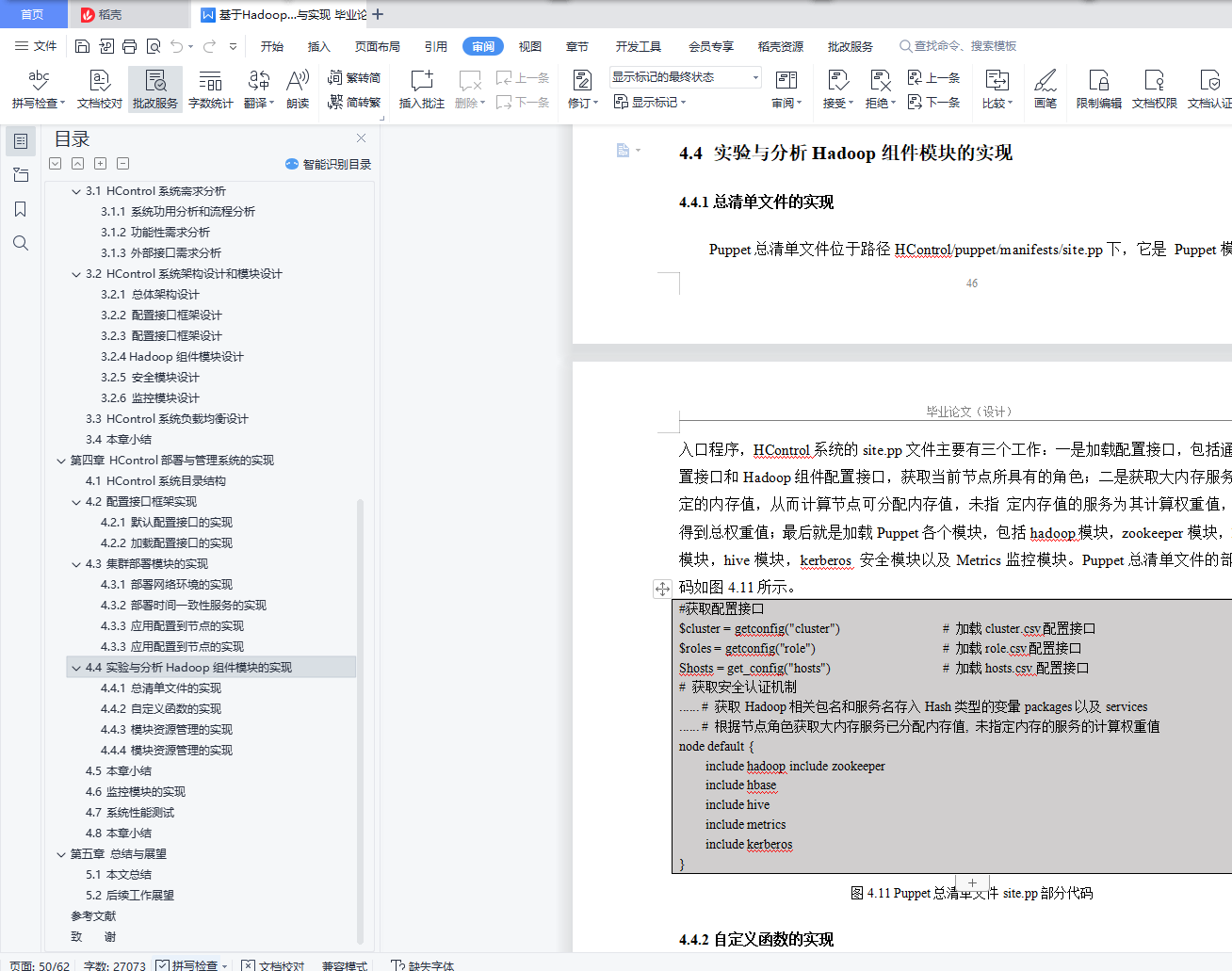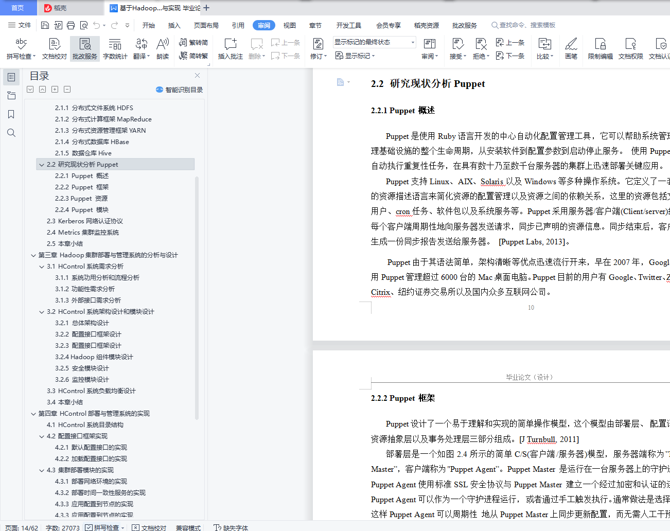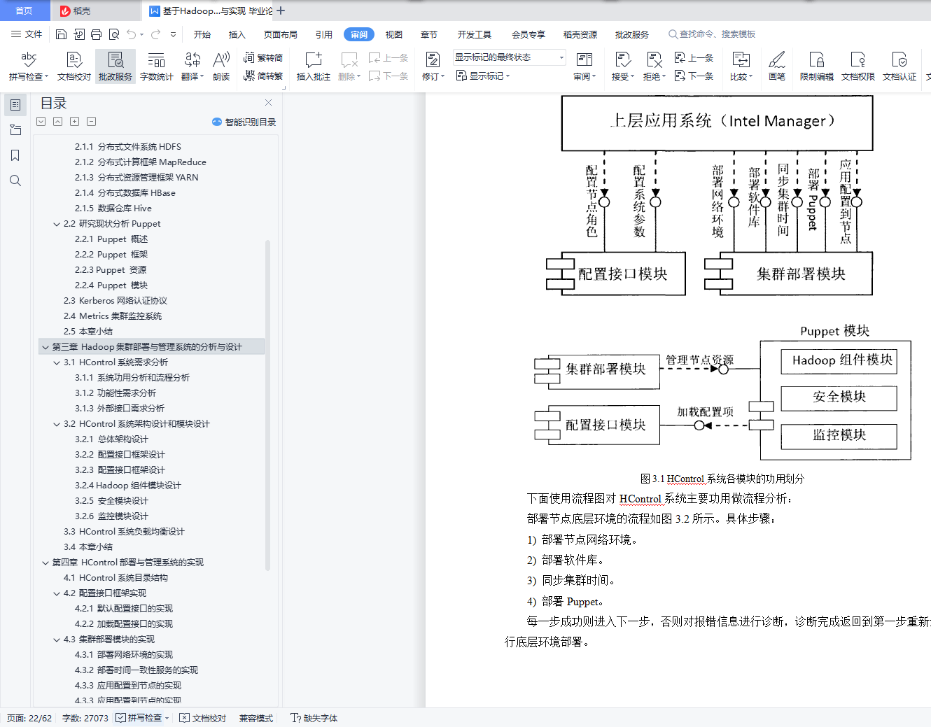 目 录前 言 1第一章 概 述 21.1 项目背景及意义 21.2 Hadoop产生背景概括 21.3 HControl系统的技术优势和应用价值 41.3.1 HControl系统的技术优势 41.3.2 HContorl系统的应用价值 51.4 本文主要研究的工作 61.5 本文的组织结构 6第二章 技术综述 82.1 Hadoop相关系统 82.1.1 分布式文件系统HDFS 82.1.2 分布式计算框架MapReduce 92.1.3 分布式资源管理框架YARN 102.1.4 分布式数据库HBase 102.1.5 数据仓库Hive 112.2 研究现状分析Puppet 112.2.1 Puppet 概述 112.2.2 Puppet 框架 122.2.3 Puppet 资源 132.2.4 Puppet 模块 152.3 Kerberos网络认证协议 162.4 Metrics集群监控系统 162.5 本章小结 17第三章 Hadoop集群部署与管理系统的分析与设计 183.1 HC系统需求分析 183.1.1 系统功用分析和流程分析 183.1.2 功能性需求分析 213.1.3 外部接口需求分析 253.2 HControl系统架构设计和模块设计 263.2.1 总体架构设计 263.2.2 配置接口框架设计 273.2.3 配置接口框架设计 283.2.4 Hadoop组件模块设计 313.2.5 安全模块设计 373.2.6 监控模块设计 373.3 HControl系统负载均衡设计 383.4 本章小结 39第四章 HControl部署与管理系统的实现 404.1 HControl系统目录结构 404.2 配置接口框架实现 404.2.1 默认配置接口的实现 404.2.2 加载配置接口的实现 414.3 集群部署模块的实现 424.3.1 部署网络环境的实现 424.3.2 部署时间一致性服务的实现 434.3.3 应用配置到节点的实现 454.3.3 应用配置到节点的实现 474.4 实验与分析Hadoop组件模块的实现 494.4.1 总清单文件的实现 494.4.2 自定义函数的实现 504.4.3 模块资源管理的实现 514.4.4 模块资源管理的实现 524.5 本章小结 524.6 监控模块的实现 544.7 系统性能测试 564.8 本章小结 57第五章 总结与展望 585.1 本文总结 585.2 后续工作展望 58参考文献 59致 谢 61摘 要今天,随着大数据(Big Data)时代的来临,Hadoop也吸引了越来越多的关注,在各行各业中得到越来越广泛的应用。Hadoop是由Apache基金会所开发的大数据分布式系统基础架构,最核心的设计就是:HDFS、MapReduce和YARN。HDFS提供海量的数据存储, MapReduce提供海量的数据计算,YARN提供集群资源的管理。Hadoop生态日渐增长,其分布式系统也日益庞大,庞大集群系统的维护和监控管理也越来越重要。HControl是基于Apache社区Ambari为基础的大云大数据Hadoop分布式生态系统管理工具,实现集群部署、服务/进程启停、参数配置、集群/主机/服务/进程监控告警等功能的全自动化。集成了Hadoop整个生态圈及周边服务:HDFS、YARN、Mapreduce2、Spark、Tez、Metrics、Hive、HBase、Sqoop2、ZooKeeper、Kafka、Kerberos、NTP、Ranger、LDAP。关键词:大数据,分布式,Ambari,Hadoop,HControl前 言今天,大数据已经引起了各界的高度关注。像互联网应用、科学数据处理、商业智能数据等各行业都在产生海量数据,如何处理和存储这些海量数据成为亟待解决的问题。Hadoop提供了一个可靠的共享存储和分析系统,由Apache基金会所开发的分布式系统基础架构。用户可以在不了解分布式底层细节的情况下,开发分布式程序。充分利用集群的威力进行高速运算和存储。Hadoop实现了一个分布式文件系统(Hadoop Distributed File System),简称HDFS。HDFS有高容错性的特点,并且设计用来部署在低廉的(low-cost)硬件上;而且它提供高吞吐量(high throughput)来访问应用程序的数据,适合那些有着超大数据集(large data set)的应用程序。HDFS放宽了(relax)POSIX的要求,可以以流的形式访问(streaming access)文件系统中的数据。Hadoop的框架最核心的设计就是:HDFS和MapReduce。HDFS为海量的数据提供了存储,则MapReduce为海量的数据提供了计算。其核心组件有:Hdfs、Yarn、MapReduce;Hadoop广义上是指一个生态圈,泛指大数据技术相关的开源组件或产品,如HDFS、Yarn、HBase、Hive、Spark、Pig、Zookeeper、Kafka、Flume、Phoenix、Sqoop。Hadoop 是最受欢迎的在 Internet 上对搜索关键字进行内容分类的工具,但它也可以解决许多要求极大伸缩性的问题。例如,如果您要 Grep一个 10TB 的巨型文件,会出现什么情况?在传统的系统上,这将需要很长的时间。但是 Hadoop 在设计时就考虑到这些问题,采用并行执行机制,因此能大大提高效率。部署并管理一个庞大的Hadoop集群并不是一件轻松的工作,这主要是因为Hadoop相关系统的众多配置参数以及成百上千台服务器的集群规模。因此,如何快速自动化地构建可用的Hadoop集群成为值得研究的重要课题。本文对Hadoop生态圈相关系统进行了深入的研究,并对比分析现有部署管理技术,最终设计和实现了Hadoop集群的部署与管理系统HControl,该系统旨在自动化地部署Hadoop相关系统、管理集群节点角色、修改配置参数、启动停止系统服务并监控系统运行状态。