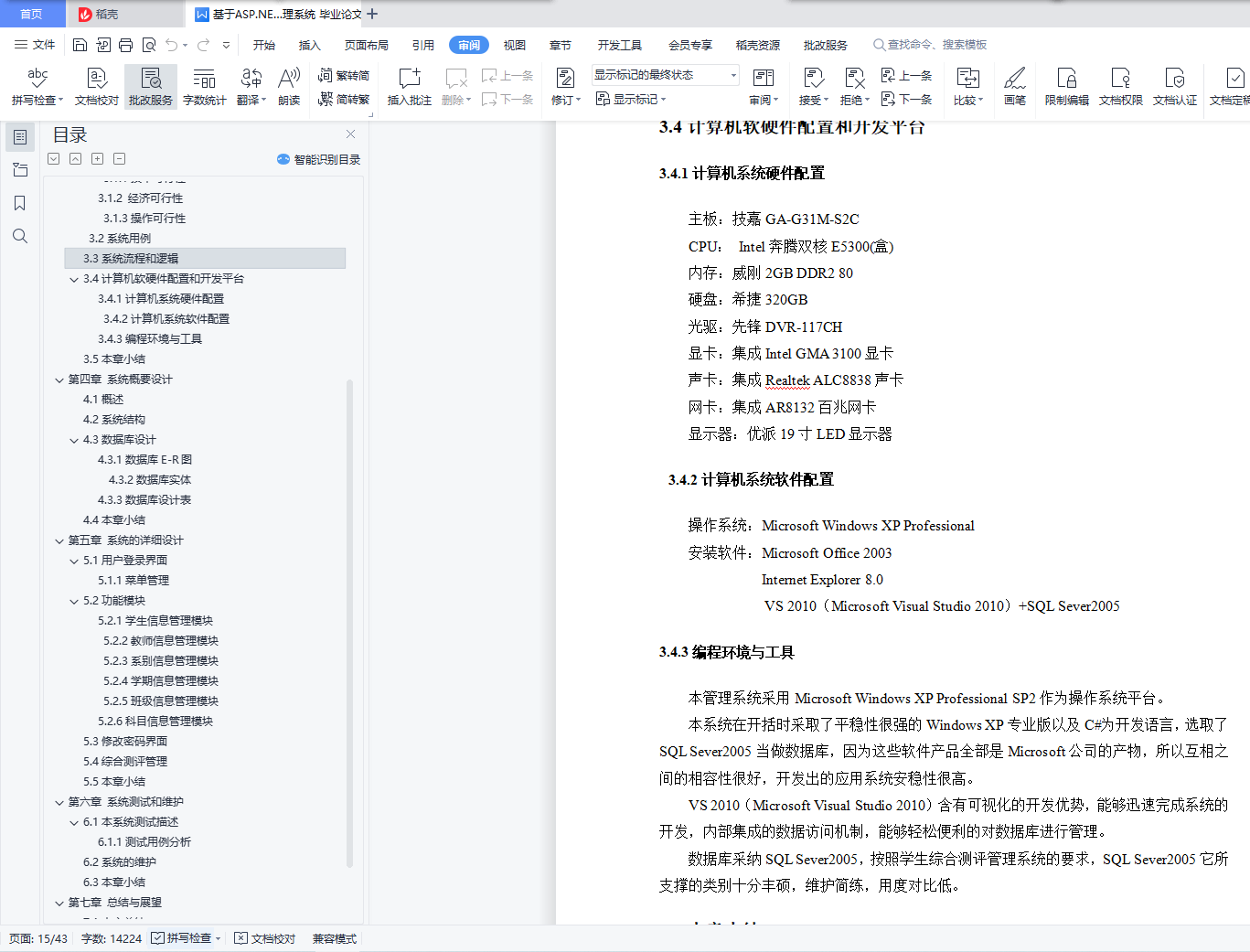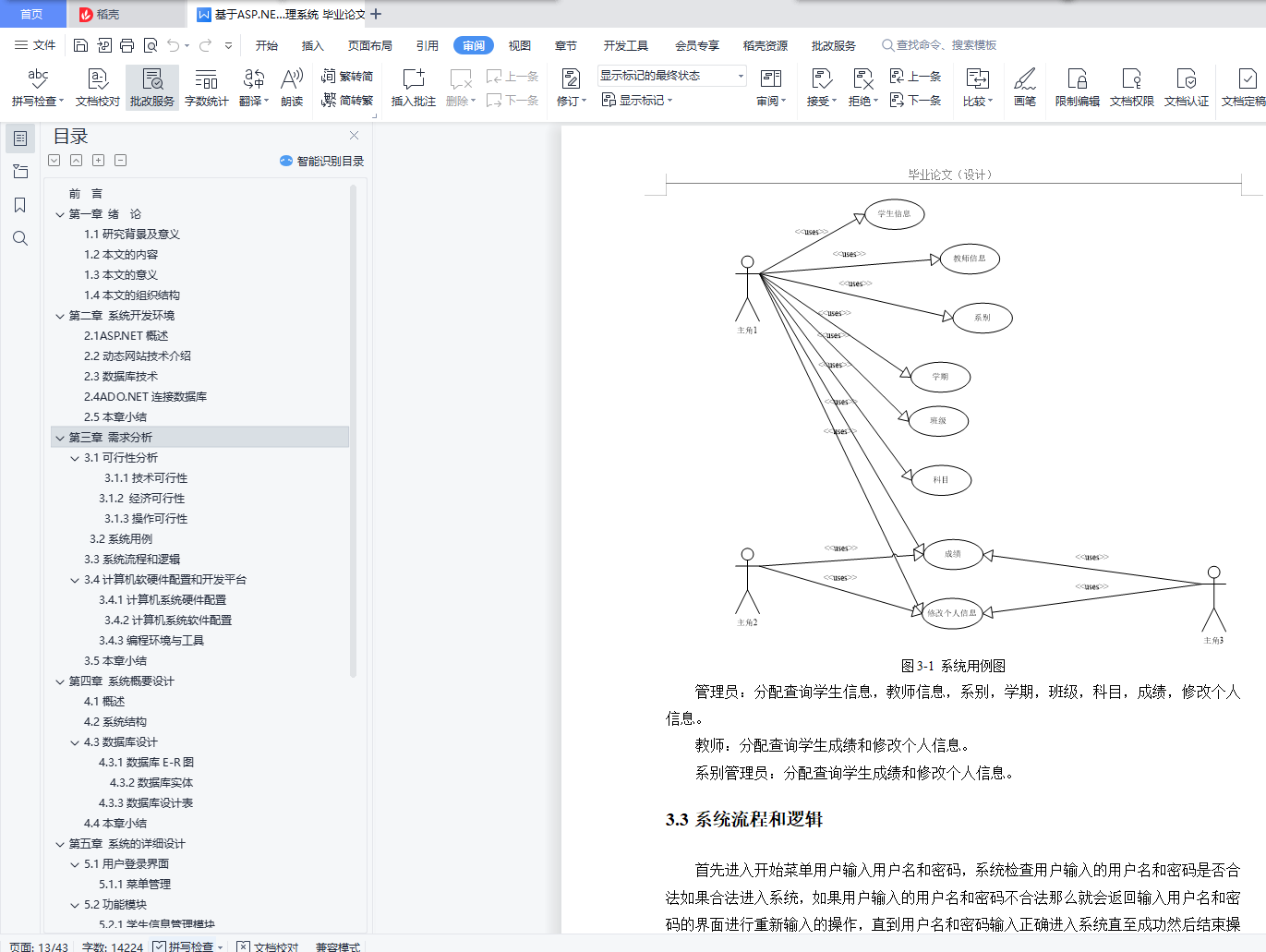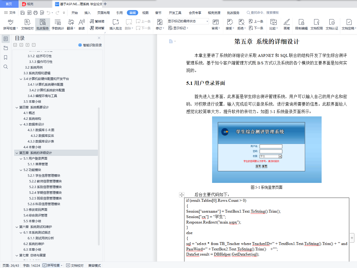 目 录前 言 1第一章 绪 论 21.1研究背景及意义 21.2本文的内容 31.3本文的意义 31.4本文的组织结构 3第二章 系统开发环境 52.1ASP.NET概述 52.2动态网站技术介绍 62.3数据库技术 62.4ADO.NET连接数据库 62.5本章小结 7第三章 需求分析 83.1可行性分析 83.1.1技术可行性 83.1.2经济可行性 83.1.3操作可行性 93.2系统用例 93.3系统流程和逻辑 103.4计算机软硬件配置和开发平台 123.4.1计算机系统硬件配置 123.4.2计算机系统软件配置 123.4.3编程环境与工具 123.5本章小结 12第四章 系统概要设计 144.1概述 144.2系统结构 144.3数据库设计 154.3.1数据库E-R图 154.3.2数据库实体 154.3.3数据库设计表 194.4本章小结 22第五章 系统的详细设计 235.1用户登录界面 235.1.1菜单管理 245.2功能模块 255.2.1学生信息管理模块 255.2.2教师信息管理模块 275.2.3系别信息管理模块 285.2.4学期信息管理模块 295.2.5班级信息管理模块 305.2.6科目信息管理模块 315.3修改密码界面 325.4综合测评管理 335.5本章小结 35第六章 系统测试和维护 366.1本系统测试描述 366.1.1测试用例分析 366.2系统的维护 376.3本章小结 37第七章 总结与展望 387.1本文总结 387.2后续工作展望 38参考文献 39致 谢 40摘 要随着信息技术在办理上越来越深切而普遍的应用,学生综合测评管理的实施在技术上已慢慢成熟。本文介绍了在VS 2010(Microsoft Visual Studio 2010)环境下采用自上而下地总体计划,自下而上的应用战略开拓一个学生综合测评管理系统。通过分析学生综合测评管理的不够,创建了一个学生综合测评管理系统的方案。文章讲了学生综合测评管理系统的系统分析部分,包含可行性分析、系统用例分析等,系统设计主要介绍了系统功能设计和数据库设计及代码设计。学生综合测评管理系统可以说是一个综合性的学生管理系统,这此中包括了用户登录模块的实现、学生信息管理模块、教师信息管理模块、系别信息管理模块、学期信息管理模块、班级信息管理模块、科目信息管理模块、修改密码模块、综合测评管理模块等,因此具有一定的实用性。本站是一个B/S(Browser/Server,浏览器/服务器结构)模式系统,采取了目前盛行的ASP.NET技术。系统界面友好,操作简单适用并且便利。关键词: 综合测评;ASP.NET技术;B/S前 言学生综合测评管理是最主要的管理方法之一,相对而言,传统的管理已经落后了如今都采用先进的技术进行有效的管理。怎样做到规范管理降低出错率,提高管理效率才是目前的首要任务。学生综合测评管理是学校一年一度的首要工作,为了保证公平公正公开的原则、数据庞大、计算复杂等特点,目前最普遍采用的方法是使用手工收集测评数据并进行计算,不能够保证测评数据的安全性和准确性。随着计算机信息技术日益发展壮大,很多领域都已经实现了信息技术的管理,如果本领域仍然在使用传统的手工方式,浪费了大量的人力物力和时间。随着技术的进一步发展,这一工作必将实现自动化管理,保证学生综合测评的数据更加的全面,让教师掌握学生各科成绩是否达标,针对不达标的科目采取针对性的措施让学生的成绩能够提高,对于取得好成绩的同学进行嘉奖,通过学生综合测评管理的表能够一目了然,掌握的信息更加的完善。基于上述所述,开拓了学生综合测评管理系统,界面友好,操作简单便利,易于使用,一心一意做到最好。当然系统中还是存在着许多的问题还需要努力。