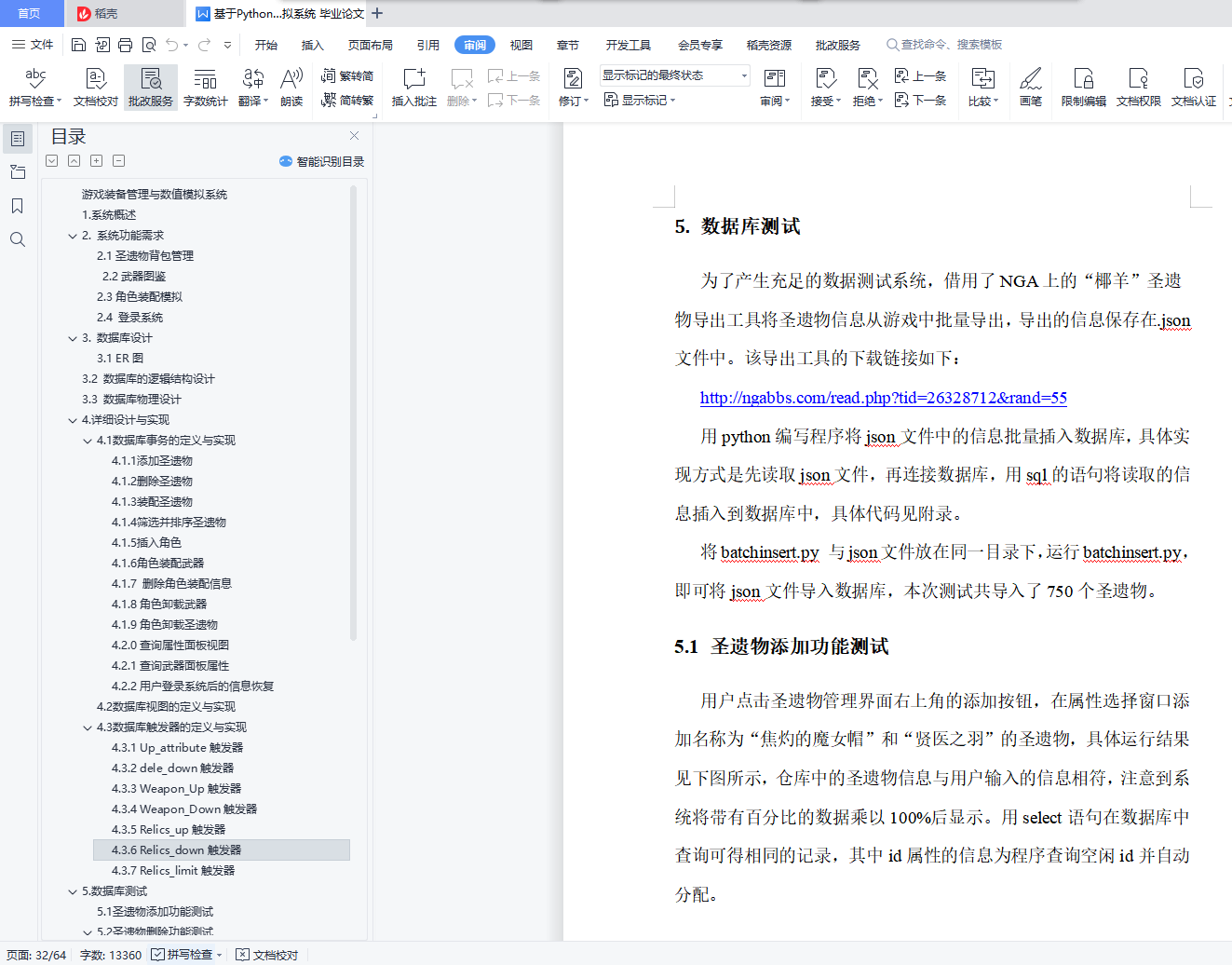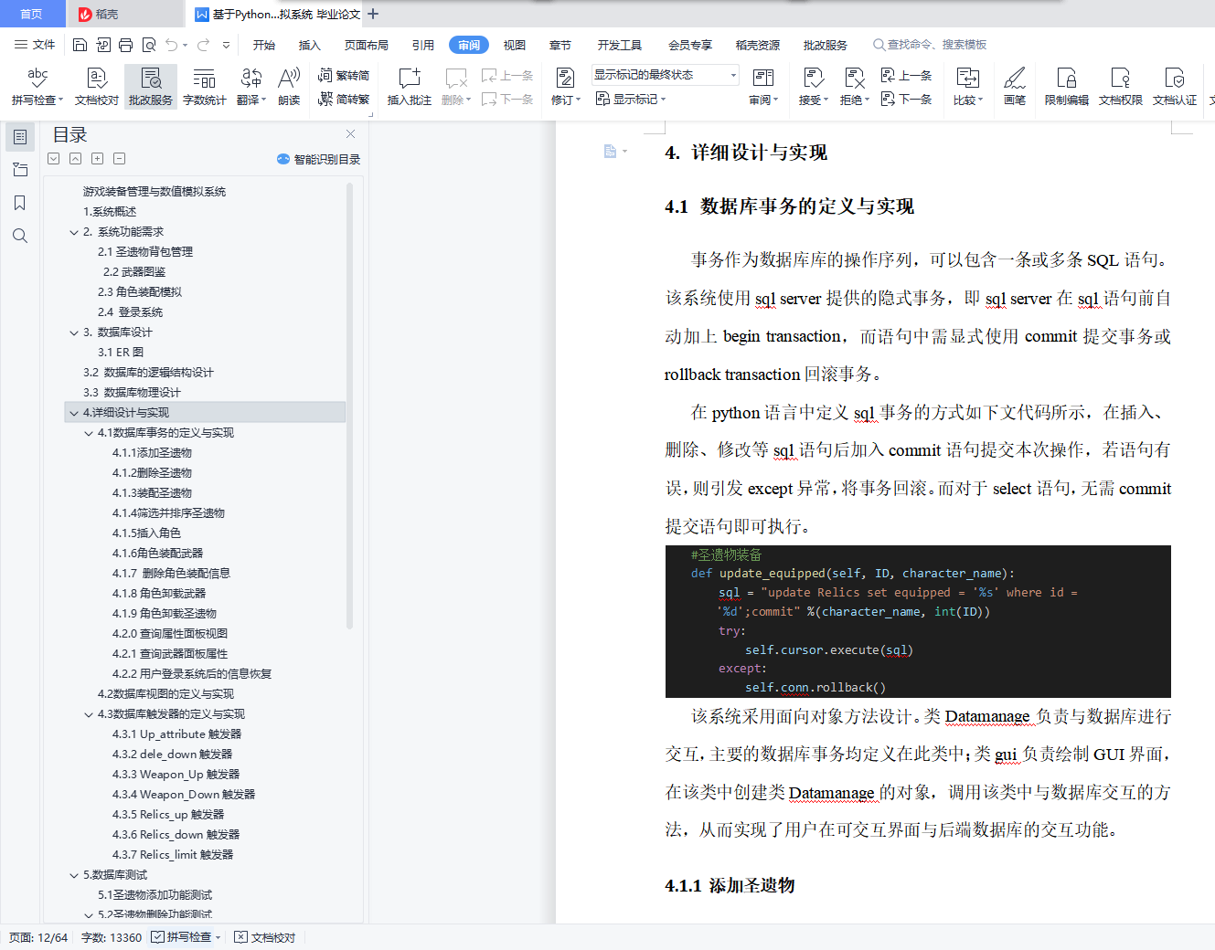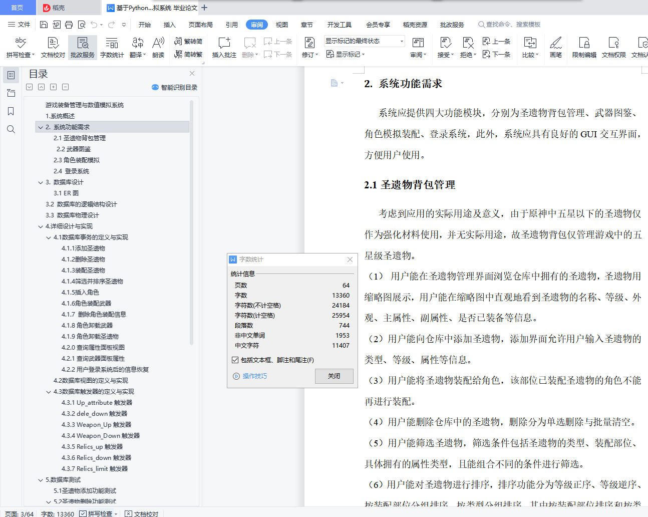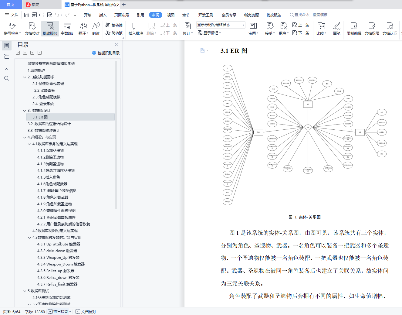 游戏装备管理与数值模拟系统目录游戏装备管理与数值模拟系统 11. 系统概述 12. 系统功能需求 22.1圣遗物背包管理 22.2武器图鉴 32.3角色装配模拟 32.4 登录系统 43. 数据库设计 53.1 ER图 53.2 数据库的逻辑结构设计 63.3 数据库物理设计 104. 详细设计与实现 114.1 数据库事务的定义与实现 114.2 数据库视图的定义与实现 214.3 数据库触发器的定义与实现 225. 数据库测试 305.1 圣遗物添加功能测试 315.2 圣遗物删除功能测试 335.3 圣遗物筛选功能测试 365.4 圣遗物排序功能测试 385.5 武器图鉴功能测试 425.6 角色装配模拟测试 435.7 登录系统与数据恢复测试 571.系统概述原神作为一款当下热门的游戏,有着较为丰富的装备系统和角色属性,该系统旨在辅助用户管理游戏装备,并对游戏角色进行模拟装配。系统通过复杂的数值计算帮助用户查看装配装备后的角色属性,如攻击力、暴击率、暴击伤害等,从而方便玩家对角色进行装备选择和强度评估。原神装备分为武器和圣遗物,圣遗物按装配部位又可进一步分为花、羽毛、沙漏、杯子、头盔五种。玩家拥有的每个角色只能装配一把武器和五个不同部位的圣遗物。武器拥有名称、主属性、副属性、技能信息,圣遗物拥有装配部位、类型、名称、等级、主属性、副属性信息。武器和圣遗物的详细信息可见数据库中表的属性定义。2. 系统功能需求系统应提供四大功能模块,分别为圣遗物背包管理、武器图鉴、角色模拟装配、登录系统,此外,系统应具有良好的GUI交互界面,方便用户使用。2.1圣遗物背包管理考虑到应用的实际用途及意义,由于原神中五星以下的圣遗物仅作为强化材料使用,并无实际用途,故圣遗物背包仅管理游戏中的五星级圣遗物。(1) 用户能在圣遗物管理界面浏览仓库中拥有的圣遗物,圣遗物用缩略图展示,用户能在缩略图中直观地看到圣遗物的名称、等级、外观、主属性、副属性、是否已装备等信息。(2)用户能向仓库中添加圣遗物,添加界面允许用户输入圣遗物的类型、等级、属性等信息。(3)用户能将圣遗物装配给角色,该部位已装配圣遗物的角色不能再进行装配。(4)用户能删除仓库中的圣遗物,删除分为单选删除与批量清空。(5)用户能筛选圣遗物,筛选条件包括圣遗物的类型、装配部位、具体拥有的属性类型,且能组合不同的条件进行筛选。(6)用户能对圣遗物进行排序,排序功能分为等级正序、等级逆序、按装配部位分组排序、按类型分组排序,其中按装配部位排序和按类型排序是互斥的。(7)用户能将外部的圣遗物数据批量导入数据库。2.2武器图鉴该系统收纳原神中的五星级武器,因武器数量少,玩家在游戏中没有管理需求,故需提供查询功能,方便用户进行合理地角色装配。(1)用户可在武器图鉴界面浏览游戏中的武器。(2)武器以图片形式展示,用户可单击武器图片,在界面右侧查看武器的详细信息。2.3角色装配模拟(1)用户可在角色装配模拟界面添加角色,新添加的角色默认无装备,相同角色在仓库中不能存在多个。(2)用户可为仓库中的角色装配或卸载武器和圣遗物。(3)用户能查看角色的属性值,新角色入库后,属性为游戏中该角色90级的基本属性,角色的属性值会随着武器,圣遗物的装配和卸下而动态变化。(4)用户能删除仓库中的角色,删除功能分为单选删除与批量清空。2.4 登录系统(1)用户拥有自己的账户信息,每次启动该系统前需要输入登录信息连接数据库。(2)系统能根据用户的登录信息,用后端数据库的数据初始化用户仓库,即用数据库信息在前端界面恢复用户数据。(3)用户输入了错误的账户信息,系统能提示用户信息有误,需要重新输入信息。