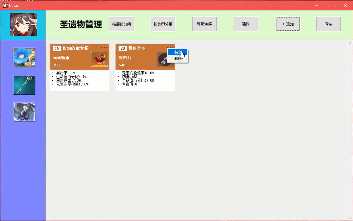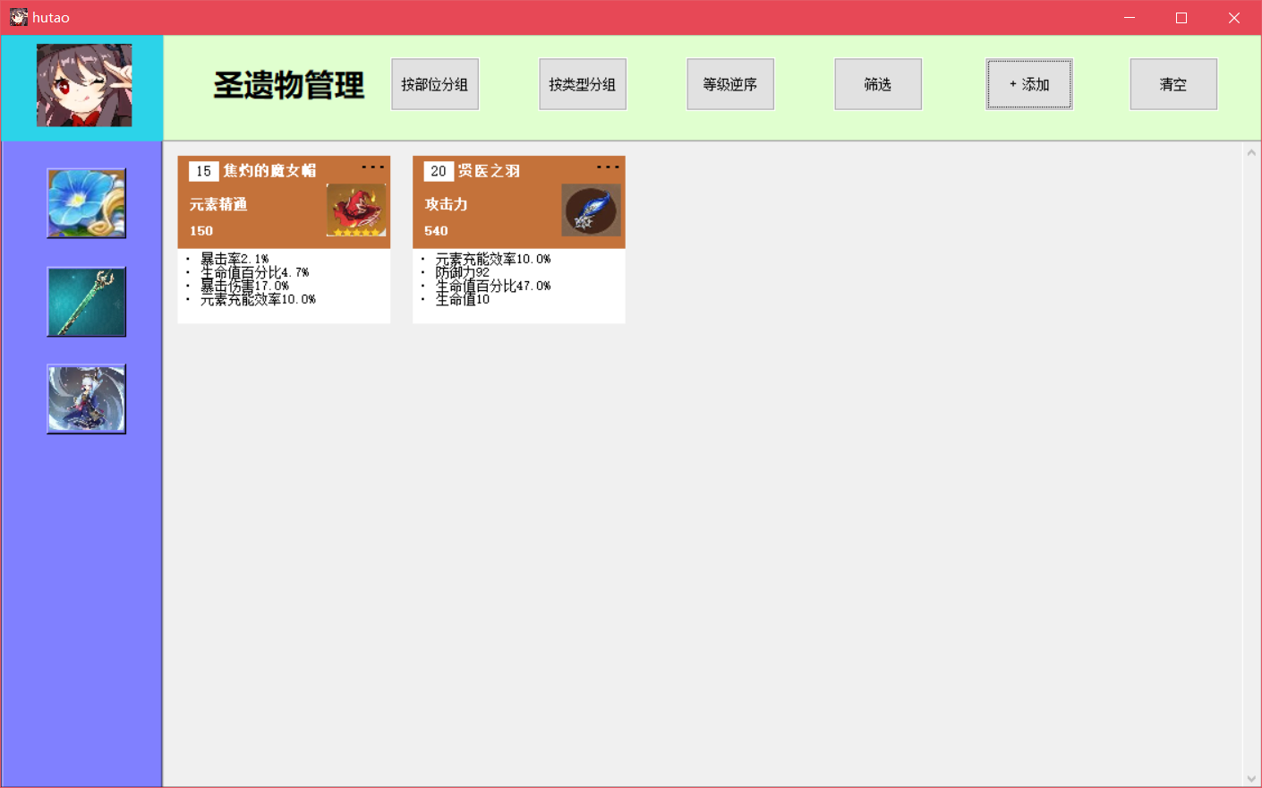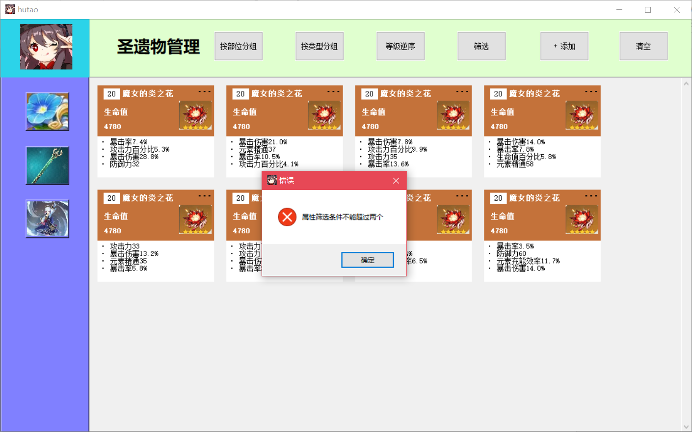 游戏装备管理与数值模拟系统目录游戏装备管理与数值模拟系统 11. 系统概述 12. 系统功能需求 22.1圣遗物背包管理 22.2武器图鉴 32.3角色装配模拟 32.4 登录系统 43. 数据库设计 53.1 ER图 53.2 数据库的逻辑结构设计 63.3 数据库物理设计 104. 详细设计与实现 114.1 数据库事务的定义与实现 114.2 数据库视图的定义与实现 214.3 数据库触发器的定义与实现 225. 数据库测试 305.1 圣遗物添加功能测试 315.2 圣遗物删除功能测试 335.3 圣遗物筛选功能测试 365.4 圣遗物排序功能测试 385.5 武器图鉴功能测试 425.6 角色装配模拟测试 435.7 登录系统与数据恢复测试 571.系统概述原神作为一款当下热门的游戏,有着较为丰富的装备系统和角色属性,该系统旨在辅助用户管理游戏装备,并对游戏角色进行模拟装配。系统通过复杂的数值计算帮助用户查看装配装备后的角色属性,如攻击力、暴击率、暴击伤害等,从而方便玩家对角色进行装备选择和强度评估。原神装备分为武器和圣遗物,圣遗物按装配部位又可进一步分为花、羽毛、沙漏、杯子、头盔五种。玩家拥有的每个角色只能装配一把武器和五个不同部位的圣遗物。武器拥有名称、主属性、副属性、技能信息,圣遗物拥有装配部位、类型、名称、等级、主属性、副属性信息。武器和圣遗物的详细信息可见数据库中表的属性定义。2. 系统功能需求系统应提供四大功能模块,分别为圣遗物背包管理、武器图鉴、角色模拟装配、登录系统,此外,系统应具有良好的GUI交互界面,方便用户使用。2.1圣遗物背包管理考虑到应用的实际用途及意义,由于原神中五星以下的圣遗物仅作为强化材料使用,并无实际用途,故圣遗物背包仅管理游戏中的五星级圣遗物。(1) 用户能在圣遗物管理界面浏览仓库中拥有的圣遗物,圣遗物用缩略图展示,用户能在缩略图中直观地看到圣遗物的名称、等级、外观、主属性、副属性、是否已装备等信息。(2)用户能向仓库中添加圣遗物,添加界面允许用户输入圣遗物的类型、等级、属性等信息。(3)用户能将圣遗物装配给角色,该部位已装配圣遗物的角色不能再进行装配。(4)用户能删除仓库中的圣遗物,删除分为单选删除与批量清空。(5)用户能筛选圣遗物,筛选条件包括圣遗物的类型、装配部位、具体拥有的属性类型,且能组合不同的条件进行筛选。(6)用户能对圣遗物进行排序,排序功能分为等级正序、等级逆序、按装配部位分组排序、按类型分组排序,其中按装配部位排序和按类型排序是互斥的。(7)用户能将外部的圣遗物数据批量导入数据库。2.2武器图鉴该系统收纳原神中的五星级武器,因武器数量少,玩家在游戏中没有管理需求,故需提供查询功能,方便用户进行合理地角色装配。(1)用户可在武器图鉴界面浏览游戏中的武器。(2)武器以图片形式展示,用户可单击武器图片,在界面右侧查看武器的详细信息。2.3角色装配模拟(1)用户可在角色装配模拟界面添加角色,新添加的角色默认无装备,相同角色在仓库中不能存在多个。(2)用户可为仓库中的角色装配或卸载武器和圣遗物。(3)用户能查看角色的属性值,新角色入库后,属性为游戏中该角色90级的基本属性,角色的属性值会随着武器,圣遗物的装配和卸下而动态变化。(4)用户能删除仓库中的角色,删除功能分为单选删除与批量清空。2.4 登录系统(1)用户拥有自己的账户信息,每次启动该系统前需要输入登录信息连接数据库。(2)系统能根据用户的登录信息,用后端数据库的数据初始化用户仓库,即用数据库信息在前端界面恢复用户数据。(3)用户输入了错误的账户信息,系统能提示用户信息有误,需要重新输入信息。