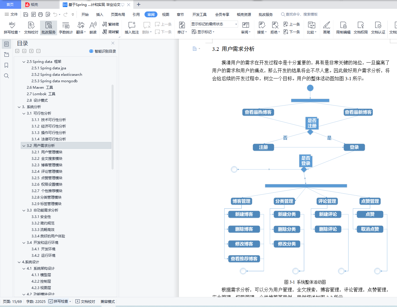 摘 要随着现在信息化时代的发展,越来越多的人喜欢把自己的一些见解和心得记下来,放到一个平台上,希望别人来观看和交流。所以博客孕育而生,特别是技术类的博客,更是给开发者带来更多学习他人经验与技术的机会和与提供和别人交流和分享的一个平台。本课题将许多当前比较热门的技术框架有机的集合起来,比如Spring boot、Spring data、Elasticsearch等。同时采用Java8作为主要开发语言,利用新型API,改善传统的开发模式和代码结构,实现了具有实时全文搜索、博客编辑、分布式文件存贮和能够在浏览器中适配移动端等功能的响应式技术博客。在保证功能够全部实现的同时,使用一些比如回归测试和后台测试驱动开发,以及最后的postman接口测试和浏览器适配移动端等成熟的测试技术和方法。测试结果符合预期,系统功能完善,有良好的用户体验。确保系统上线后是一个能够给用户分享经验和心得,以及学习他人优秀成果的系统。关键字:Spring Boot; Blog; Java; Elasticsearch;ABSTRACTWith the development of the information age, more and more people like to put some of their views and thoughts down, put them on a platform, and hope to see and communicate with others. So blogs are born, especially technical blogs, to give developers more opportunities to learn from others' experience and technology, and a platform to communicate and share with others.This topic organically integrates many popular technical frameworks, such as Spring boot, Spring data, Elasticsearch and so on. At the same time, Java8 is used as the main development language, and the new API is used to improve the traditional development mode and code structure. A response technology blog with real-time full text search, blog editing, distributed file storage and the ability to fit mobile terminal in browsers is realized.While guaranteeing the full realization of the work, some mature testing techniques and methods such as regression testing and back-end test drive development, and the final postman interface test and browser fit mobile end are used. The test results meet the expectations, the system is functional and has a good user experience. To ensure that the system is on-line, it is a system that can provide users with experience and experience, and learn from others' outstanding achievements.Keywords: Spring Boot; Blog; Java; Elasticsearch;目录1 绪论 11.1 项目背景 11.2 本课题的国内外研究现状 11.3 本课题研究意义 21.4 课题研究内容 31.5 本论文组织结构 32 开发环境与相关技术 42.1 Windows系统介绍 42.2 Java语言 42.3 Spring boot框架 52.4 Spring security 框架 52.5 Spring data 框架 52.5.1 Spring data jpa 52.5.2 Spring data elasticsearch 62.5.3 Spring data mongodb 62.6 Maven 工具 72.7 Lombok 工具 72.8 设计模式 73. 系统分析 83.1 可行性分析 83.1.1 技术可行性分析 83.1.2 经济可行性分析 83.1.3 操作可行性分析 83.1.4 法律可行性分析 83.2 用户需求分析 93.2.1 用户管理模块 103.2.2 全文搜索模块 113.2.3 博客管理模块 133.2.4 评论管理模块 143.2.5 点赞管理模块 153.2.6 权限设置模块 163.2.7 个性推荐模块 173.2.8分类管理模块 183.2.9标签管理模块 193.3 非功能需求分析 203.3.1安全性 203.3.2简约规范 203.3.3流畅高效 203.3.4良好的用户体验 203.4 开发和运行环境 203.4.1 开发环境 203.4.2 运行环境 214.系统设计 224.1 系统架构设计 224.1.1模型层 224.2.2控制层 234.2.3视图层 234.2 功能模块设计 244.2.1用户管理模块 254.2.2全文搜索模块 254.2.3博客管理模块 254.2.4评论管理模块 264.2.5点赞管理模块 264.2.6权限设置模块 264.2.7个性推荐模块 264.3 数据模型设计 264.3.1博客模型 274.3.2用户模型 284.3.3博客评论模型 284.3.4评论模型 294.3.5分类模型 294.3.6博客点赞模型 294.3.7点赞模型 294.3.8权限模型 304.3.9用户权限模型 305. 系统实现 315.1 数据获取层 315.1.1 用户管理模块 315.1.2 博客管理模块 325.1.3 点赞管理模块 365.1.4评论管理模块 375.1.5分类管理模块 405.2 数据构建层 435.2.1 用户管理模块 435.2.2 博客管理模块 445.2.3 分类管理模块 445.2.4 点赞管理模块 455.2.5 评论管理模块 455.2.6 权限管理模块 465.3 数据展示层 475.5.1登录界面 475.5.2注册界面 475,5.3博客主页界面 485.4.4创建博客界面 495.5.5查看博客界面 505.5.6点赞界面 505.5.7评论界面 515.5.8用户主页界面 515.5.9个人设置界面 525.5.10头像变更切图界面 525.5.11分类管理界面 536. 软件测试 546.1 测试环境 546.2 测试方法 546.3 测试用例设计 566.4 测试结果 597. 总结和展望 607.1 毕业设计工作总结 607.2 展望 60致谢 61参考文献 62