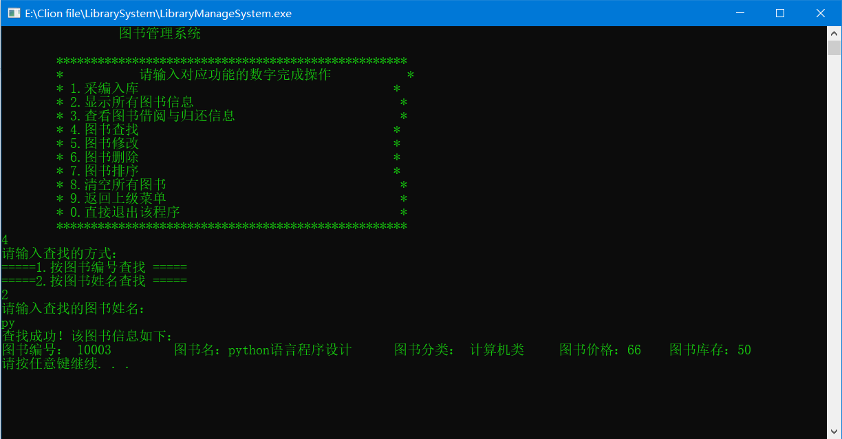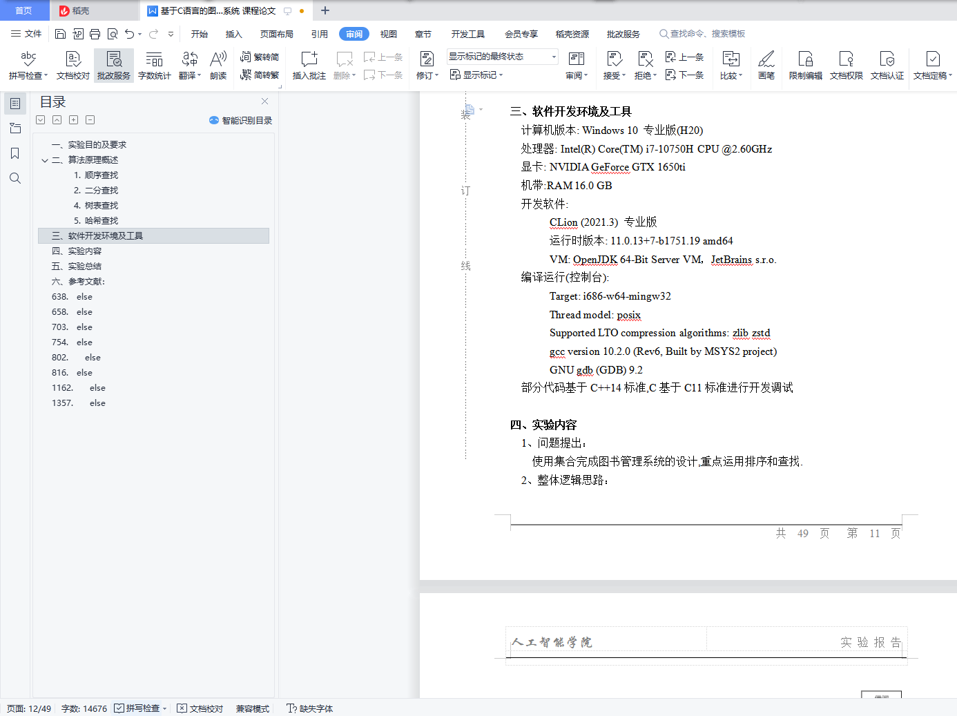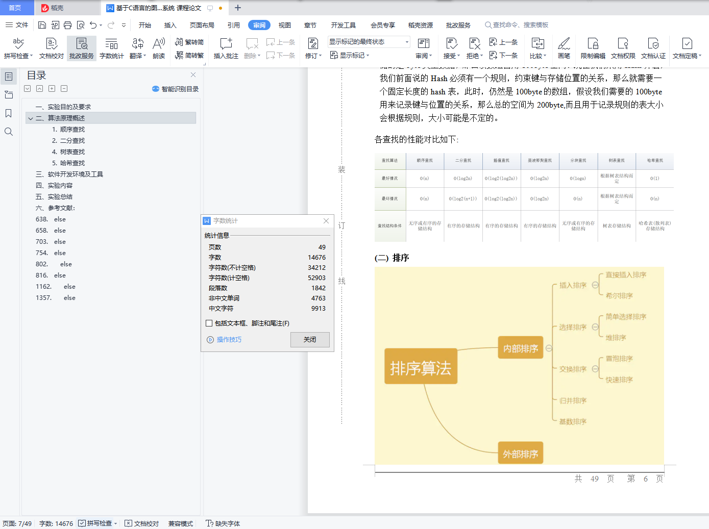 目录一、实验目的及要求 0二、算法原理概述 01. 顺序查找 12. 二分查找 14. 树表查找 35. 哈希查找 4三、软件开发环境及工具 11四、实验内容 11五、实验总结 25六、参考文献: 26638. else 37658. else 38703. else 39754. else 39802. else 40816. else 401162. else 461357. else 50一、实验目的及要求(1)集合结构的表示及实现。(2)查找和排序算法的实现。(3)文件的存取操作(4)系统功能:图书采编、图书查询、图书流通和个人信息等功能(5)程序能对输入数据的容错性进行检查,保证数据的合法性。(6)用户界面的友好性:程序可提供菜单供用户选择和相应的交互信息。二、算法原理概述(一) 查找1.查找算法分类:(1)静态查找和动态查找;静态或者动态都是针对查找表而言的。动态表指查找表中有删除和插入操作的表。(2)无序查找和有序查找。无序查找:被查找数列有序无序均可;有序查找:被查找数列必须为有序数列。2.查找的基本概念(1)查找:在数据集合中,寻找满足某种条件的数据元素的过程称为查找。(2)查找表(查找结构);用于查找的数据集合称为查找表。(3)关键字是数据元素中某个数据项的值,用它可以标识一个数据元素,若此关键字可以唯一地标识一个记录,用词关键字为主关键字。(4)平均查找长度是所有查找过程中进行关键字的比较次数的平均值。对于n个元素的表,给定值key与表中第i个元素相等,需进行n-i+1次关键字的比较。平均查找长度(Average Search Length,ASL):需和指定key进行比较的关键字的个数的期望值,称为查找算法在查找成功时的平均查找长度。对于含有n个数据元素的查找表,查找成功的平均查找长度为:ASL = Pi*Ci的和。Pi:查找表中第i个数据元素的概率。Ci:找到第i个数据元素时已经比较过的次数。3、常见的查找算法1. 顺序查找前提:顺序查找适合于存储结构为顺序存储或链接存储的线性表。基本思想:顺序查找也称为线形查找,属于无序查找算法。从数据结构线形表的一端开始,顺序扫描,依次将扫描到的结点关键字与给定值k相比较,若相等则表示查找成功;若扫描结束仍没有找到关键字等于k的结点,表示查找失败。复杂度分析:查找成功时的平均查找长度为:(假设每个数据元素的概率相等) ASL = 1/n(1+2+3+…+n) = (n+1)/2 ;当查找不成功时,需要n+1次比较,时间复杂度为O(n);所以,顺序查找的时间复杂度为O(n)。