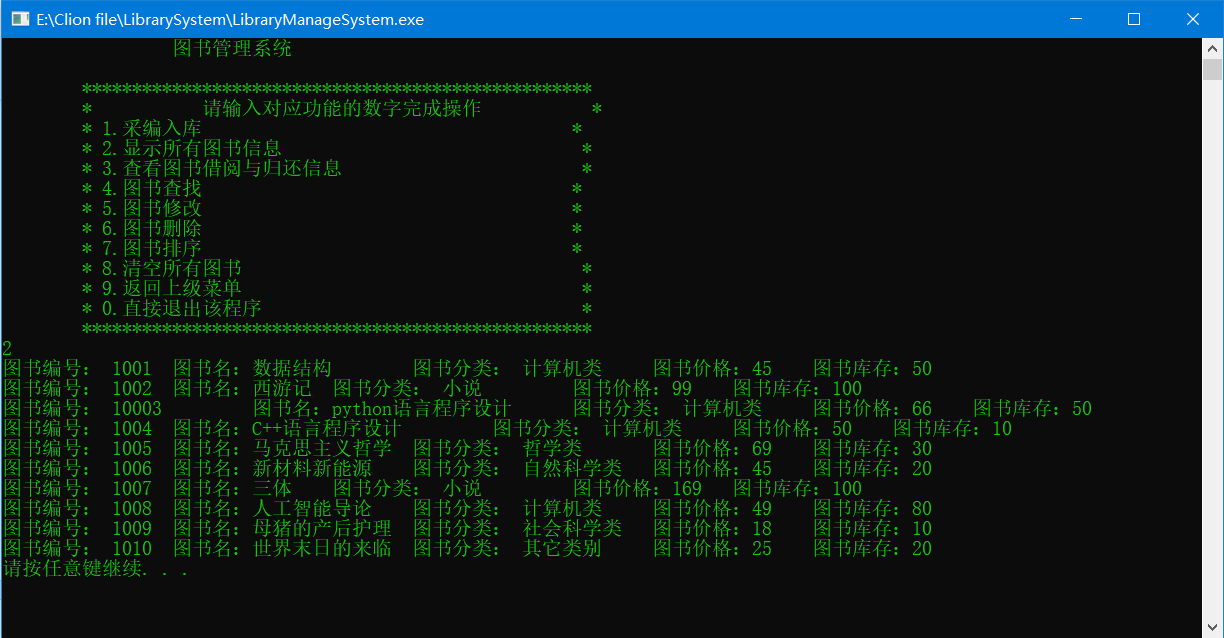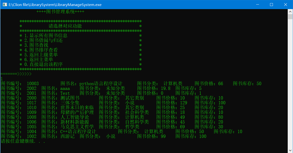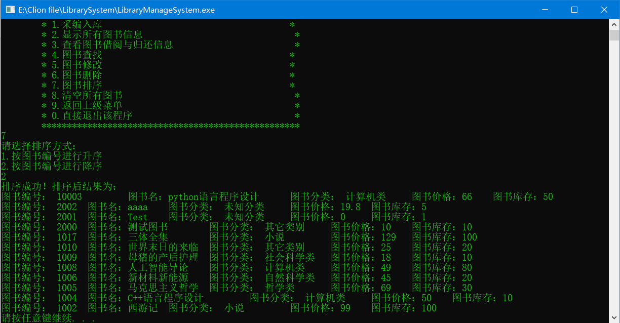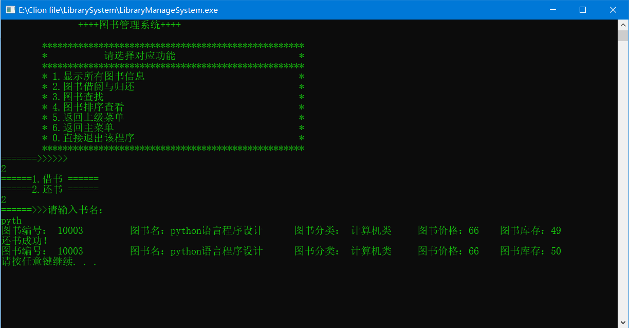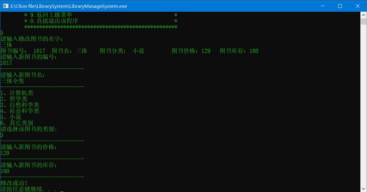 目录一、实验目的及要求 0二、算法原理概述 01. 顺序查找 12. 二分查找 14. 树表查找 35. 哈希查找 4三、软件开发环境及工具 11四、实验内容 11五、实验总结 25六、参考文献: 26638. else 37658. else 38703. else 39754. else 39802. else 40816. else 401162. else 461357. else 50一、实验目的及要求(1)集合结构的表示及实现。(2)查找和排序算法的实现。(3)文件的存取操作(4)系统功能:图书采编、图书查询、图书流通和个人信息等功能(5)程序能对输入数据的容错性进行检查,保证数据的合法性。(6)用户界面的友好性:程序可提供菜单供用户选择和相应的交互信息。二、算法原理概述(一) 查找1.查找算法分类:(1)静态查找和动态查找;静态或者动态都是针对查找表而言的。动态表指查找表中有删除和插入操作的表。(2)无序查找和有序查找。无序查找:被查找数列有序无序均可;有序查找:被查找数列必须为有序数列。2.查找的基本概念(1)查找:在数据集合中,寻找满足某种条件的数据元素的过程称为查找。(2)查找表(查找结构);用于查找的数据集合称为查找表。(3)关键字是数据元素中某个数据项的值,用它可以标识一个数据元素,若此关键字可以唯一地标识一个记录,用词关键字为主关键字。(4)平均查找长度是所有查找过程中进行关键字的比较次数的平均值。对于n个元素的表,给定值key与表中第i个元素相等,需进行n-i+1次关键字的比较。平均查找长度(Average Search Length,ASL):需和指定key进行比较的关键字的个数的期望值,称为查找算法在查找成功时的平均查找长度。对于含有n个数据元素的查找表,查找成功的平均查找长度为:ASL = Pi*Ci的和。Pi:查找表中第i个数据元素的概率。Ci:找到第i个数据元素时已经比较过的次数。3、常见的查找算法1. 顺序查找前提:顺序查找适合于存储结构为顺序存储或链接存储的线性表。基本思想:顺序查找也称为线形查找,属于无序查找算法。从数据结构线形表的一端开始,顺序扫描,依次将扫描到的结点关键字与给定值k相比较,若相等则表示查找成功;若扫描结束仍没有找到关键字等于k的结点,表示查找失败。复杂度分析:查找成功时的平均查找长度为:(假设每个数据元素的概率相等) ASL = 1/n(1+2+3+…+n) = (n+1)/2 ;当查找不成功时,需要n+1次比较,时间复杂度为O(n);所以,顺序查找的时间复杂度为O(n)。