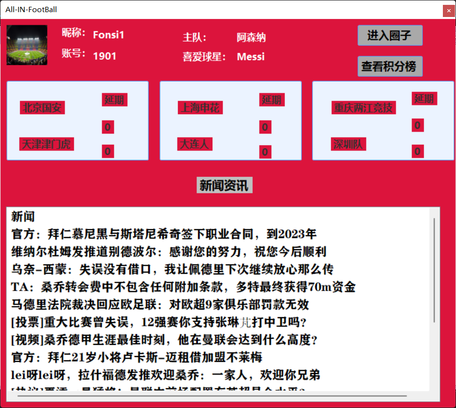 我们学习生活中会用到很多社交软件,我们用它来浏览自己关注的信息,浏览新闻,观看视频及与他人交流。但是适用于足球爱好者的社交软件桌面端并不多,于是我们想要为这部分群体制作一个足球社交软件,它可以实现正常的登录注册、新闻浏览、与不同圈子的人对话、查看赛程和积分榜、浏览新闻、发表评论以及进入公共聊天室等功能,对于喜欢使用桌面端的足球爱好者来说,可以极大地满足他们的需求。