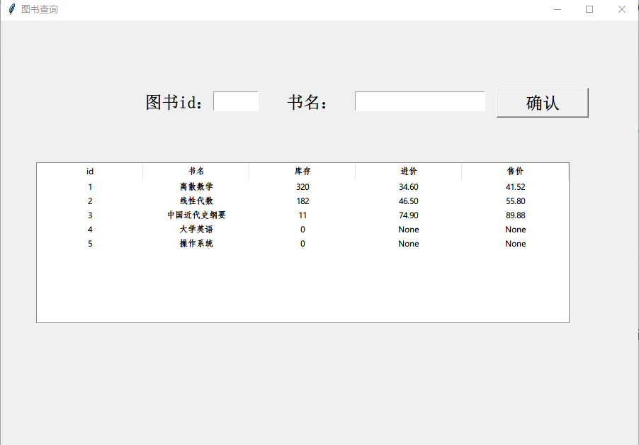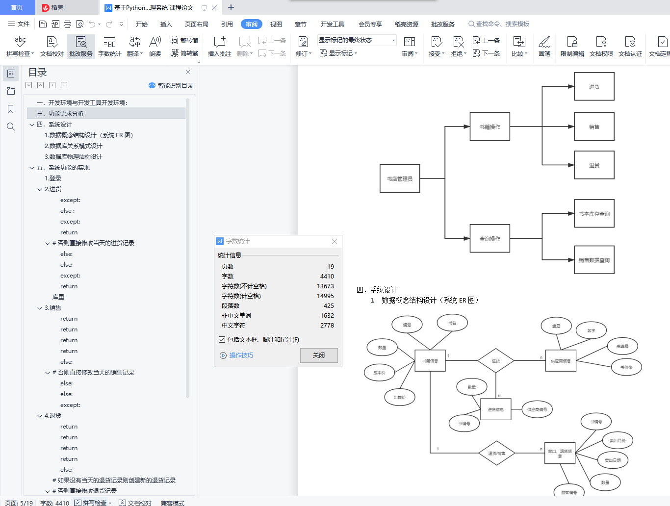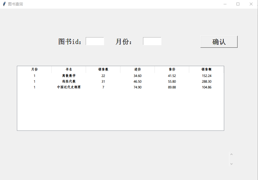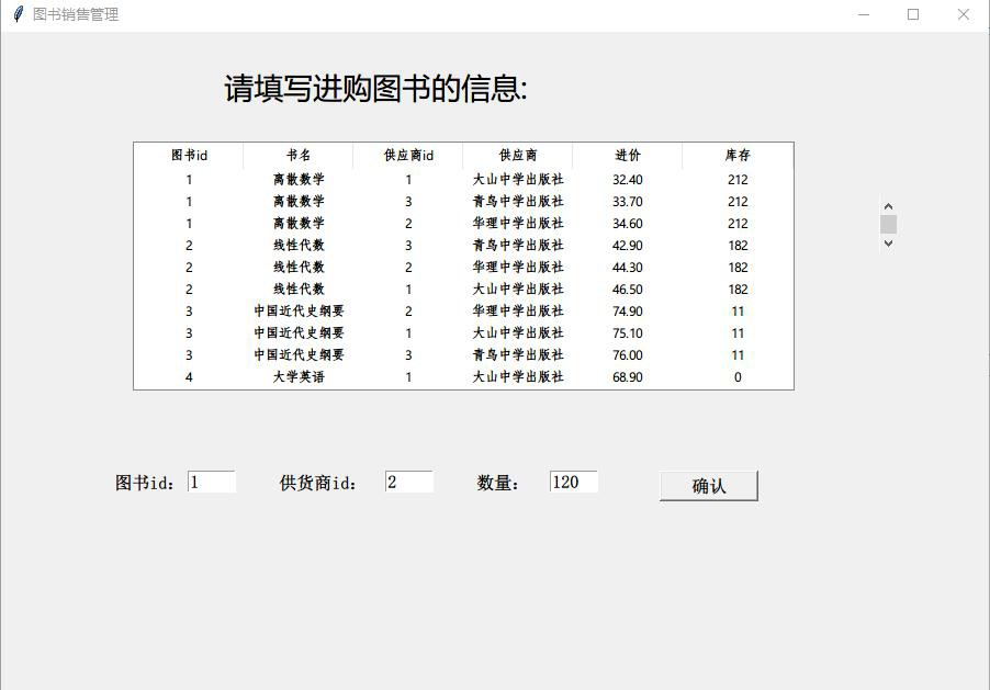 目录一.开发环境与开发工具开发环境: 1三.功能需求分析 3四.系统设计 41. 数据概念结构设计(系统 ER 图) 42. 数据库关系模式设计 53. 数据库物理结构设计 5五.系统功能的实现 61. 登录 62. 进货 6# 否则直接修改当天的进货记录 9库里 93. 销售 10# 否则直接修改当天的销售记录 124. 退货 13# 如果没有当天的退货记录则创建新的退货记录 15# 否则直接修改退货记录 155. 书本库存查询 15# 默认情况:查看所有图书 166. 销售数据查询 17# 默认情况:查看所有图书 17六. 总结 18一.开发环境与开发工具开发环境:操作系统:Windows 10 Enterprise Version 20H2数据库管理系统:MySQL 5.7编程语言:Python 3.8开发工具:图形界面库:TkinterMySQL 客户端库:PyMySQL 二.系统需求分析书店可以通过图书销售管理系统实现对图书的销售管理, 本系统主要处理的数据有: 书籍信息、进货单、销售数据、退货单、供应商信息等。系统数据字典:数据结构:书表:描述: 书店库存的书籍的信息数据项:书籍编号:描述: 唯一标识库中书籍的数字编号定义: 整型数书名:描述: 该书的书名定义: 字符型名称数量:描述: 该书的库存量定义: 整型数成本价:描述: 该书的进货价格定义: 浮点型数(保留两位小数)出售价:描述: 该书的卖出价格定义: 浮点型数(保留两位小数)供应商表:描述: 进货书籍的供应商信息数据项:编号:描述: 标识供应商的数字编号定义: 整型数名字:描述: 供应商的名字定义: 字符型汉字名称书号:描述: 供应商提供的书的编号定义: 整型数价格:描述: 供应商卖出该书的价格定义: 浮点型数(保留两位小数)进货表:描述: 进货书籍的信息数据项:书号:描述: 进货书的编号定义: 整型数数量:描述: 进货书的数量定义: 非负整型数供应商编号:描述: 进货该书的供应商编号定义: 整型数卖出、退货表:描述: 卖出、退货书籍的信息数据项:书号:描述: 卖出/退货时书的编号定义: 整型数月:描述: 卖出该书的月份定义: 非零整型数日:描述: 卖出该书的日数定义: 非零整型数数量:描述: 卖出该书的数量(含退货)数据流:定义: 整型数顾客号:描述: 买此书的顾客编号定义: 整型数的库存书表数据流:说明: “书表”数据结构在系统内的流向数据流来源: 进货、退货、销售事务数据流去向: 书本库存查询事务、书本销售数据查询事务进货表数据流:说明: “进货表”数据结构在系统内的流向数据流来源: 进货事务数据流去向: 书表信息事务卖出、退货表数据流:说明: “卖出、退货表”数据结构在系统内的流向数据流来源: 退货、销售事务数据流去向: 书表信息事务处理过程:实时书籍库存计算:说明: 随着进货、销售、退货事务的不断进行, 能实时计算出当前各书本输入: 进货数据流、卖出、退货数据流输出: 计算出各书本的当前库存销售数据计算:说明: 根据日期来计算日/月销售数据输入: 进货数据流、卖出、退货数据流输出: 计算出日/月销售数据