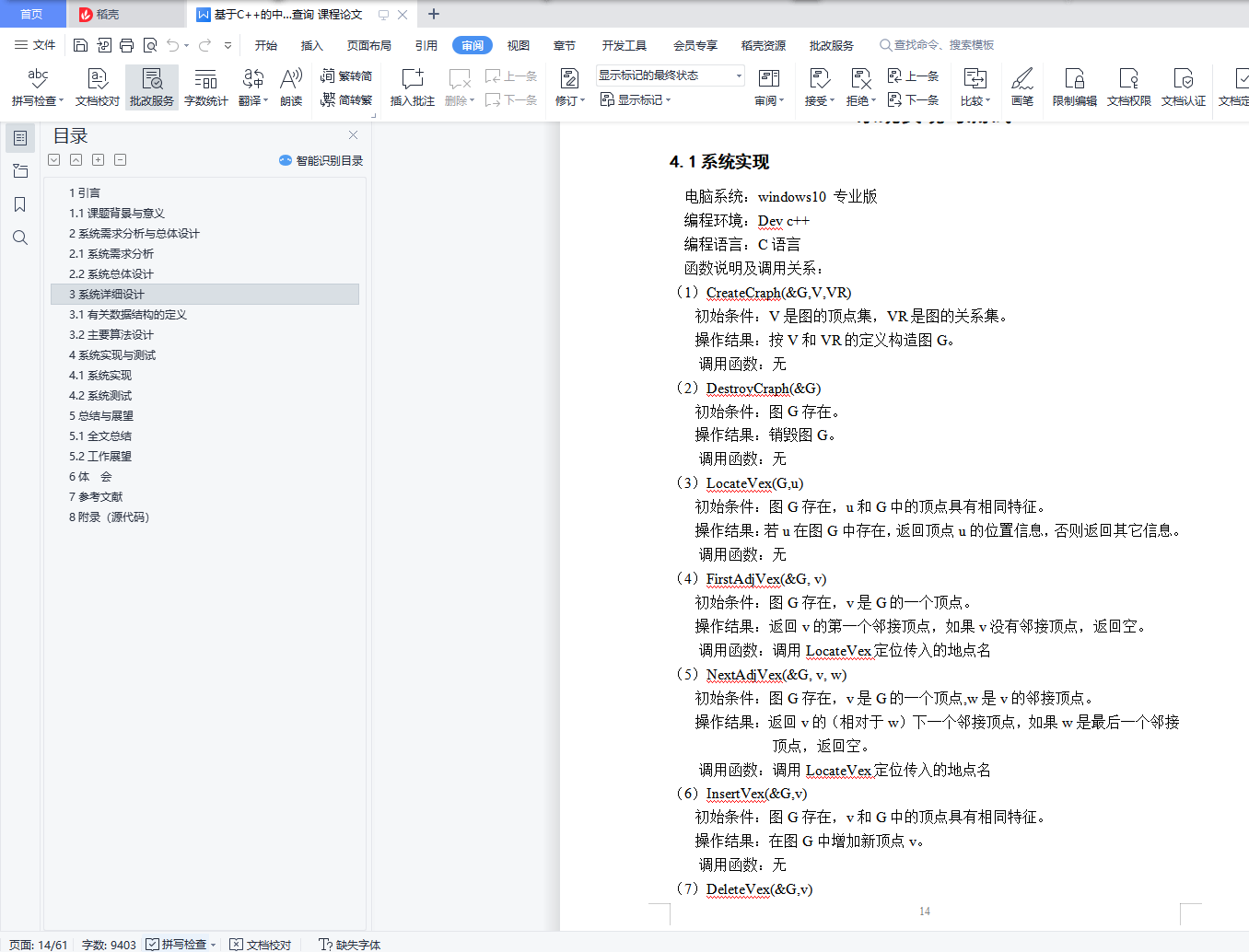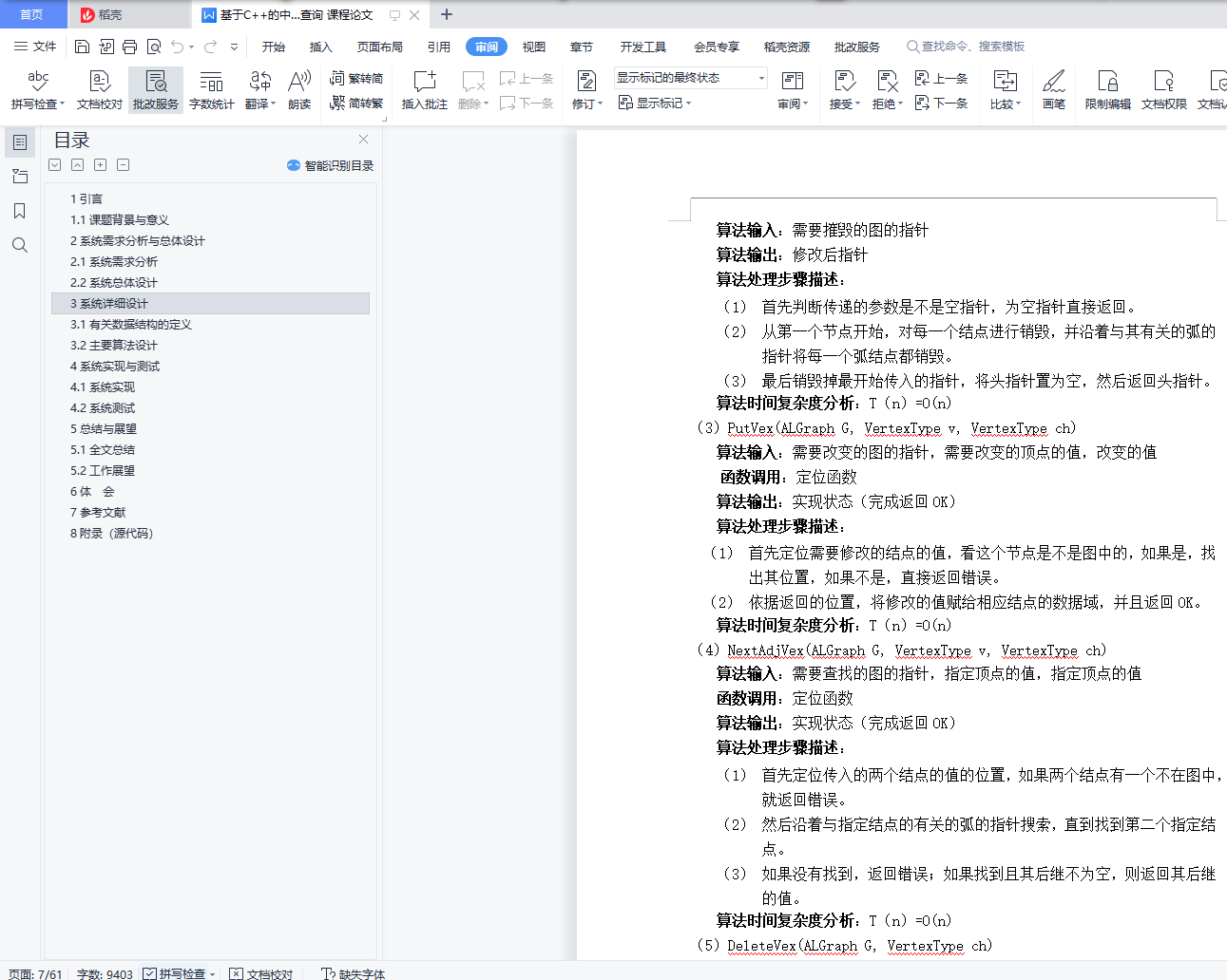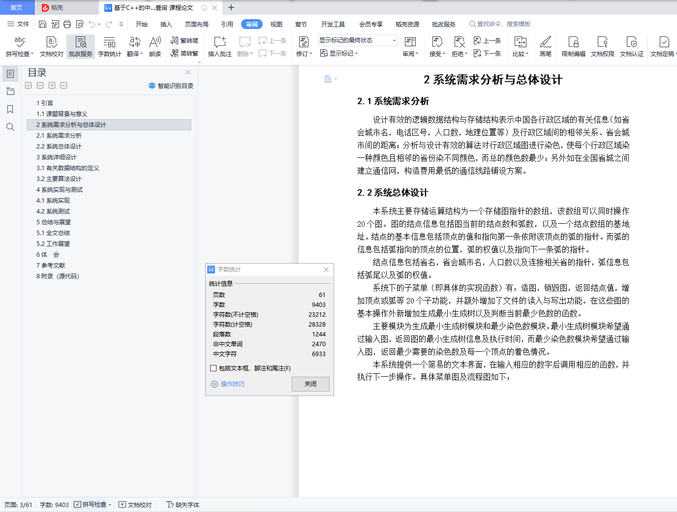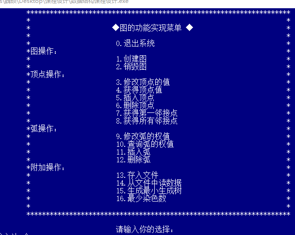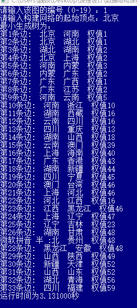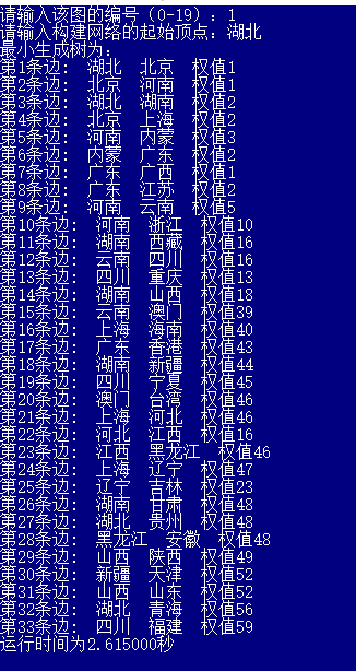 目录任务书1引言 31.1课题背景与意义 32系统需求分析与总体设计 42.1系统需求分析 42.2系统总体设计 43系统详细设计 63.1有关数据结构的定义 63.2主要算法设计 74系统实现与测试 154.1系统实现 154.2系统测试 165总结与展望 245.1全文总结 245.2工作展望 246体 会 257参考文献 268附录 271引言1.1课题背景与意义在数据结构学习图后,没有进行大量的训练来巩固,对于图的认识还是停留在书本上比较浅显的位置。希望通过这个课题来掌握图的存储结构与基本算法,深入了解图的结构特点以及实现实际应用,通过解决较复杂的基于图模型的实际问题,对于图形成一个完整的认识。实际问题即通过以中国各省份为图的顶点,以省份之间的交通网络为图的弧,交通联系代价为弧的权值构造一个图的模型。然后运用书上的最短路径的知识来构建代价最小的交通网络,从而以最小的代价生成一个能够联通全国的交通网络。关于该实现,目前最为广泛的算法主要是普里姆和克利斯卡尔算法,根据实际问题特点(为稠密图,3个顶点,100多条边),选择的最优算法为普里姆算法。通过染色问题实现地图着色,且相邻地点不可着相同颜色,求最少的着色方法,并简单验证四色猜想。该算法实现主要是回溯法解决染色问题,也可以通过这个桥梁来进一步了解回溯法的具体思想,了解其他典型回溯问题(比如八皇后问题)。该课题主要是想通过以解决简单的实际问题模型来反过来理解图的一系列算法及图的实际意义,用理论知识来指导实际应用,并用实际应用反过来巩固理论知识。2系统需求分析与总体设计2.1系统需求分析设计有效的逻辑数据结构与存储结构表示中国各行政区域的有关信息(如省会城市名,电话区号,人口数,地理位置等)及行政区域间的相邻关系、省会城市间的距离;分析与设计有效的算法对行政区域图进行染色,使每个行政区域染一种颜色且相邻的省份染不同颜色,而总的颜色数最少;另外如在全国省城之间建立通信网,构造费用最低的通信线路铺设方案。2.2系统总体设计本系统主要存储运算结构为一个存储图指针的数组,该数组可以同时操作20个图。图的结点信息包括图当前的结点数和弧数,以及一个结点数组的基地址。结点的基本信息包括顶点的值和指向第一条依附该顶点的弧的指针。而弧的信息包括弧指向的顶点的位置,弧的权值以及指向下一条弧的指针。结点信息包括省名,省会城市名,人口数以及连接相关省的指针,弧信息包括弧尾以及弧的权值。系统下的子菜单(即具体的实现函数)有:造图,销毁图,返回结点值,增加顶点或弧等20个子功能,并额外增加了文件的读入与写出功能。在这些图的基本操作外新增加生成最小生成树以及判断当前最少色数的函数。主要模块为生成最小生成树模块和最少染色数模块。最小生成树模块希望通过输入图,返回图的最小生成树信息及执行时间,而最少染色数模块希望通过输入图,返回最少需要的染色数及每一个顶点的着色情况。