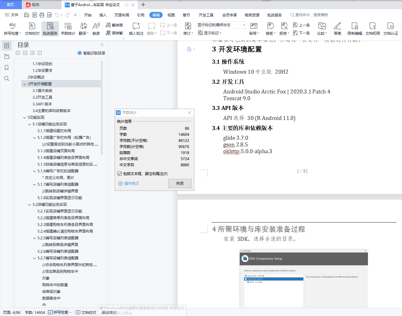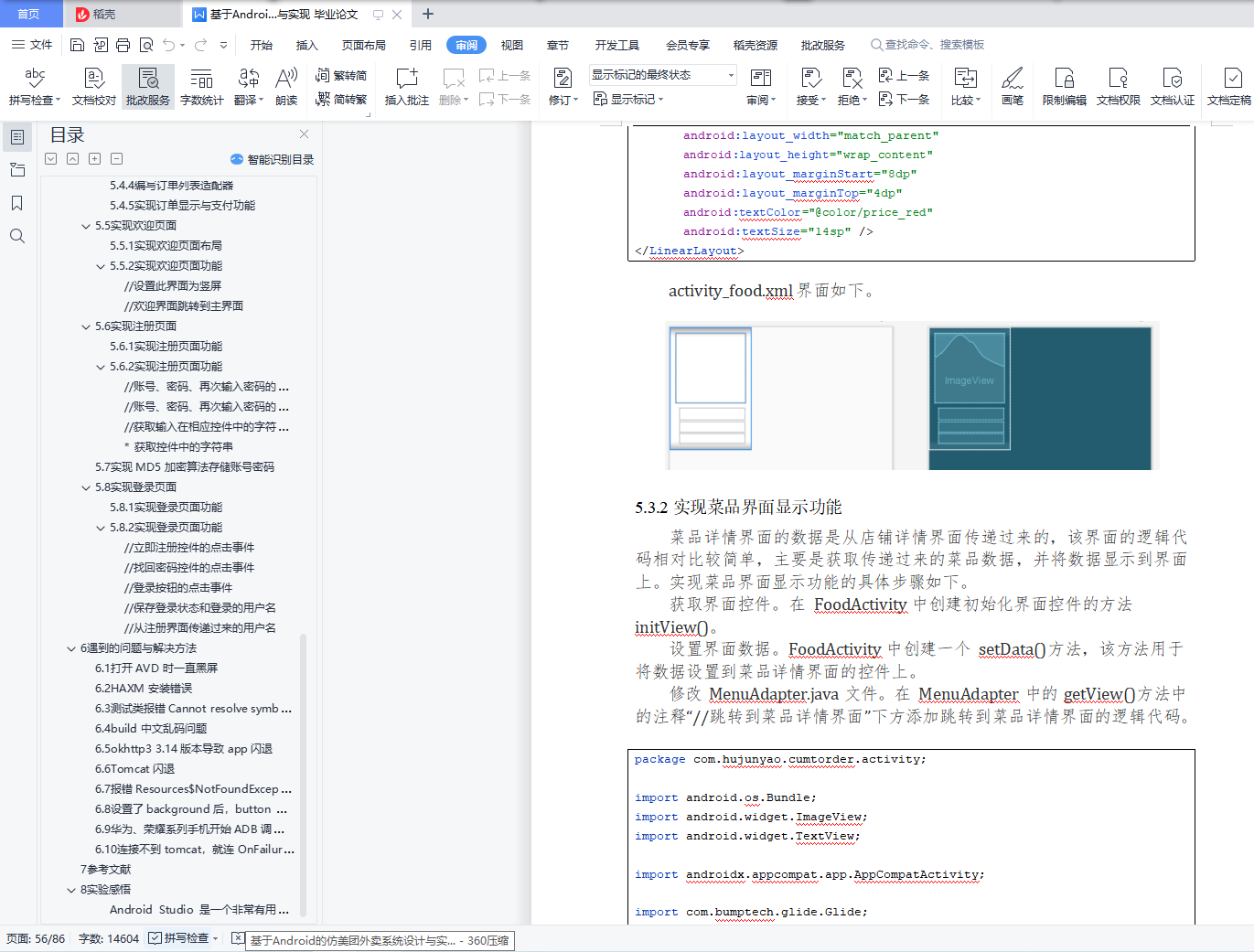摘 要为了巩固所学 Android 基础知识,要开发一款仿美团外卖的项目,该项目与我们平常看到的美团外卖项目界面比较类似,展示的内容包括店铺、菜单、购物车、订单与支付等信息。仿美团外卖项目是一个网上订餐项目, 该项目中包含订餐的店铺、各店铺的菜单、购物车以及订单与付款等模块。在店铺列表中可以看到店铺的名称、月售数量、起送价格与配送费用、配 送时间以及店铺特色等信息,点击店铺列表中的任意一个店铺,程序会进 入到店铺详情界面,该界面主要用于显示店铺中的菜单信息,同时可以将 想要吃的菜添加到购物车中,选完菜之后可以点击该界面中的“去结算”按 钮,进入到订单界面,在该界面核对已点的菜单信息,并通过“去支付”按 钮进行付款。为了增强软件的真实性与安全性,还加入了轮播广告栏Banner 设计、欢迎界面、登录界面、注册界面,使用 MD5 进行用户名密码加密,利用 SharePreference 进行内部存储。关键词:Android, 网上订餐, Banner 设计, MD5, SharePreference目 录1毕设目的与要求 11.1毕设目的 11.2毕设要求 12毕设概述 13开发环境配置 13.1操作系统 13.2开发工具 13.3API 版本 13.4主要的库和依赖版本 14所需环境与库安装准备过程 25功能实现 65.1店铺功能业务实现 65.1.1搭建标题栏布局 65.1.2搭建广告栏布局(轮播广告) 85.1.3搭建店铺页面布局 105.1.4搭建店铺列表条目界面布局 125.1.5封装店铺信息与菜品信息的实体类 145.1.6编写广告栏的适配器 195.1.7编写店铺列表适配器 205.1.8实现店铺界面显示功能 225.2店铺功能业务实现 245.2.1实现店铺界面显示功能 245.2.2搭建菜单列表条目界面布局 315.2.3搭建购物车列表条目界面布局 345.2.4搭建确认清空购物车界面布局 355.2.5编写店铺列表适配器 375.2.6编写店铺列表适配器 395.2.7编写店铺列表适配器 425.3菜品详情功能业务实现 505.3.1搭建菜品详情界面布局 505.3.2实现菜品界面显示功能 515.4订单功能业务实现 525.4.1搭建订单界面布局 535.4.2搭建订单列表条目界面布局 575.4.3搭建支付界面布局 595.4.4编写订单列表适配器 595.4.5实现订单显示与支付功能 625.5实现欢迎页面 645.5.1实现欢迎页面布局 645.5.2实现欢迎页面功能 655.6实现注册页面 675.6.1实现注册页面功能 675.6.2实现注册页面功能 695.7实现 MD5 加密算法存储账号密码 735.8实现登录页面 735.8.1实现登录页面功能 735.8.2实现登录页面功能 776遇到的问题与解决方法 806.1打开 AVD 时一直黑屏 806.2HAXM 安装错误 806.3测试类报错 Cannot resolve symbol 'Test' 806.4build 中文乱码问题 806.5okhttp3 3.14 版本导致 app 闪退 806.6Tomcat 闪退 806.7报错 Resources$NotFoundException: String resource ID xxxx 816.8设置了 background 后,button 依旧是默认颜色 816.9华为、荣耀系列手机开始 ADB 调试后也不能连接到 Android Studio 816.10连接不到 tomcat,就连 OnFailure 函数都不进入 817参考文献 818实验感悟 811.1毕设目的为了巩固所学 Android 基础知识,要开发一款仿美团外卖的项目,该项目与我们平常看到的美团外卖项目界面比较类似,展示的内容包括店铺、菜单、购物车、订单与支付等信息。1.2毕设要求(1)掌握 Android 应用程序开发中的基本技术。(2)能分析仿美团外卖项目,能够说出项目的开发环境和模块。(3)掌握服务器的搭建方式,能够独立搭建服务器。(4)掌握店铺界面的开发过程,能够实现店铺界面的显示效果。(5)掌握店铺详情界面与购物车的开发过程,能够实现购物车功能。(6)掌握菜品详情界面的开发过程,能够实现菜品详情界面的功能。2毕设概述仿美团外卖项目是一个网上订餐项目,该项目中包含订餐的店铺、各 店铺的菜单、购物车以及订单与付款等模块。在店铺列表中可以看到店铺 的名称、月售数量、起送价格与配送费用、配送时间以及店铺特色等信息, 点击店铺列表中的任意一个店铺,程序会进入到店铺详情界面,该界面主 要用于显示店铺中的菜单信息,同时可以将想要吃的菜添加到购物车中, 选完菜之后可以点击该界面中的“去结算”按钮,进入到订单界面,在该 界面核对已点的菜单信息,并通过“去支付”按钮进行付款。3开发环境配置3.1操作系统Windows 10 专业版 20H23.2开发工具Android Studio Arctic Fox | 2020.3.1 Patch 4 Tomcat 9.03.3API 版本API 选择 30 (R Android 11.0)3.4主要的库和依赖版本glide 3.7.0gson 2.8.5okhttp:5.0.0-alpha.3