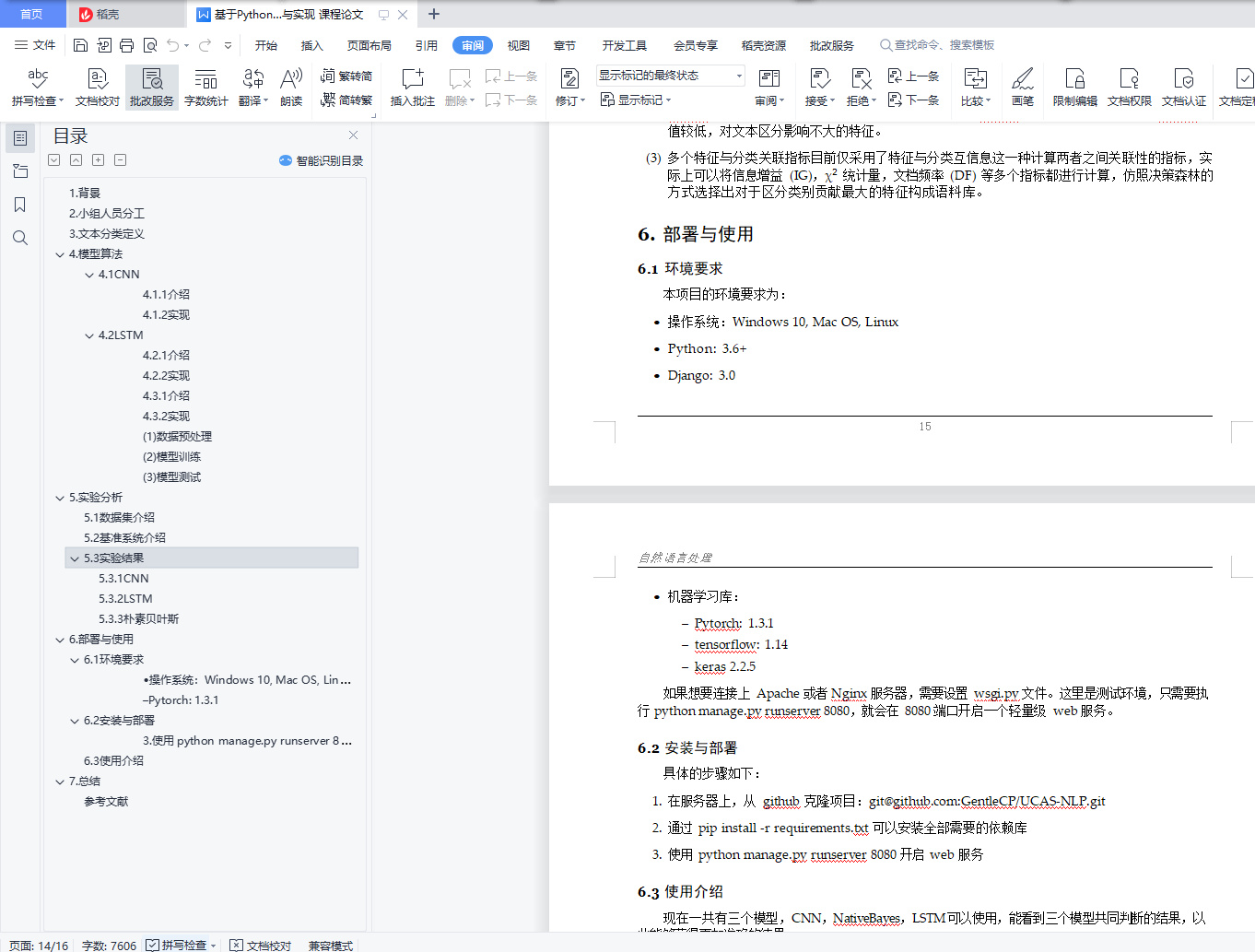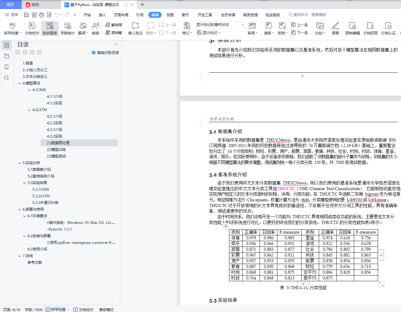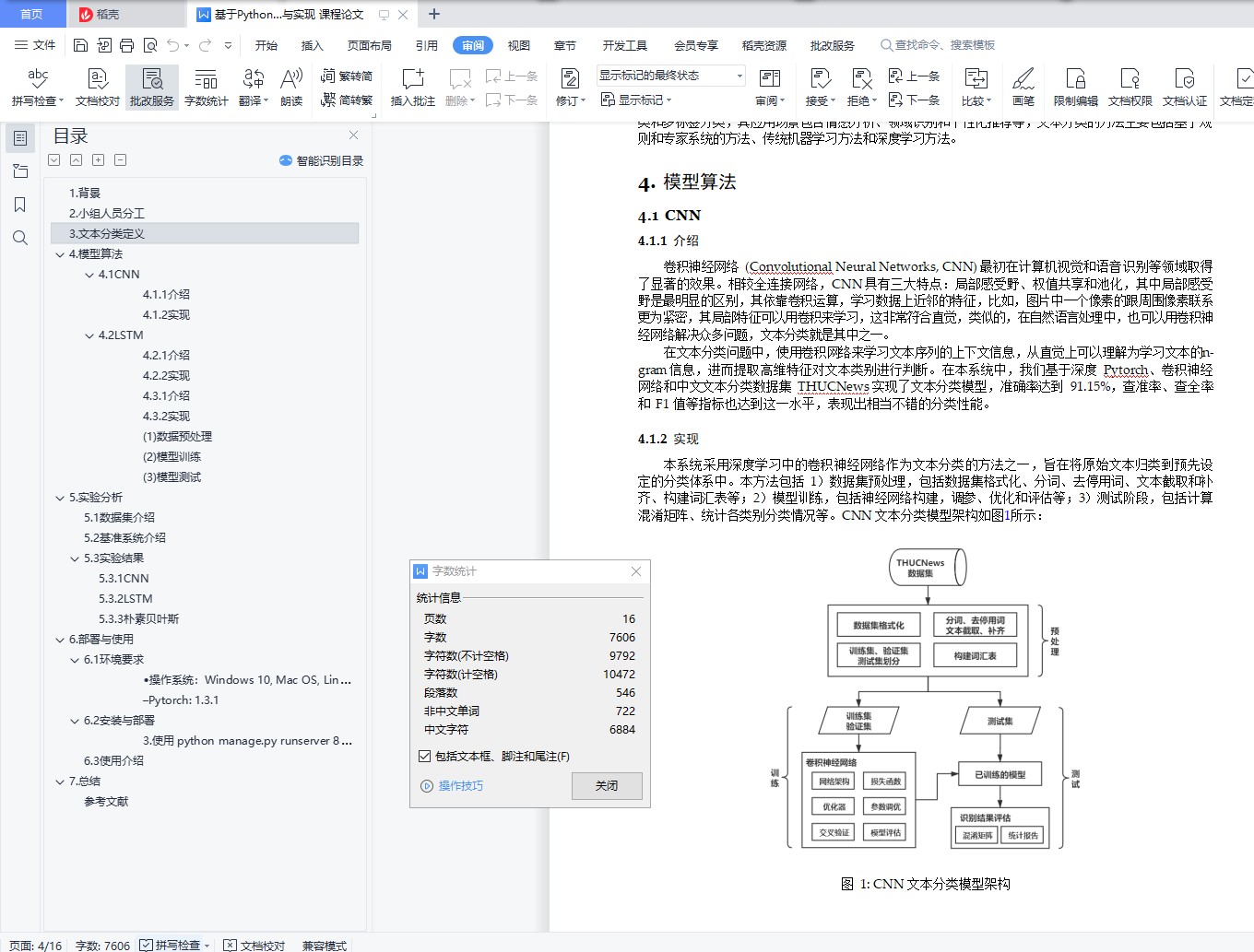 目录1. 背景 22. 小组人员分工 23. 文本分类定义 34. 模型算法 44.1 CNN 44.2 LSTM 75. 实验分析 95.1 数据集介绍 105.2 基准系统介绍 105.3 实验结果 105.3.1 CNN 105.3.2 LSTM 125.3.3 朴素贝叶斯 146. 部署与使用 156.1 环境要求 156.2 安装与部署 166.3 使用介绍 167. 总结 17参考文献 171.背景随着互联网的发展,网络中的数据和信息呈现指数级爆炸式增长。由于网络上电子文档越来越多, 如何对这些信息和数据进行自动有效地组织和管理是一个巨大的挑战,基于内容的信息检索和文本数 据挖掘渐渐成为了研究人员关注的领域。其中,文本分类技术近年来得到了广泛的关注和研究。文本分类是自然语言处理任务中的一项基础性工作,主要任务是在预先给定的类别标记 (label) 集合下,根据文本内容判定它的类别,目的是对文本资源进行整理和归类,同时文本分类也是解决文本信息过载问题的关键环节。随着技术的发展,文本分类已经在各个领域中落地和应用,比如:邮件分类、网页分类、文本索引、自动文摘、信息检索、信息推送、数字图书馆以及学习系统等。本文实现了一个文本分类系统,通过深度学习,朴素贝叶斯、支持向量机等模型实现文本分类,实验表明基于深度学习的方法得到的效果最好。最后,通过 Web 的形式进行展示。本文的组织结构如下:1.第 1 章介绍了本项目的背景;2.第 2 章介绍了小组成员信息以及人员分工;3.第 3 章介绍了文本分类的任务定义;4.第 4 章介绍了文本分类系统的系统架构,系统中相关模型、算法的设计与实现;5.第 5 章介绍了模型的实验,包括数据集、基准系统的介绍,并对实验的结果进行比较和分析;6.第 6 章介绍了文本分类系统的环境要求、系统部署以及使用的方法;7.第 7 章进行概括性的总结;2.小组人员分工本次项目的小组人员分工如表1所示。项目的任务分配和管理主要由组长同学负责,各位组员都负责了文本分类模型的搭建以及评估,包括 CNN 模型,LSTM 模型,朴素贝叶斯等,具体的内容见表1,同学负责了本系统中的 Web 的搭建以及前端展示的设计,并且,文档各个部分由各位同学撰写,最终由同学进行整合。