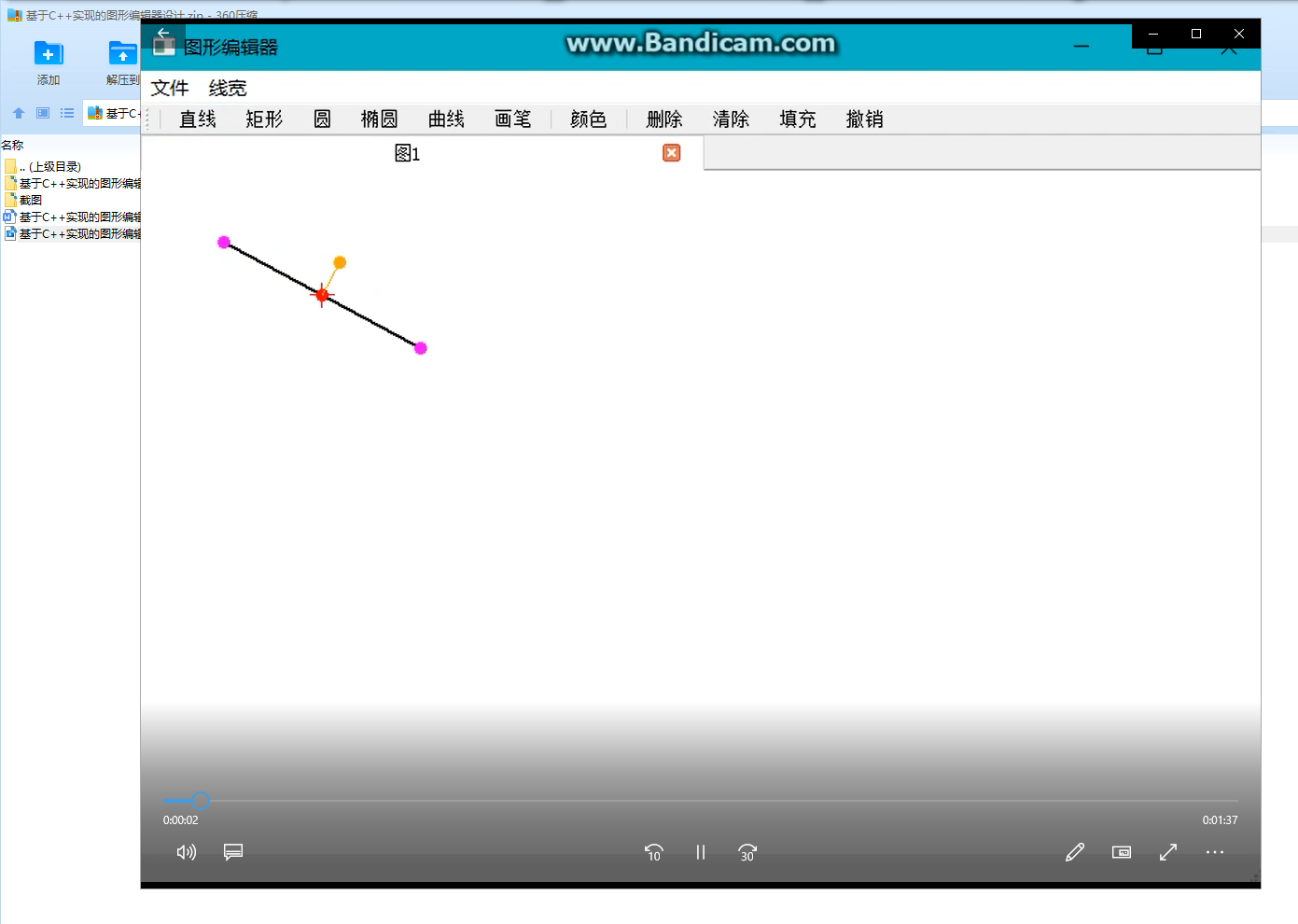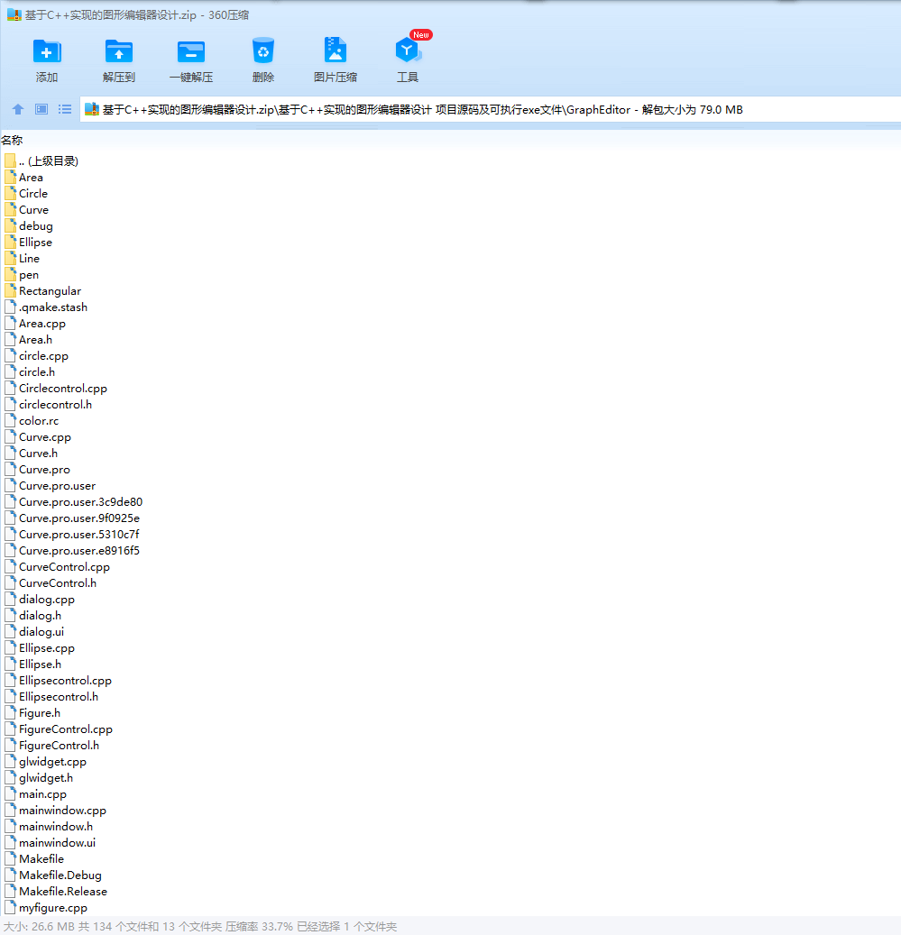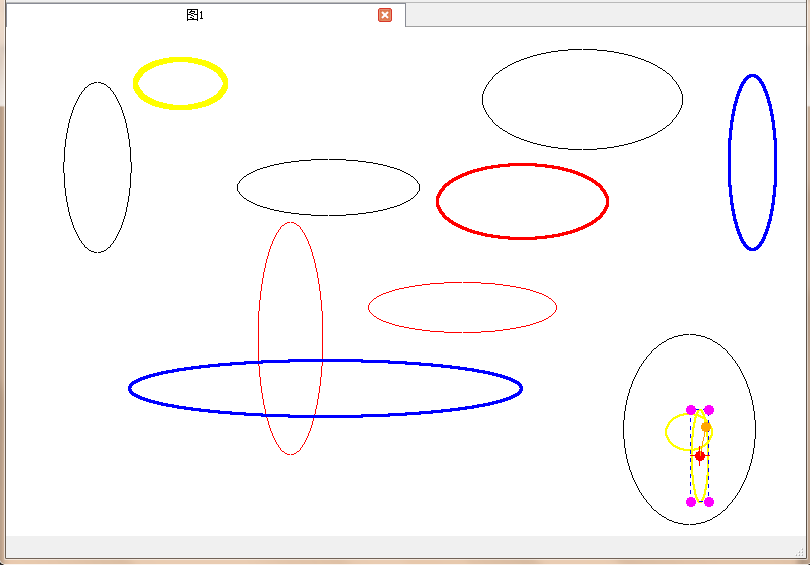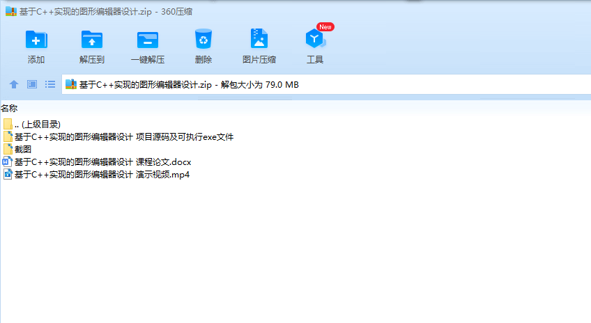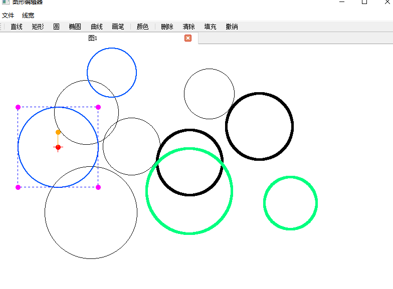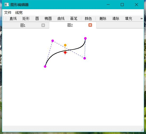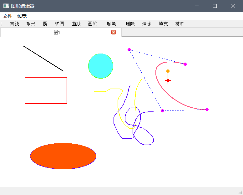 功能:1.新建文件,保存文件,打开文件2.基本图形的绘制――直线、矩形、圆、椭圆、曲线、涂鸦笔3.对图形的变换――平移、旋转、缩放4.对图形的设置――颜色选择、线条粗细设置5.对图形的修改――填充、删除、清除、撤销6.文字编辑的插入(在代码内,但实验并不理想)