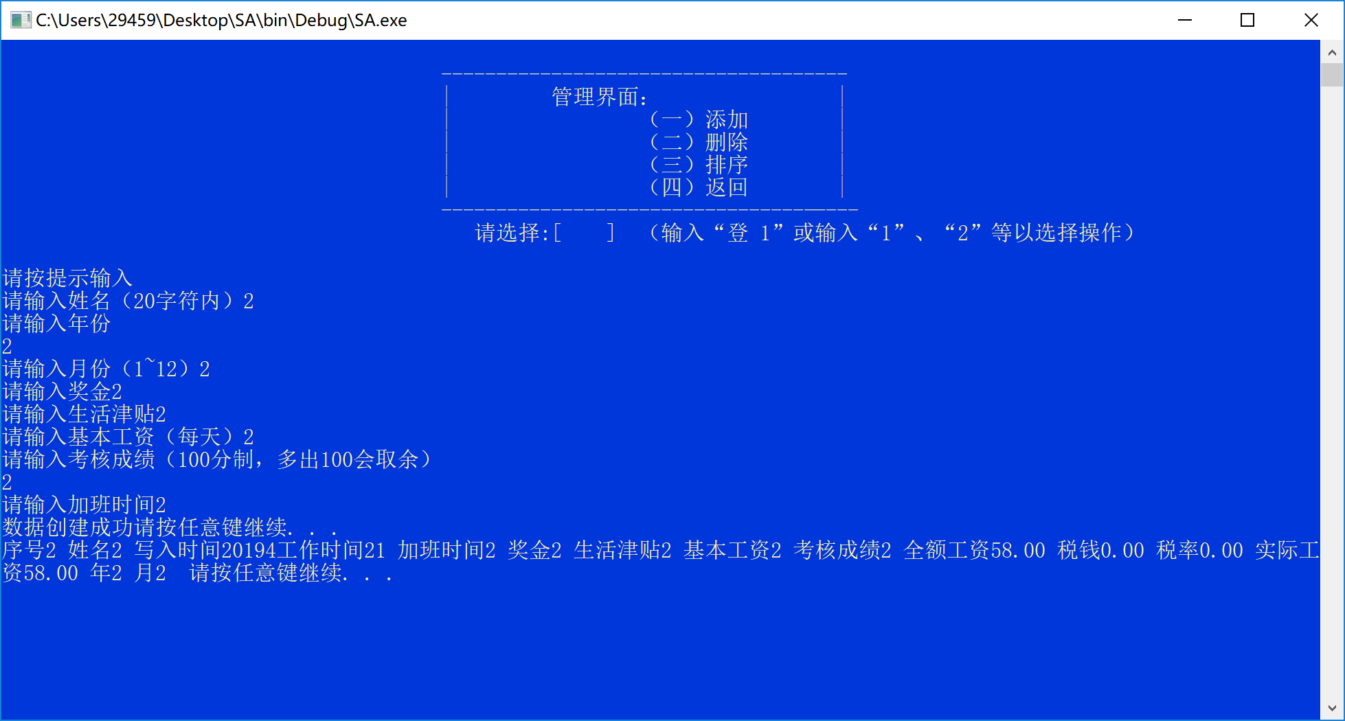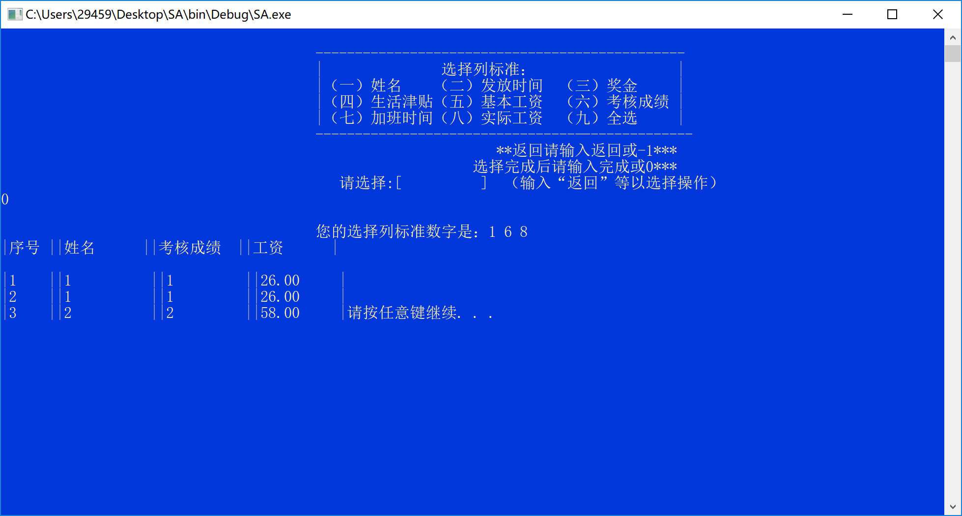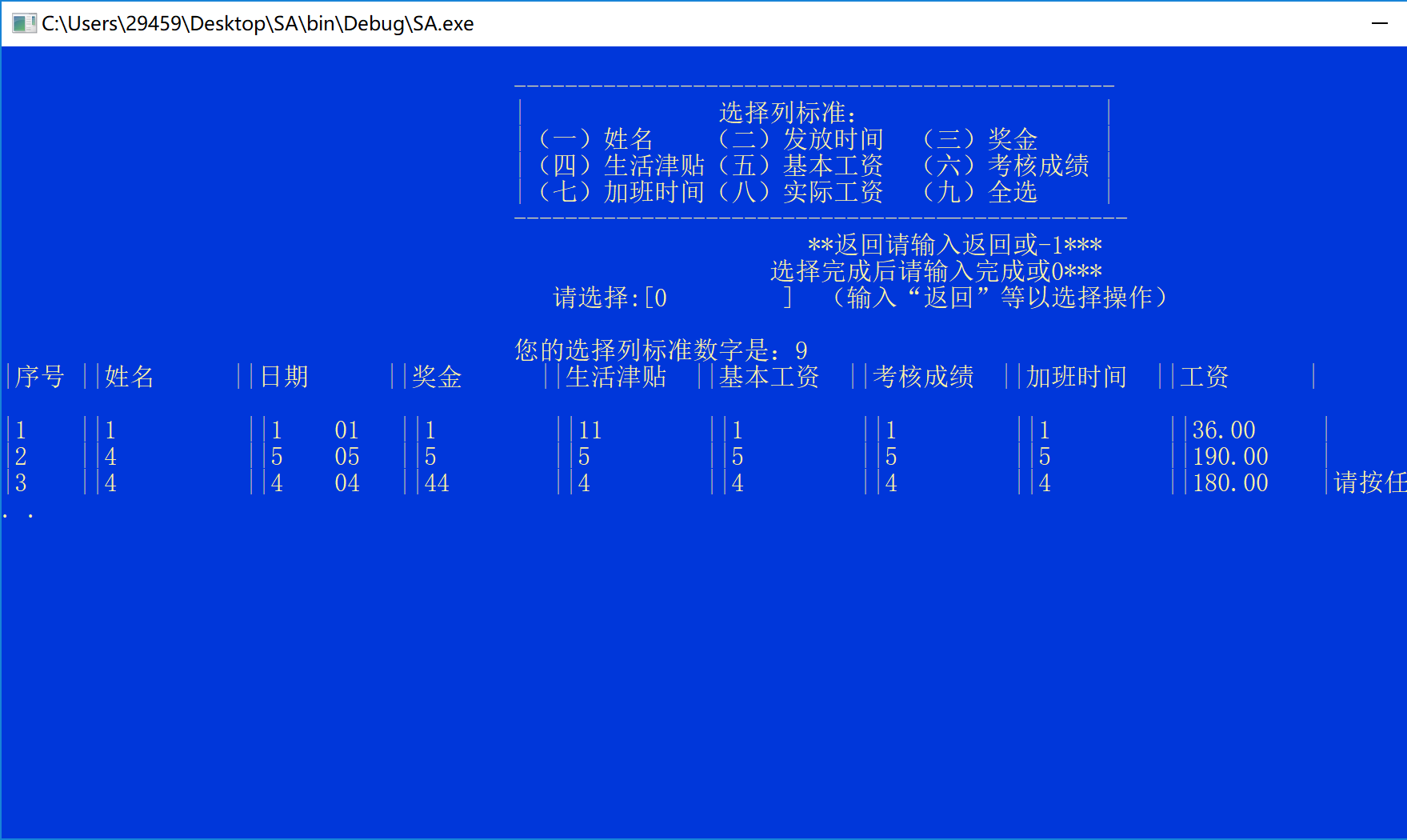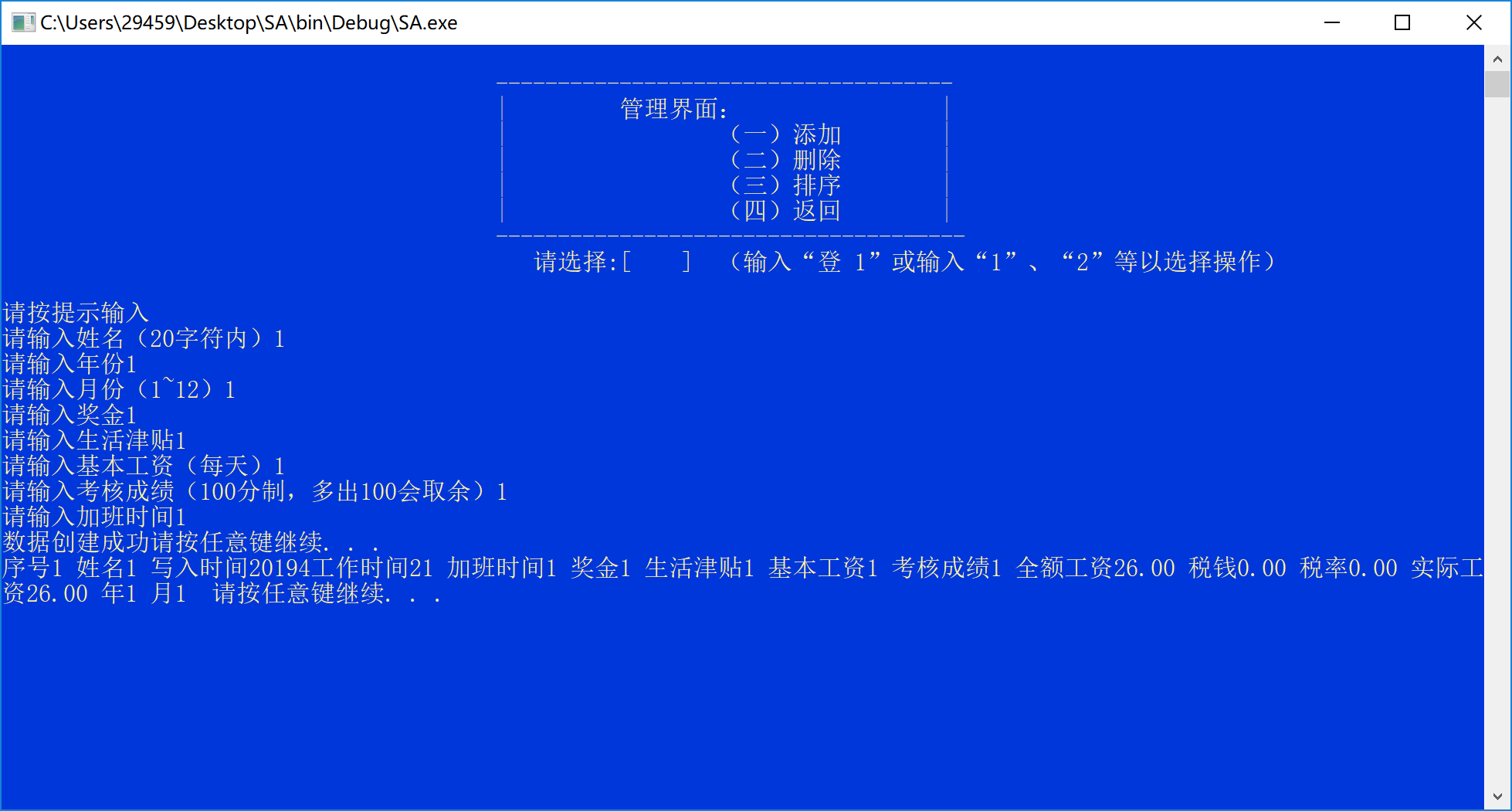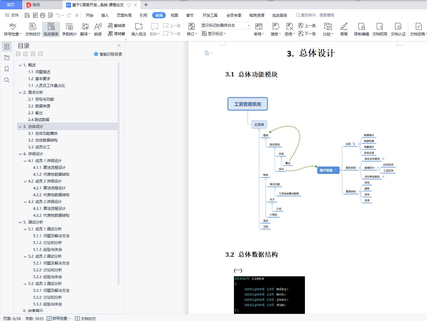 目 录1. 概述 11.1 问题描述 11.2 基本要求 11.1 人员及工作量占比 12. 需求分析 22.1 目标与功能 22.2 数据来源 22.3 输出 22.4测试数据 23. 总体设计 33.1 总体功能模块 33.2 总体数据结构 33.3 成员分工 34. 详细设计 44.1 成员1详细设计 44.1.1 算法流程设计 44.1.2 代表性数据结构 44.2 成员2详细设计 44.2.1 算法流程设计 44.2.2 代表性数据结构 44.3 成员3详细设计 44.3.1 算法流程设计 54.3.2 代表性数据结构 55. 调试分析 65.1 成员1调试分析 65.1.1 问题及解决方法 65.1.2 讨论和分析 65.1.3 经验与体会 65.2 成员2调试分析 65.2.1 问题及解决方法 65.2.2 讨论和分析 65.2.3 经验与体会 65.3 成员3调试分析 75.3.1 问题及解决方法 75.3.2 讨论和分析 75.3.3 经验与体会 76. 结果展示 87. 总结与体会 97.1 成员1总结与体会 97.2 成员2总结与体会 97.3 成员3总结与体会 91. 概述1.1 问题描述工资分配与管理向来是一个繁琐而重要的话题,为了更方便的进行管理,需要我们设计“工资管理系统”进行对工资的数据维护,查询,排序,统计,输出并保证系统的完整性。1.2 基本要求1、具有数据维护、数据查询、排序、统计、输出、系统维护、帮助、退出等功能。2、具有通用性、安全性、界面美观、操作方便1.1 人员及工作量占比1、组长: 工作量占比:50%。2、组员: 工作量占比:25%。3、组员: 工作量占比:25%。2. 需求分析2.1 目标与功能1、保障系统的安全性:(1)登录功能(2)数据备份(3)数据恢复(4)非法输入纠正2、保证系统界面的美观:(1)图形功能(2)菜单位置设置(3)菜单唯一(4)蓝白主题3、保证系统的通用操作:(1)中文与数字选项并用(2)部分界面能进行复杂的逻辑选择4、能够进行数据维护、查询、排序、统计、输出:(1)数据录入(2)数据删除(3)数据修改(4)数据查询2.2 数据来源1、安全性:(1)登录功能:从键盘读入用户数据(2)数据备份:由键盘输入进行修改(3)数据恢复:从文件(backup.txt)读取数据2、美观性:(1)图形功能:无(2)菜单位置:无(3)菜单唯一:无(4)蓝白主题:无3、通用性:(1)中文与数字选项并用:使用strcmp||目标数字与用户的键盘输入匹配(2)逻辑选择:使用位运算与逻辑运算与用户的键盘输入匹配4、数据操作:(1)数据录入:有文件导入函数进行文件读取,也有添加功能从键盘输入导入到目标文件(2)数据删除:从键盘输入目标信息,再将数据文件的数据导入到程序中进行匹配(3)数据修改:从键盘输入目标信息,再将数据文件的数据导入到程序中进行匹配(4)数据查询:从键盘输入目标信息,再将数据文件的数据导入到程序中进行匹配(5)数据排序(6)数据统计
