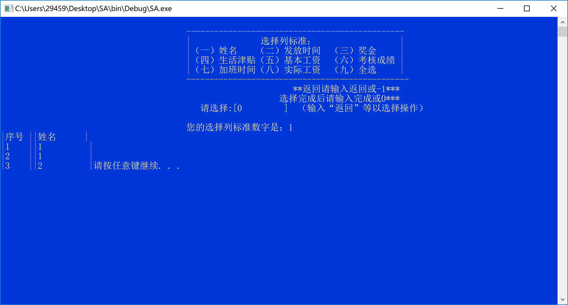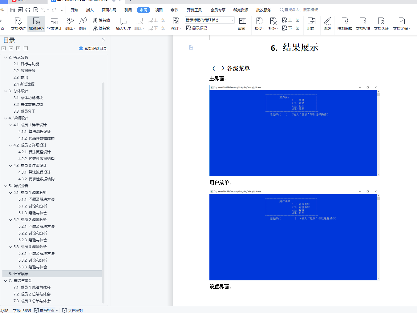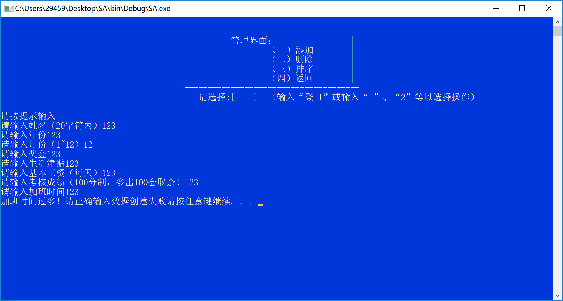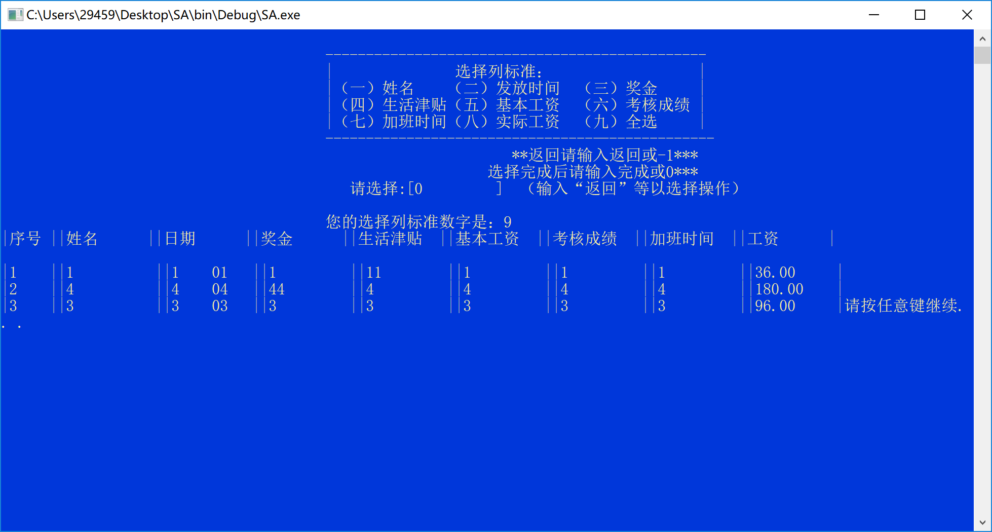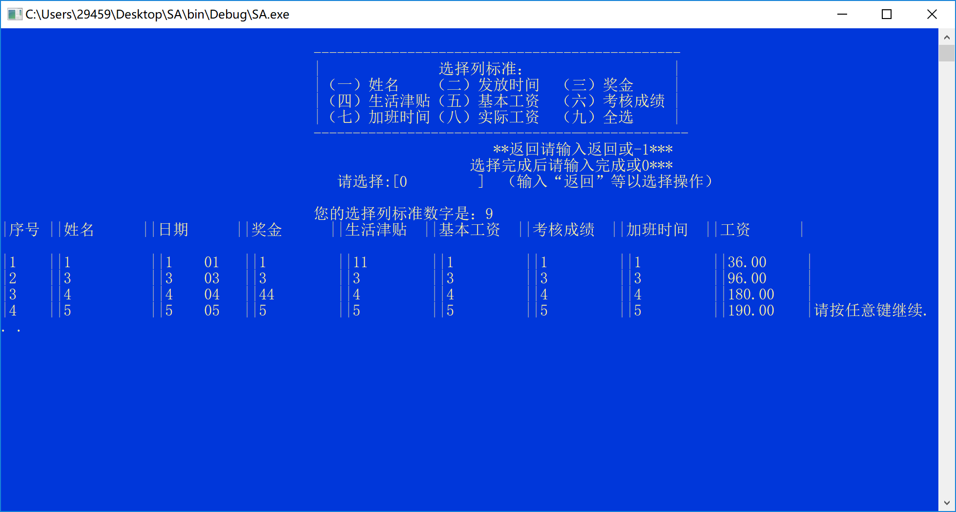 目 录1. 概述 11.1 问题描述 11.2 基本要求 11.1 人员及工作量占比 12. 需求分析 22.1 目标与功能 22.2 数据来源 22.3 输出 22.4测试数据 23. 总体设计 33.1 总体功能模块 33.2 总体数据结构 33.3 成员分工 34. 详细设计 44.1 成员1详细设计 44.1.1 算法流程设计 44.1.2 代表性数据结构 44.2 成员2详细设计 44.2.1 算法流程设计 44.2.2 代表性数据结构 44.3 成员3详细设计 44.3.1 算法流程设计 54.3.2 代表性数据结构 55. 调试分析 65.1 成员1调试分析 65.1.1 问题及解决方法 65.1.2 讨论和分析 65.1.3 经验与体会 65.2 成员2调试分析 65.2.1 问题及解决方法 65.2.2 讨论和分析 65.2.3 经验与体会 65.3 成员3调试分析 75.3.1 问题及解决方法 75.3.2 讨论和分析 75.3.3 经验与体会 76. 结果展示 87. 总结与体会 97.1 成员1总结与体会 97.2 成员2总结与体会 97.3 成员3总结与体会 91. 概述1.1 问题描述工资分配与管理向来是一个繁琐而重要的话题,为了更方便的进行管理,需要我们设计“工资管理系统”进行对工资的数据维护,查询,排序,统计,输出并保证系统的完整性。1.2 基本要求1、具有数据维护、数据查询、排序、统计、输出、系统维护、帮助、退出等功能。2、具有通用性、安全性、界面美观、操作方便1.1 人员及工作量占比1、组长: 工作量占比:50%。2、组员: 工作量占比:25%。3、组员: 工作量占比:25%。2. 需求分析2.1 目标与功能1、保障系统的安全性:(1)登录功能(2)数据备份(3)数据恢复(4)非法输入纠正2、保证系统界面的美观:(1)图形功能(2)菜单位置设置(3)菜单唯一(4)蓝白主题3、保证系统的通用操作:(1)中文与数字选项并用(2)部分界面能进行复杂的逻辑选择4、能够进行数据维护、查询、排序、统计、输出:(1)数据录入(2)数据删除(3)数据修改(4)数据查询2.2 数据来源1、安全性:(1)登录功能:从键盘读入用户数据(2)数据备份:由键盘输入进行修改(3)数据恢复:从文件(backup.txt)读取数据2、美观性:(1)图形功能:无(2)菜单位置:无(3)菜单唯一:无(4)蓝白主题:无3、通用性:(1)中文与数字选项并用:使用strcmp||目标数字与用户的键盘输入匹配(2)逻辑选择:使用位运算与逻辑运算与用户的键盘输入匹配4、数据操作:(1)数据录入:有文件导入函数进行文件读取,也有添加功能从键盘输入导入到目标文件(2)数据删除:从键盘输入目标信息,再将数据文件的数据导入到程序中进行匹配(3)数据修改:从键盘输入目标信息,再将数据文件的数据导入到程序中进行匹配(4)数据查询:从键盘输入目标信息,再将数据文件的数据导入到程序中进行匹配(5)数据排序(6)数据统计