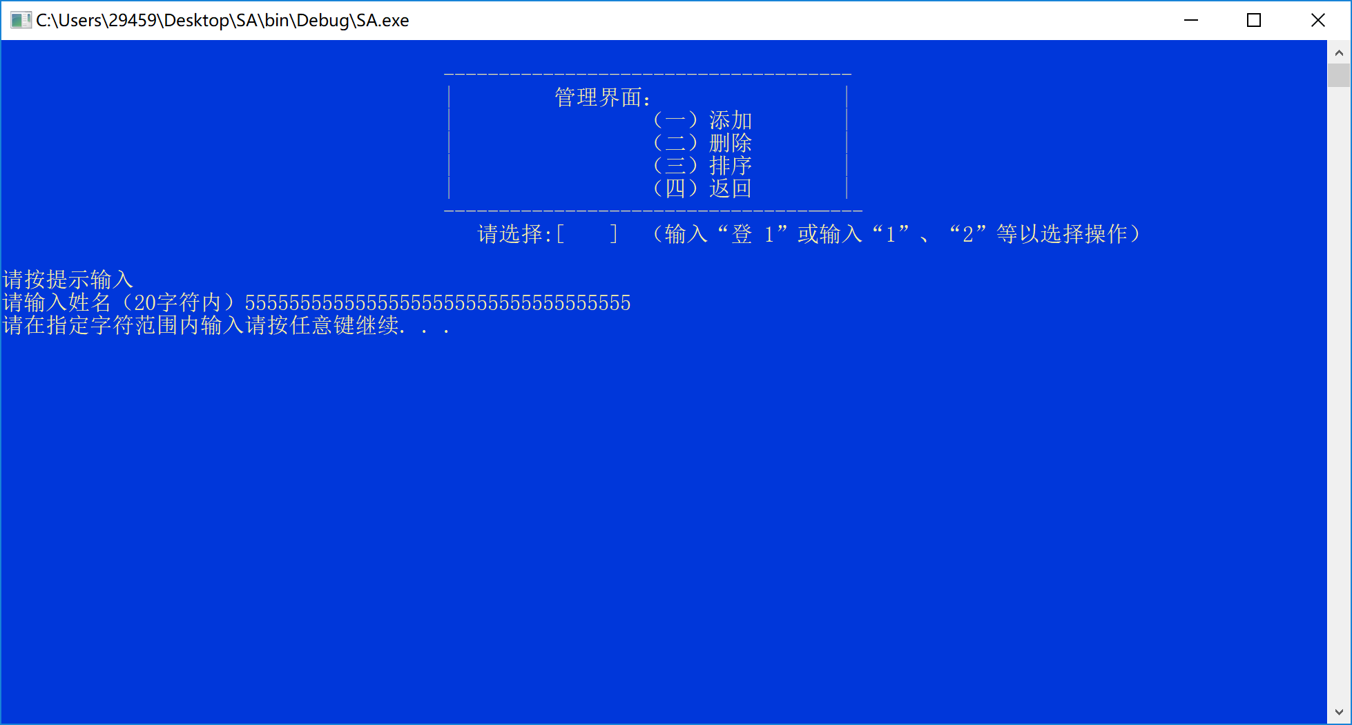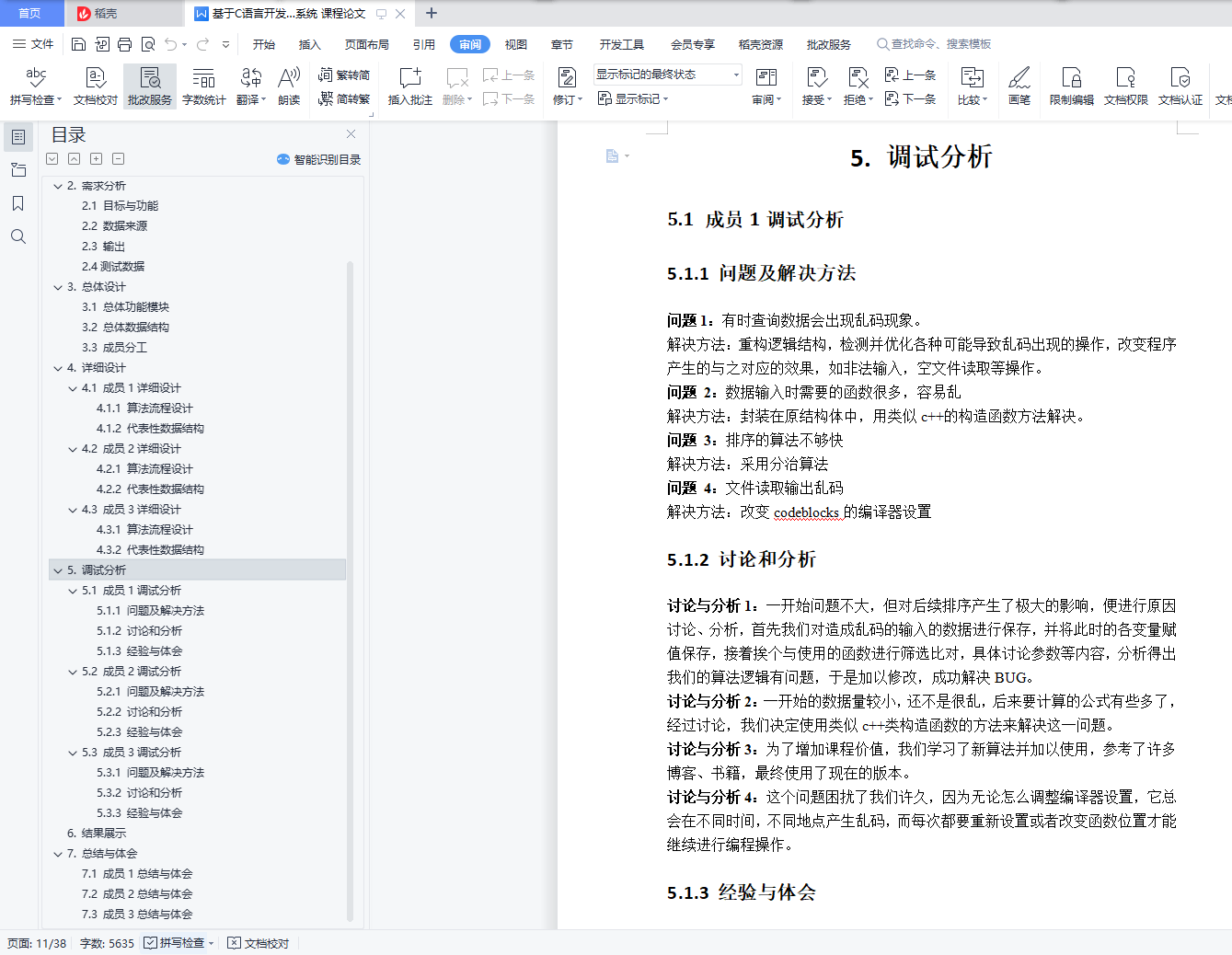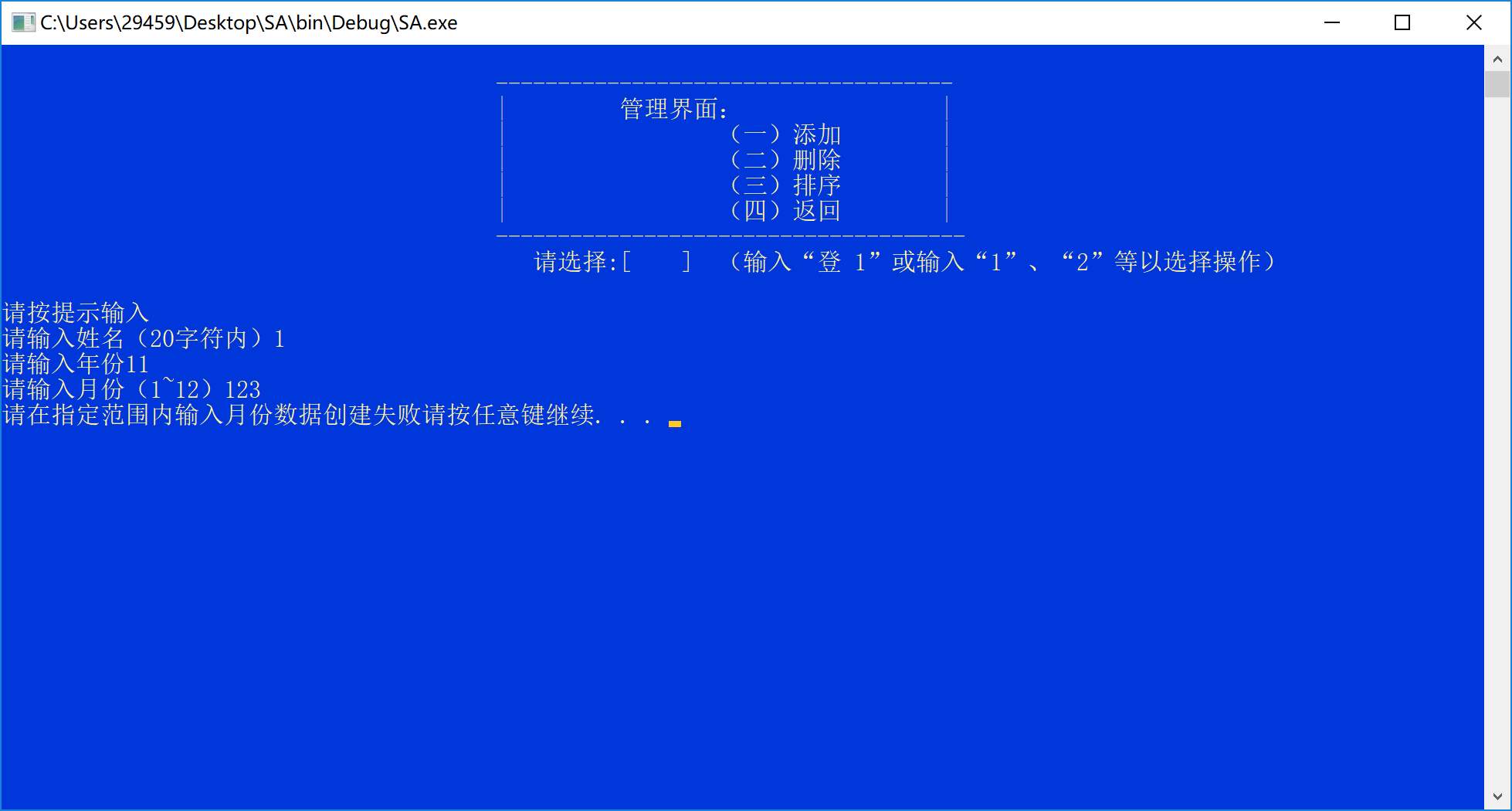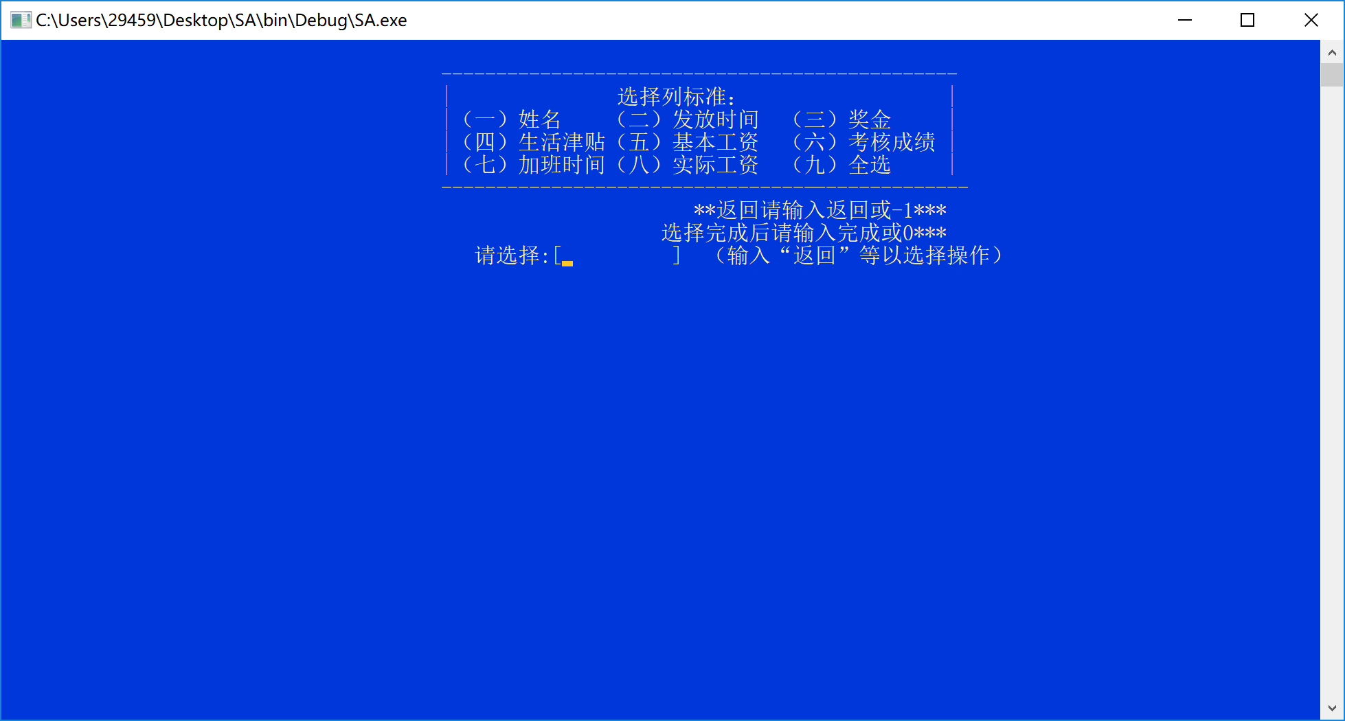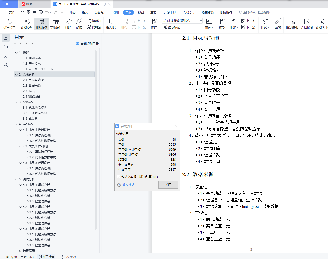 目 录1. 概述 11.1 问题描述 11.2 基本要求 11.1 人员及工作量占比 12. 需求分析 22.1 目标与功能 22.2 数据来源 22.3 输出 22.4测试数据 23. 总体设计 33.1 总体功能模块 33.2 总体数据结构 33.3 成员分工 34. 详细设计 44.1 成员1详细设计 44.1.1 算法流程设计 44.1.2 代表性数据结构 44.2 成员2详细设计 44.2.1 算法流程设计 44.2.2 代表性数据结构 44.3 成员3详细设计 44.3.1 算法流程设计 54.3.2 代表性数据结构 55. 调试分析 65.1 成员1调试分析 65.1.1 问题及解决方法 65.1.2 讨论和分析 65.1.3 经验与体会 65.2 成员2调试分析 65.2.1 问题及解决方法 65.2.2 讨论和分析 65.2.3 经验与体会 65.3 成员3调试分析 75.3.1 问题及解决方法 75.3.2 讨论和分析 75.3.3 经验与体会 76. 结果展示 87. 总结与体会 97.1 成员1总结与体会 97.2 成员2总结与体会 97.3 成员3总结与体会 91. 概述1.1 问题描述工资分配与管理向来是一个繁琐而重要的话题,为了更方便的进行管理,需要我们设计“工资管理系统”进行对工资的数据维护,查询,排序,统计,输出并保证系统的完整性。1.2 基本要求1、具有数据维护、数据查询、排序、统计、输出、系统维护、帮助、退出等功能。2、具有通用性、安全性、界面美观、操作方便1.1 人员及工作量占比1、组长: 工作量占比:50%。2、组员: 工作量占比:25%。3、组员: 工作量占比:25%。2. 需求分析2.1 目标与功能1、保障系统的安全性:(1)登录功能(2)数据备份(3)数据恢复(4)非法输入纠正2、保证系统界面的美观:(1)图形功能(2)菜单位置设置(3)菜单唯一(4)蓝白主题3、保证系统的通用操作:(1)中文与数字选项并用(2)部分界面能进行复杂的逻辑选择4、能够进行数据维护、查询、排序、统计、输出:(1)数据录入(2)数据删除(3)数据修改(4)数据查询2.2 数据来源1、安全性:(1)登录功能:从键盘读入用户数据(2)数据备份:由键盘输入进行修改(3)数据恢复:从文件(backup.txt)读取数据2、美观性:(1)图形功能:无(2)菜单位置:无(3)菜单唯一:无(4)蓝白主题:无3、通用性:(1)中文与数字选项并用:使用strcmp||目标数字与用户的键盘输入匹配(2)逻辑选择:使用位运算与逻辑运算与用户的键盘输入匹配4、数据操作:(1)数据录入:有文件导入函数进行文件读取,也有添加功能从键盘输入导入到目标文件(2)数据删除:从键盘输入目标信息,再将数据文件的数据导入到程序中进行匹配(3)数据修改:从键盘输入目标信息,再将数据文件的数据导入到程序中进行匹配(4)数据查询:从键盘输入目标信息,再将数据文件的数据导入到程序中进行匹配(5)数据排序(6)数据统计