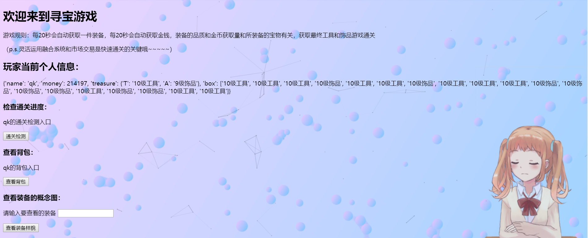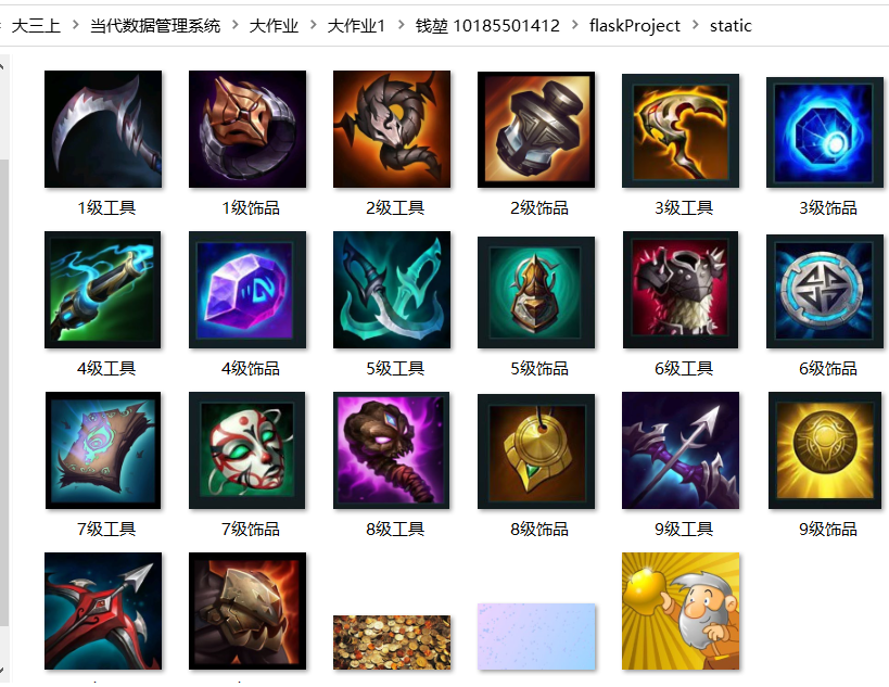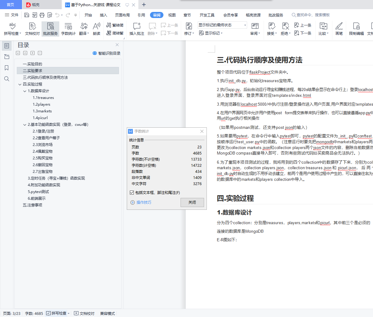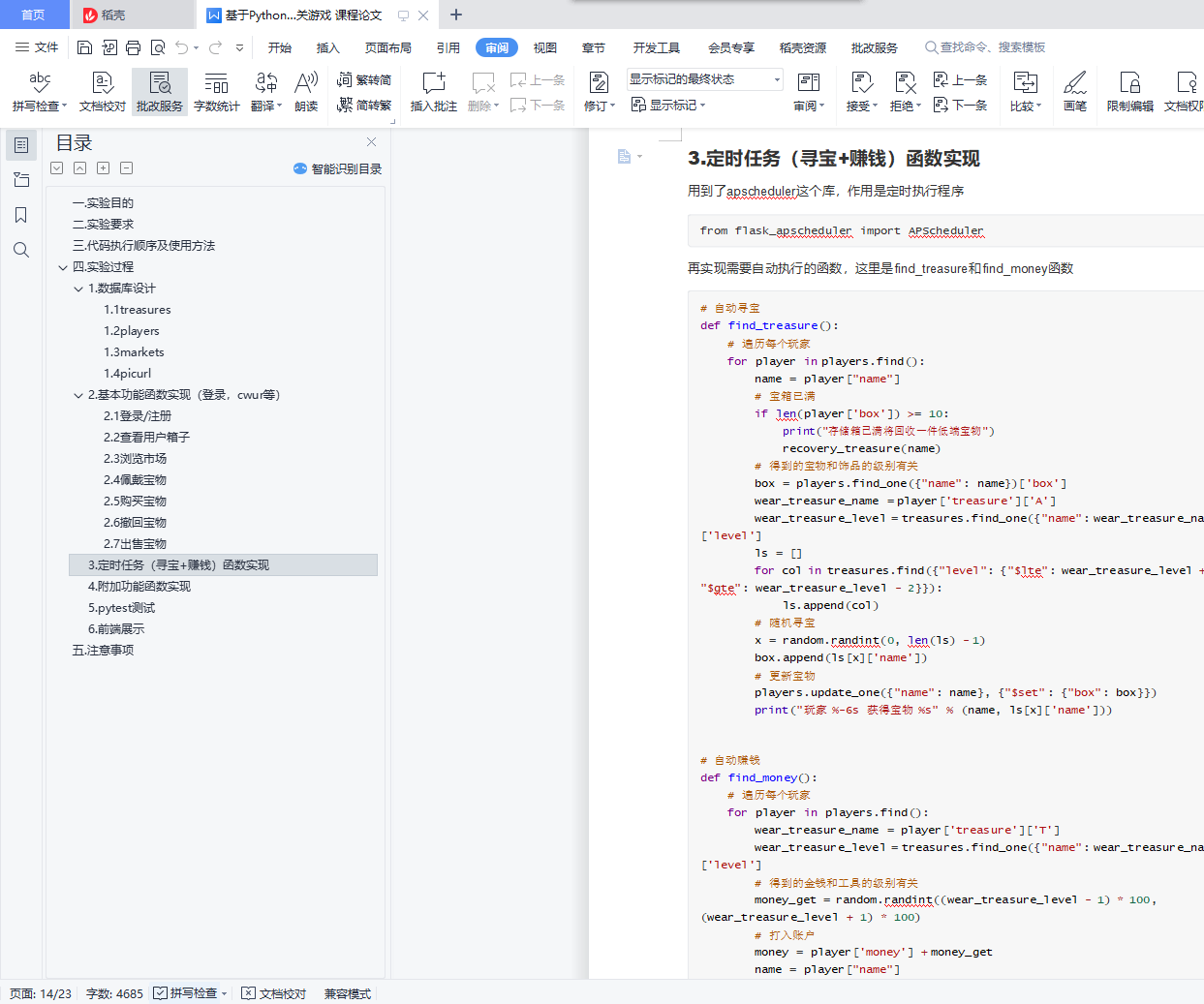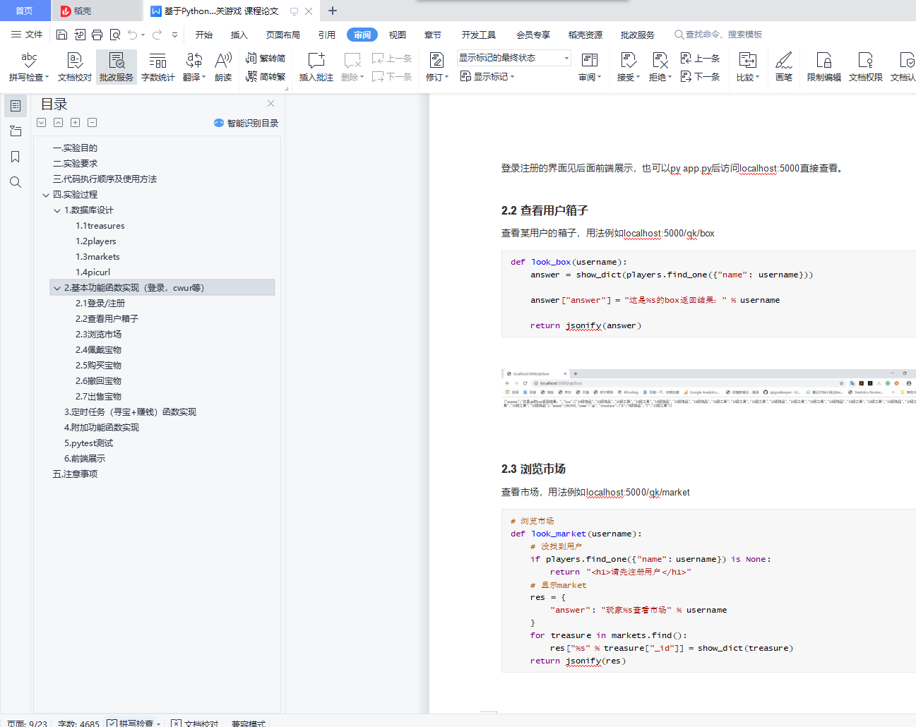 目录一.实验目的 1二.实验要求 1三.代码执行顺序及使用方法 3四.实验过程 31.数据库设计 31.1 treasures 41.2 players 51.3 markets 61.4 picurl 62.基本功能函数实现(登录,cwur等) 82.1 登录/注册 82.2 查看用户箱子 92.3 浏览市场 92.4 佩戴宝物 102.5 购买宝物 112.6 撤回宝物 132.7 出售宝物 143.定时任务(寻宝+赚钱)函数实现 174.附加功能函数实现 185. pytest测试 236.前端展示 25五.注意事项 27一.实验目的1.练习Mongodb操作,学习如何设计数据库 2.练习Python的Flask框架3.学会用pytest测试4.学会用定时任务执行函数二.实验要求考虑以下游戏场景:1.每个游戏玩家都有一定数量的金币、宝物。有一个市场供玩家们买卖宝物。玩家可以将宝物放到市 场上挂牌,自己确定价格。其他玩家支付足够的金币,可购买宝物。2.宝物分为两类:一类为工具,它决定持有玩家的工作能力;一类为配饰,它决定持有玩家的运气。3.每位玩家每天可以通过寻宝获得一件宝物,宝物的价值由玩家的运气决定。每位玩家每天可以通过 劳动赚取金币,赚得多少由玩家的工作能力决定。(游戏中的一天可以是现实中的1分钟、5分钟、10分钟。自主设定。)4.每个宝物都有一个自己的名字(尽量不重复)。每位玩家能够佩戴的宝物是有限的(比如一个玩家 只能佩戴一个工具和两个配饰)。多余的宝物被放在存储箱中,不起作用,但可以拿到市场出售。5.在市场上挂牌的宝物必须在存储箱中并仍然在存储箱中,直到宝物被卖出。挂牌的宝物可以被收 回,并以新的价格重新挂牌。当存储箱装不下时,运气或工作能力值最低的宝物将被系统自动回 收。6.假设游戏永不停止而玩家的最终目的是获得最好的宝物。请根据以上场景构建一个假想的Web游戏,可供多人在线上玩耍。界面尽可能简单(简单文字和链接即 可,不需要style)。后台的数据库使用mongodb。对游戏玩家提供以下几种操作:寻宝(可以自动每 天一次)、赚钱(可以自动每天一次)、佩戴宝物、浏览市场、买宝物、挂牌宝物、收回宝物。提交:程序+文档要求:1.文档主要用于解释你的数据库设计,即需要构建哪些collection,每个collection的文档结构是什 么,需要构建哪些索引,应用如何访问数据库(具体的CRUD命令);2.为玩家的操作设计JSON HTTP协议的接口,自定义接口格式(request和response的JSON);为每个接口编写测试用例和测试代码;3.不限制编程语言及web框架。