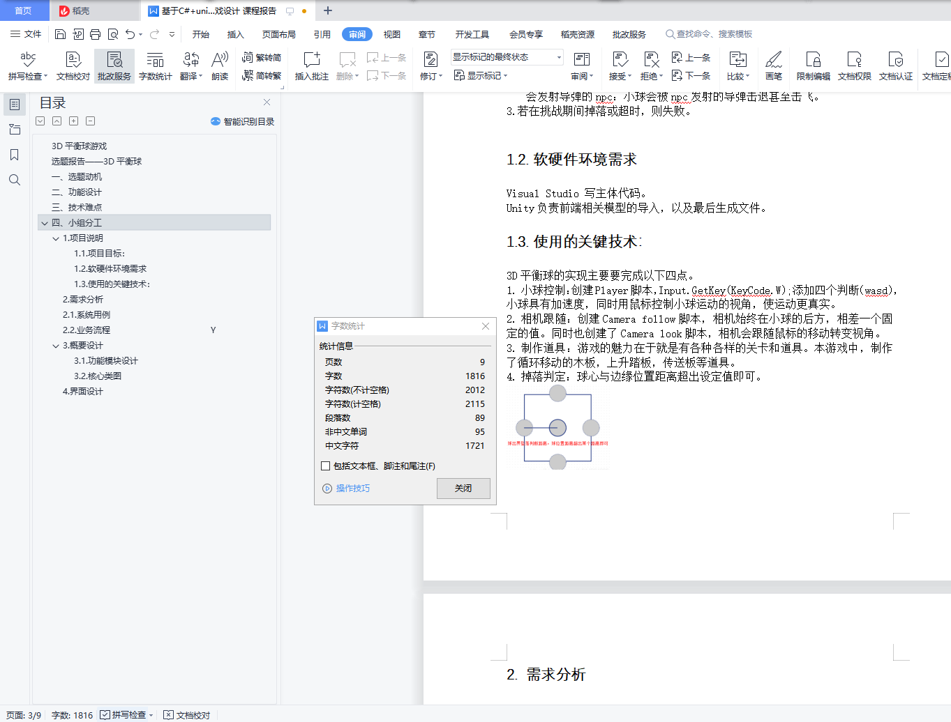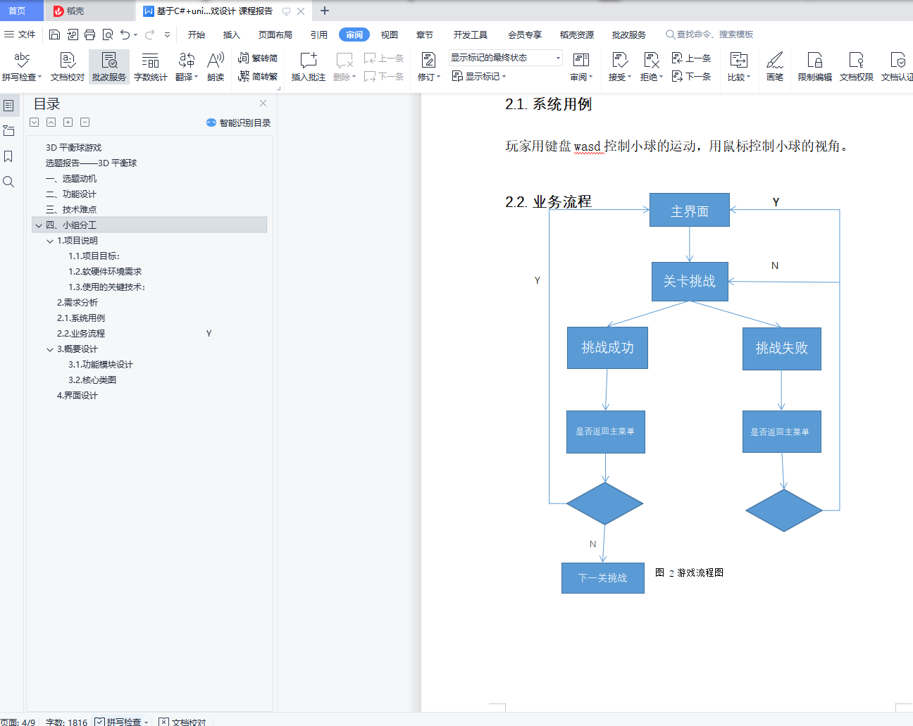 3D平衡球游戏选题报告――3D平衡球一、选题动机3D平衡球是我们小时候玩的一款经典游戏,再加上最近在b站刷到了大佬玩平衡球的视频,我们小组决定用c#和unity实现这款游戏,也作为我们用unity实现的第一个项目。二、功能设计1.在主菜单界面可以选择不同的关卡进行挑战。,同时还有背景音乐。2.开始挑战后,玩家要在限定时间内控制小球收集完全部金币并抵达终点。其中地图上会有不同功能的板,例如循环移动的木板,上升踏板,传送板,还有会发射导弹的npc等。循环移动的木板:该木板会按照固定的路径循环移动。上升踏板:小球接触到该踏板后,会受到一个向上的力,使小球腾空。传送板:小球接触到该传送板后,会被传送到另一个传送板旁边。会发射导弹的npc:小球会被npc发射的导弹击退甚至击飞。3.若在挑战期间掉落或超时,则失败。三、技术难点这是我们小组第一次尝试用unity做游戏,unity的使用可能是一个挑战。怎么让小球的运动更具真实的物理引擎也是一个难点。四、小组分工一人负责前端工作,两人负责规则的实现。目录3D平衡球游戏 1选题报告――3D平衡球 1一、 选题动机 1二、功能设计 1三、技术难点 1四、小组分工 11. 项目说明 31.1. 项目目标: 31.2. 软硬件环境需求 31.3. 使用的关键技术: 32. 需求分析 42.1. 系统用例 42.2. 业务流程 Y 43. 概要设计 53.1. 功能模块设计 53.2. 核心类图 84. 界面设计 9
