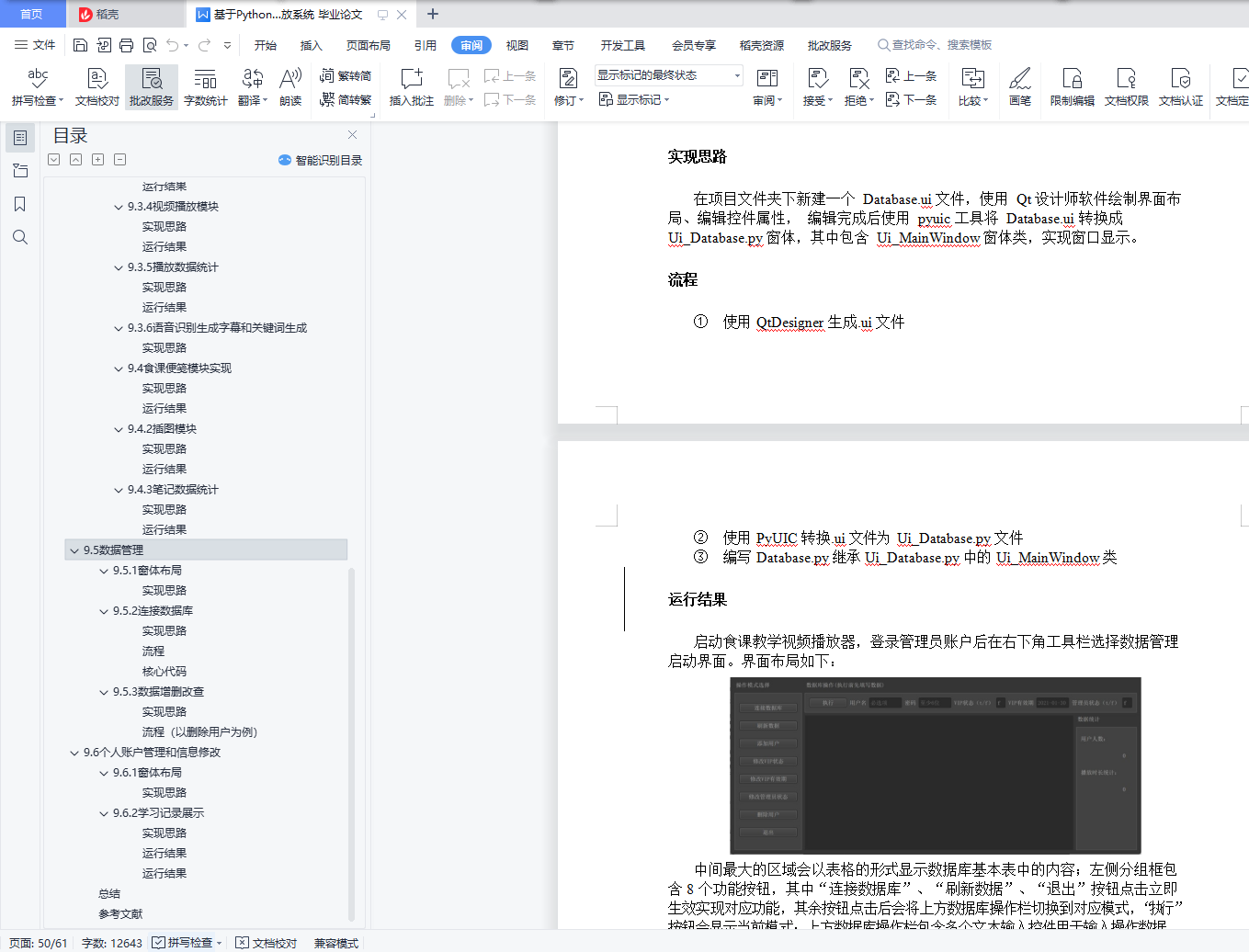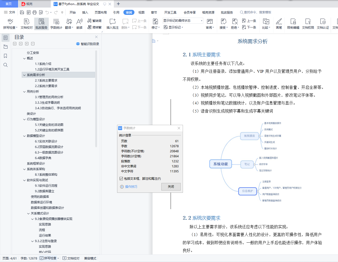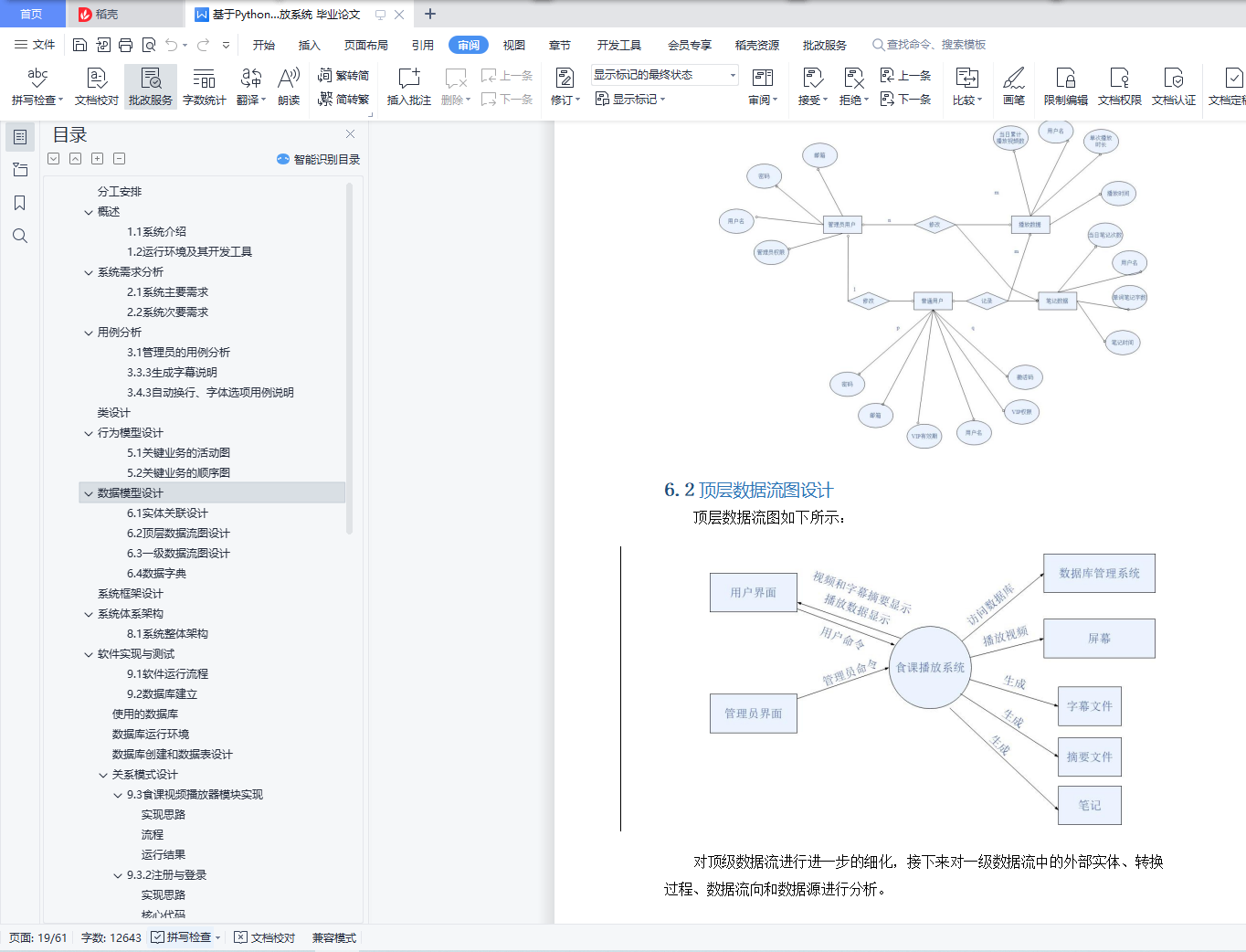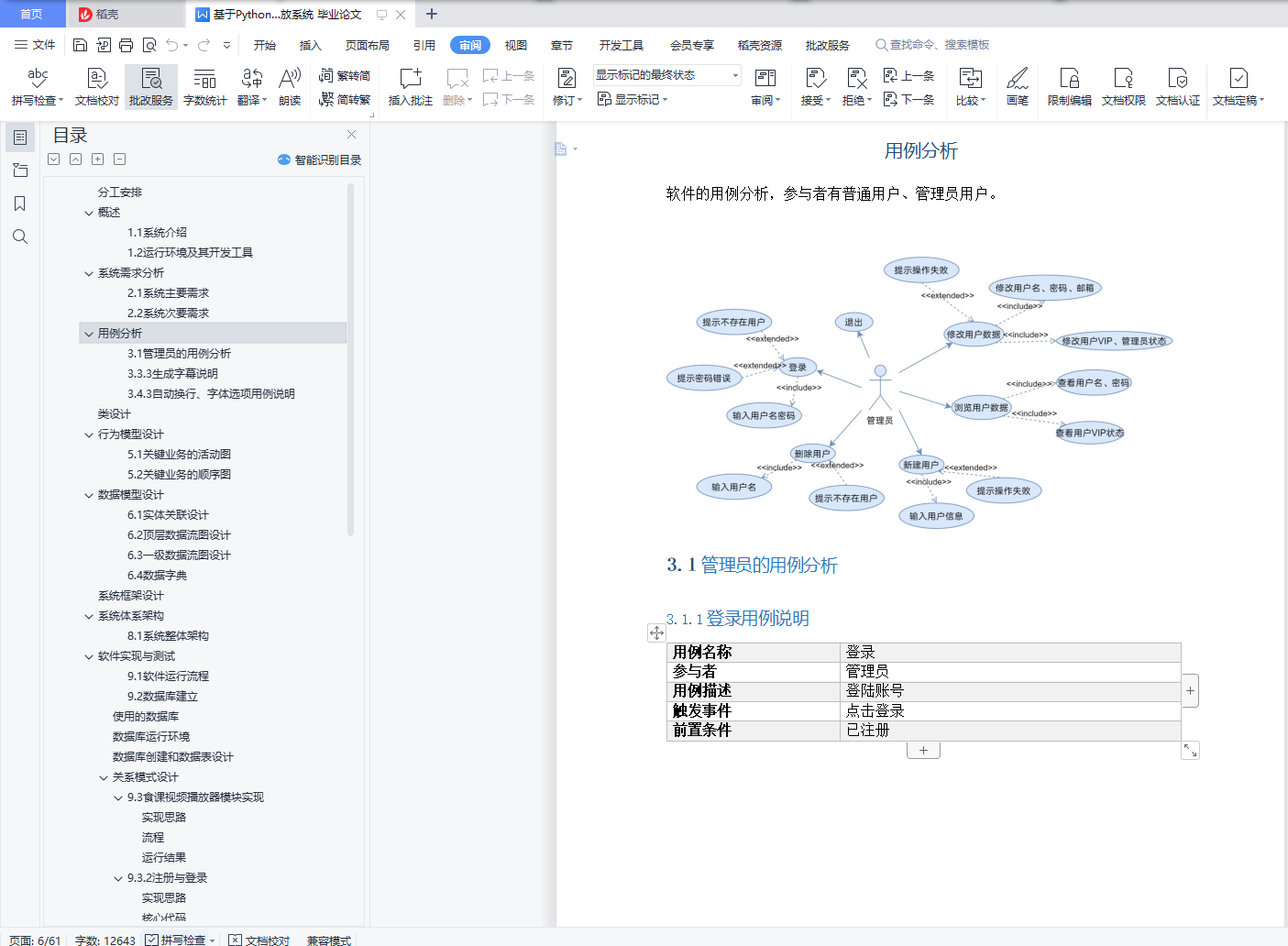 目录分工安排 4概述 42.1系统介绍 42.2运行环境及其开发工具 4系统需求分析 53.1系统主要需求 53.2系统次要需求 5用例分析 74.1管理员的用例分析 74.1.1登录用例说明 74.1.2退出用例说明 74.1.3查看用户信息说明 74.1.4修改用户信息说明 74.1.5新建用户用例 74.1.6删除用户用例 74.2用户用例分析 74.2.1登录用例说明 74.2.2退出用例说明 74.2.3查看用户信息说明 74.2.4修改用户信息说明 74.2.5新建用户用例 74.2.6激活 VIP 7类设计 17行为模型设计 17数据模型设计 187.1实体关联设计 197.2顶层数据流图设计 207.3一级数据流图设计 207.4数据字典 227.4.1 账户 237.4.2播放数据 247.4.3笔记数据 25原型设计 25系统框架设计 26系统体系架构 2710.1 系统整体架构 27软件实现与测试 2711.1软件运行流程 2711.2数据库建立 31使用的数据库 31数据库运行环境 31数据库创建和数据表设计 31关系模式设计 3211.3食课视频播放器模块实现 3311.3.1主窗体布局 3311.3.2注册与登录 3411.3.3VIP 激活 3711.3.4视频播放模块 3911.3.5播放数据统计 4211.4食课便笺模块实现 4711.4.1窗体布局 4711.4.2插图模块 4711.4.3笔记数据统计 4911.5数据管理 5011.5.1窗体布局 5011.5.2连接数据库 5111.5.3数据增删改查 5311.6个人账户管理和信息修改 5711.6.1窗体布局 5711.6.2学习记录展示 5711.6.3用户信息修改 58总结 60参考文献 61分工安排XXX(50%):播放器主窗体的布局与逻辑功能、笔记功能的实现、关键词生成显示。报告编写部分:概述、系统需求分析、类设计、行为模型设计、原型设计、系统框架设计、播放器模块实现、便笺模块实现、总结XXX(50%):数据库连接、数据库建立、数据表创建、用例分析、语音识别与字幕添加模块、数据模型设计、数据管理模块、个人账户管理与信息修改模块、总结、参考文献概述1.1系统介绍建立一个多功能本地视频播放系统,主要由四大部分组成,分别是视频播放器的主窗体、富文本便笺、显示账户信息和统计数据的管理界面,以及 openGauss 数据库。用户可以完成注册登录操作访问数据,并且通过获取激活码,可以得到 VIP权限;对管理员也设置了权限,区分了不同的使用对象。在登录后,导入本地视频进行正常播放,同时可以记录笔记,插入截图和图片进行记录,并且可以记录播放视频与笔记的数据等,所有数据都通过 JDBC 连接 openGauss 数据库进行操作。1.2运行环境及其开发工具该系统在 Windows10 操作系统下进行开发,软件开发环境为 Python3.8,开发工具为 PyCharm,数据库为 openGauss。
