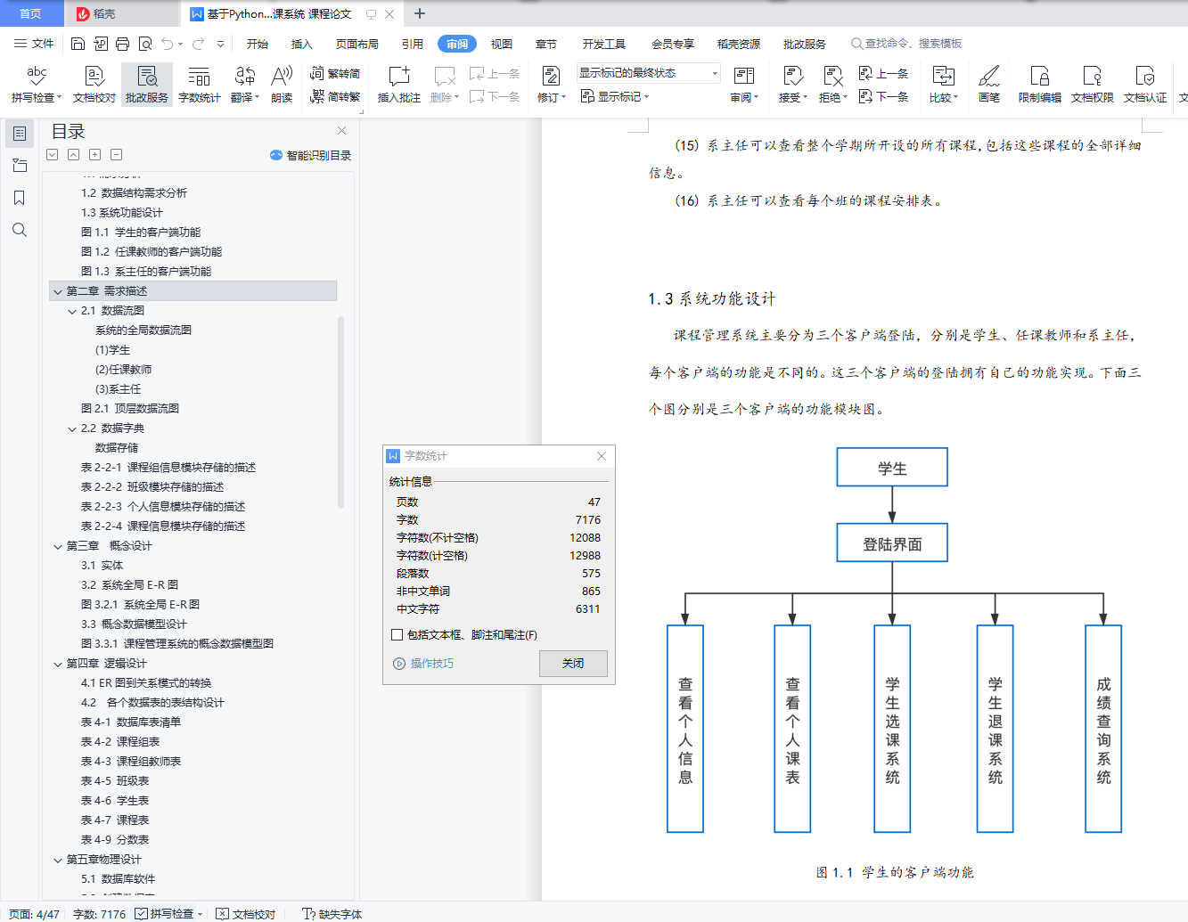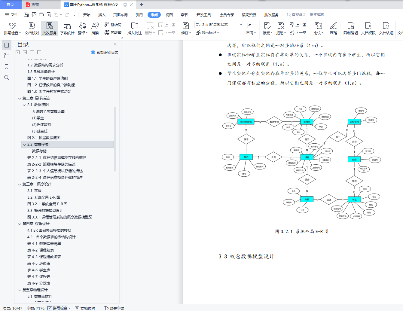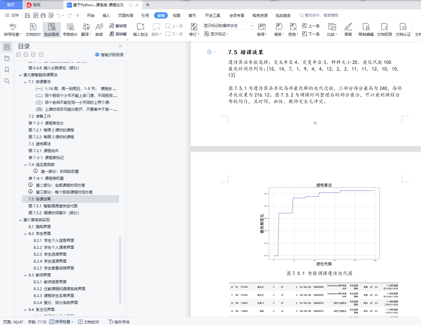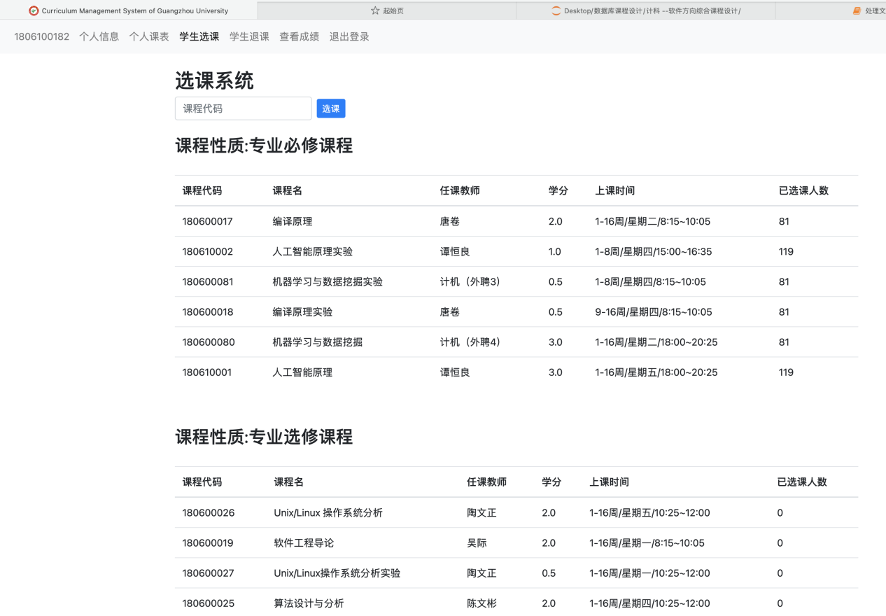 目录第一章 系统需求简介 41.1需求分析 41.2 数据结构需求分析 41.3系统功能设计 5第二章 需求描述 82.1 数据流图 82.2 数据字典 9第三章 概念设计 103.1 实体 103.2 系统全局E-R图 113.3 概念数据模型设计 12第四章 逻辑设计 134.1 ER图到关系模式的转换 134.2 各个数据表的表结构设计 13第五章 物理设计 155.1 数据库软件 155.2 创建数据表 15第六章 处理数据 186.1 数据需求 186.2 读取数据 186.3 处理数据 196.4 制作Sql语句 22第七章 智能排课算法 287.1 排课要求 287.2 准备工作 287.3 遗传算法 307.4 适应度函数 327.5 排课效果 33第八章 系统实现 358.1 登陆界面 358.2 学生界面 358.2.1 学生个人信息界面 358.2.2 学生个人课表界面 368.2.3 学生选课界面 368.2.4 学生退课界面 378.2.5 学生查看成绩界面 378.3 教师界面 378.3.1 教师信息界面 378.3.2 任教课程和调课系统界面 378.3.3 课程学生名单界面 388.3.4 登分、排分系统界面 388.4 系主任界面 398.4.1 查看所有学生界面 398.4.2 班级成绩、专业成绩排序 398.4.3 查看所有老师 408.4.4 查看所有课程 408.4.5 查看所有班级课程表 42第九章 附录 459.1 遗传算法代码 459.2 数据库连接、增删改代码 539.3 前端设计代码 559.4 执行代码 55第一章系统需求简介1.1需求分析实现一个具体的课程管理系统。按照软件工程思路设计简化的专业课数据库,尽量模拟现有专业课程一个学期的选课排课原型实际情况。(注:本系统由本人单独设计、开发完成)1.2 数据结构需求分析课程管理系统需要完成功能主要有:(1) 学生基本信息的查询,学生可以对本人的系统登陆密码进行修改。(2) 学生定制专属课表,可以查看整个学期本人的课程安排,包括课程名称、上课时间、上课地点、任课老师、学分等等。(3) 学生可以进行选课,专业必修课程系统会提前帮助学生们选上。(4) 学生可以进行退课,专业必修课程不允许退课。(5) 学生可以查看自己选上的课的成绩,以及各个课程的得分、绩点,并给出其平均绩点,但不允许查看年级其他人的成绩。(6) 任课教师基本信息的查询,老师可以对本人的系统登陆密码进行修改。(7) 任课教师可以查看本人所任教课程信息,包括课程名称、上课时间、上课地点、上课班级等等。(8) 任课教师可以对其任教课程进行调课,调课在全部课程时间无冲突下可以成功调课。(9) 任课教师可以查看其教的每一个课程的学生名单。(10) 任课教师可以对其教的课程的学生进行登分以及修改分数。(11) 任课教师可以对其任教的班级成绩进行排序。(12) 系主任拥有包括以上所有任课教师所拥有权限,以及以下的额外权限。(13) 系主任可以查看整个系的全部学生以及他们的平均绩点,可以对每个班进行排名,或者也可以对整个系进行排名。(14) 系主任可以查看整个系的任教教师名单,以及他们所负责的课程数目。(15) 系主任可以查看整个学期所开设的所有课程,包括这些课程的全部详细信息。(16) 系主任可以查看每个班的课程安排表。1.3系统功能设计课程管理系统主要分为三个客户端登陆,分别是学生、任课教师和系主任,每个客户端的功能是不同的。这三个客户端的登陆拥有自己的功能实现。下面三个图分别是三个客户端的功能模块图。