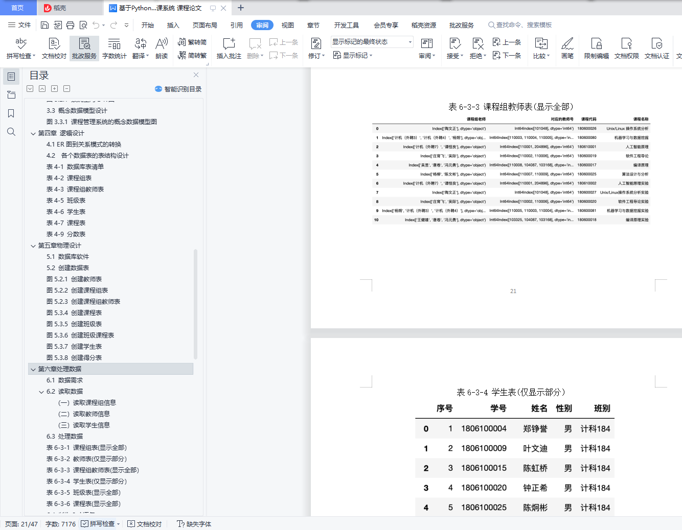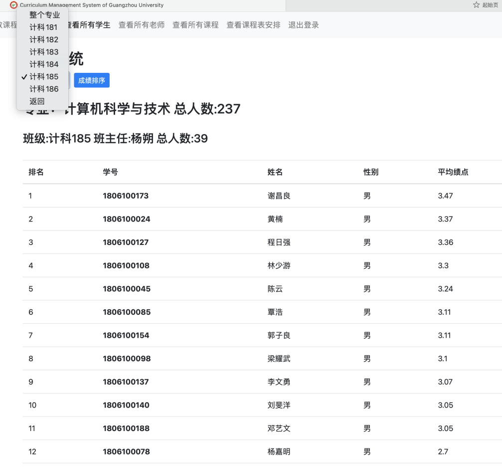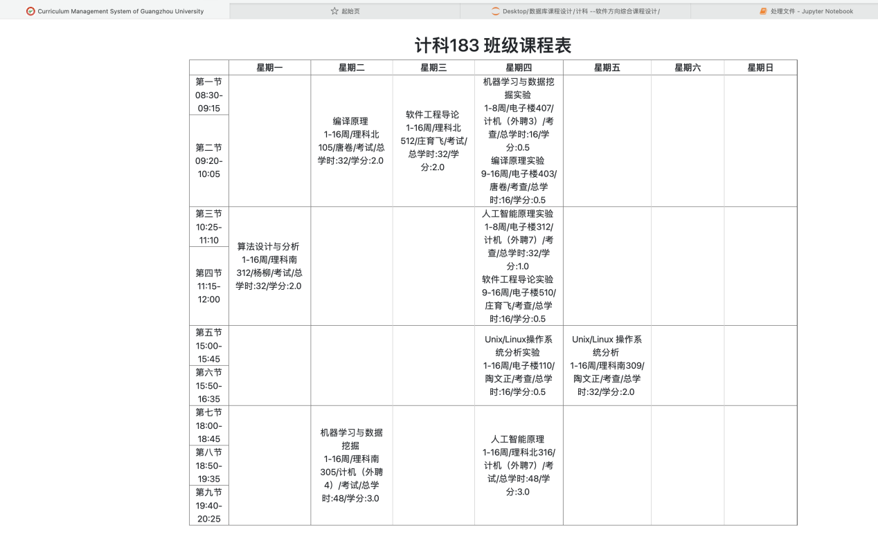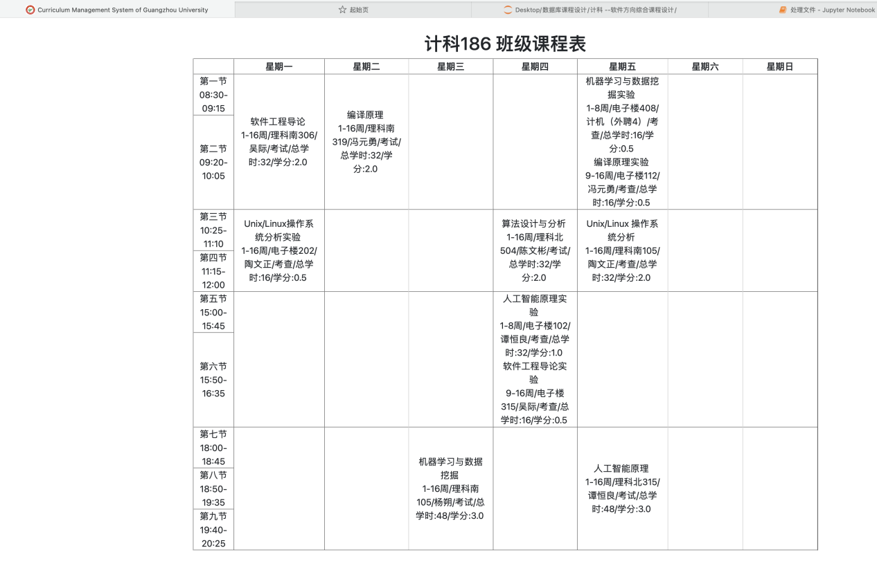 目录第一章 系统需求简介 41.1需求分析 41.2 数据结构需求分析 41.3系统功能设计 5第二章 需求描述 82.1 数据流图 82.2 数据字典 9第三章 概念设计 103.1 实体 103.2 系统全局E-R图 113.3 概念数据模型设计 12第四章 逻辑设计 134.1 ER图到关系模式的转换 134.2 各个数据表的表结构设计 13第五章 物理设计 155.1 数据库软件 155.2 创建数据表 15第六章 处理数据 186.1 数据需求 186.2 读取数据 186.3 处理数据 196.4 制作Sql语句 22第七章 智能排课算法 287.1 排课要求 287.2 准备工作 287.3 遗传算法 307.4 适应度函数 327.5 排课效果 33第八章 系统实现 358.1 登陆界面 358.2 学生界面 358.2.1 学生个人信息界面 358.2.2 学生个人课表界面 368.2.3 学生选课界面 368.2.4 学生退课界面 378.2.5 学生查看成绩界面 378.3 教师界面 378.3.1 教师信息界面 378.3.2 任教课程和调课系统界面 378.3.3 课程学生名单界面 388.3.4 登分、排分系统界面 388.4 系主任界面 398.4.1 查看所有学生界面 398.4.2 班级成绩、专业成绩排序 398.4.3 查看所有老师 408.4.4 查看所有课程 408.4.5 查看所有班级课程表 42第九章 附录 459.1 遗传算法代码 459.2 数据库连接、增删改代码 539.3 前端设计代码 559.4 执行代码 55第一章系统需求简介1.1需求分析实现一个具体的课程管理系统。按照软件工程思路设计简化的专业课数据库,尽量模拟现有专业课程一个学期的选课排课原型实际情况。(注:本系统由本人单独设计、开发完成)1.2 数据结构需求分析课程管理系统需要完成功能主要有:(1) 学生基本信息的查询,学生可以对本人的系统登陆密码进行修改。(2) 学生定制专属课表,可以查看整个学期本人的课程安排,包括课程名称、上课时间、上课地点、任课老师、学分等等。(3) 学生可以进行选课,专业必修课程系统会提前帮助学生们选上。(4) 学生可以进行退课,专业必修课程不允许退课。(5) 学生可以查看自己选上的课的成绩,以及各个课程的得分、绩点,并给出其平均绩点,但不允许查看年级其他人的成绩。(6) 任课教师基本信息的查询,老师可以对本人的系统登陆密码进行修改。(7) 任课教师可以查看本人所任教课程信息,包括课程名称、上课时间、上课地点、上课班级等等。(8) 任课教师可以对其任教课程进行调课,调课在全部课程时间无冲突下可以成功调课。(9) 任课教师可以查看其教的每一个课程的学生名单。(10) 任课教师可以对其教的课程的学生进行登分以及修改分数。(11) 任课教师可以对其任教的班级成绩进行排序。(12) 系主任拥有包括以上所有任课教师所拥有权限,以及以下的额外权限。(13) 系主任可以查看整个系的全部学生以及他们的平均绩点,可以对每个班进行排名,或者也可以对整个系进行排名。(14) 系主任可以查看整个系的任教教师名单,以及他们所负责的课程数目。(15) 系主任可以查看整个学期所开设的所有课程,包括这些课程的全部详细信息。(16) 系主任可以查看每个班的课程安排表。1.3系统功能设计课程管理系统主要分为三个客户端登陆,分别是学生、任课教师和系主任,每个客户端的功能是不同的。这三个客户端的登陆拥有自己的功能实现。下面三个图分别是三个客户端的功能模块图。