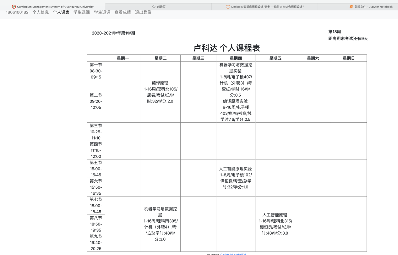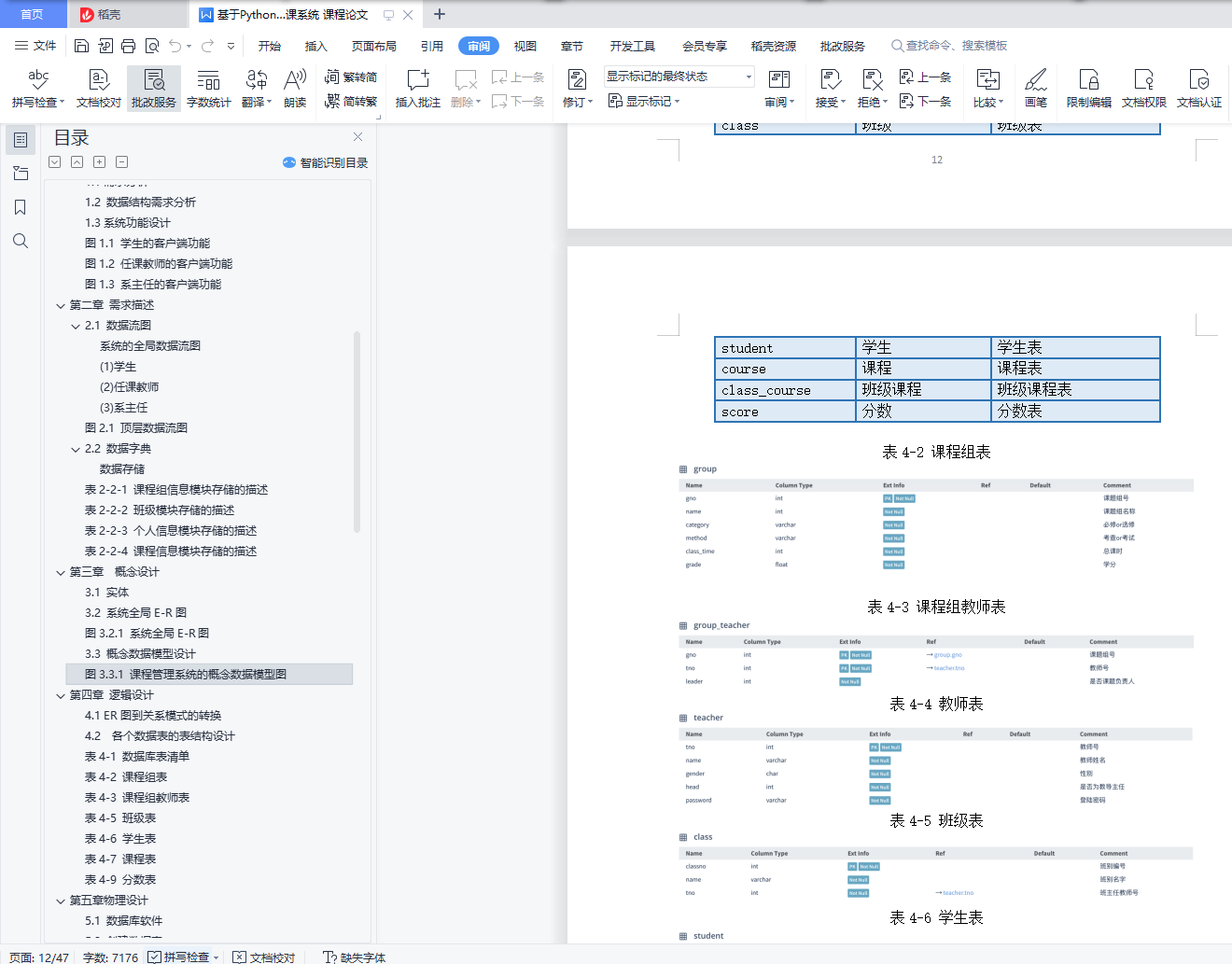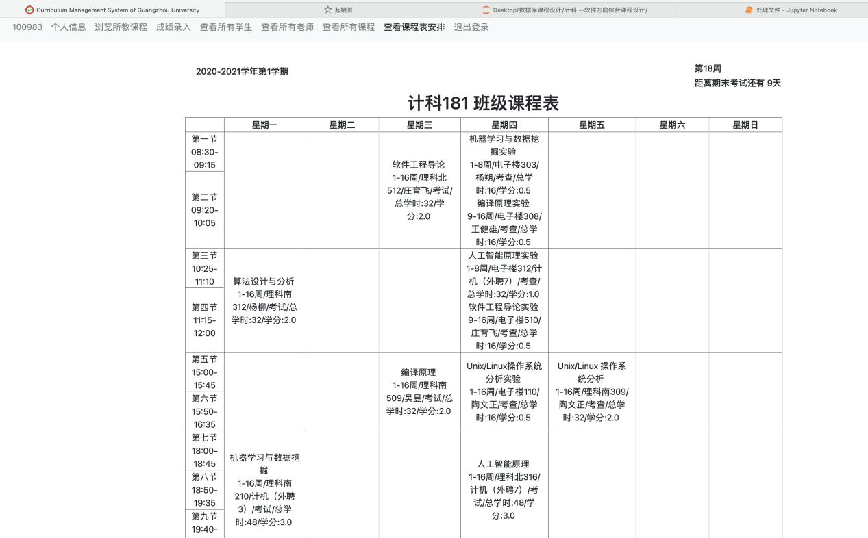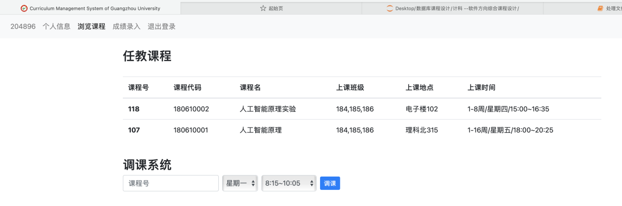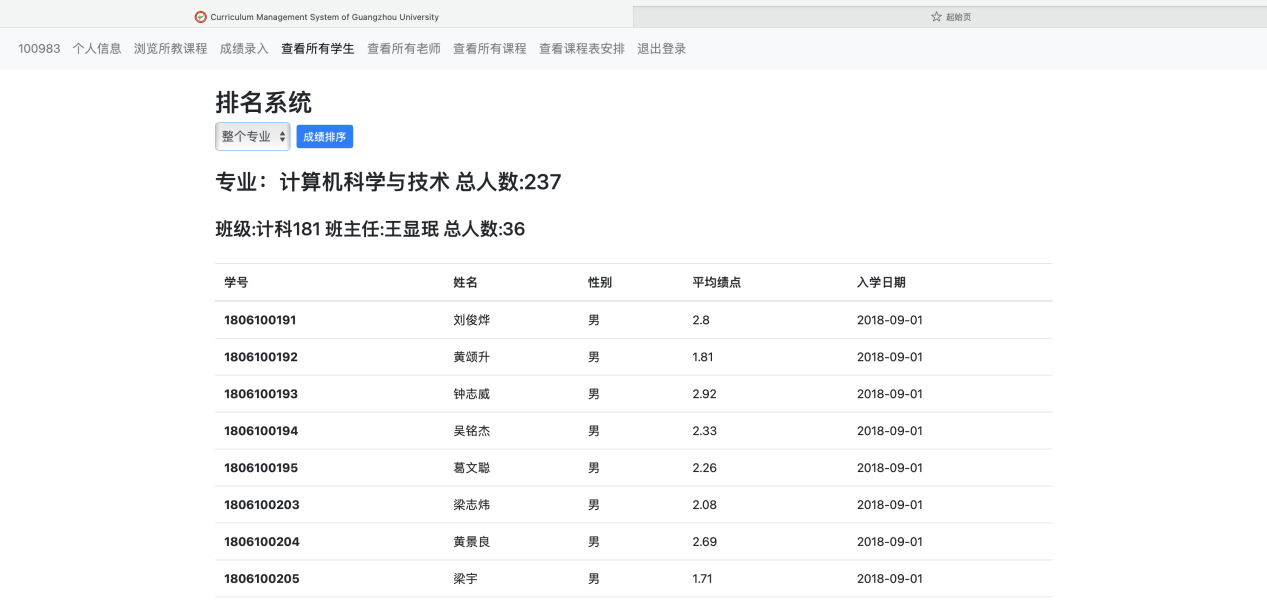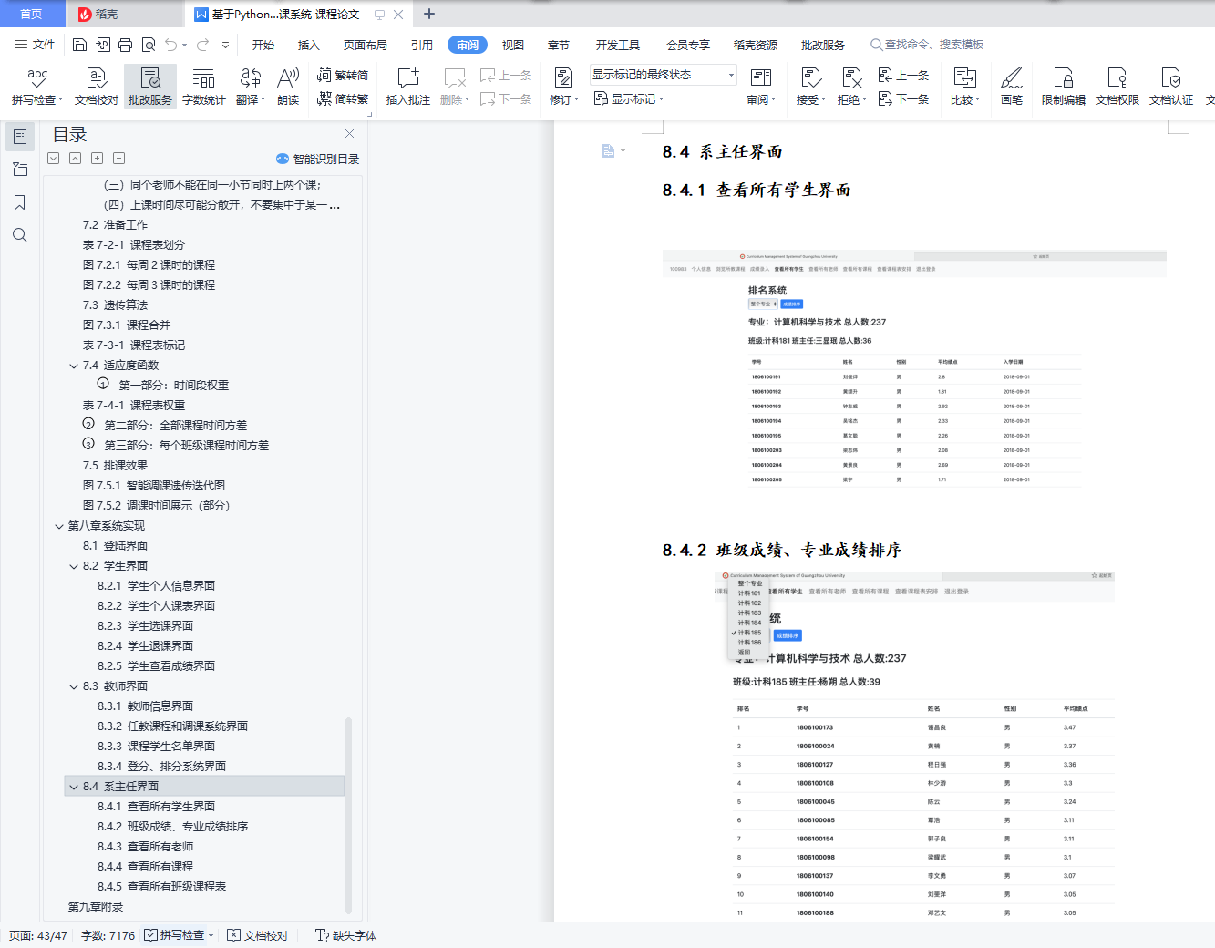 目录第一章 系统需求简介 41.1需求分析 41.2 数据结构需求分析 41.3系统功能设计 5第二章 需求描述 82.1 数据流图 82.2 数据字典 9第三章 概念设计 103.1 实体 103.2 系统全局E-R图 113.3 概念数据模型设计 12第四章 逻辑设计 134.1 ER图到关系模式的转换 134.2 各个数据表的表结构设计 13第五章 物理设计 155.1 数据库软件 155.2 创建数据表 15第六章 处理数据 186.1 数据需求 186.2 读取数据 186.3 处理数据 196.4 制作Sql语句 22第七章 智能排课算法 287.1 排课要求 287.2 准备工作 287.3 遗传算法 307.4 适应度函数 327.5 排课效果 33第八章 系统实现 358.1 登陆界面 358.2 学生界面 358.2.1 学生个人信息界面 358.2.2 学生个人课表界面 368.2.3 学生选课界面 368.2.4 学生退课界面 378.2.5 学生查看成绩界面 378.3 教师界面 378.3.1 教师信息界面 378.3.2 任教课程和调课系统界面 378.3.3 课程学生名单界面 388.3.4 登分、排分系统界面 388.4 系主任界面 398.4.1 查看所有学生界面 398.4.2 班级成绩、专业成绩排序 398.4.3 查看所有老师 408.4.4 查看所有课程 408.4.5 查看所有班级课程表 42第九章 附录 459.1 遗传算法代码 459.2 数据库连接、增删改代码 539.3 前端设计代码 559.4 执行代码 55第一章系统需求简介1.1需求分析实现一个具体的课程管理系统。按照软件工程思路设计简化的专业课数据库,尽量模拟现有专业课程一个学期的选课排课原型实际情况。(注:本系统由本人单独设计、开发完成)1.2 数据结构需求分析课程管理系统需要完成功能主要有:(1) 学生基本信息的查询,学生可以对本人的系统登陆密码进行修改。(2) 学生定制专属课表,可以查看整个学期本人的课程安排,包括课程名称、上课时间、上课地点、任课老师、学分等等。(3) 学生可以进行选课,专业必修课程系统会提前帮助学生们选上。(4) 学生可以进行退课,专业必修课程不允许退课。(5) 学生可以查看自己选上的课的成绩,以及各个课程的得分、绩点,并给出其平均绩点,但不允许查看年级其他人的成绩。(6) 任课教师基本信息的查询,老师可以对本人的系统登陆密码进行修改。(7) 任课教师可以查看本人所任教课程信息,包括课程名称、上课时间、上课地点、上课班级等等。(8) 任课教师可以对其任教课程进行调课,调课在全部课程时间无冲突下可以成功调课。(9) 任课教师可以查看其教的每一个课程的学生名单。(10) 任课教师可以对其教的课程的学生进行登分以及修改分数。(11) 任课教师可以对其任教的班级成绩进行排序。(12) 系主任拥有包括以上所有任课教师所拥有权限,以及以下的额外权限。(13) 系主任可以查看整个系的全部学生以及他们的平均绩点,可以对每个班进行排名,或者也可以对整个系进行排名。(14) 系主任可以查看整个系的任教教师名单,以及他们所负责的课程数目。(15) 系主任可以查看整个学期所开设的所有课程,包括这些课程的全部详细信息。(16) 系主任可以查看每个班的课程安排表。1.3系统功能设计课程管理系统主要分为三个客户端登陆,分别是学生、任课教师和系主任,每个客户端的功能是不同的。这三个客户端的登陆拥有自己的功能实现。下面三个图分别是三个客户端的功能模块图。