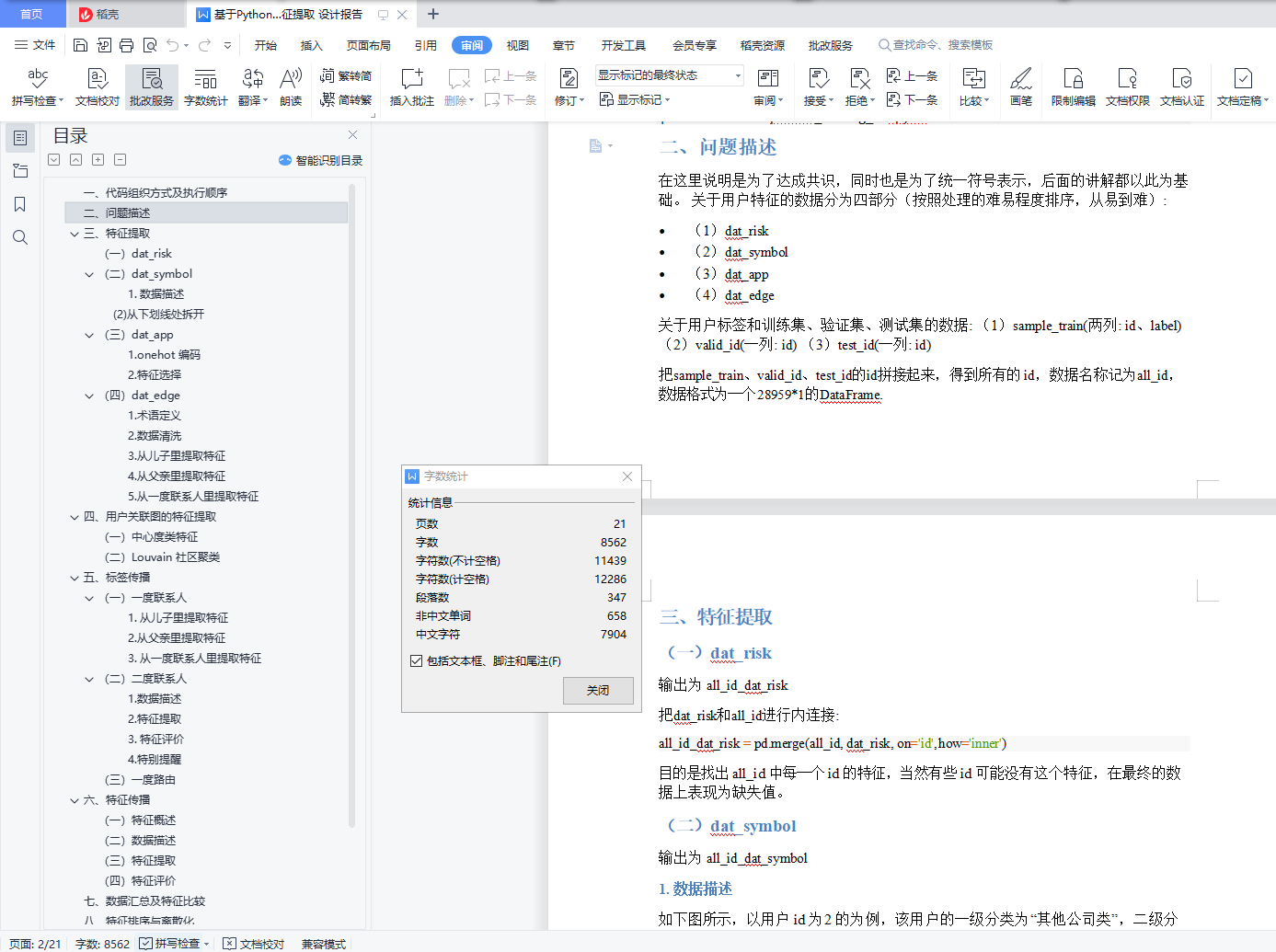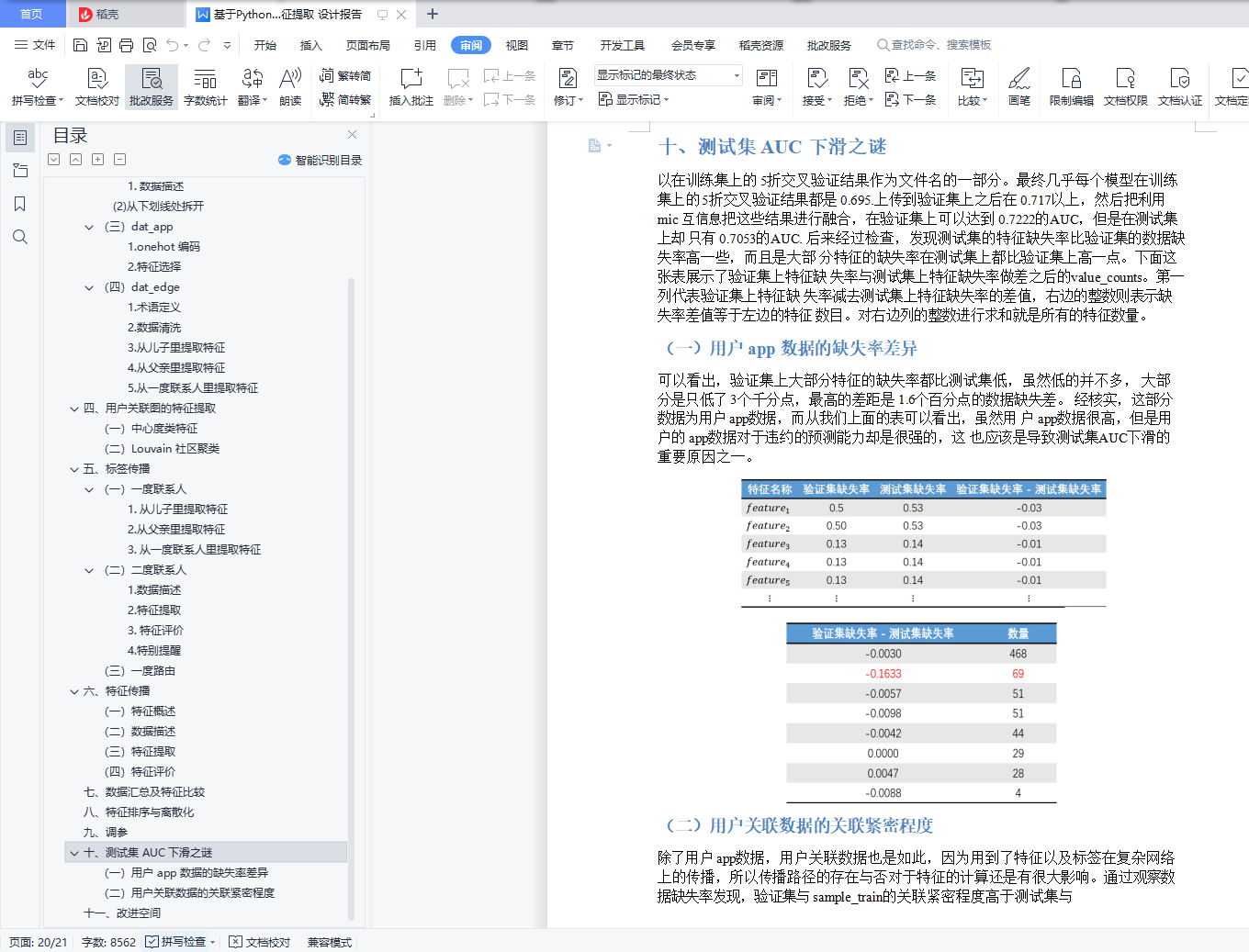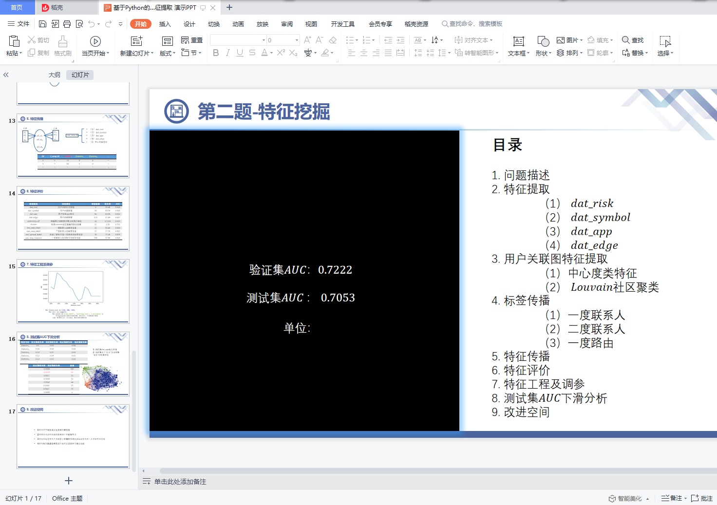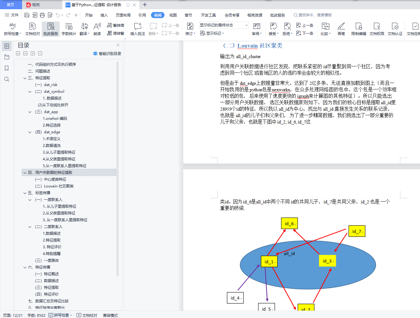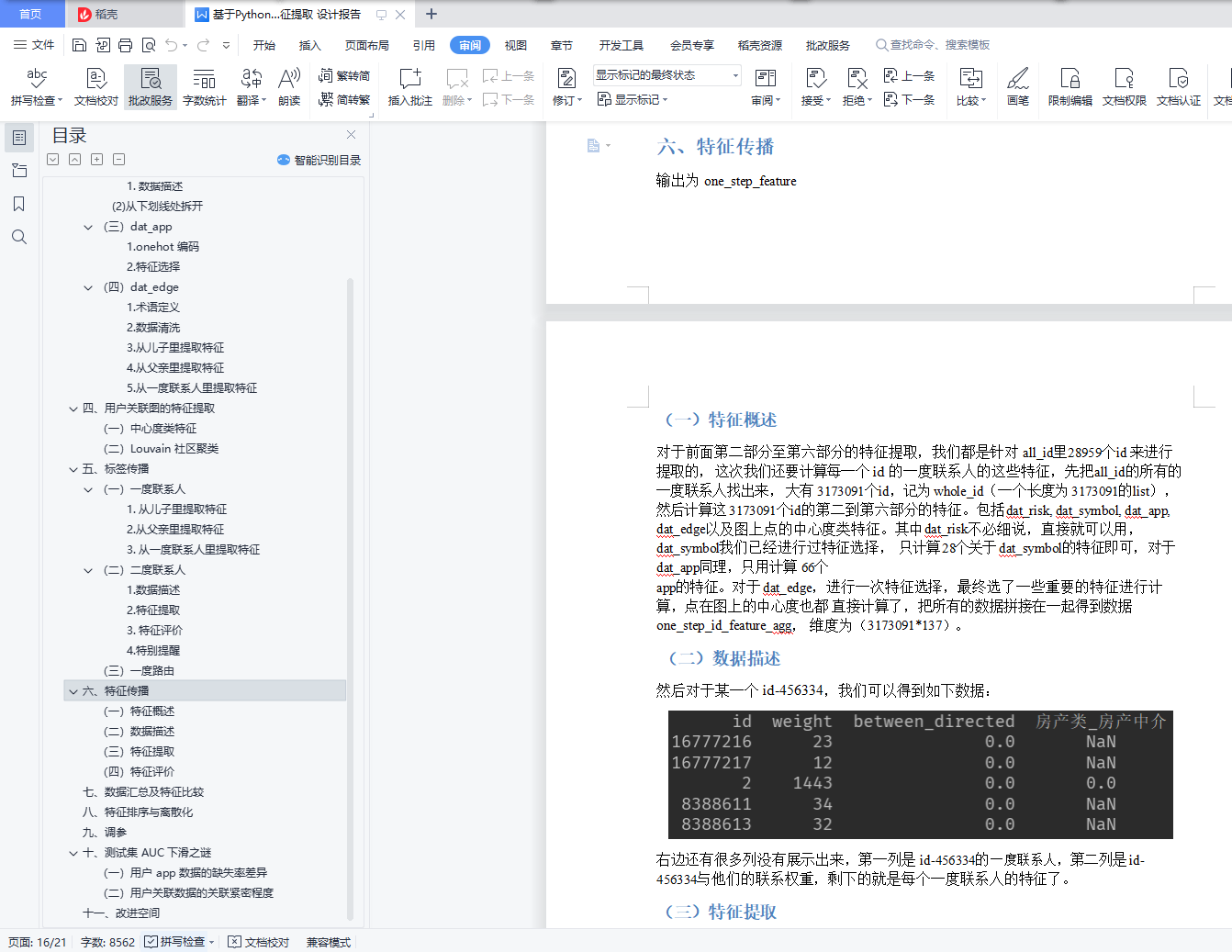 目录一、代码组织方式及执行顺序 3二、问题描述 3三、特征提取 4(一)dat_risk 4(二)dat_symbol 4(三)dat_app 6(四)dat_edge 7四、用户关联图的特征提取 13(一)中心度类特征 13(二)Louvain 社区聚类 13五、标签传播 14(一)一度联系人 14(二)二度联系人 15(三)一度路由 17六、特征传播 17(一)特征概述 18(二)数据描述 18(三)特征提取 18(四)特征评价 18七、数据汇总及特征比较 18八、特征排序与离散化 19九、调参 19十、测试集 AUC 下滑之谜 21(一)用户 app 数据的缺失率差异 21(二)用户关联数据的关联紧密程度 21十一、改进空间 22一、代码组织方式及执行顺序二、问题描述在这里说明是为了达成共识,同时也是为了统一符号表示,后面的讲解都以此为基础。 关于用户特征的数据分为四部分(按照处理的难易程度排序,从易到难):•(1)dat_risk•(2)dat_symbol•(3)dat_app•(4)dat_edge关于用户标签和训练集、验证集、测试集的数据: (1)sample_train(两列: id、label) (2)valid_id(一列: id) (3)test_id(一列: id)把 sample_train、valid_id、test_id 的 id 拼接起来,得到所有的 id,数据名称记为 all_id, 数据格式为一个 28959*1 的 DataFrame.三、特征提取(一)dat_risk输出为 all_id_dat_risk把 dat_risk 和 all_id 进行内连接:all_id_dat_risk = pd.merge(all_id, dat_risk, on='id', how='inner')目的是找出 all_id 中每一个 id 的特征,当然有些 id 可能没有这个特征,在最终的数据上表现为缺失值。