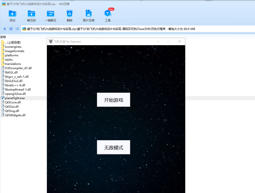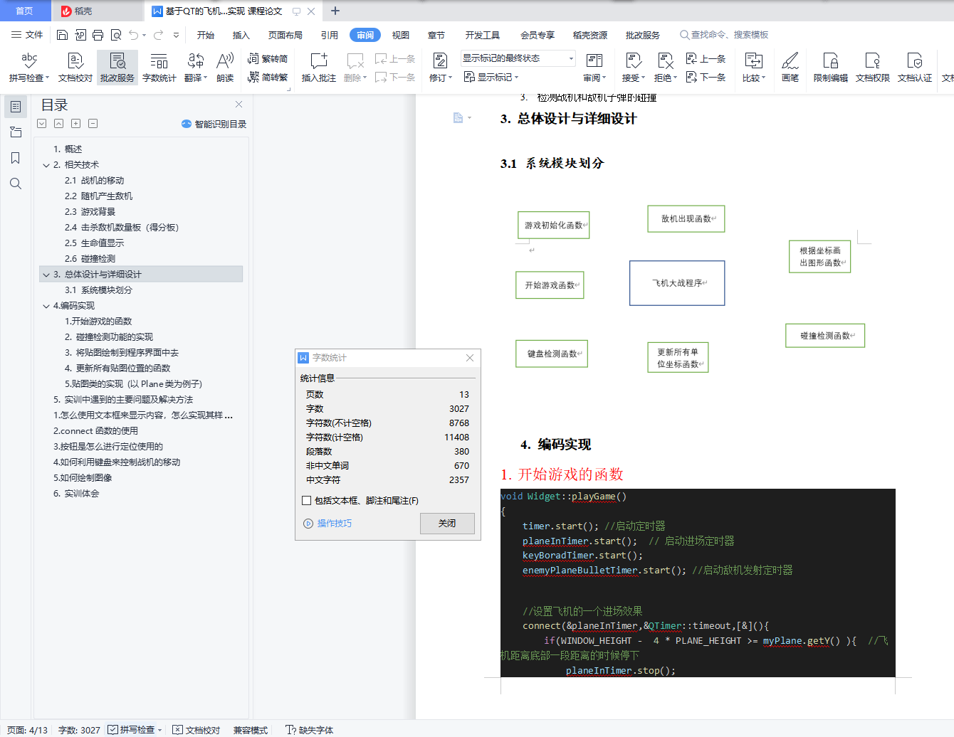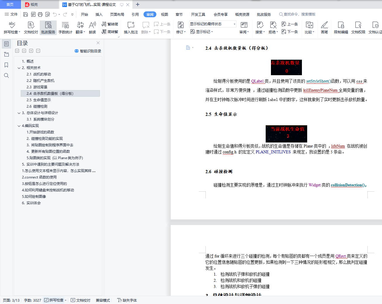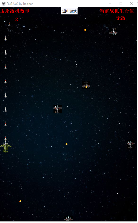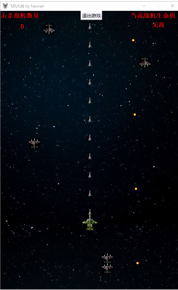 目录1. 概述 22. 相关技术 22.1 战机的移动 22.2 随机产生敌机 22.3 游戏背景 32.4 击杀敌机数量板(得分板) 42.5 生命值显示 42.6 碰撞检测 43. 总体设计与详细设计 43.1 系统模块划分 44. 编码实现 51. 开始游戏的函数 52. 碰撞检测功能的实现 63. 将贴图绘制到程序界面中去 84. 更新所有贴图位置的函数 95. 贴图类的实现 (以Plane类为例子) 105. 实训中遇到的主要问题及解决方法 141. 怎么使用文本框来显示内容,怎么实现其样式的改变 142. connect函数的使用 143. 按钮是怎么进行定位使用的 144. 如何利用键盘来控制战机的移动 145. 如何绘制图像 146. 实训体会 141. 概述这次所做的项目是飞机大战游戏,主要实现了战机的移动和导弹自动发射、敌机的自动移动和子弹的随机发射、背景的滚动和自动切换。2. 相关技术2.1 战机的移动通过键盘的WSAD方向键来控制战机实现上下左右移动,用到的技术是监听键盘按键,整个过程分为 keyPressEvent 和keyReleaseEvent,表示键盘按下和键盘释放信号,通过qt的connect和disconnect函数来将主时钟和战机的上下左右移动函数相绑定,通过检测主时钟的脉冲频率和战机移动函数来控制战机的移动速度,config.h中的 PLANE_SPEED宏 是用来规定战机的移动速度的。2.2 随机产生敌机因为要随机产生敌机,所以要用到随机数,在项目中我使用的是rand()函数,敌机有三个随机的地方,1. enemyPlane类中随机决定该敌机是否是高速敌机2. enemyPlane类中随机决定该敌机从哪个方向进入选择有两个(上方和下方)3. 主窗口中enemyToMainWindow() 函数随机决定敌机出现的x坐标。2.3 游戏背景游戏的背景是滚动的,我用两张相同的图片来实现背景滚动,第一张图片的的初始位置在游戏界面里,第二张在其底下,不能被看见,图片开始滚动之后,如果第二张图片超出屏幕那么恢复初始状态。下边是用图片解释这一过程。黑框代表程序显示的界面,能够被用户看见蓝色图片是第一张图片 初始是能被用户看见的 然后他开始向上移动橘色色图片是第二张图片 初始是不能被用户看见的 然后他开始向上移动最终被用户看见