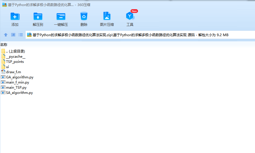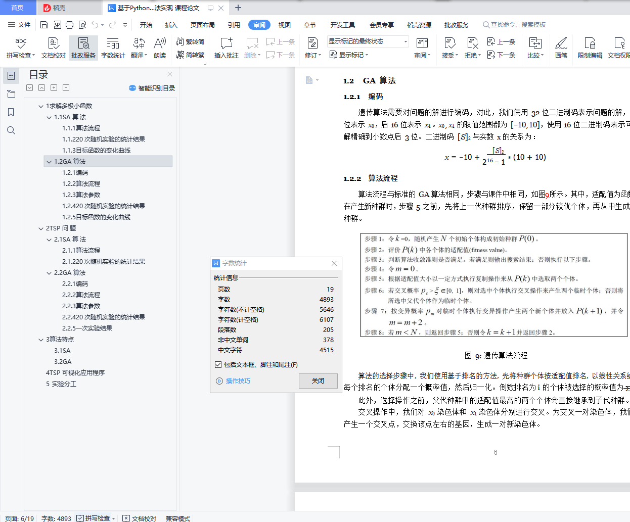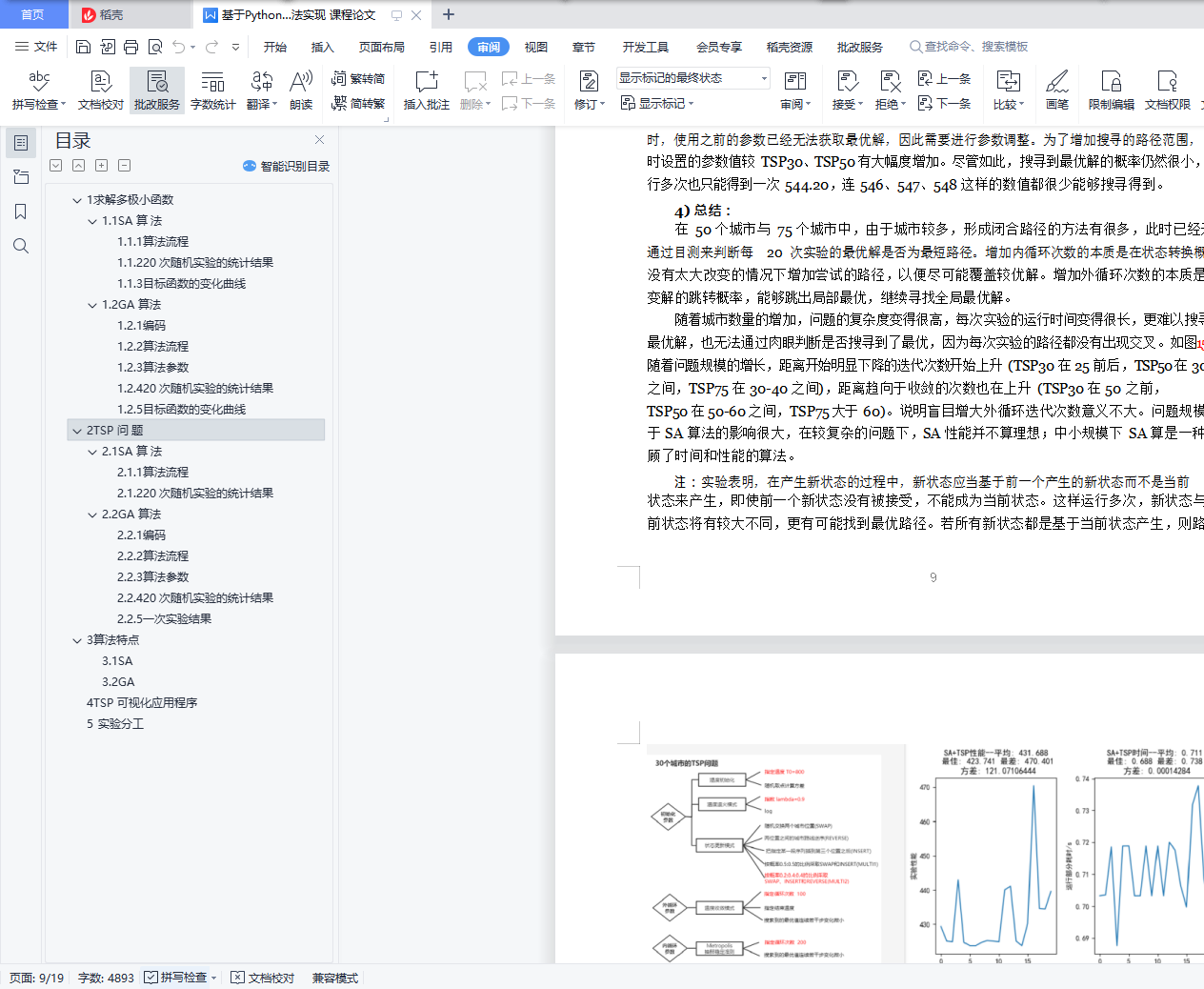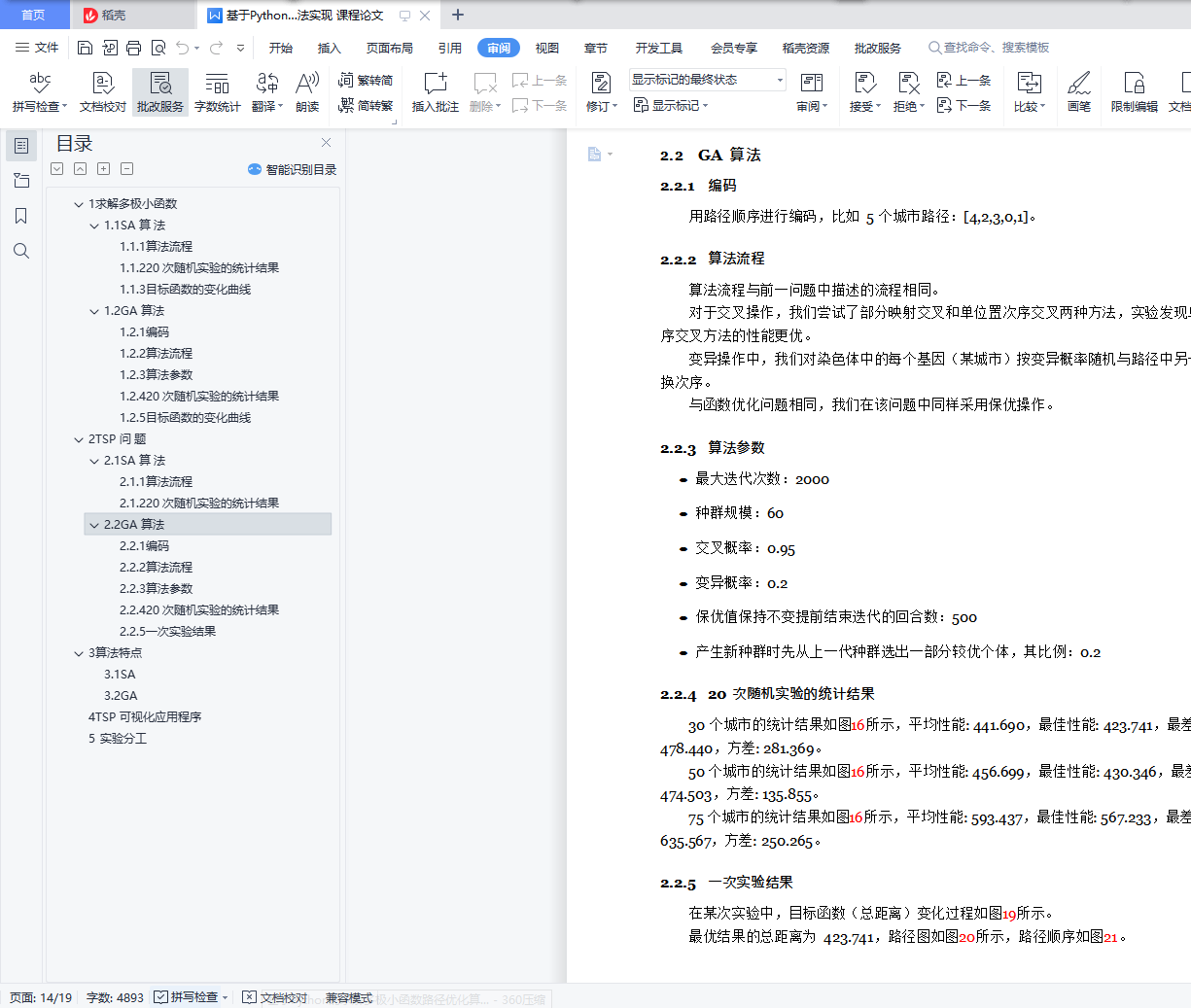目录1求解多极小函数 21.1SA 算法 21.1.1算法流程 21.1.220 次随机实验的统计结果 31.1.3目标函数的变化曲线 31.2GA 算法 61.2.1编码 61.2.2算法流程 61.2.3算法参数 71.2.420 次随机实验的统计结果 71.2.5目标函数的变化曲线 72TSP 问题 82.1SA 算法 82.1.1算法流程 82.1.220 次随机实验的统计结果 82.2GA 算法 132.2.1 编码 132.2.2算法流程 132.2.3算法参数 132.2.420 次随机实验的统计结果 132.2.5一次实验结果 133算法特点 173.1 SA 173.2 GA 174TSP 可视化应用程序 175实验分工 181求解多极小函数求解多极值函数问题中,我们需要求出函数的最值,我们以函数 f (x0, x1) = −x1 ∗ sin(x0) −x0 ∗ cos(x1) 为例,求它在 x0, x1 ∈ [−10, 10] 区间内的最小值。使用 MATLAB 画出的函数图像如图1所示,其最小值可用 matlab 库函数求出,约为-17.394, 同时该函数有多个局部极小值。