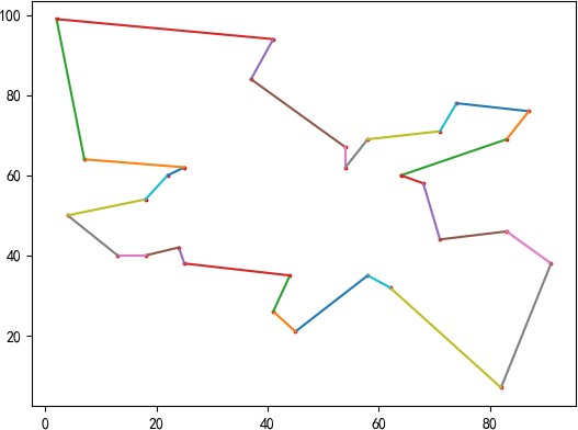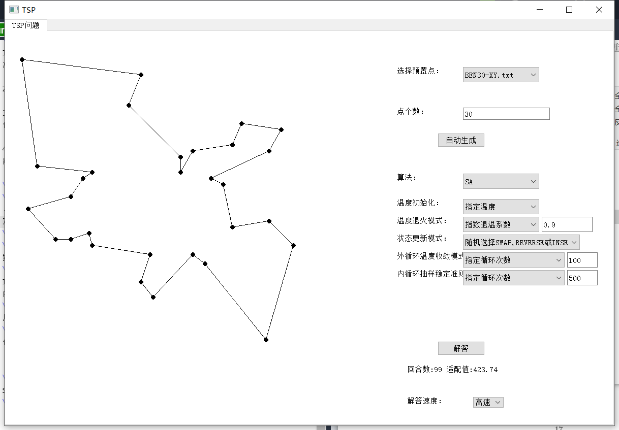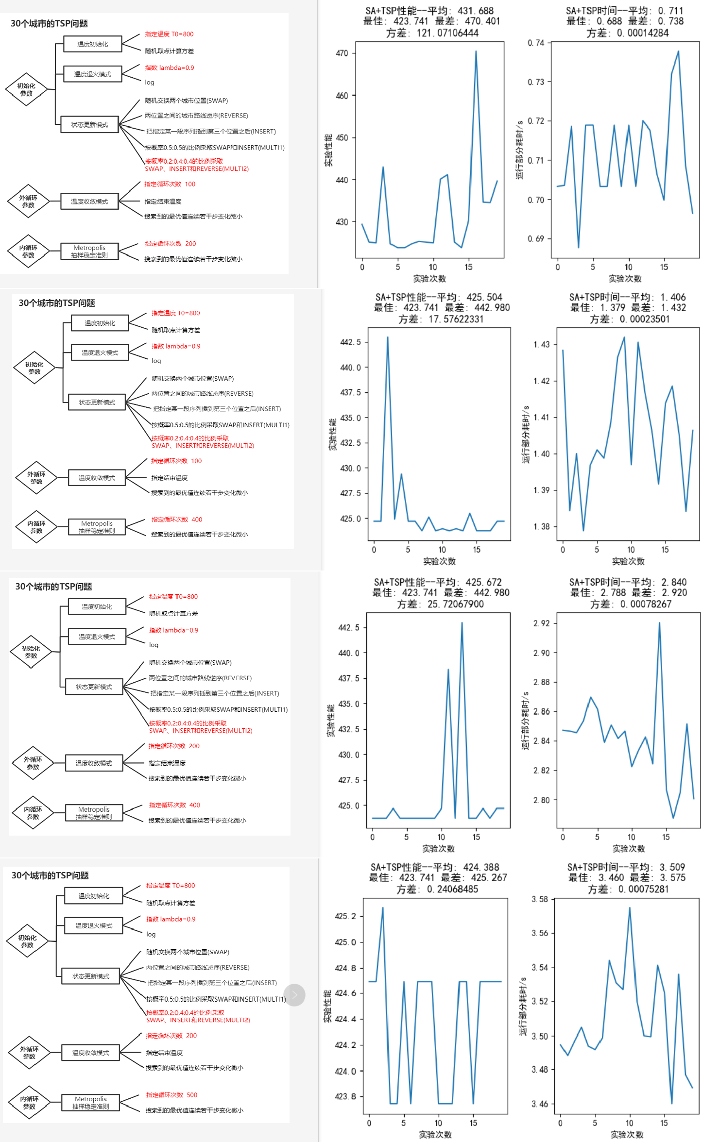 算法流程与上文基本类似,不同之处在于:步骤 1 中,初始温度可以有两种生成方式:按照经验设定固定初温要更大,随机选择指定数量计算方差时指定的元素数目也大得多;初始解在离散的 TSP 问题中为旅行商所经城市的路线。步骤 4 为状态更新,在 TSP 问题中,可以通过进行两位置元素交换、两位置之间的元素逆序、把指定某一段序列插到第三个位置之后或者把上述操作按照概率混合的方法产生新的状态, 即新的旅行商路线。