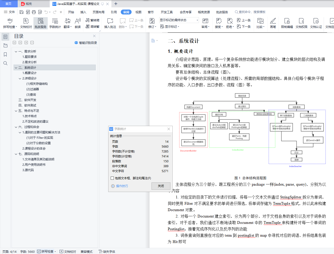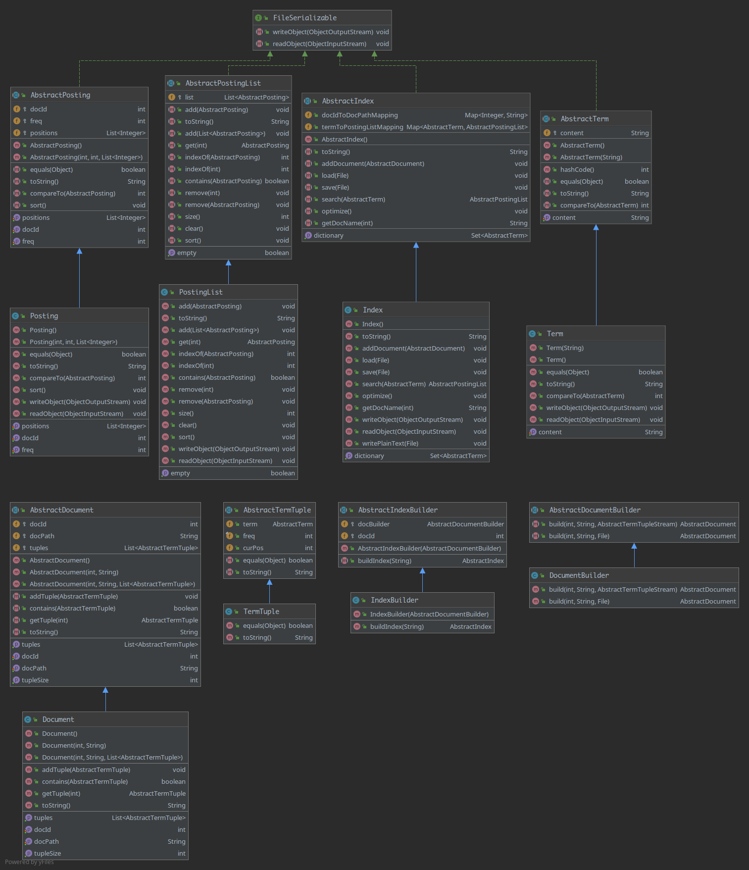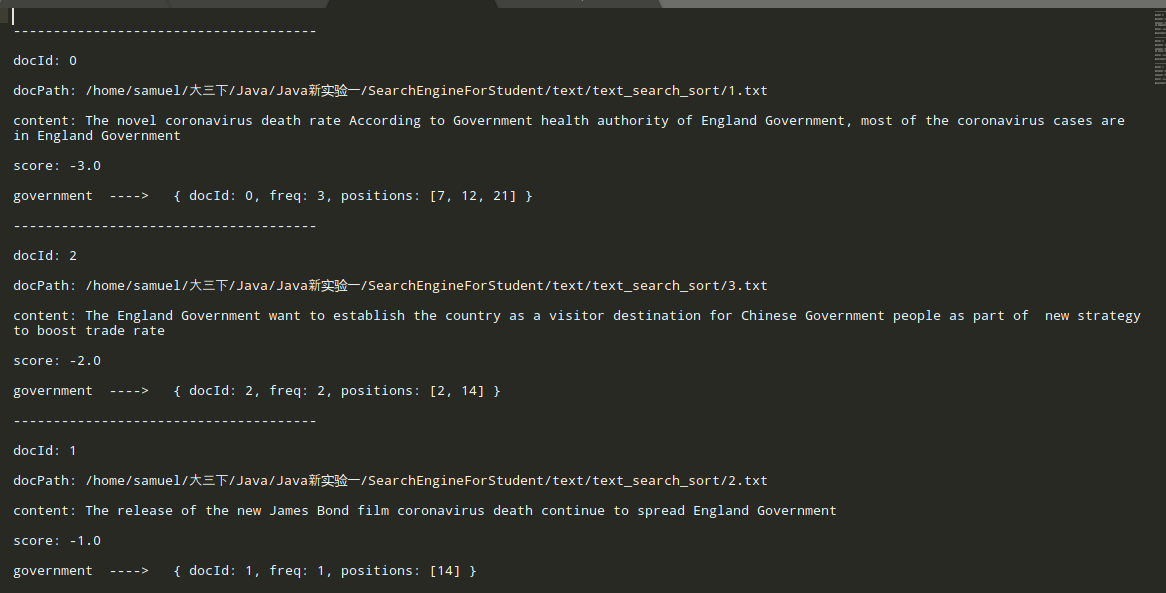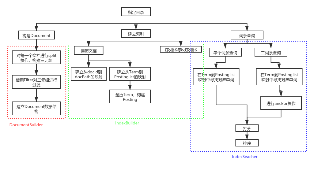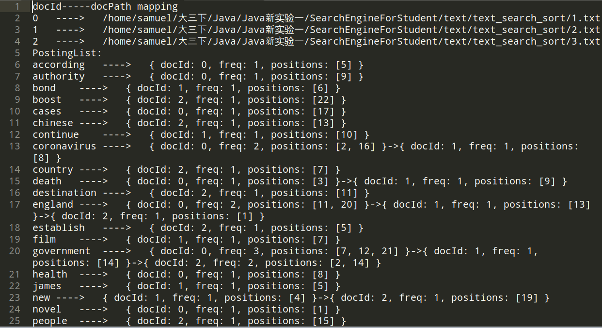 目录一、 需求分析 - 0 -1. 题目要求 - 0 -2. 需求分析 - 1 -二、 系统设计 - 2 -1. 概要设计 - 2 -2. 详细设计 - 3 -(1) 相关存储结构 - 3 -(2) 过滤器 - 5 -(3) 查询 - 6 -三、 软件开发 - 8 -四、 软件测试 - 8 -五、 特点与不足 - 9 -1. 技术特点 - 9 -2. 不足和改进的建议 - 10 -六、 过程和体会 - 10 -1. 遇到的主要问题和解决方法 - 10 -(1) 对于Filter的实现 - 10 -(2) 对于分数的设置 - 10 -2. 课程设计的体会 - 10 -七、 源码和说明 - 10 -1. 文件清单及其功能说明 - 10 -2. 用户使用说明书 - 11 -3. 源代码 - 11 -一、需求分析1.题目要求实现一个基于内存的英文全文检索搜索引擎,需要完成以下功能:功能1:将指定目录下的一批.txt格式的文本文件扫描并在内存里建立倒排索引,这里面包含必须的子功能包括:(1)读取文本文件的内容;(2)将内容切分成一个个的单词;(3)过滤掉其中一些不需要的单词,例如数字、停用词(the, is and这样的单词)、过短或过长的单词(例如长度小于3或长度大于20的单词);(4)利用Java的集合类在内存里建立过滤后剩下单词的倒排索引;(5)内存里建立好的索引对象可以序列化到文件,同时可以从文件里反序列化成内存里的索引对象;(6)可以在控制台输出索引的内容。功能2:基于构建好的索引,实现单个搜索关键词的全文检索,包含的子功能包括:(1)根据搜索关键词得到命中的结果集合;(2)可以计算每个命中的文档的得分,并根据文档得分对结果集排序;(3)在控制台显示命中的文档的详细信息,如文档的路径、文档内容、命中的关键词信息(如在文档里出现次数)、文档得分;功能3:基于构建好的索引,实现二个搜索关键词的全文检索。包含的子功能包括:(1)支持这二个关键词的与或查询。与关系必须返回同时包含这二个单词的文档集合,或关系返回包含这二个单词中的任何一个的文档集合;(2)可以计算每个命中的文档的得分,并根据文档得分对结果集排序;(3)在控制台显示命中的文档的详细信息,如文档的路径、文档内容、命中的关键词信息(如在文档里出现次数)、文档得分;功能4:基于构建好的索引,实现包含二个单词的短语检索,即这二个单词必须在作为短语文档里出现,它们的位置必须是相邻的。这个功能为进阶功能。除了以上功能上的要求外,其他要求包括:(1)针对搜索引擎的倒排索引结构,已经定义好了创建索引和全文检索所需要的抽象类和接口。学生必须继承这些预定义的抽象类和和实现预定义接口来完成实验的功能,不能修改抽象类和接口里规定好的数据成员、抽象方法;也不能在预定义抽象类和接口里添加自己新的数据成员和方法。但是实现自己的子类和接口实现类则不作任何限定。(2)自己实现的抽象类子类和接口实现类里的关键代码必须加上注释,其中每个类、每个类里的公有方法要加上Javadoc注释,并自动生成Java API文档作为实验报告附件提交。(3)使用统一的测试文档集合、统一的搜索测试案例对代码进行功能测试,构建好的索引和基于统一的搜索测试案例的检索结果最后输出到文本文件里作为实验报告附件提交。(4)本实验只需要基于控制台实现,实验报告里需要提供运行时控制台输出截屏。关于搜索引擎的倒排索引结构、相关的抽象类、接口定义、还有相关已经实现好的工具类会在单独的PPT文档里详细说明。同时也为学生提供了预定义抽象类和接口的Java API文档和UML模型图。