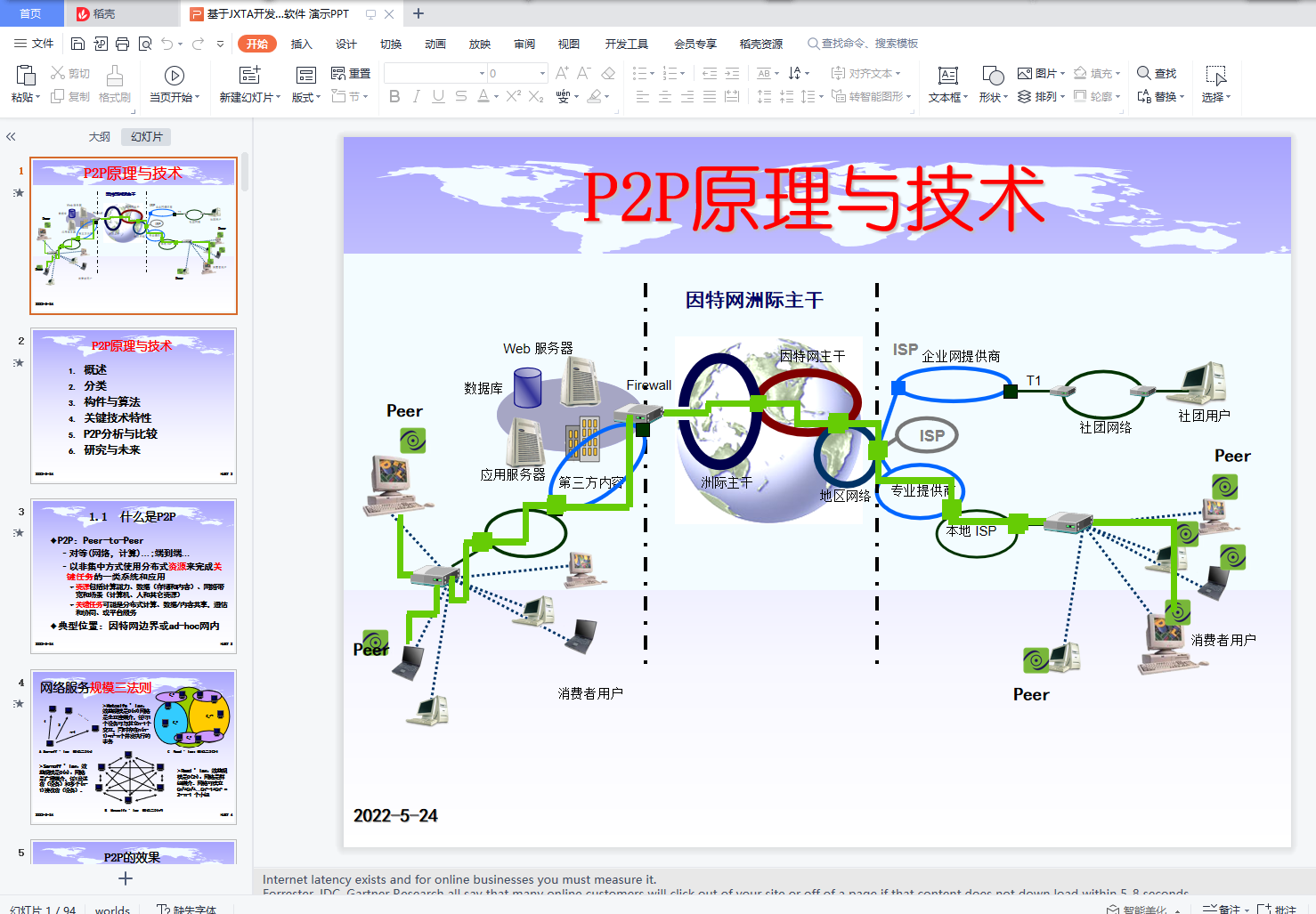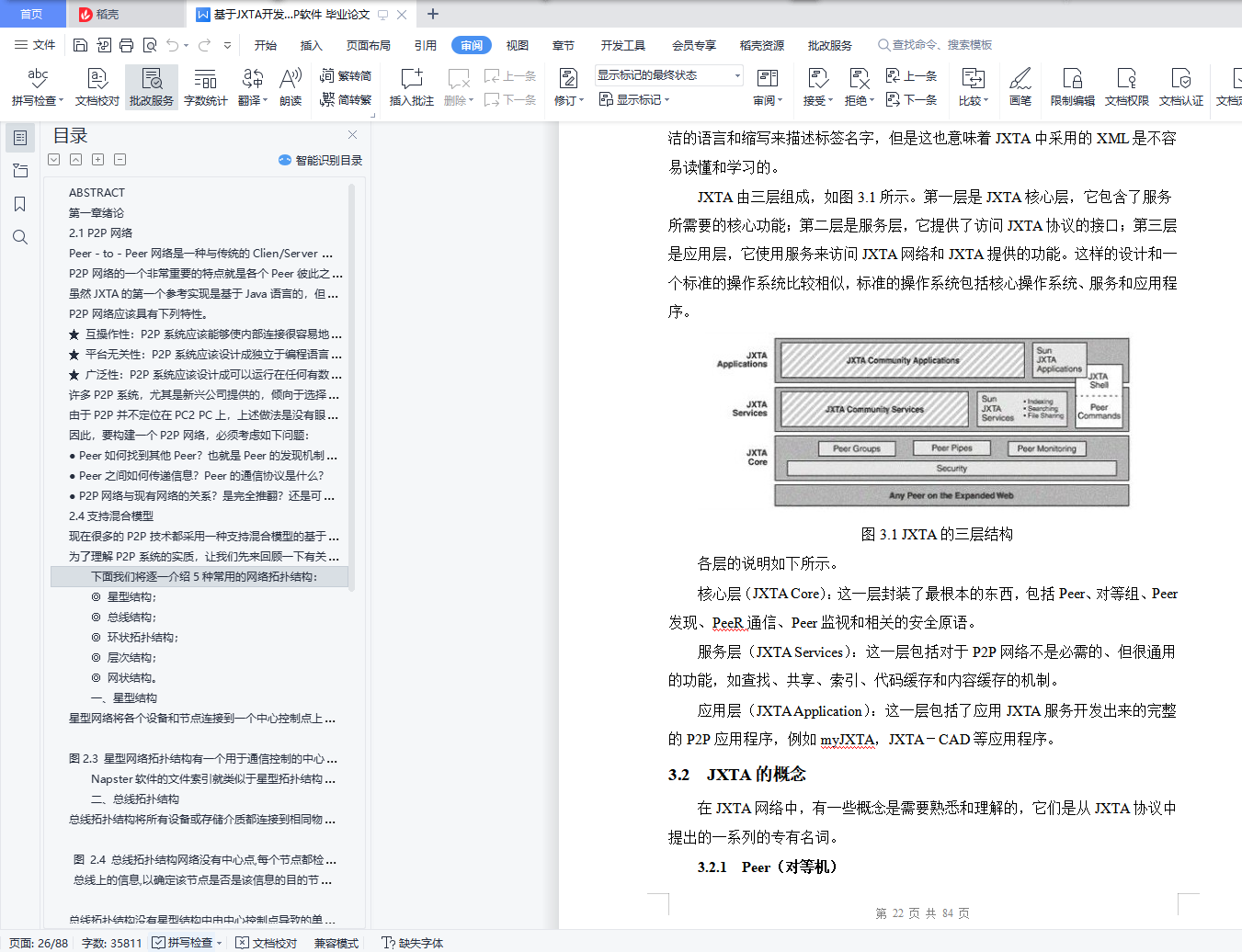 摘要Peer-to-Peer网络毫无疑问是当今的热点技术主题。Napster和Gnutella的广泛使用证明了peer-to-peer应用的强大潜力。P2P(或者说peer-to-peer)网络是一种基于操作上下文的网络模型,任何一个节点都同时作为客户机和服务器。JXTA致力于为P2P应用提供一个P2P平台基础。其中包括一系列独立于语言,平台和网络技术之外的协议。这些协议解决了P2P应用的基本需求。协议的设计目标是简单并且低成本。本论文设计探讨了P2P网络的结构和JXTA的基本知识,并利用JXTA开发出一个组内聊天和共享文件的软件。关键词: P2P,Peer,PeerGroup,Advertisment,XML,JXTA,CMSABSTRACTPeer-to-Peer (P2P) network is a hot topic in technology in recent years. The wide use of Napster and Gnutella demonstrated the powerful potential in application of P2P. The P2P network is a model of network which based on the environment of operation, and each node can work as client and serve at the same time. JXTA offers a basic platform for the application of P2P. And it includes a series of treaties which independence from languages, platform and technique of network. These treaties can meet the basic requirement of the application of P2P。The aim of these treaties is compact and the cost must be low. This article has discussed the structure of P2P network and the basic knowledge of JXTA, and developed a software for chat and share documents in a group from JXTA technique.Key words: P2P,Peer,PeerGroup,Advertisment,XML,JXTA,CMS目 录第一章 绪论-------------------------------------------------------------------------------------11.1 P2P发展简史------------------------------------------------------------------------11.2 P2P应用程序的用武之地 ---------------------------------------------------------41.3 P2P技术的动力 -------------------------------------------------------------------5第二章 P2P体系结构---------------------------------------------------------------------62.1 P2P网络------------------------------------------------------------------------------72.2 P2P如何形成动态网络-------------------------------------------------------------92.3 节点自制-----------------------------------------------------------------------------142.4 支持混合模型-----------------------------------------------------------------------15第三章 JXTA技术----------------------------------------------------------------------------203.1 JXTA是什么------------------------------------------------------------------------203.2 JXTA的概念------------------------------------------------------------------------223.2.1 Peer(对等机)---------------------------------------------------------------223.2.2 Peer Group(对等组)-------------------------------------------------------233.2.3 Endpoint(端点)-------------------------------------------------------------233.2.4 Pipe(管道)------------------------------------------------------------------243.2.5 Advertisement(广告)------------------------------------------------------253.2.6 Message(消息)-------------------------------------------------------------263.2.7 Rendezvous Peer(集合点)-----------------------------------------------263.2.8 Router Peer(路由Peer)-------------------------------------------------283.29 Gateway Peer(网关Peer)--------------------------------------------------283.3 用于通信的Peer-------------------------------------------------------------------293.3.1 防火墙------------------------------------------------------------------------293.3.2 NAT(网络地址转换)------------------------------------------------------293.3.3 代理服务器------------------------------------------------------------------303.3.4 DHCP(动态IP分配)-----------------------------------------------------303.3.5 网络的不稳定---------------------------------------------------------------313.3.6 网关问题---------------------------------------------------------------------313.4 Peer和对等组----------------------------------------------------------------------323.4.1 Peer和用户的关系---------------------------------------------------------323.4.2 对等组的必要性------------------------------------------------------------323.4.3 JXTA应用程序与对等组-------------------------------------------------343.4.4 对等组的成员资格---------------------------------------------------------343.4.5 对等组的服务---------------------------------------------------------------353.5 广告(Advertisement)-------------------------------------------------------------373.5.1 广告的类型------------------------------------------------------------------373.5.2 模块(Module)广告-------------------------------------------------------413.5.3 管道广告---------------------------------------------------------------------513.5.4 端点路由消息---------------------------------------------------------------523.5.5 消息(Message)----------------------------------------------------------533.6 JXTA Content Manage Service(CMS)------------------------- -------------------543.6.1 CMS概述--------------------------------------------------------------------543.6.2 CMS简单搜索-----------------------------------------------------------55