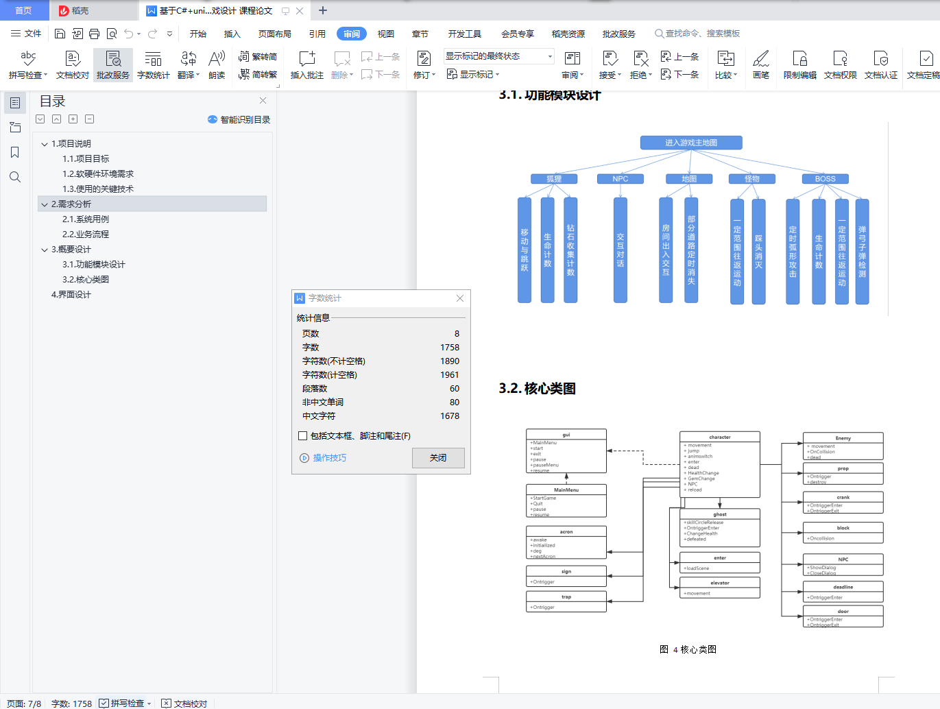 目录1. 项目说明 11.1. 项目目标 11.2. 软硬件环境需求 21.3. 使用的关键技术 22. 需求分析 22.1. 系统用例 22.2. 业务流程 33. 概要设计 43.1. 功能模块设计 43.2. 核心类图 54. 界面设计 5选题--- 2D跑酷闯关对战游戏选题动机:因为本学期学习的语言主要是C#,而unity主要是与C#语言结合密切,脚本语言均为C#,所以小组成员计划借助本次课程项目设计机会制作一次游戏,而在小组讨论之后,决定选择以马里奥为代表的经典横版闯关游戏,其游戏制作难度适宜小组成员当前水平,同时可以学习unity2D引擎,将其与本学期所学的C#语言相结合,制作出一个拥有简单跑酷关卡并加入对战元素的单人休闲娱乐游戏。功能设计:本2D横版闯关游戏以狐狸为主角,玩家需要操纵角色进行左右移动以及跳跃,借助NPC同伴的信息提示,充分利用地图机关,躲过障碍物以及怪物,收集钻石并利用弹弓武器战胜终点位置的特殊怪物即可获得胜利。具体的功能实现主要包括下面几个部分:1.Main Camera的设置(包括主照相机的背景色以及大小位置等)2.各种障碍物的物理碰撞3.主人公狐狸运动的动画状态机以及脚本4.钻石的碰撞提示与收集计数5.不同道具盒(用于产生道具或者某些怪物)的设置6.敌人的动画状态机以及脚本7.主人公狐狸与敌人碰撞时敌人消失以及提示(动画曲线)8.背景的加载(云朵,灌木丛等)