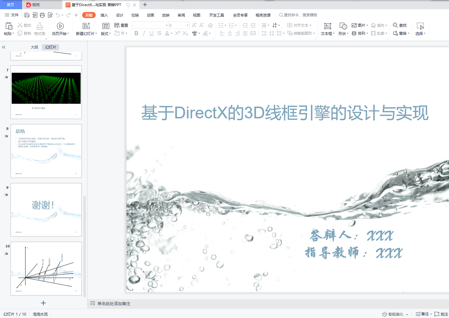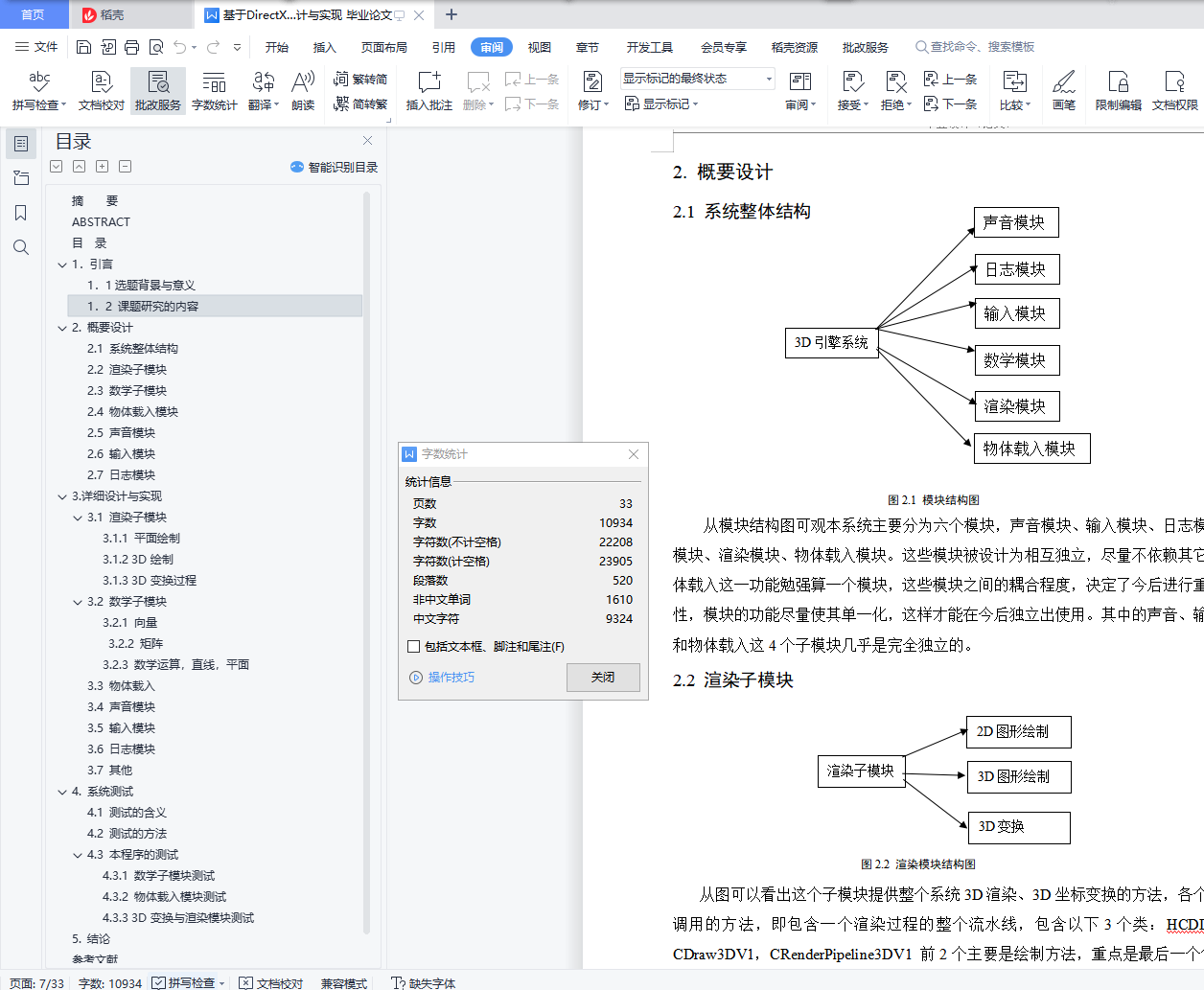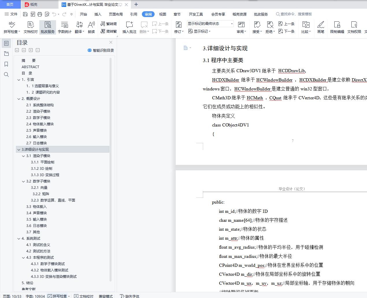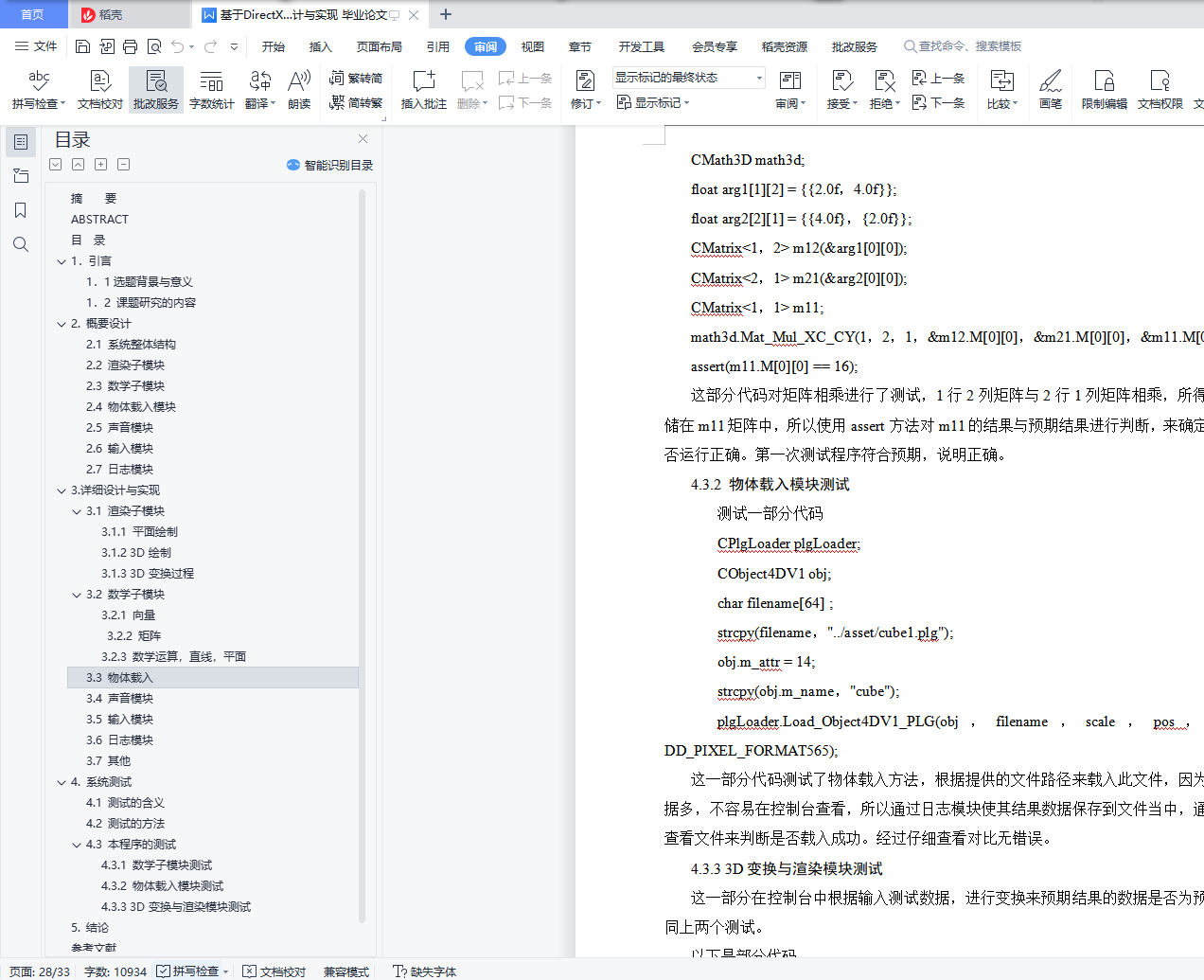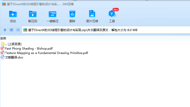 基于DirectX的3D线框引擎的设计与实现摘 要本课题应用面向对象的设计方法,开发一个简单的实时渲染的依赖于DirectX9.0的图形引擎框架结构。使用面向对象的方法,抽象出三个主要的子模块:数学模块,核心模块,渲染模块。数学模块提供的是整个框架中要用到的几何图形数据结构和常用计算、线性代数计算方法和变换方法。核心系统是整个框架的核心,消息处理,当前帧的渲染都在此模块的功能,它负责调节,用来维护其它子模块的,但它多是函数组成。渲染模块提供了常用渲染方式的方法,简单的裁剪和光照处理。图形的绘制主要会调用DirectX9.0的API来绘制基本的图形。而DirectX9.0基本在windows下,所以本系统在windows下进行开发设计。关键词3D引擎结构;渲染;3D变换;Design and Implementation of 3D wireframe engine based on DirectXABSTRACTthe application used object-oriented design methods to development of a simple real-time the framework of DirectX9.0 graphics engine .Using the object-oriented approach, abstracting three main sub-modules: math module, core module, rendered module. The math module contained the entire framework geometry data structure and used in the calculation, linear algebra calculation method and conversion method. The core system is the core of the framework, message processing, the current frame rendering features in this module, which is responsible for regulating and maintenance sub-module,and composed of multiple function. Rendering module provides a common rendering method, a simple cut-and-light treatment. The graphics rendering call DirectX9.0 API to draw basic graphics. DirectX9.0 depend on the windows system, so this system development and designed in the Windows platform.KEY WORDS 3D engine; rendering; 3D conversion;目 录摘 要 IABSTRACT II目 录 11.引言 31.1选题背景与意义 31.2 课题研究的内容 32. 概要设计 42.1 系统整体结构 42.2 渲染子模块 42.3 数学子模块 52.4 物体载入模块 62.5 声音模块 62.6 输入模块 72.7 日志模块 73.详细设计与实现 83.1 渲染子模块 113.1.1 平面绘制 113.1.2 3D绘制 113.1.3 3D变换过程 113.2 数学子模块 143.2.1 向量 143.2.2 矩阵 153.2.3 数学运算,直线,平面 163.3 物体载入 173.4 声音模块 183.5 输入模块 193.6 日志模块 193.7 其他 204. 系统测试 214.1 测试的含义 214.2 测试的方法 214.3 本程序的测试 214.3.1 数学子模块测试 214.3.2 物体载入模块测试 225. 结论 24参考文献 24致谢 25