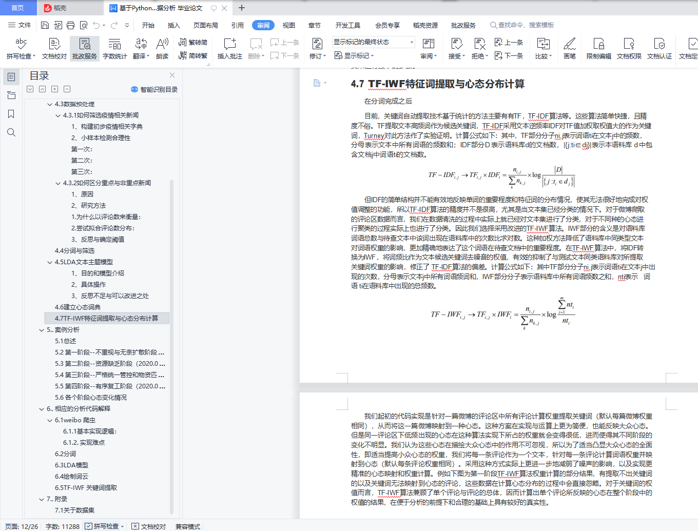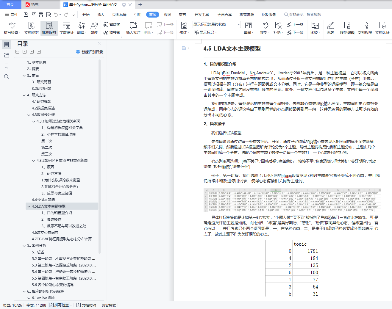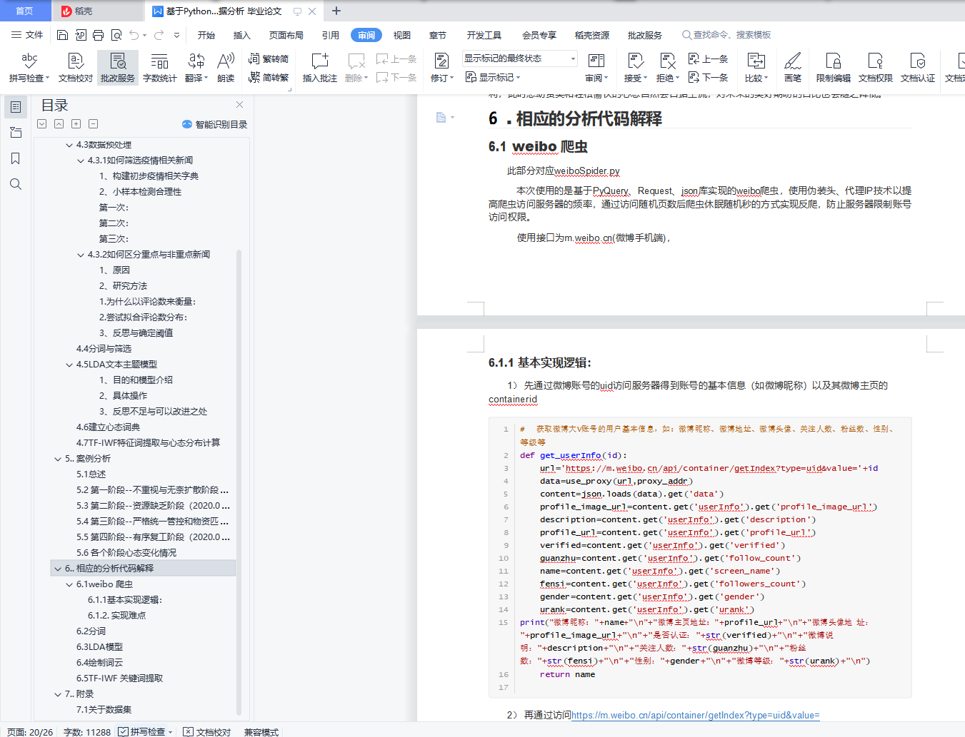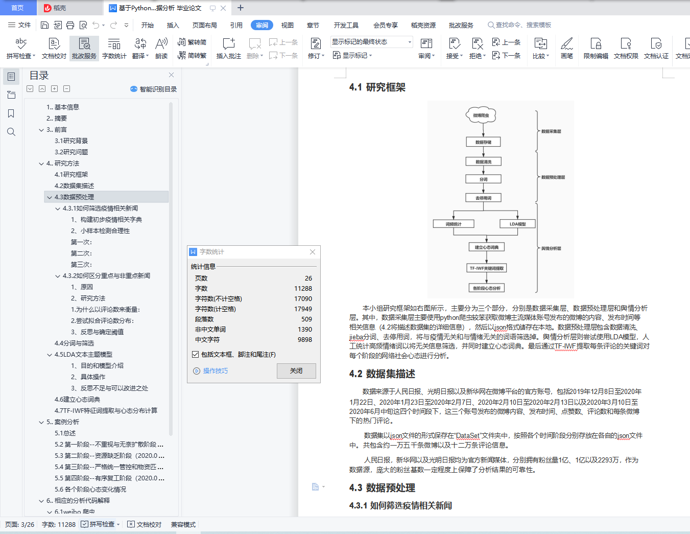 COVID-19背景下的网络社会心态目录1. . 基本信息 12. . 摘要 13. . 前言 13.1 研究背景 23.2 研究问题 24. . 研究方法 24.1 研究框架 34.2 数据集描述 34.3 数据预处理 34.4 分词与筛选 94.5 LDA文本主题模型 104.6 建立心态词典 134.7 TF-IWF特征词提取与心态分布计算 145. . 案例分析 155.1 总述 155.2 第一阶段--不重视与无奈扩散阶段(2019.12.08-2020.01.22) 155.3 第二阶段--资源缺乏阶段(2020.01.23-2020.02.07) 165.4 第三阶段--严格统一管控和物资匹配阶段(2020.02.10- 2020.02.13) 165.5 第四阶段--有序复工阶段(2020.03.10-2020.06中旬) 175.6 各个阶段心态变化情况 176. . 相应的分析代码解释 246.1 weibo 爬虫 246.2 分词 276.3 LDA模型 286.4 绘制词云 286.5 TF-IWF 关键词提取 287. . 附录 297.1 关于数据集 291.. 基本信息2.. 摘要为了研究新冠肺炎疫情下的大众心态,本小组使用Python作为主要研究工具,采用了爬虫来进行数据的爬取,分布拟合来筛选数据,LDA模型以及频数分布来心态聚类,TF-IWF算法提取关键词来描绘心态分布,