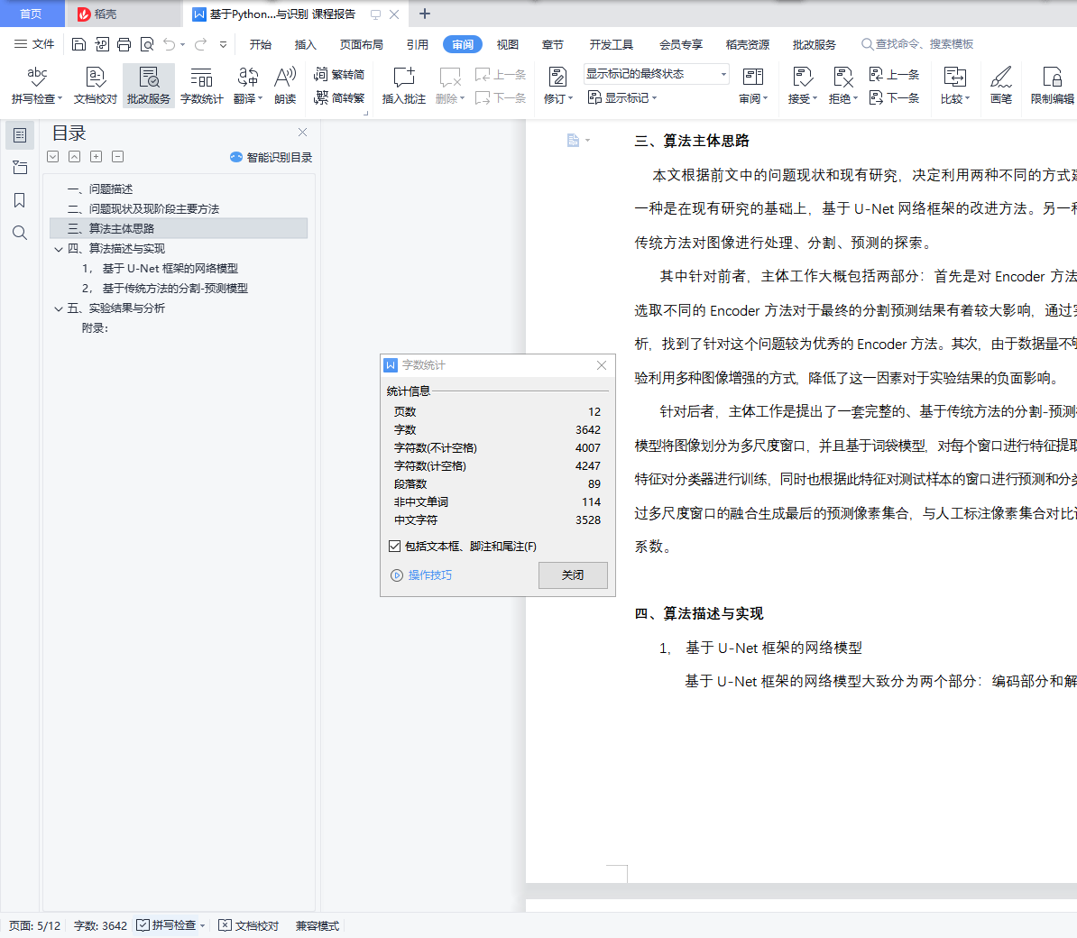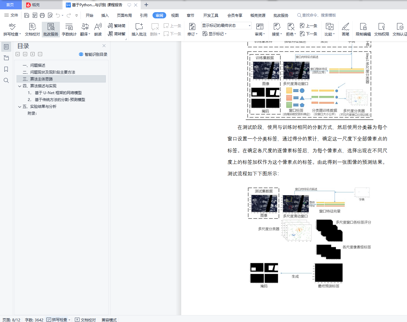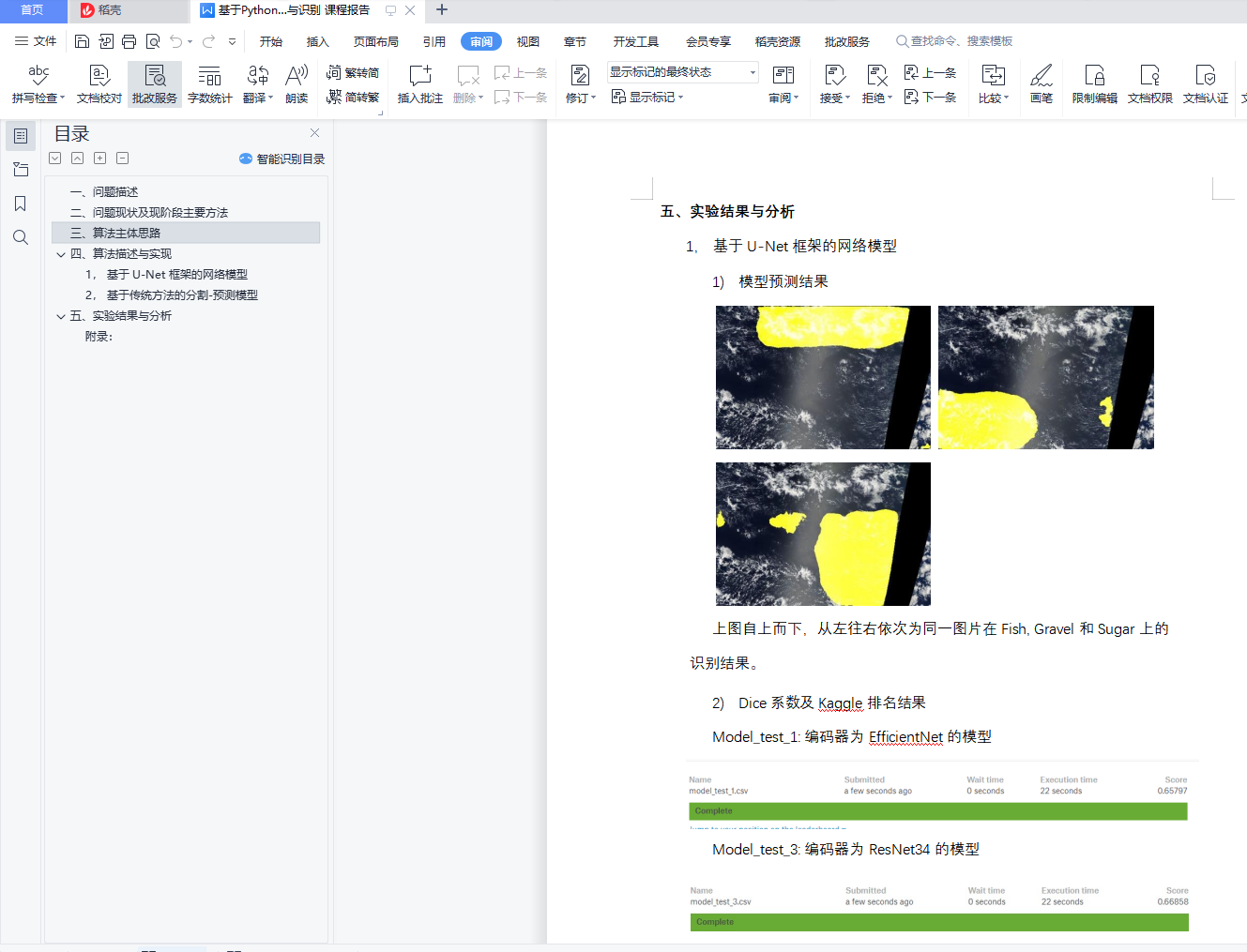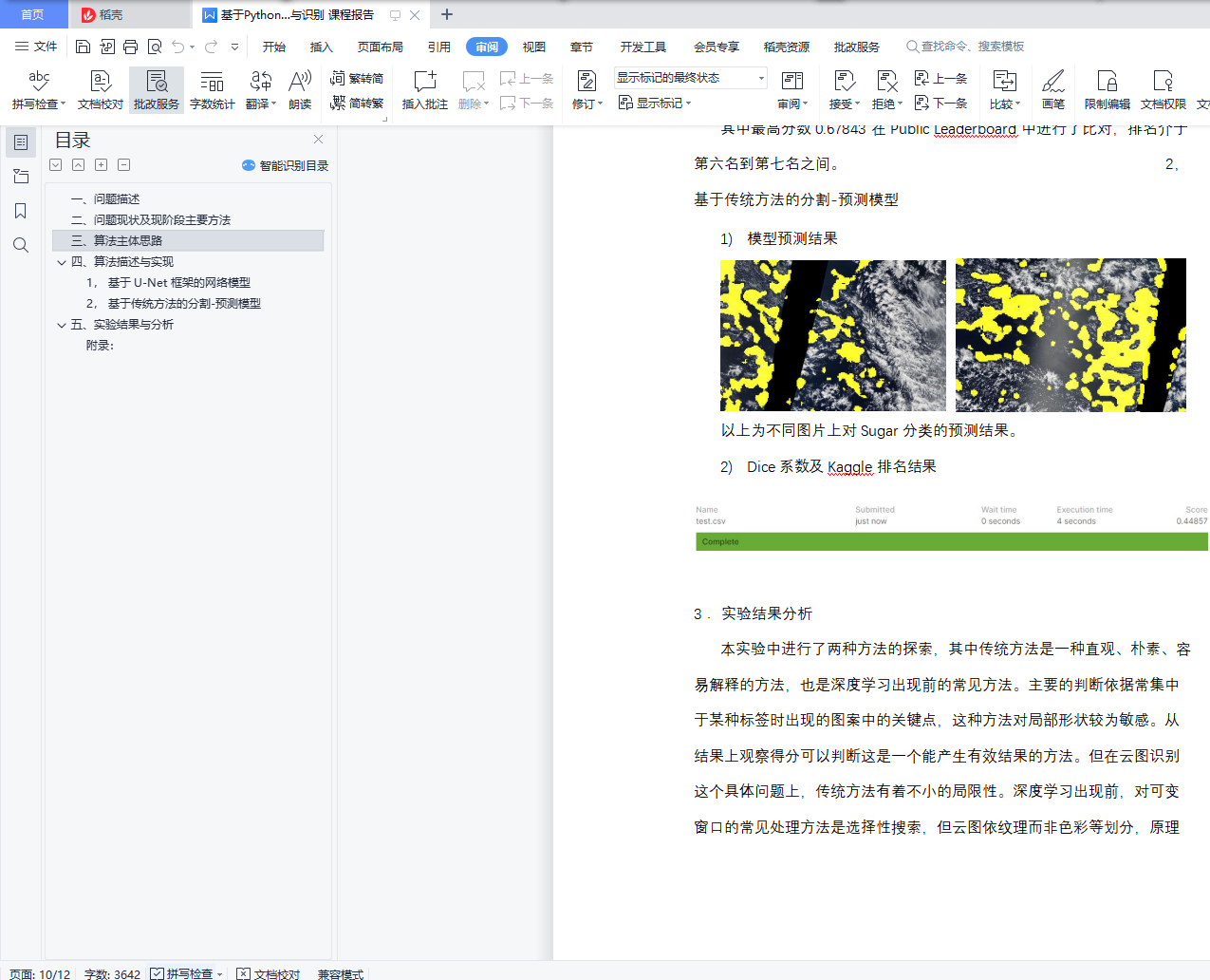 目录一、问题描述 1二、问题现状及现阶段主要方法 3三、算法主体思路 4四、算法描述与实现 41, 基于 U-Net 框架的网络模型 42, 基于传统方法的分割-预测模型 6五、实验结果与分析 8附录: 11一、问题描述在分析地球的气候时,浅云起着巨大的作用。它们也很难理解,无法在气候模型中表示。本次实验的目标是改善对卫星云层图像的理解,从而帮助建立更优秀可靠的气候模型。云可以通过多种方式进行组织,但是不同组织形式之间的分界线是极其模糊的。这使得构建传统的基于规则的算法来分离不同种类的云具有很大的挑战性。本次实验中,数据图像来自于 NASA Worldview,是两颗极地轨道卫星 TERRA 和 AQUA 拍摄的,由于这些卫星上成像器较小,因此两轨道卫星的图像可能会缝合在一起,在缝合时会有一些不可见部分,这部分标记为黑色。下面是一幅卫星云层图像的示例:图像集中所有的图像都标有标签,这些标签是在德国汉堡的马克斯-普朗克气象研究所和法国巴黎动力实验室创建的。由 68 位科学家组成的团队在每帧图像中识别出具有特定类型的云层区域,其中云层包含以下四种类别: