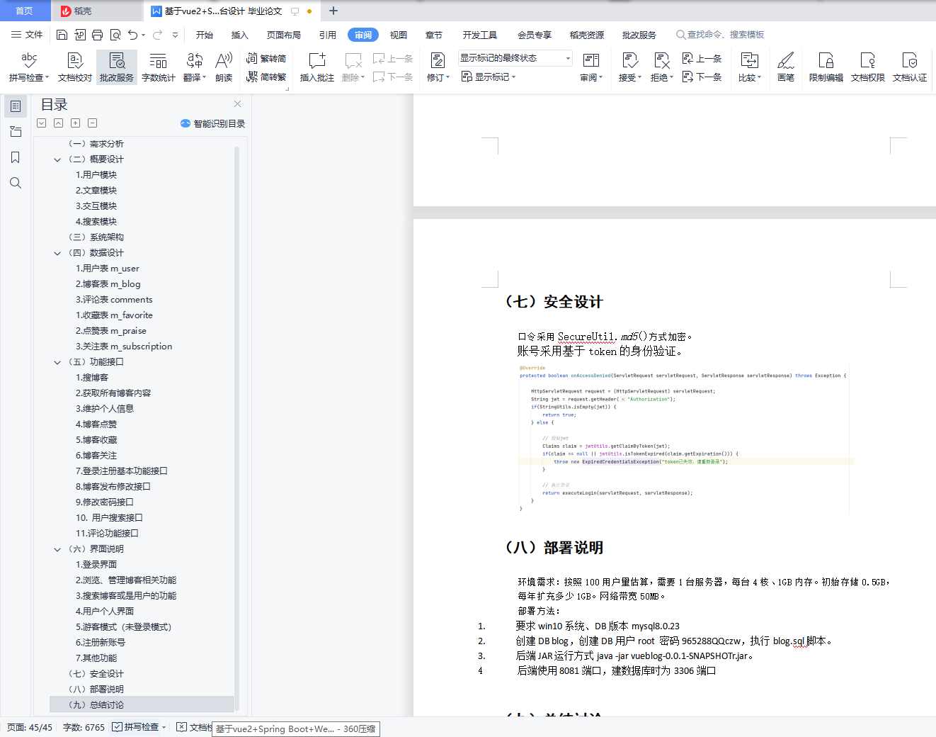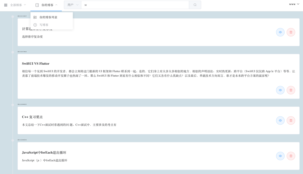 题目:多人博客平台目的:熟练掌握和灵活应用网站的规划设计方面的理论知识和技能,规划和设计两个网站,使设计的网站能够对网页布局有充分的掌控能力,合理的选择颜色、字体、分辨率以及图片、声音、动画等多媒体元素,能最终实现网站的前端设计目标。熟练掌握和灵活应用后端技术,使用spring boot实现与前端的数据交互,实现对数据库的访问。硬件环境: PC/Mac,八核、64GB内存软件环境:操作系统:(Win/Mac)开发工具:(IDEA、VSCode)数据服务:(MySql-8)应用服务:(Tomcat)输出成果:202099123456_张三_实验1报告.docx202099123456_张三_实验1.zip,内容包括:/demo_fe.zip 前端源码(名称不限。不要node_modules)/demo_be.zip 后端源码(不要带out、JDK、Tomcat等)demo_be.jar 后端产物(用SpringBoot的话输出成JAR,自带Tomcat。传统架构可输出WAR包)demo_fe_dist.zip 前端产物(也可集成到后端,做成一个包)init.sql DB初始化脚本(建表结构、初始数据等)项目说明:项目客户为软件学院,工期为三周天,计划投入4人21天/8工时。项目组共有4人,分工如下::负责前端。:负责前端。:负责一部分功能的后端开发、数据库设计。:负责一部分功能的后端开发、数据库设计。目录(一) 需求分析 2(二) 概要设计 31. 用户模块 42. 文章模块 43. 交互模块 44. 搜索模块 4(三) 系统架构 6(四) 数据设计 61. 用户表m_user 62. 博客表m_blog 63. 评论表comments 61. 收藏表m_favorite 72. 点赞表m_praise 73. 关注表m_subscription 8(五) 功能接口 81. 搜博客 82. 获取所有博客内容 93. 维护个人信息 104. 博客点赞 105. 博客收藏 136. 博客关注 137. 登录注册基本功能接口 148. 博客发布修改接口 159. 修改密码接口 1510. 用户搜索接口 1611. 评论功能接口 18(六) 界面说明 201. 登录界面 202. 浏览、管理博客相关功能 223. 搜索博客或是用户的功能 314. 用户个人界面 335. 游客模式(未登录模式) 376. 注册新账号 417. 其他功能 45(七) 安全设计 46(八) 部署说明 46(九) 总结讨论 46