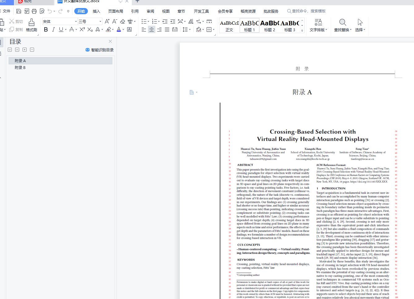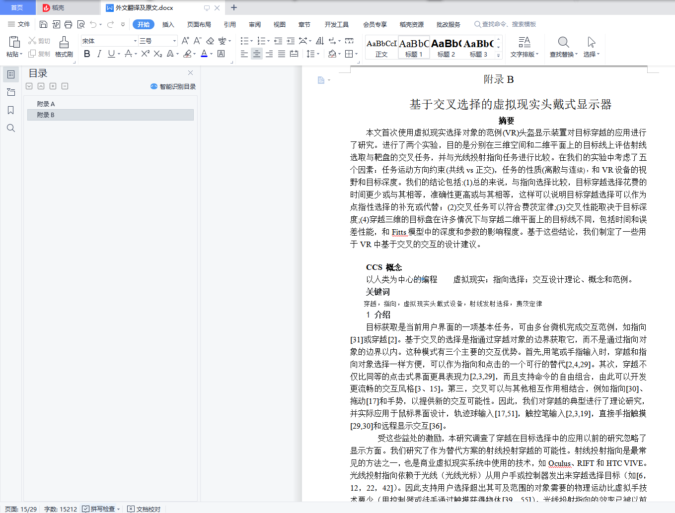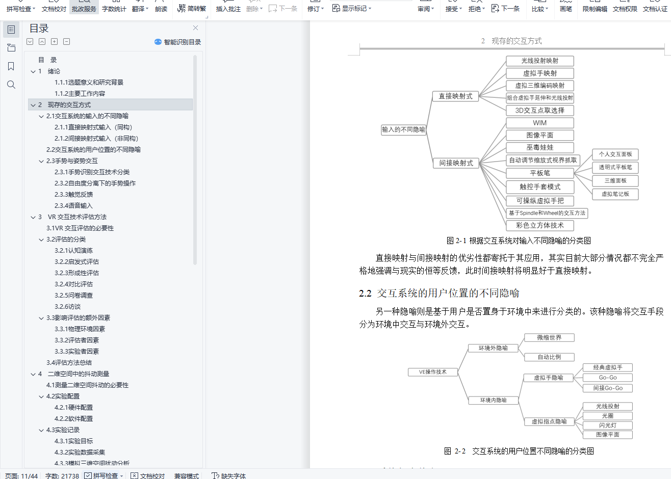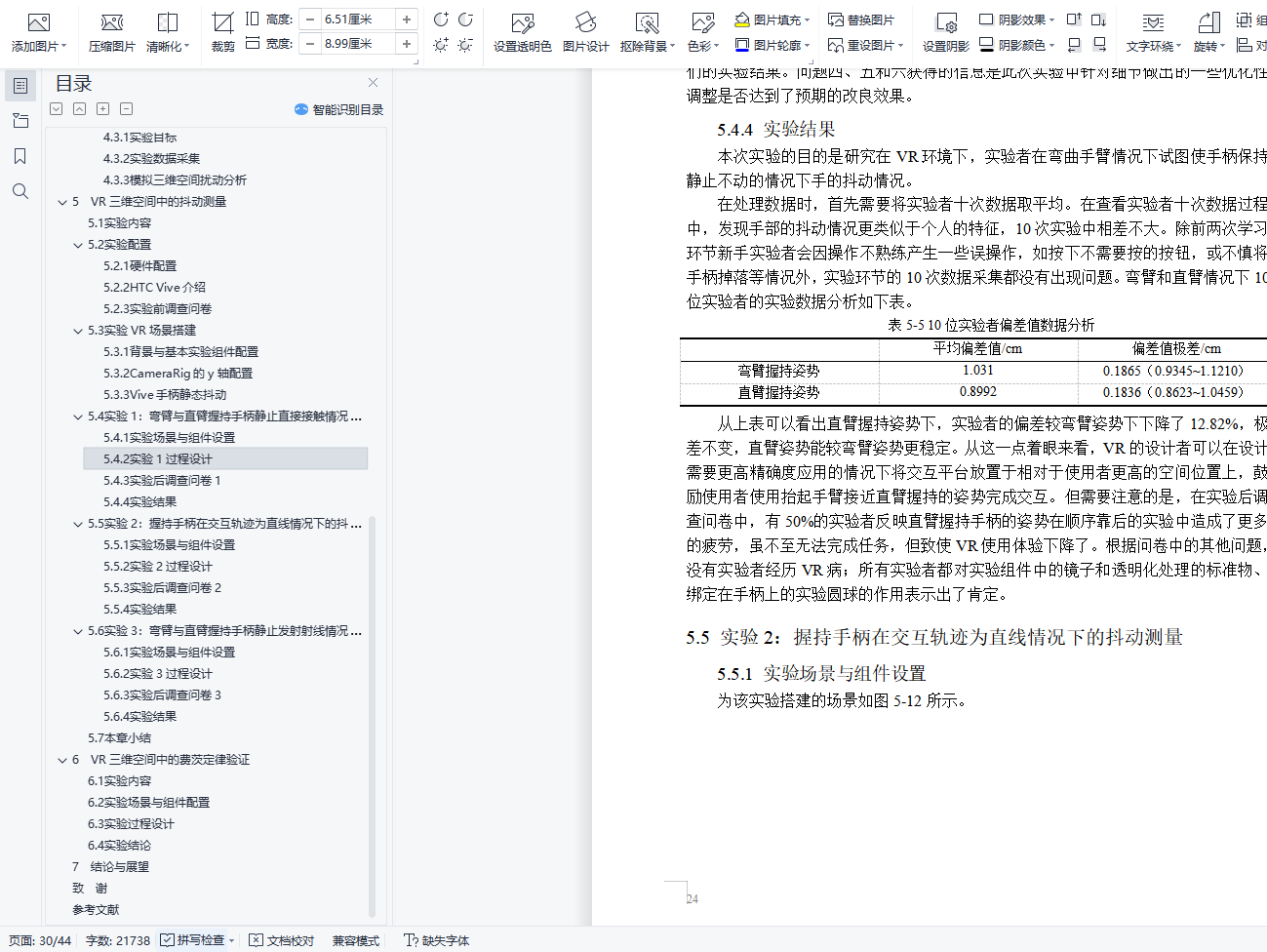 摘 要新世纪开始后,上个世纪研究虚拟现实(Virtual Reality,VR)的浪潮并没有消失,反而愈发蓬勃发展。但随着VR技术的更新,三维空间中的抖动扩大化问题也越来越不可忽视。抖动,是抖动是在操作过程中由于器械或人力因素导致的操作误差,会造成操作精度的下降。二维空间中也同样存在着抖动问题,但三维空间会将已存的抖动进一步扩大,造成使用者人机交互(Human-Computer Intelligence,HCI)时的困扰。在此背景下,研究三维VR空间中的抖动问题是非常有意义的。现存的交互方式非常多,为明确主流的交互方式,本文于文内以分类的方式对它们做了综述,包括交互隐喻、手势交互、语音交互与触觉交互等,得出的结论是手柄类的交互方式仍占主流地位。它是人们在个人电脑上使用的鼠标键盘在VR中最合适的对应。因此,本文选择了HTC Vive这一成熟的主流硬件平台,搭配Steam VR引擎,进行了一系列实验以探究三维VR空间的抖动问题。鉴于本文以实验为最终落脚点,本文对优化实验的必要评估方法进行了综述与总结。本文首先在Matlab平台上采集了鼠标数据并进行了二维空间中的抖动分析,然后理论化地为二维抖动添加了第三维的小扰动,模拟了三维空间中的抖动情况,证明了三维空间中的抖动确实会相比二维空间中更大。然后,本文一共进行了三个实验,探究使用Steam VR引擎和HTC Vive的条件下三维抖动情况。注意到实验者握持手柄的姿势可能影响抖动大小,本文设置了弯臂与直臂两种握持手柄的姿势。第一个实验是三维VR空间中静止情况下的实验者弯臂和直臂握持手柄直接接触时手部抖动定量测量;第二个实验是三维VR空间中实验者自由握持手柄在进行直线型轨迹的情况下手部抖动定量测量;最后一个实验是三维VR空间中实验者弯臂和直臂握持手柄发射射线时的手部抖动定量测量。另外,本文还验证了费茨定律在三维VR空间中仍可成立。本文搭建了一个完整的VR室内场景,配以完整的物理引擎,可以让初次进行实验的实验者的沉浸感较好。本文进行的实验定量分析了实验者的手部抖动情况,可以为未来的VR开发者提供一些基于用户的误差数据,能一定程度上帮助他们更好地设计系统各数值。关 键 词:VR;人机交互;抖动测量;费茨定律;ABSTRACTSince the beginning of the new century, the tide of virtual reality (VR) research in the last century has not disappeared, but is growing vigorously. However, with the updating of VR technology, the problem of jitter enlargement in three-dimensional space can not be ignored. Jitter is the operation error caused by equipment or manpower factors in the operation process, which will result in the decline of operation accuracy. The problem of jitter also exists in two-dimensional space, but three-dimensional space will further expand the existing jitter, which will cause the user's human-computer interaction (HCI) problems. In this context, it is very meaningful to study the jitter problem in three-dimensional VR space.There are many ways of interaction. In order to clarify the mainstream way of interaction, after consulting the literature, this paper summarizes them in a categorized way, including interactive metaphor, gesture interaction, voice interaction and tactile interaction, and draws the conclusion that the handle type of interaction still occupies the mainstream position. It is the most appropriate corresponding of the mouse keyboard used in personal computers in VR. Therefore, this paper chooses HTC Vive, a mature mainstream hardware platform, with Steam VR engine, to carry out a series of experiments to explore the jitter problem of three-dimensional VR space. In view of the experiment as the final foothold, this paper summarizes and summarizes the necessary evaluation methods for optimizing the experiment.Firstly, we collect mouse data on the platform of Matlab and analyze the jitter in two-dimensional space. Then we theoretically add a small third-dimensional perturbation to the two-dimensional jitter and simulate the jitter in three-dimensional space. It proves that the jitter in three-dimensional space is indeed larger than that in two-dimensional space. Then, three experiments are conducted to investigate the three-dimensional jitter using Steam VR engine and HTC Vive. Noting that the posture of the experimenter holding the handle may affect the jitter size, two kinds of postures, bending arm and straight arm, were set up in this paper. The first experiment is the quantitative measurement of hand jitter when the experimenter's elbow and straight arm grip handle are in direct contact in three-dimensional VR space at rest; the second experiment is the quantitative measurement of hand jitter when the experimenter freely grips the handle in three-dimensional VR space under linear trajectory; and the last experiment is when the experimenter's elbow and straight arm grip handle emit rays in three-dimensional VR space. Quantitative measurement of hand jitter. In addition, Fitz's law can still be validated in three-dimensional VR space.In this paper, a complete VR indoor scene, coupled with a complete physical engine, can make the first experimenter feel better immersion. The experiment carried out in this paper quantitatively analyzed the hand jitter of the experimenters. It can provide some user-based error data for future VR developers, and help them better design the values of the system to a certain extent.KEY WORDS: VR; HCI; jitter measurement; Fitt’s Law目 录目 录 VIII1 绪论 11.1.1 选题意义和研究背景 11.1.2 主要工作内容 12 现存的交互方式 32.1 交互系统的输入的不同隐喻 32.1.1 直接映射式输入(同构) 32.1.2 间接映射式输入(非同构) 32.2 交互系统的