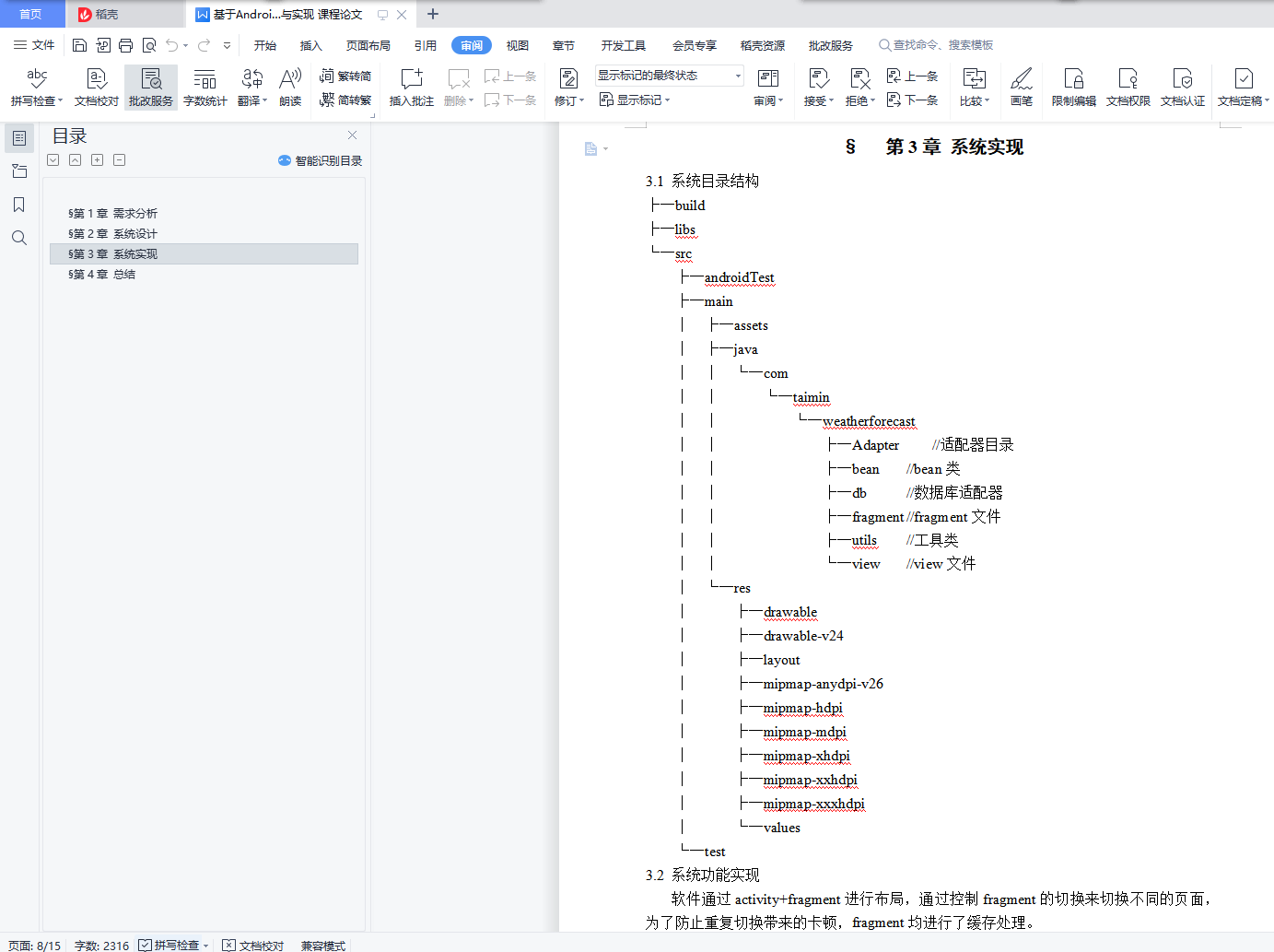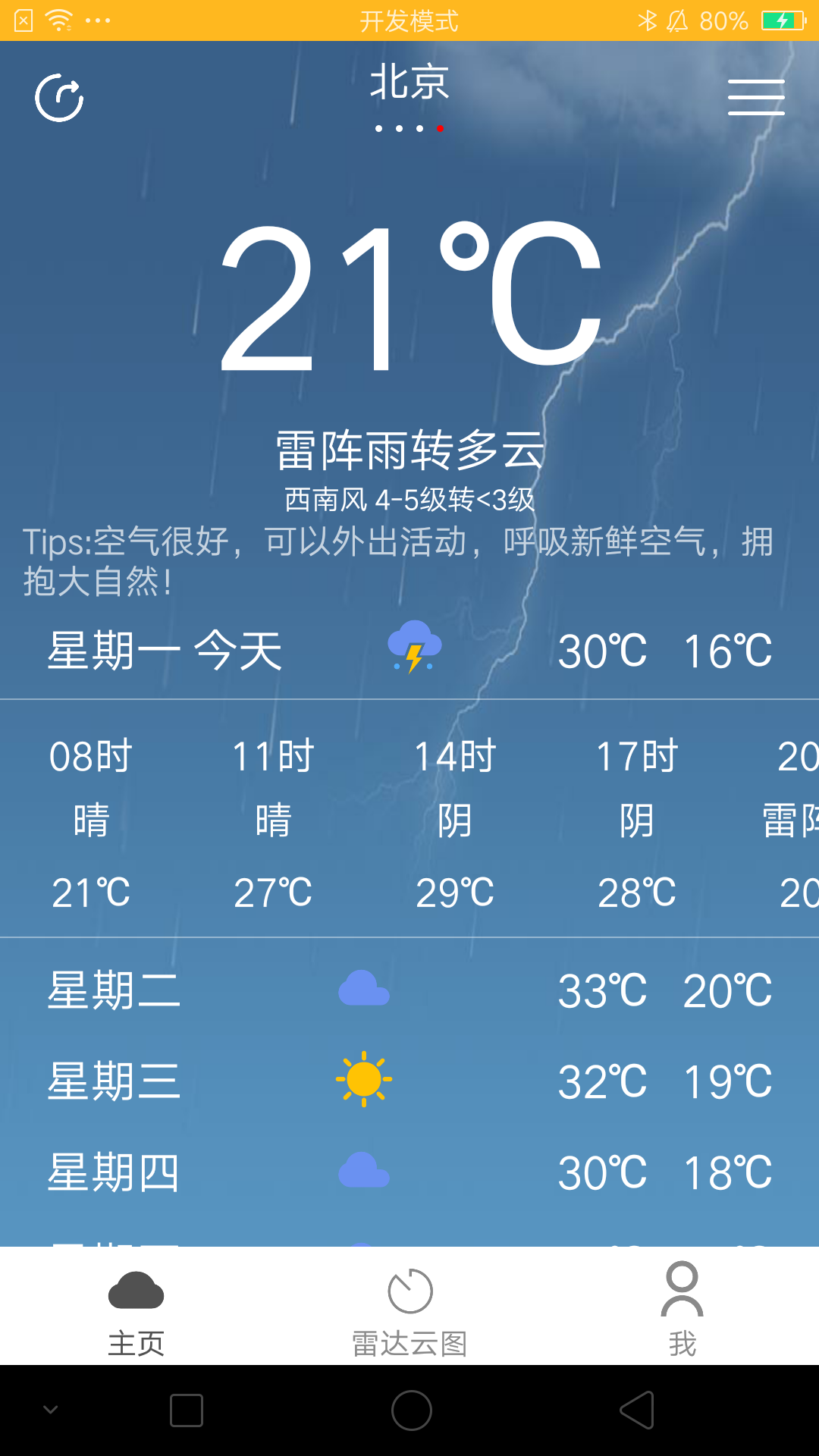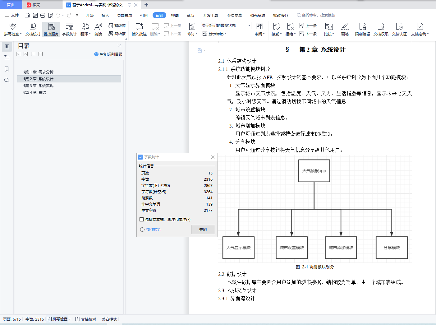 目录§ 第1章 需求分析 4§ 第2章 系统设计 5§ 第3章 系统实现 6§ 第4章 总结 7§第1章 需求分析1.1背景天气信息和人们的日常生活息息相关,随着人们活动范围的扩大和出行需要,天气预报已经成为人们生活不可缺少的一部分,在这样的市场需求的基础上,本人设计了天气预报软件,它可以提供天气相关信息和生活指数,用户可以通过软件及时获取近期的天气状况和变化,及时做好各方面的计划和防护措施。1.2需求总体介绍天气预报的用户主要是对获取天气信息有需求的人群,对于普通用户来说,主要了解当日的天气情况,选择相应的穿衣搭配和出行安排,对于相关行业人员来说,可根据未来天气状况制定相关措施,保证行业项目的顺利实施。因此天气预报的受众需要了解目前天气状况和未来的天气变化等,对其他的城市天气状况也会有所关注。1.3系统的功能性需求(1)自动定位当前位置,自动更新当前位置天气信息,也可查询不同城市的天气信息。(2)查询信息的结果主要包括温度、天气状况、风力、空气指数、生活指数等。(3)提供未来几天及小时天气状况并显示。(4)提供个人偏好设置,分享天气信息,关于本软件等。