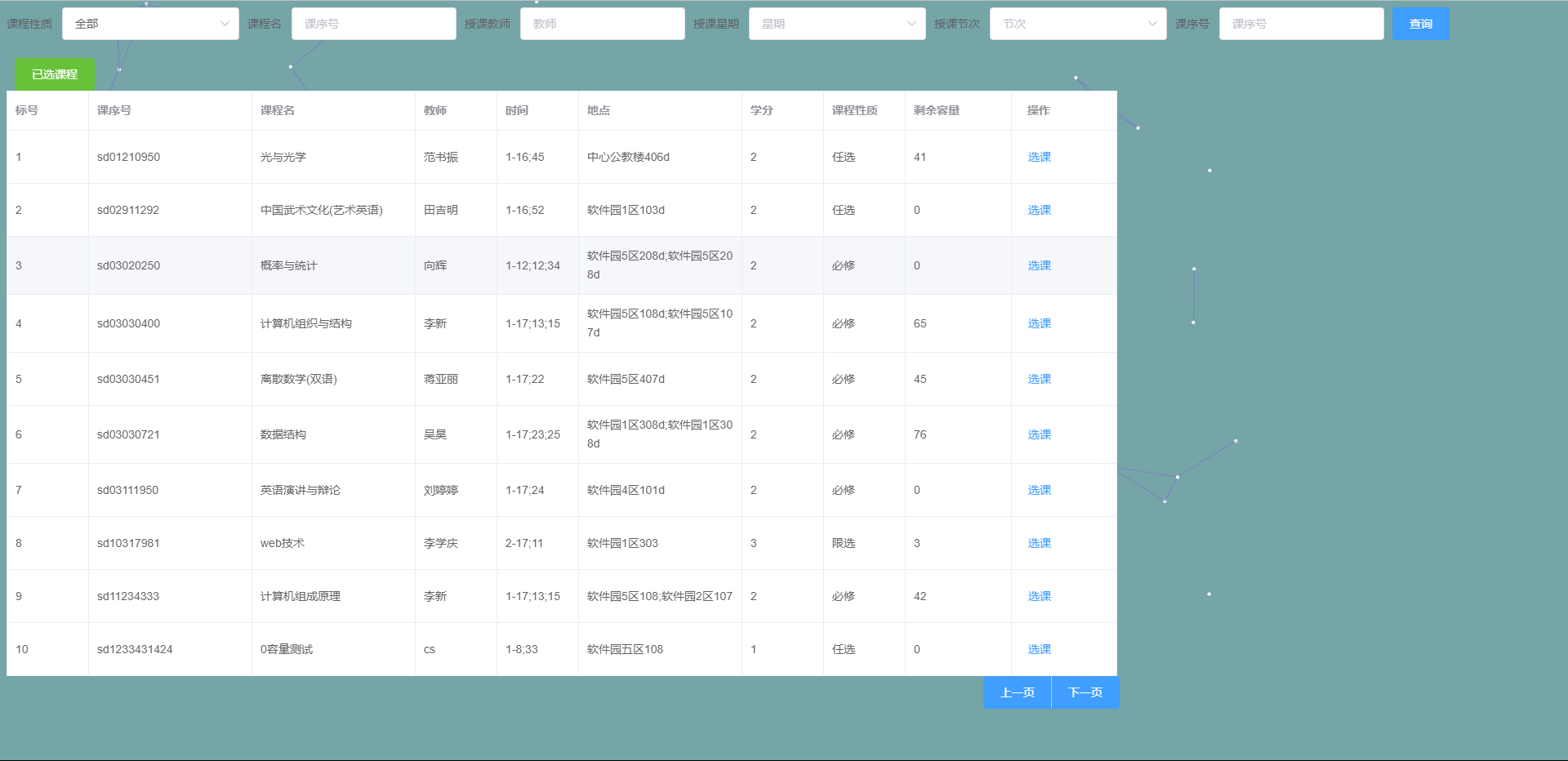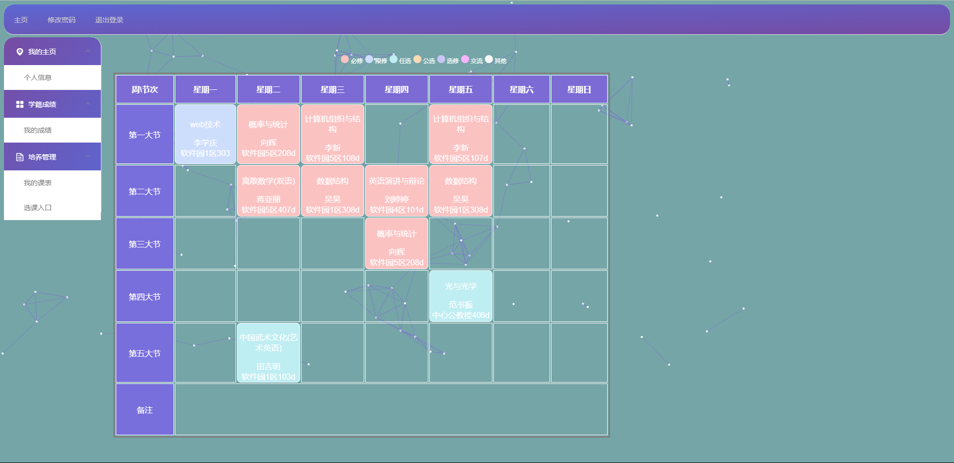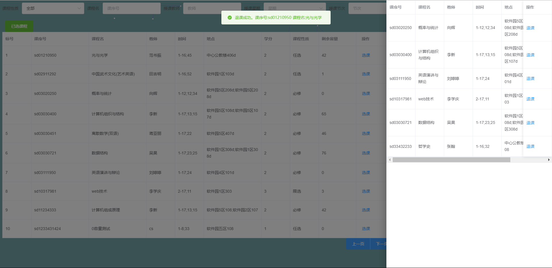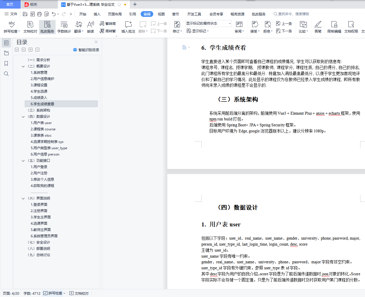 题目:学生选课管理系统目的:熟练掌握和灵活应用网站的规划设计方面的理论知识和技能,规划和设计网站,使设计的网站能够对网页布局有充分的掌控能力,合理的选择颜色、字体、分辨率以及图片、声音、动画等多媒体元素,能最终实现网站的前端设计目标。熟练掌握和灵活应用后端技术,使用java spring boot框架实现与前端的数据交互,实现对数据库的访问。硬件环境: PC、八核、64GB内存软件环境:操作系统:(Windows)开发工具:(IDEA、VS Code)数据服务:(MySql-8)应用服务:(Tomcat)输出成果:报告.docx代码1.zip,内容包括:/CourseSelClient.zip 前端源码/CourseSelServer.zip 后端源码s202000300021_total.jar 前后端集成产物init.sql DB初始化脚本(后端源码CourseSelServer.zip中也有)项目说明:项目客户为老师,工期为一学期,计划投入1人两个月。项目组共有1人,负责前后端开发、数据库设计等。目录(一) 需求分析 2(二) 概要设计 21. 系统管理 32. 用户信息维护 33. 课程设置 34. 学生选课 35. 成绩录入 46. 学生成绩查看 4(三) 系统架构 4(四) 数据设计 41. 用户表user 42. 课程表course 53. 课表表stoc 54. 选课学期控制表sys 55. 用户类型表user_type 56. 用户信息person 6(五) 功能接口 61. 用户登录 62. 用户注册 73. 修改个人信息 84. 获取我的课程 9…………… 9(六) 界面说明 101. 登录界面 102. 注册界面 113. 学生主界面 134. 选课界面 145. 教师主界面 156. 系统管理员界面 17(七) 安全设计 18(八) 部署说明 19(九) 总结讨论 20(一)需求分析系统需要包括学生基本信息维护,学生选课,学生退课, 学生成绩查看, 生成可视化课表; 教师基本信息维护, 教师开课, 教师停开课程, 教师查看所开课程, 教师查看课程所含选课学生, 教师录入学生成绩功能.系统应能支持500总用户量, 500人在线使用,页面最长响应时间为0.3秒。