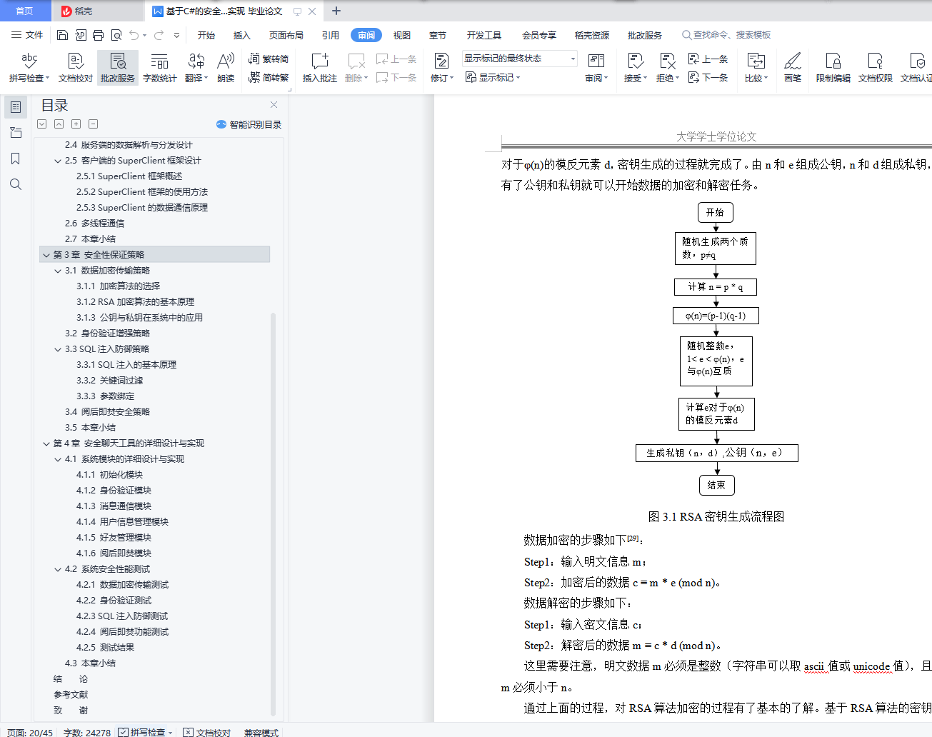 摘 要随着互联网的快速发展,即时通讯工具成为一种常见的信息交换工具。通过即时通讯工具可以实时的进行交流和信息交换,提高工作和学习的效率。但是在使用即时通讯工具的过程中,特别是在商业、科研、军事等对于保密性要求较高的领域,传递消息的安全性一直是用户比较关心的问题。当系统遭到恶意攻击时,用户就会面临消息被截获、篡改、消息丢失等风险。本文针对即时通讯过程中可能发生的信息泄露的问题,设计并实现了一款安全聊天工具。本系统基于C/S架构,使用WinForms开发平台。本系统通过SuperSocket服务器框架与MySQL数据库组合搭建服务端,使用自定义的起止符协议完成通信,设计并实现了SuperClient框架来实现系统的客户端。在此基础上,系统实现了用户的消息通信模块,用户的信息管理模块、好友信息的管理模块等功能模块。同时,在安全性保证策略方面,本系统共使用了4种安全策略来保证用户信息传递过程中的数据安全性。其中,以RSA加密算法为保证数据安全的核心算法,本系统使用了通信数据加密传输策略、用户身份验证增强策略、SQL注入攻击防御策略以及收到消息阅后即焚的功能策略这四种安全策略。经过测试,安全聊天工具的安全性能良好,通过4种安全策略协作,有效的保护了用户聊天信息的安全,极大的降低了用户在聊天过程中信息泄露的风险,可以满足对聊天消息保密程度要求较高的用户的使用需求。关键词:即时通信;信息泄露;安全策略;RSA算法ABSTRACTWith the rapid development of the Internet, instant messages have become a common information exchange tool. Instant communication tools enable real-time communication and information exchange to improve the efficiency of work and learning. However, during using instant communication tools, especially in the fields of commercial, scientific research, military and so on, the security has always been the concern of users. When the system is attacked, the user faces the risk of being intercepted, tampered with and lost message.In this paper, a security chat tools are designed and implemented to solve the problem of information leaking. This system is based on C/S architecture, using WinForms development platform. This system builds by using the SuperSocket server framework and MySQL database combination to build the server, using a custom Start And End Letter protocol to complete the communication, designing and implementation of the SuperClient framework to achieve the system client. On this basis, the system develops the data interaction among each function module, the user's message communication module, the user's information management module, the friend information management module and so on. At the same time, in the security assurance policy, this system has used 4 kinds of security policies to guarantee the data security in the process of user information transmission. In this paper, RSA encryption algorithm is used as the core algorithm to guarantee data security, this system uses four kinds of security strategies, such as encrypting and transmitting user's communication data, increasing the authentication of user's identity, preventing SQL injection attack and the function of receiving message after reading.After testing, security Chat tool security performance is excellent, through a variety of security strategy collaboration, effectively protect the user chat information security, greatly reduced risk in the chat process information leakage for users. This system can meet the requirements of users with higher demand.Key words: Instant Messages; Information Leakage; Security Policy; RSA目 录第1章 绪论 11.1 安全聊天工具研究的背景和意义 11.2 国内外研究现状 11.3 论文的主要研究内容及组织结构 2第2章 系统通信架构的设计 42.1 通信架构概述 42.1.1 数据通信流程 42.1.2 基本架构与开发平台的选择 42.2 服务器与数据库的数据交互设计 52.2.1 数据库设计 52.2.2 数据库操作接口的规定 62.3 应用层通信协议设计 72.3.1 常见的应用层协议比较 72.3.2 起止符通信协议的设计 82.3.3 服务端与客户端之间通信接口的规定 82.4 服务端的数据解析与分发设计 92.5 客户端的SuperClient框架设计 102.5.1 SuperClient框架概述 112.5.2 SuperClient框架的使用方法 122.5.3 SuperClient的数据通信原理 122.6 多线程通信 132.7 本章小结 14第3章 安全性保证策略 153.1 数据加密传输策略 153.1.1 加密算法的选择 153.1.2 RSA加密算法的基本原理 153.1.3 公钥与私钥在系统中的应用 173.2 身份验证增强策略 193.3 SQL注入防御策略 203.3.1 SQL注入的基本原理 203.3.2 关键词过滤 213.3.3 参数绑定 213.4 阅后即焚安全策略 223.5 本章小结 22第4章 安全聊天工具的详细设计与实现 244.1 系统模块的详细设计与实现 244.1.1 初始化模块 244.1.2 身份验证模块 244.1.3 消息通信模块 254.1.4 用户信息管理模块 284.1.5 好友管理模块 304.1.6 阅后即焚模块 314.2 系统安全性能测试 324.2.1 数据加密传输测试 324.2.2 身份验证测试 334.2.3 SQL注入防御测试 344.2.4 阅后即焚功能测试 344.2.5 测试结果 354.3 本章小结 35结 论 37参考文献 38致 谢 42