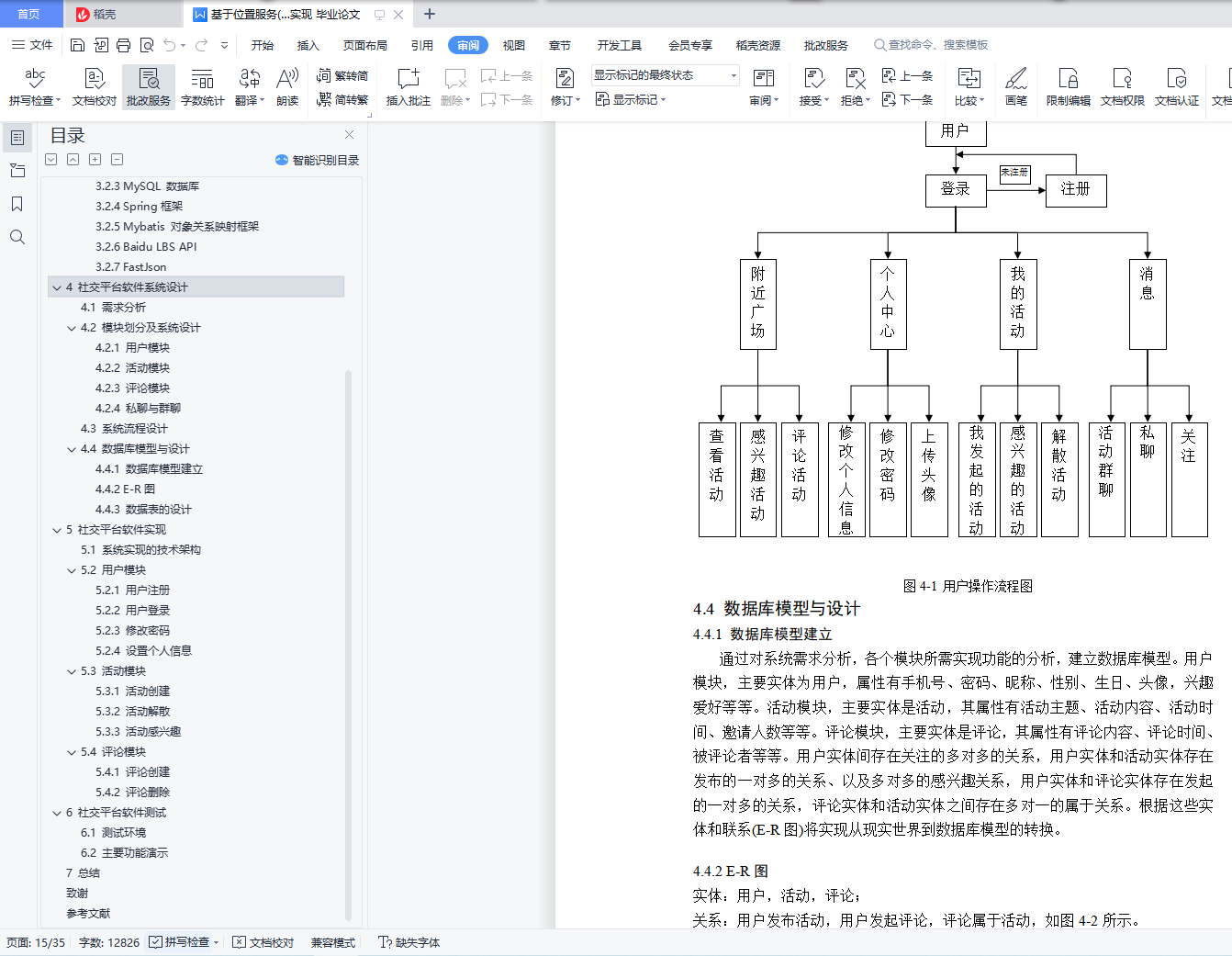 摘 要随着移动终端设备的不断发展,传统的社交网络形式已经满足不了用户的需求,基于移动终端的新型社交网络的迅速发展。新型社交网络不再像Facebook、微信那样依靠熟人构建自己的人际圈,而是基于当前地理位置来发现周围有共同兴趣者,接着构建自己的社交圈子。一个基于位置的用户关系,也是移动端所独有的功能特点。基于用户当前的位置信息,根据附近出没人群的感兴趣的活动,将一批有相同兴趣爱好的用户在线上集合在一起,然后由用户自己组织线下的活动,这就是基于地理位置的兴趣社交。因为是附近用户、且切入点是用户的兴趣,使之可靠性、成功率更高。本文主要论述了基于地理位置的兴趣社交网络应用的常见功能,并讲述了基于位置的移动社交网络的优点和高效性。由此提出并设计了一个基于地理位置的社交平台,系统主要使用Java语言进行研发,主要涉及兴趣活动发布、组织,评论,用户,单聊/私聊等功能模块。需求分析中,主要介绍各模块的功能。平台设计中,根据需求分析,设计E-R图,并完成数据库表的设计。在平台实现中,讲述了软件的界面设计,软件系统各个模块业务逻辑的实现。并且进行了功能测试,验证软件的功能完善和可用性。关键词:LBS;活动;兴趣社交ABSTRACTWith the continuous development of mobile terminal equipment, the traditional form of social networks have already can't satisfy the needs of users, the rapid development of the new social network based on mobile terminals.. New social networks unlike Facebook, WeChat no longer rely on contacts to build their own network, but is based on the current location to find around common interests, and then build your own social circle. A relationship of users based on the position and the function characteristics of mobile terminal alone. Based on the user's current location information, according to the activity of interest around in the crowd, a number of online users have the same hobbies, together, and then organized by the user's own offline activities, that is based on the geographic location of the social interests. Because it is near the users, and the breakthrough point is the user's interest, make the reliability, the success rate is higher.This paper mainly discusses the common function of the geographical position of interest in social networking applications, and tells the story of location-based mobile social network advantages and efficiency. Thus proposed and designed a location-based social networking platform, Java language system is mainly used for research and development, mainly involved interest activities, organization, comments, user, such as single/private chat function module. Demand analysis, mainly introduce the function of each module. In the platform design, devise e-r diagram according to the analysis of demand and complete the design of the database table. The platform implementation, tells the story of software interface design, the realization of the software system modules business logic. And the functional test, verify that the software function is perfect, and availability.Keywords:LBS; Activities; Interest in social目 录1 引言 12 现状分析 22.1 基于位置服务(LBS)分析 22.2 兴趣社交模式分析 23 开发环境搭建及相关技术 43.1 开发环境 43.1.1 Eclipse for J2EE 43.1.2 Tomcat容器 43.1.3 Navicat for MySQL 43.2 使用语言及相关技术 43.2.1 J2EE简介与发展 53.2.2 Servlet技术 53.2.3 MySQL 数据库 53.2.4 Spring框架 53.2.5 Mybatis 对象关系映射框架 63.2.6 Baidu LBS API 63.2.7 FastJson 64 社交平台软件系统设计 84.1 需求分析 84.2 模块划分及系统设计 94.2.1 用户模块 94.2.2 活动模块 94.2.3 评论模块 104.2.4 私聊与群聊 104.3 系统流程设计 104.4 数据库模型与设计 114.4.1 数据库模型建立 114.4.2 E-R图 114.4.3 数据表的设计 135 社交平台软件实现 165.1 系统实现的技术架构 165.2 用户模块 165.2.1 用户注册 165.2.2 用户登录 175.2.3 修改密码 185.2.4 设置个人信息 195.3 活动模块 215.3.1 活动创建 215.3.2 活动解散 235.3.3 活动感兴趣 235.4 评论模块 245.4.1 评论创建 245.4.2 评论删除 246 社交平台软件测试 256.1 测试环境 256.2 主要功能演示 257 总结 29致谢 30参考文献 31