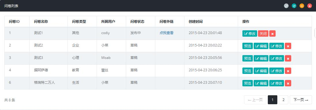 基于web的在线问卷调查系统中文摘要在科学技术和社会经济不断发展的今天,人们对各种各样新奇的事物以及品质都有了更高的要求。越来越多的组织或者个人迫切希望了解人们的状态及趋向,以更好的改善自己的产品或者提供更好的服务来博得生存,于是问题调研应运而生。然而传统的问卷调查体系需要印发大量问卷调查表并组织大量人力参与,这样不仅及其消耗人力物力,也不便于后期统计分析。所以本文所研究的基于web的在线问卷调查系统就是为了解决这些问题而设计的。本文所研究设计的基于web的在线问卷调查系统,使用Nginx做为web服务器,使用php做为后台系统开发语言,采用mysql做数据存储服务器,并对整个系统做了详细的需求分析,业务逻辑设计以及数据库的设计。系统根据使用主体的不同分为三个不同的主体:平台、客户和用户。平台拥有最高权限,可以维护平台上的用户客户列表,可以管理和维护已有的问卷列表,维护题型库等等;客户则是系统需求的主体,拥有创建问卷,维护自身问卷列表和查看问卷提交结果的功能;而用户做为潜在的客户除了可以填写提交问卷外,同样可以在系统上创建自己的问卷并发布它。本论文循序渐进的阐述了一个功能较为完善的基于web的在线问卷调查系统的设计过程。详细介绍了它的背景、现状、研究的目的与意义以及需求的设计具体实现。关键词:在线问卷,web,nginx+php+mysqlOnline Questionnaire Survey SystemBased on WebAbstractToday, with continuous development of science and technology and social economy, people have higher requirements about all kinds of new things and quality. more and more organizations or individuals eager to understand people's status and trend to better improve their own products or provide better service,to survival in the supermarket. So the problem survey came into being. However, the traditional questionnaire system needs to distribute a large number of paper questionnaires and organize a large amount of human involvement, so that not only and the human material consumption, but also not easy for the late statistical analysis. So the research of the online questionnaire based on web is designed to solve these problems.This paper studies the design of the online survey system based on web,use nginx as the web server, use PHP as the development language, and use Mysql as the data storage server. And the whole system has done a detailed requirements analysis, business logic design and database design. According to the different subject of the main body, this system contains platform and customers and users. Platform has the highest authority, it can manage platform user list of customers, management and maintenance of existing questionnaire list, questions database maintenance and so on. The customer is one of the main body in this system, with the creation of the questionnaire, maintain their own questionnaire and view the function of the questionnaire submitted results. And the user as potential customers in addition to can fill in the submit questionnaire, also can create their own questionnaires and publish it on the system.This paper is a step-by-step and elaborate the design of an online survey system based on Web.The background, the status, the purpose and the significance of the research were introduced in detail. As well as the design of the need to achieve.Key words: the online survey system,web,nginx+php+mysql目 录中文摘要 1Abstract II第1章 绪论 11.1 研究背景 11.2 设计目标 11.3本文结构 1第2章 系统与程序架构及其相关技术介绍 32.1 系统架构与程序架构 32.1.1 nginx介绍 32.1.2 thinkPHP介绍 32.2 开发相关技术介绍 42.2.1 php技术 42.2.2 mysql技术 5第3章 系统需求分析与设计 73.1 需求分析 73.1.1 平台系统需求分析 73.1.2 客户系统需求分析 73.1.3 普通用户需求分析 73.1.4 用例图 8第4章 系统及数据库设计 94.1系统设计 94.2数据库设计 10第5章 系统详细设计与功能实现 165.1系统项目的文件夹结构 165.2平台管理系统的详细设计 175.2.1 登陆功能 175.2.2 用户列表管理 185.2.3 问卷管理功能 195.2.4 题型管理功能 205.2.5 周边功能 215.3 客户管理系统的详细设计 215.3.1 注册登录功能 215.3.2 问卷列表管理 225.3.3 客户个人信息 225.4 用户系统设计 235.4.1 网站首页宣传 235.4.2 登录注册功能 235.4.3 问卷详情和问卷提交 23总结 25参 考 文 献 26致谢 27