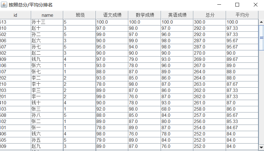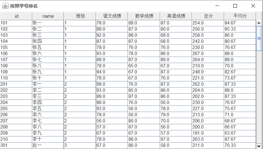 2. 实现按照单科成绩、总成绩、平均成绩、学号排序;