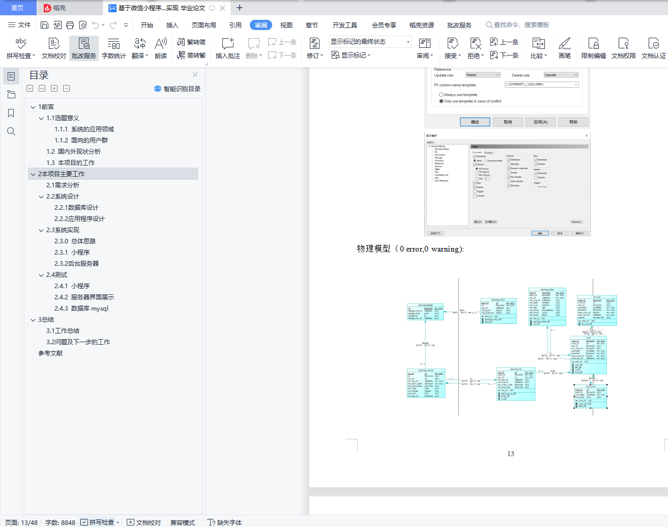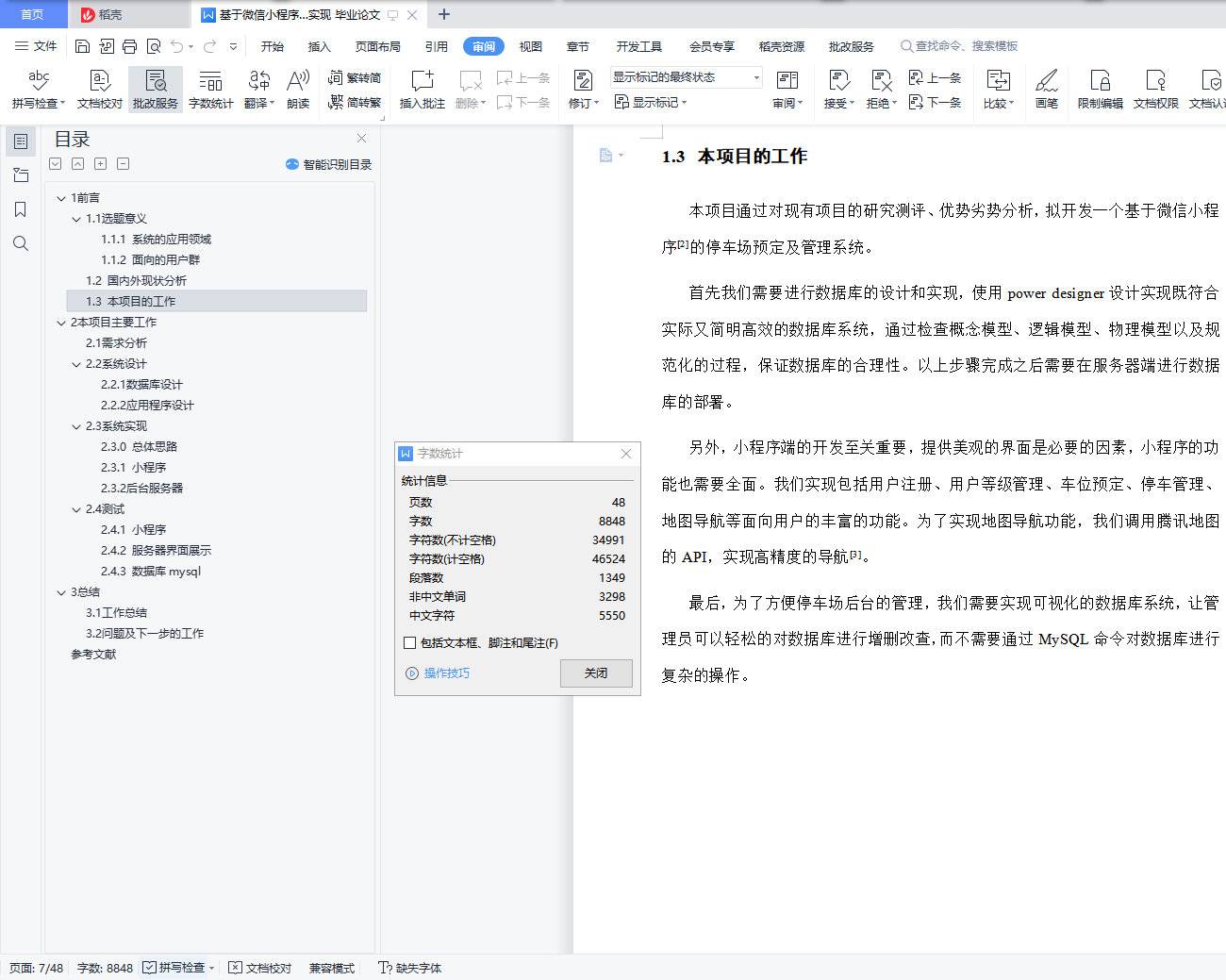 摘要本项目基于停车管理选题,通过分析各类停车管理的需求和常见的停车管理系统方案,提出了一种基于微信小程序的停车管理系统。本系统以微信小程序作为前端,在小程序内提供了用户注册,用户绑定,VIP预订,车位选择,地图导航等功能。本项目后端管理平台以及数据库搭建在阿里云服务器上,后端平台采用了SpringMVC,更加系统化的实现了对前端请求的处理,实现了一个便于管理的Web后端页面,并且实现了数据库在后端页面的可视化。本项目数据库通过前期设计,规范化,概念模型,逻辑模型,物理模型的建立,实现了一个规范的没有报警和错误的数据库系统,满足了项目运行时的数据存储和管理需求。目前本项目还存在一些操作逻辑上的不足,仍需后续优化改进。关键词:停车管理系统;数据库设计;微信小程序;A Parking Management System based on Wechat Mini Program[Abstract]Based on the selected topics of parking management, the project puts forward a parking management system based on WeChat Mini Program by analyzing the requirements of various parking management and common parking management system schemes.Based on WeChat Mini Program, the system provides user registration, user binding, VIP reservation, parking lot selection, map navigation and other functions. The project back-end management platform and database is built on Ali cloud server, and the back-end platform adopts SpringMVC, which can more systematic to realize the processing of front-end request. And we implement a Web back-end page which is easy to manage the user data, we also realizes the visualization of database in the back-end Web page. Through the previous design, standardization, conceptual model, logical model, physical model the project established a standardized database system without alarm and error, and it meets the data storage and management requirements of the project.At present, there are still some operational logic deficiencies in this project, and still need to be further optimized and improved.[Keyword]Parking Management System; Database Design; WeChat Mini Program;目录1 前言 61.1 选题意义 61.1.1 系统的应用领域 61.1.1 面向的用户群 61.2 国内外现状 71.3 本项目的工作 82 本项目主要工作 92.1 需求分析 92.2 系统设计 102.2.1 数据库设计 102.2.2 应用程序设计 152.3 系统实现 162.3.0 总体思路 162.3.1 小程序 172.3.2 后台服务器 272.4 测试 432.4.1 小程序 432.4.2 服务器界面展示 462.4.3 数据库mysql 483 总结 493.1 工作总结 493.2 问题及下一步的工作 49参考文献 50