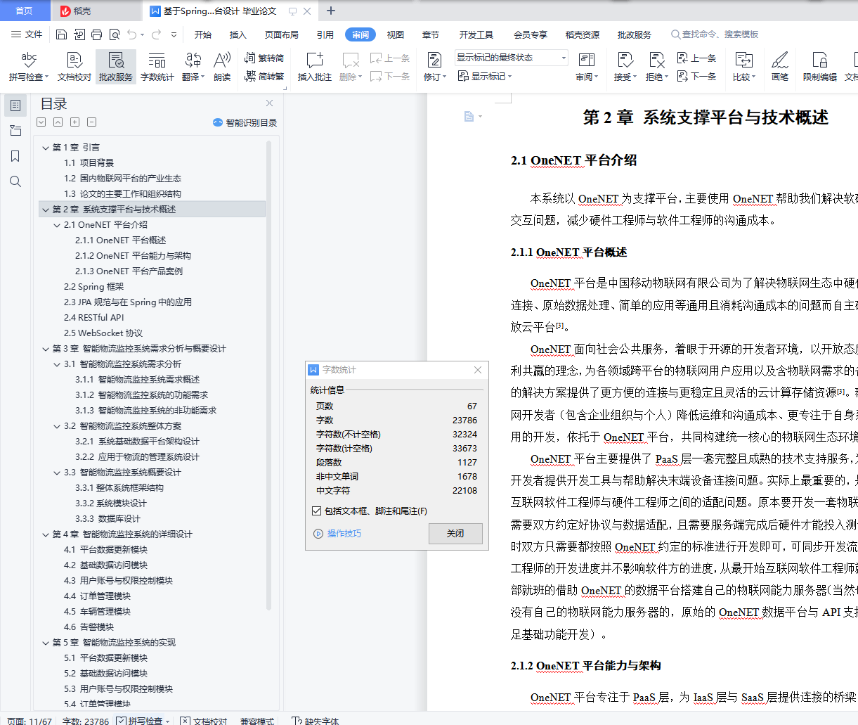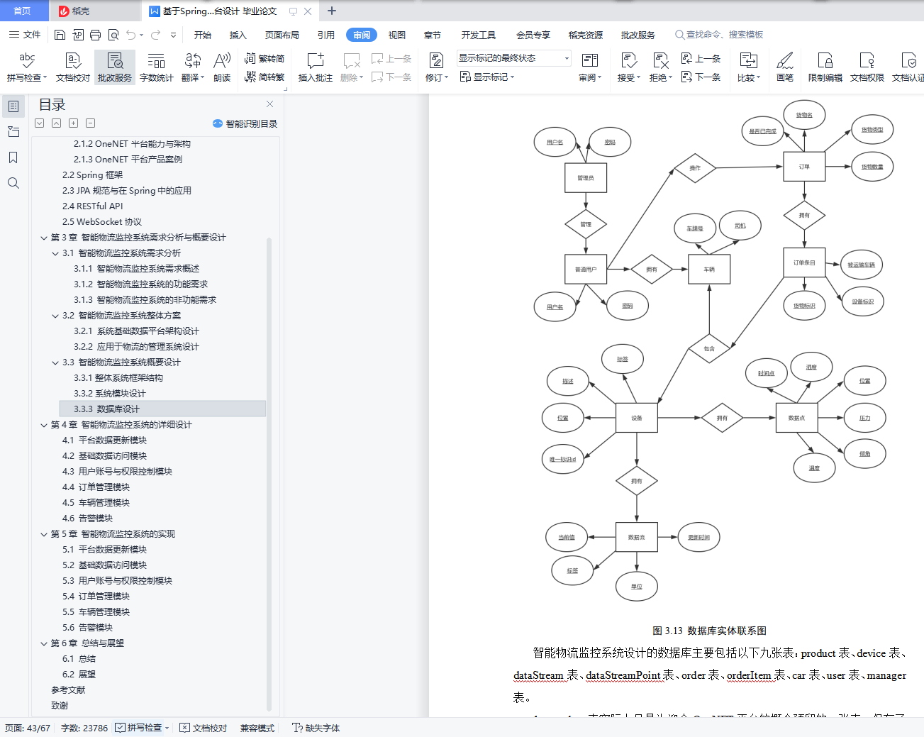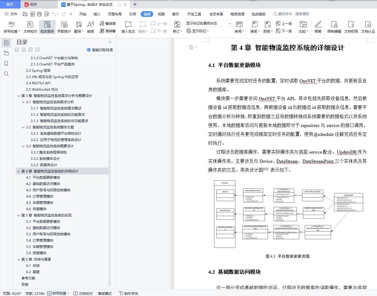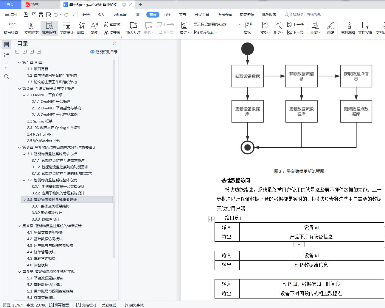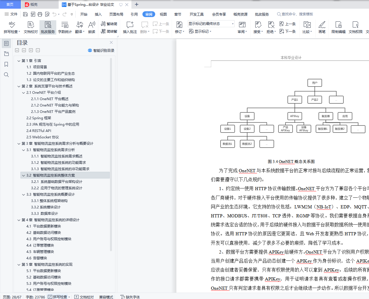 摘 要在万物互联的大背景下,将物流行业纳入物联网生态中是一件非常有必要的事情。本课题希冀为完善物联网生态中的物流行业而贡献自己的力量,其目的是构建一套适合预设物流监控需求的系统,让物流运输相对于所有物流参与者都能成为一个透明的过程。所设计的系统分为数据平台对接、数据服务、用户与订单服务四个部分。其中,数据平台对接完成数据的定时更新,保证数据的实时性;数据服务完成了对于数据平台的一些基础数据读取的服务,系统应用将围绕这些数据展开。用户与订单服务是与用户应用对接的部分,完成前端应用的API提供。智能物流监控系统是一个前后端分离的项目,前端构建web端应用与Android端应用,后端使用springboot构建服务器端应用,开发API端口与前端交互。服务端使用redis技术缓存数据,可以为分布式系统提供session登录服务,使用了spring-data-jpa简化了数据库操作,提供API依照RESTful规范,且使用webSocket协议实现服务端与客户端的双向通信。本课题完成了系统数据库的设计,完成了包括系统数据查看、订单管理、车辆管理等模块的实现,进而实现了用户的应用需求。关键词:物联网;物流监控;OneNET;数据平台;springboot;前后端分离;RESTful;webSocketABSTRACTUnder the background of the Internet of Everything, it is necessary to integrate the logistics industry into the ecosystem of the Internet of Things. This project hopes to contribute to the improvement of the logistics industry in the Internet of Things ecosystem. Its purpose is to construct a system that is suitable for the preset logistics monitoring needs, so that logistics and transportation can become a transparent process for all logistics participants.The designed system is divided into four parts: data platform docking, data service, user and order service. Among them, the data platform docking completes the regular update of data to ensure the real-time nature of the data; the data service completes the service for reading some basic data of the data platform, and the system application will develop around these data. The user and order service is the part that interfaces with the user application and completes the API provision of the front-end application.The intelligent logistics monitoring system is a front-end and back-end separated project. The front-end builds web-side applications and Android-side applications. The back-end uses springboot to build server-side applications and develops API ports to interact with front-ends. The server uses redis technology to cache data. It can provide session login services for distributed systems. It uses spring-data-jpa to simplify database operations, provides APIs in accordance with the RESTful specification, and uses the webSocket protocol to implement two-way communication between the server and the client. This project completed the design of the system database, completed the implementation of the module including system data viewing, order management, vehicle management, and then realized the user's application requirements.Key words:Internet of things; logistics monitoring; springboot; front-end separation; RESTful; webSocket; OneNET; data platform目 录目录图 目 录 Ⅴ表 目 录 Ⅵ第1章 引言 11.1 项目背景 11.2 国内物联网平台的产业生态 21.3 论文的主要工作和组织结构 3第2章 系统支撑平台与技术概述 52.1 OneNET平台介绍 52.1.1 OneNET平台概述 52.1.2 OneNET平台能力与架构 52.1.3 OneNET平台产品案例 62.2 Spring框架 72.3 JPA规范与在Spring中的应用 92.4 RESTful API 102.5 WebSocket协议 12第3章 智能物流监控系统需求分析与概要设计 133.1 智能物流监控系统需求分析 133.1.1 智能物流监控系统需求概述 133.1.2 智能物流监控系统的功能需求 133.1.3 智能物流监控系统的非功能需求 203.2 智能物流监控系统整体方案 203.2.1 系统基础数据平台架构设计 213.2.2 应用于物流的管理系统设计 253.3 智能物流监控系统概要设计 263.3.1整体系统框架结构 263.3.2系统模块设计 273.3.3 数据库设计 36第4章 智能物流监控系统的详细设计 394.1 平台数据更新模块 394.2 基础数据访问模块 394.3 用户账号与权限控制模块 404.4 订单管理模块 414.5 车辆管理模块 414.6 告警模块 42第5章 智能物流监控系统的实现 445.1 平台数据更新模块 455.2 基础数据访问模块 475.3 用户账号与权限控制模块 485.4 订单管理模块 515.5 车辆管理模块 545.6 告警模块 55第6章 总结与展望 586.1 总结 586.2 展望 58参考文献 60致谢 61