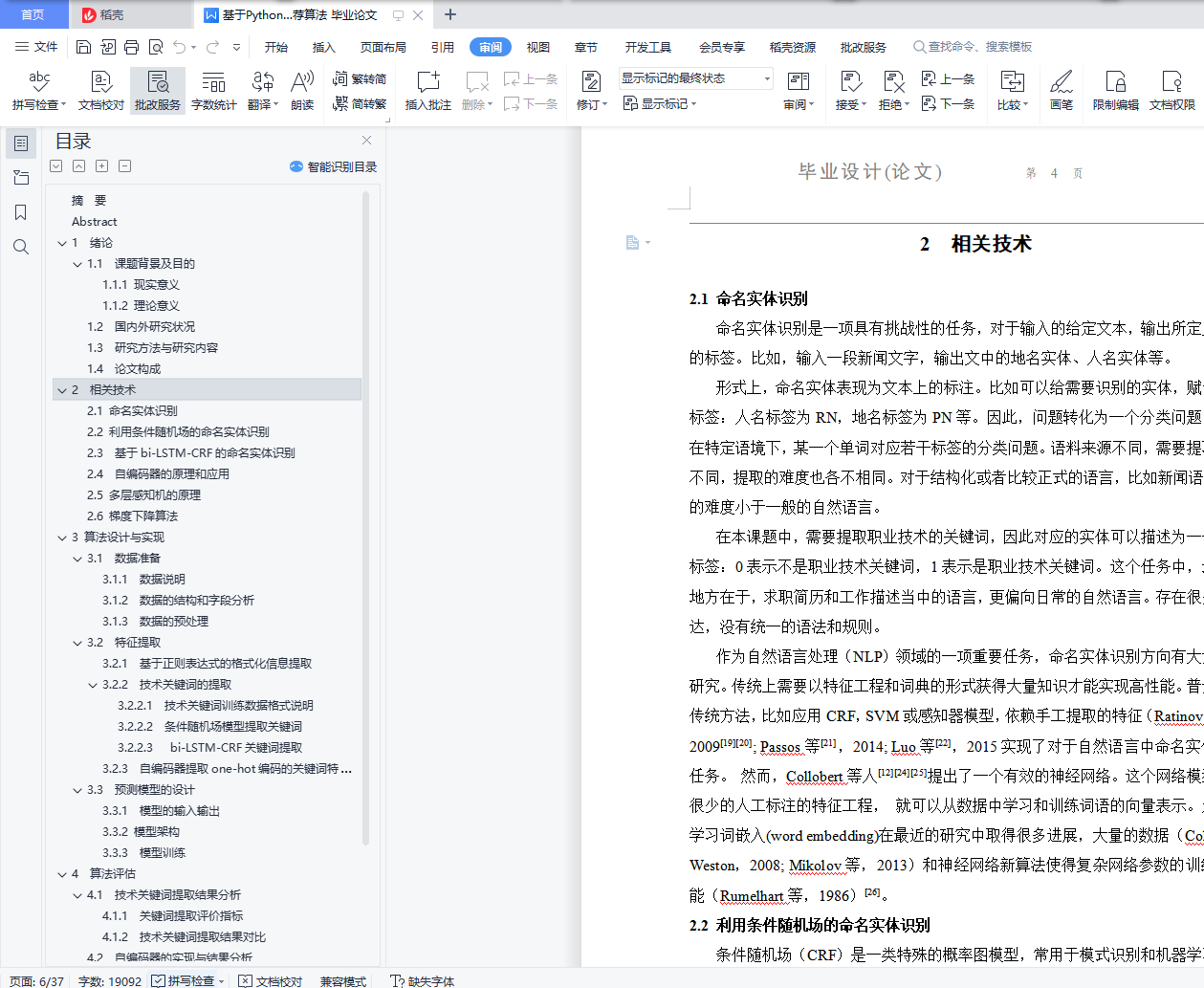 摘 要目前,越来越多不同特点的应聘者和越来越细化的岗位之间,存在巨大的信息不对称。因此高效、准确的将合适的人推荐到合适的岗位,有很大的实际意义。本文针对这一工程实践问题,提出“简历智能推荐算法”:将求职简历和工作表述进行匹配。本文采用自然语言处理的多种方法解决简历匹配的问题。首先,利用正则表达式基于规则的提取了求职简历中结构化字段的信息。这部分工作为之后按规则筛选简历提供接口。之后,对于求职简历和工作描述的非结构化字段,提取了关键词信息:利用6000多句带标注的数据,有监督的训练了条件随机场模型(CRF)和改进的bi-LSTM-CRF模型。分析了这两种不同模型,在技术关键词提取方面的效果。随后,分析了提取关键词的“长尾效应”,并利用自编码器无监督的学习了文本的关键词向量的表示。再通过主成分分析,可视化关键词向量。结果表明匹配相同工作描述的文本的关键词向量,有聚类的现象。这一结果表明:通过自编码器确实学到了有含义的关键词向量。之后,利用多层感知机模型,对提取到的求职简历和工作描述进行分类。利用51job上提供的172封匹配的数据训练了模型。最后本文分析了模型训练的结果:在测试数据集上,画出了模型预测结果的ROC曲线,并计算了AUC。模型最终的AUC达到0.95,实现了比较好的分类效果。关键词:自然语言处理,长尾效应,简历匹配,机器学习AbstractInformation asymmetry is a popular problem in Talent Resource Market. Therefore, matching CV (Curriculum Vita) to its fitted job description is a important task. In this paper, I develop an algorithm to do this task. This will largely reduce the pains-taking task for people to look through CV and choose the fitted one.The Algorithm is largely based on classical methods in Natural Language Procession (NLP). I first using Regular Expression to extract information from the structural text. This information will be used to filter the CV in the future. Then, I focus on extracting keywords from nonstructural test. Based on supervised Machine Learning algorithms, I trained an keywords extraction model. I compared two models here: Conditional Random Field (CRF) and bi-LSTM-CRF in this task. I further analyzed the keywords extracted and discovered the “long tail phenomenon”. In response to this challenge, I build an auto-encoder model to compact and extract further information from the keyword vectors of CV. Then I found that the encoded keyword vectors have rich semantics meaning: by visualizing it using Principal Component Analysis (PCA) and finding the CV’s keyword vectors clustering according to the matched job description. Finally, I build a Muti-Layer Perception (MLP) model to classify and matching CV to corresponding job description.Then analyzed the model’s performance on test set by drawing ROC curve and calculated AUC. The model achieves 0.95 in AUC, which indicated it’s capability to matching CV to job descriptions.Key words: NLP, Long tail, Resume matching, Machine Learning目录摘 要 IAbstract II1 绪论 21.1 课题背景及目的 21.1.1 现实意义 21.1.2 理论意义 21.2 国内外研究状况 31.3 研究方法与研究内容 31.4 论文构成 42 相关技术 52.1 命名实体识别 52.2 利用条件随机场的命名实体识别 62.3 基于bi-LSTM-CRF的命名实体识别 72.4 自编码器的原理和应用 92.5 多层感知机的原理 112.6 梯度下降算法 123 算法设计与实现 143.1 数据准备 143.1.1 数据说明 143.1.2 数据的结构和字段分析 153.1.3 数据的预处理 183.2 特征提取 193.2.1 基于正则表达式的格式化信息提取 193.2.2 技术关键词的提取 193.2.3 自编码器提取one-hot编码的关键词特征 233.3 预测模型的设计 243.3.1 模型的输入输出 243.3.2 模型架构 253.3.3 模型训练 254 算法评估 264.1 技术关键词提取结果分析 264.1.1 关键词提取评价指标 264.1.2 技术关键词提取结果对比 274.2 自编码器的实现与结果分析 284.3 推荐算法在测试数据集上的结果 294.3.1 评价指标 294.3.2 结果与分析 29结 论 31致 谢 33参考文献 34