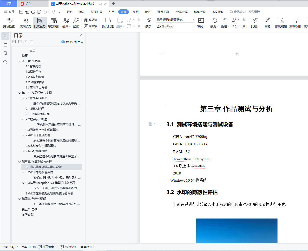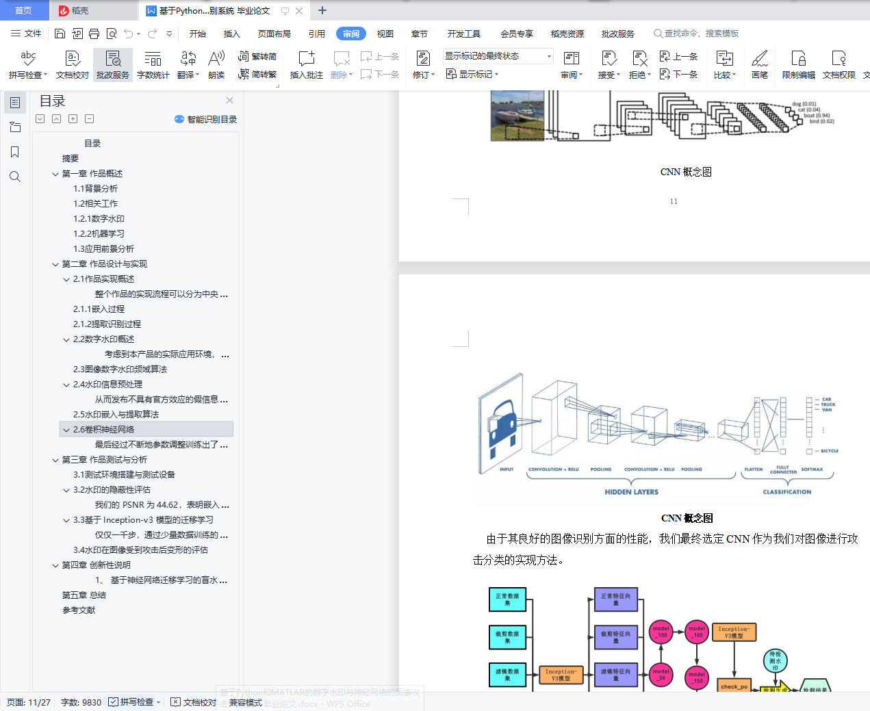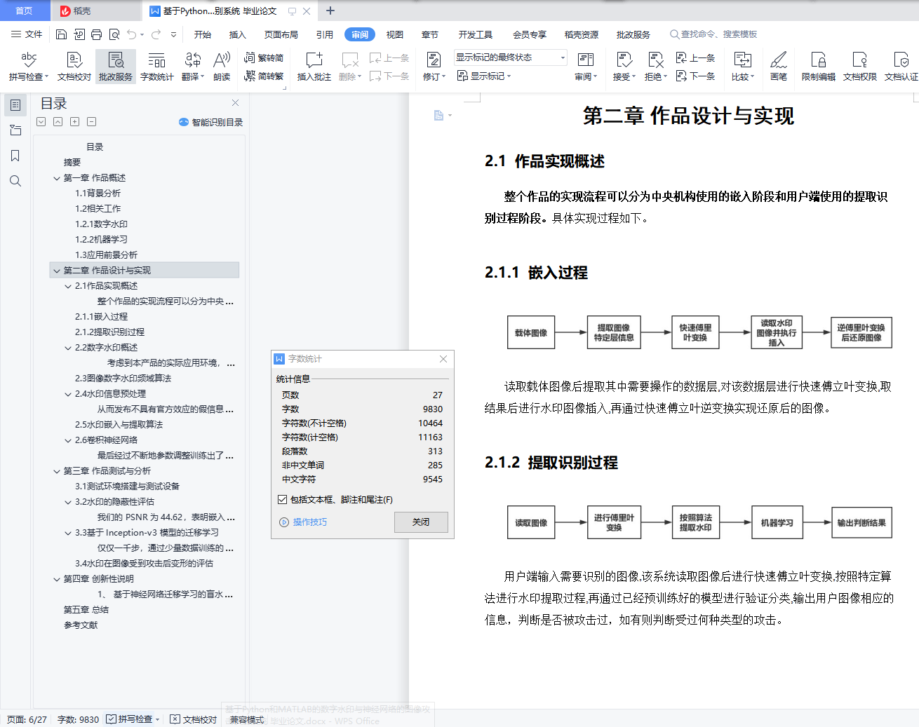 目录摘要 4第一章 作品概述 51.1背景分析 51.2相关工作 61.2.1数字水印 61.2.2机器学习 61.3应用前景分析 7第二章 作品设计与实现 82.1作品实现概述 82.1.1嵌入过程 82.1.2提取识别过程 82.2数字水印概述 92.3图像数字水印频域算法 92.4水印信息预处理 102.5水印嵌入与提取算法 122.6卷积神经网络 13第三章 作品测试与分析 163.1测试环境搭建与测试设备 163.2水印的隐蔽性评估 163.3基于 Inception-v3 模型的迁移学习 193.4水印在图像受到攻击后变形的评估 24第四章 创新性说明 27第五章 总结 28参考文献 29摘要当今时代是一个信息爆炸的时代,随着网络和多媒体技术的发展,多媒体数据逐渐成为人们获取信息的重要来源,但问题也随之而来。由于多媒体信息与传统物质信息相比改动相对简单并且隐蔽性高,有一些不法分子对某些重要的数字信息做出恶意改动,制造出虚假的信息并传播,如果信息的接收人没有辨别出信息的真实性,可能就会造成不可估量的损失。因此,切实有效地保护数字信息的真实性是一个时下非常重要的话题。时下对信息真实性的保护大多在于保护端对端通讯,缺少对大量传播的数据真实性的保护。为了解决这个问题,利用图片受到攻击后水印改动的情况与机器学习的分类算法,我们开发出了基于神经网络及数字水印的图片攻击类别分析系统。该系统能够对插入水印的图片信息做是否受到攻击的判定,如果图像受到改动,还可以对改动的种类进行识别。本产品由水印嵌入与提取模块、机器学习分类算法模块两部分组成。与其他产品相比,该产品中水印嵌入与提取的算法优不需要原图就可以实现水印的提取,更加切合图像改动检测的实际情况,满足公众对信息真实性验证的需求。应用机器学习对提取后的水印进行分析归类,可以鉴定图像的改动情况并且达到非常高的准确率。在此基础上,还可以扩展其他的功能,比如针对机器学习数据集攻击的识别,在未来的信息时代能够帮助安全从业人员节省大量精力。关键词:数字水印 攻击检测 机器学习 神经网络